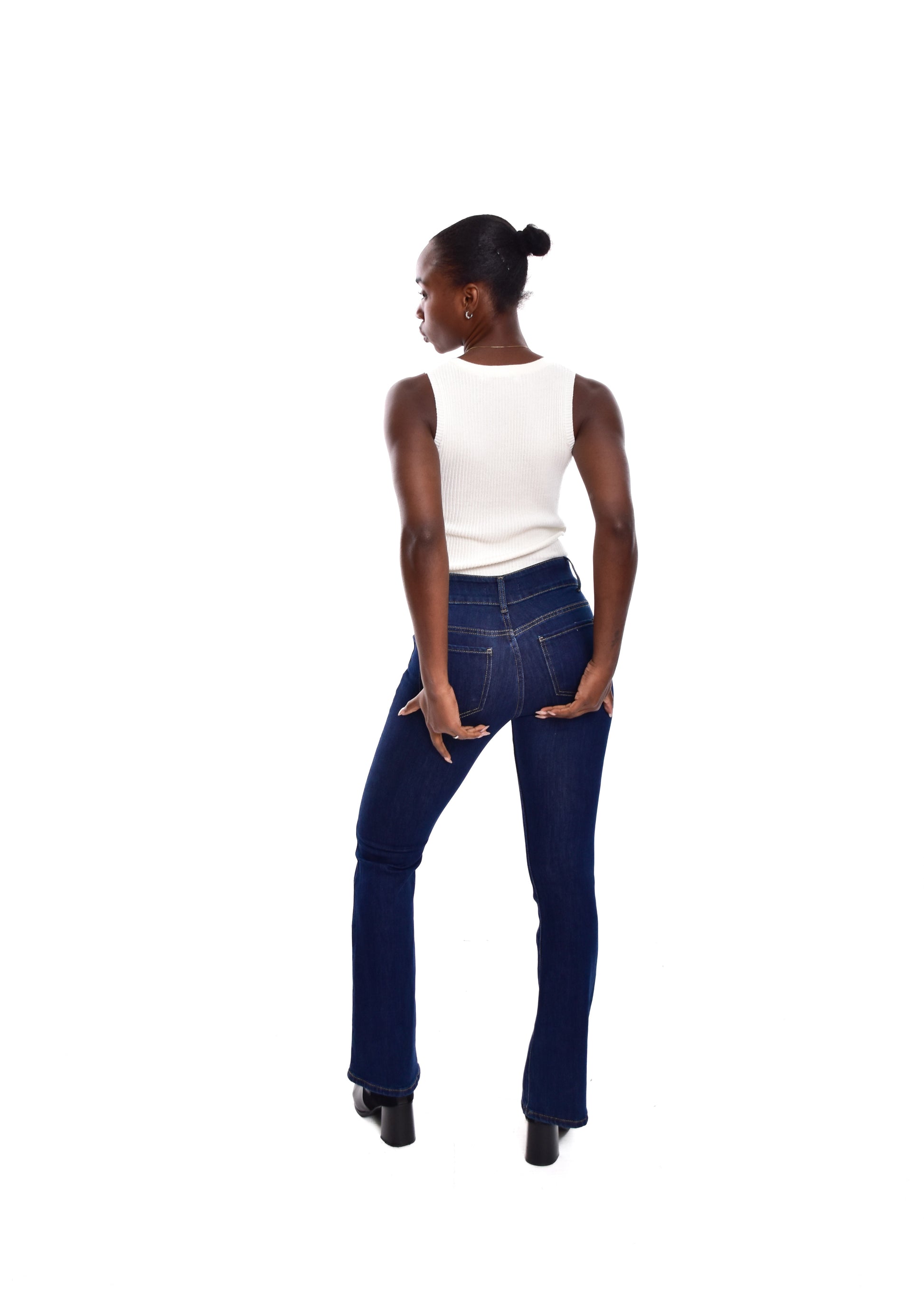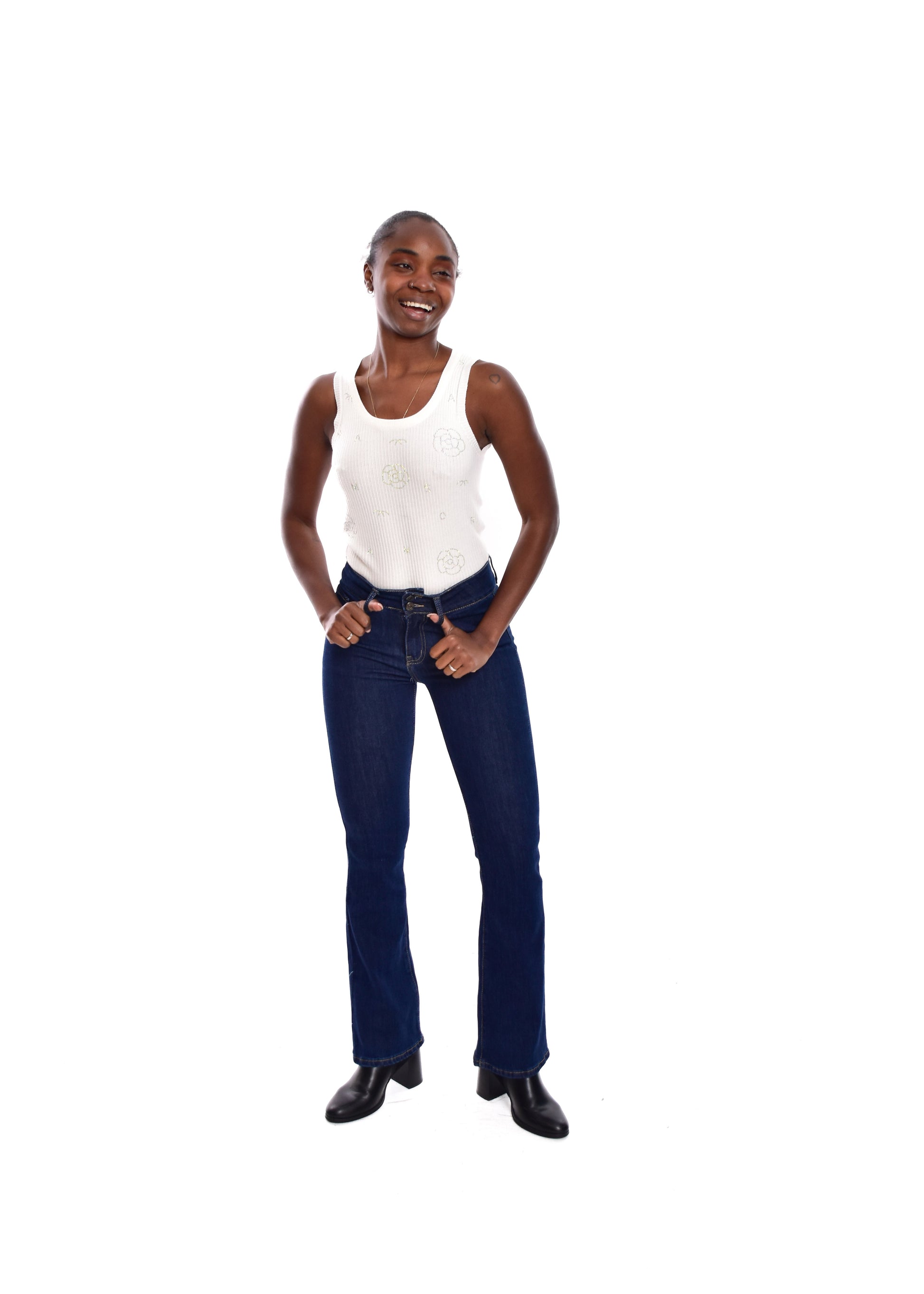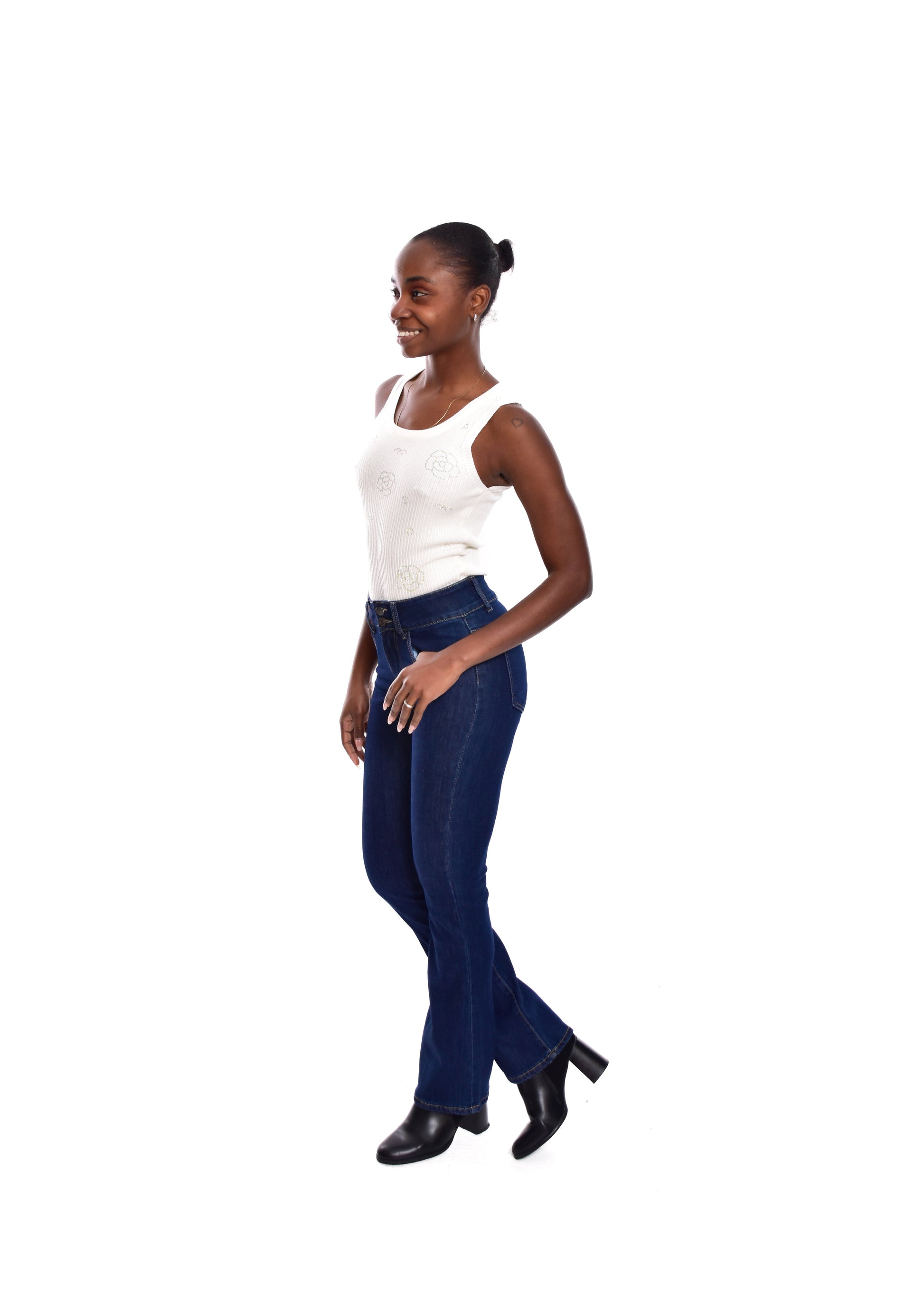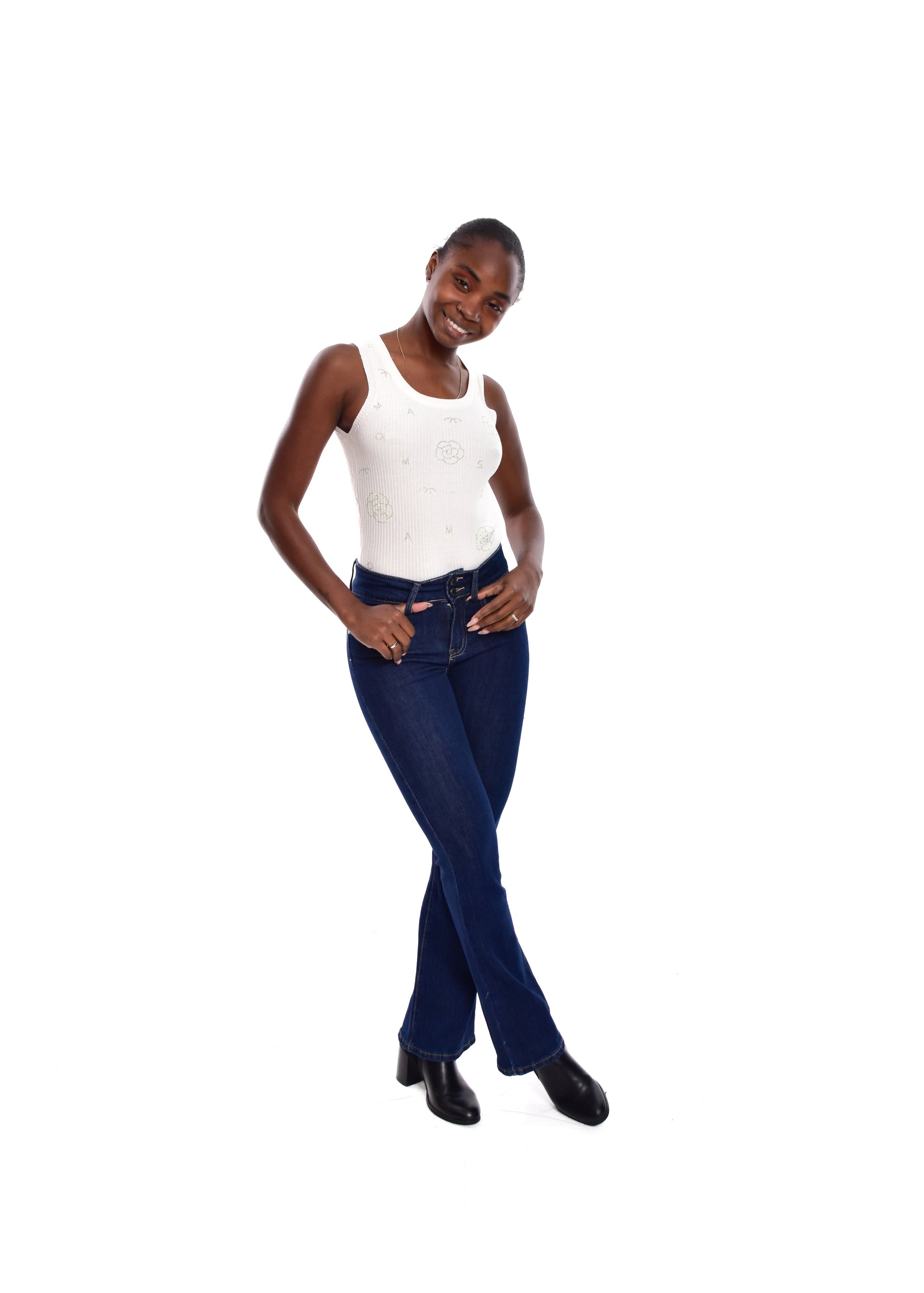 Pantalón de corte acampanado. Esta prenda está disponible de la talla XS a la XL , en este caso es apta hasta una talla 42. Si lo deseas puedes comprobar las medidas exactas de la prenda en el apartado " Talla y Medidas"