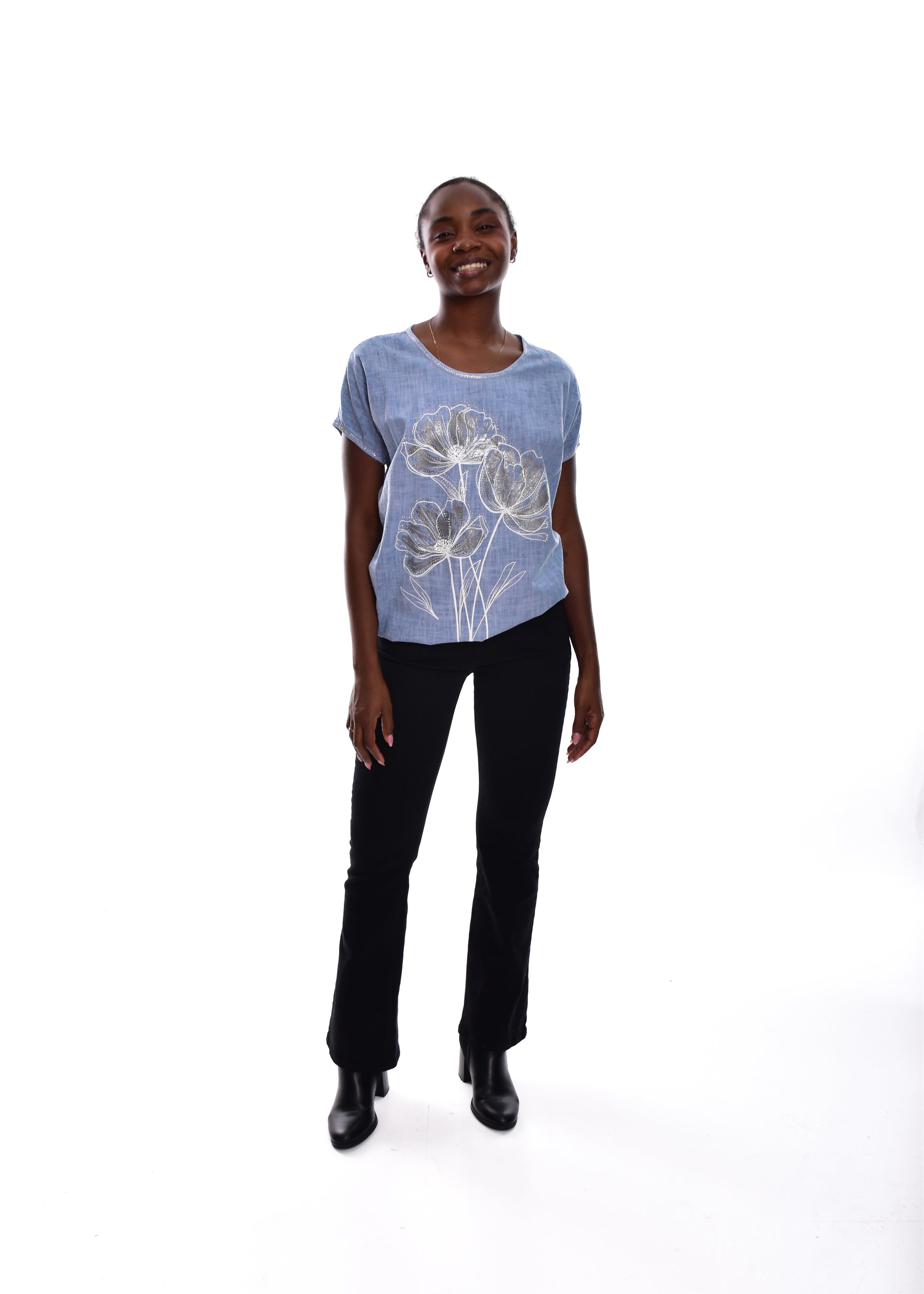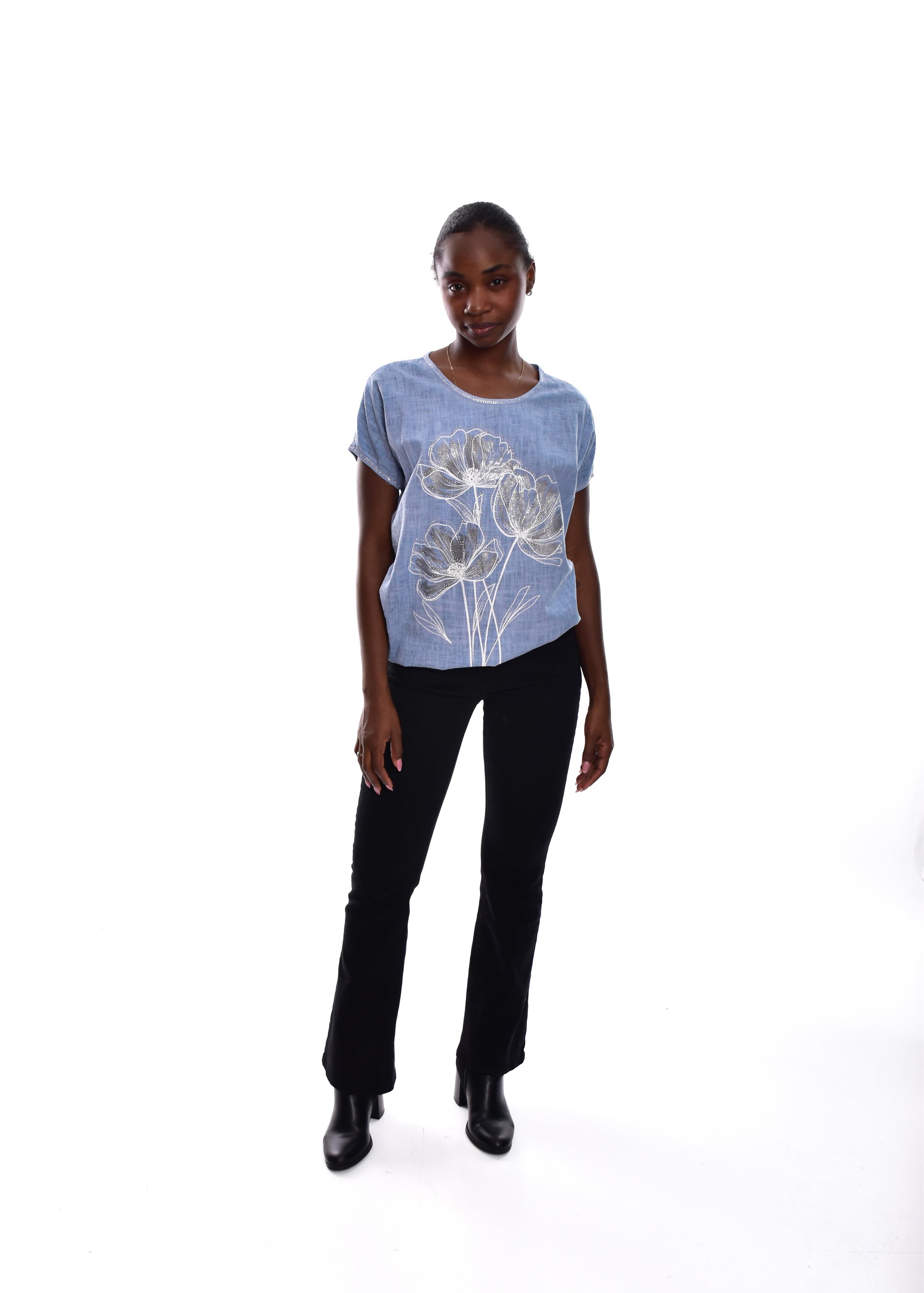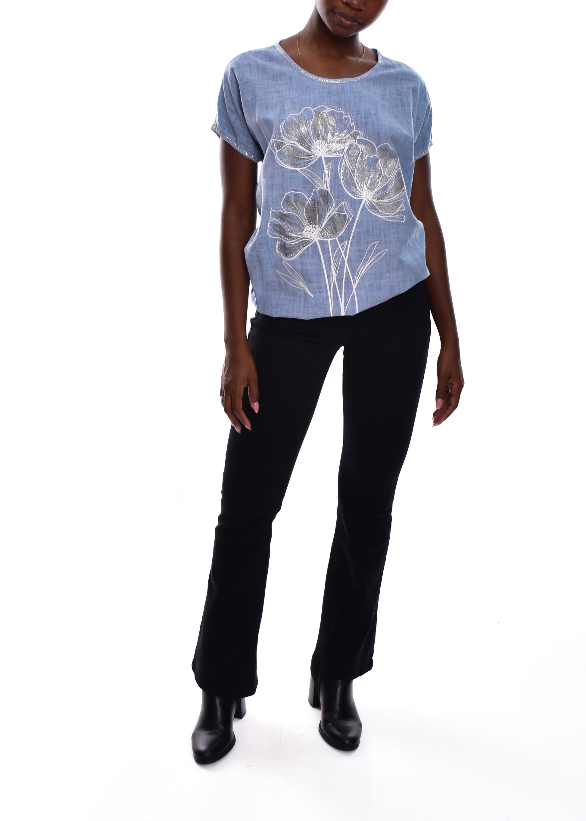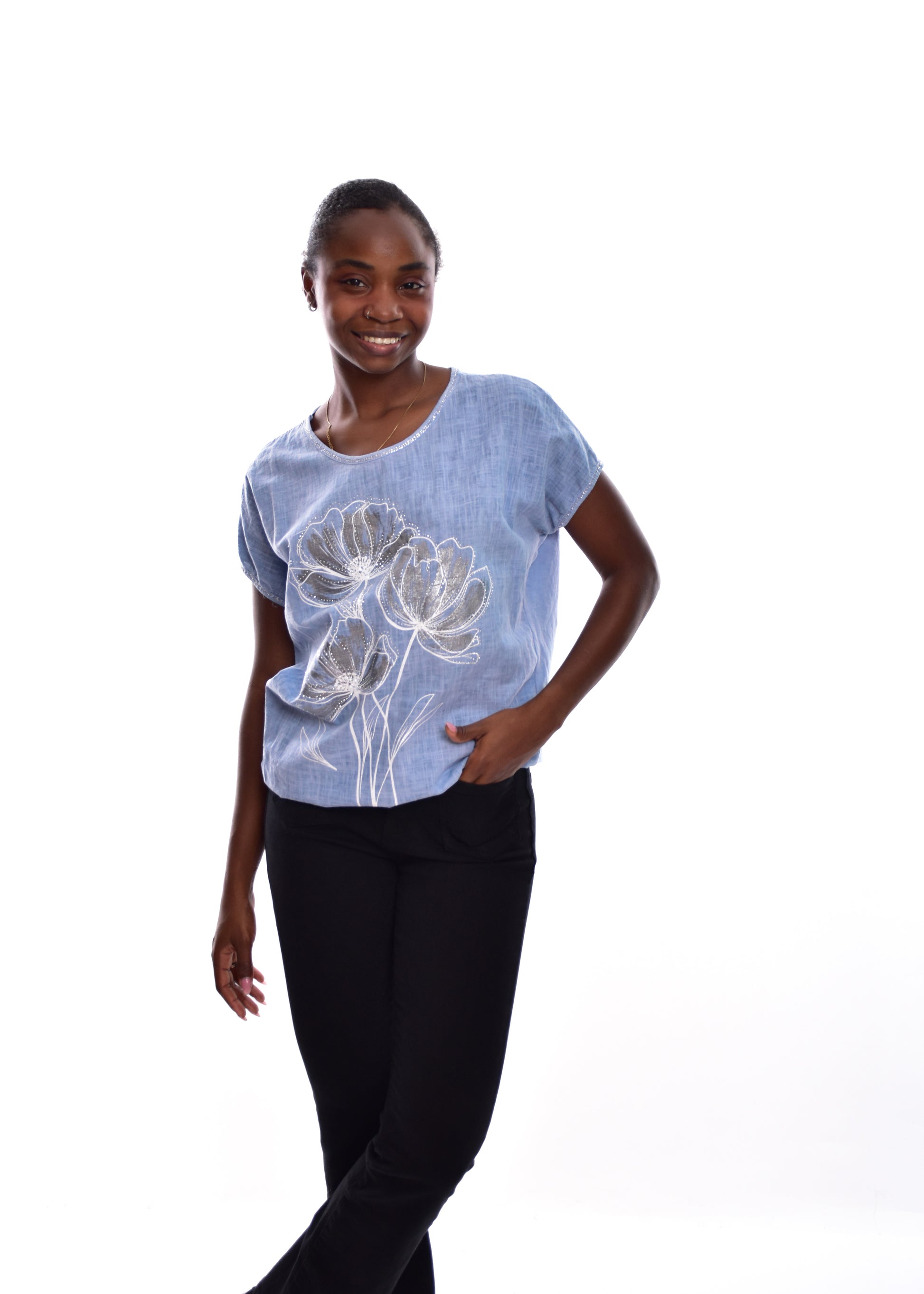 Camiseta fluída en tejido de Lino y algodón .Esta prenda está disponible en talla única, en este caso es apto hasta una talla 42.