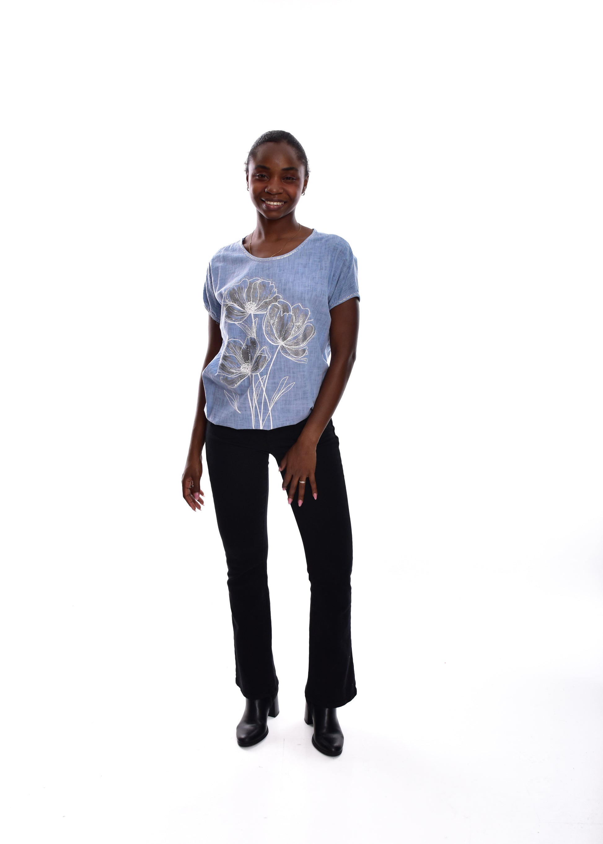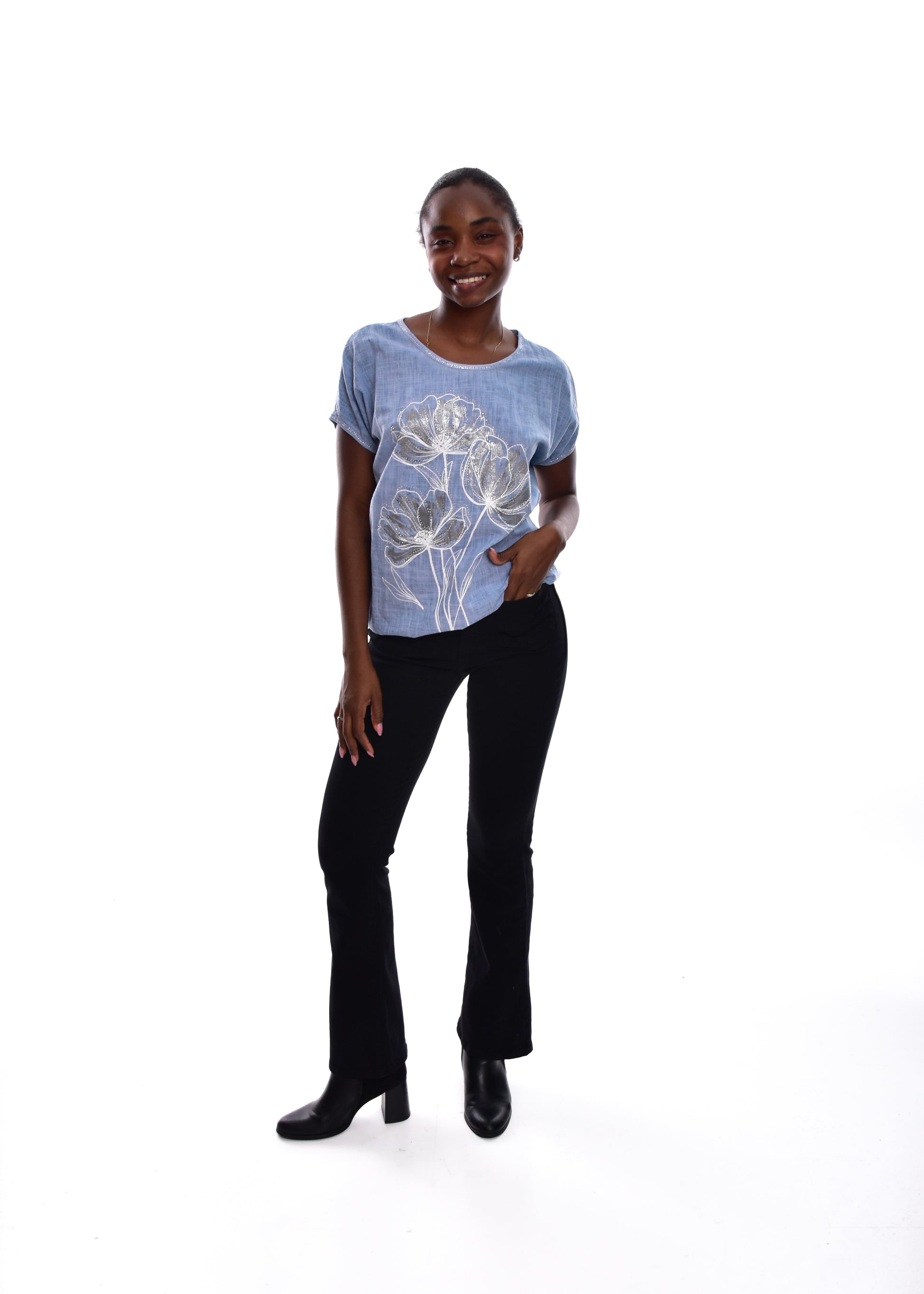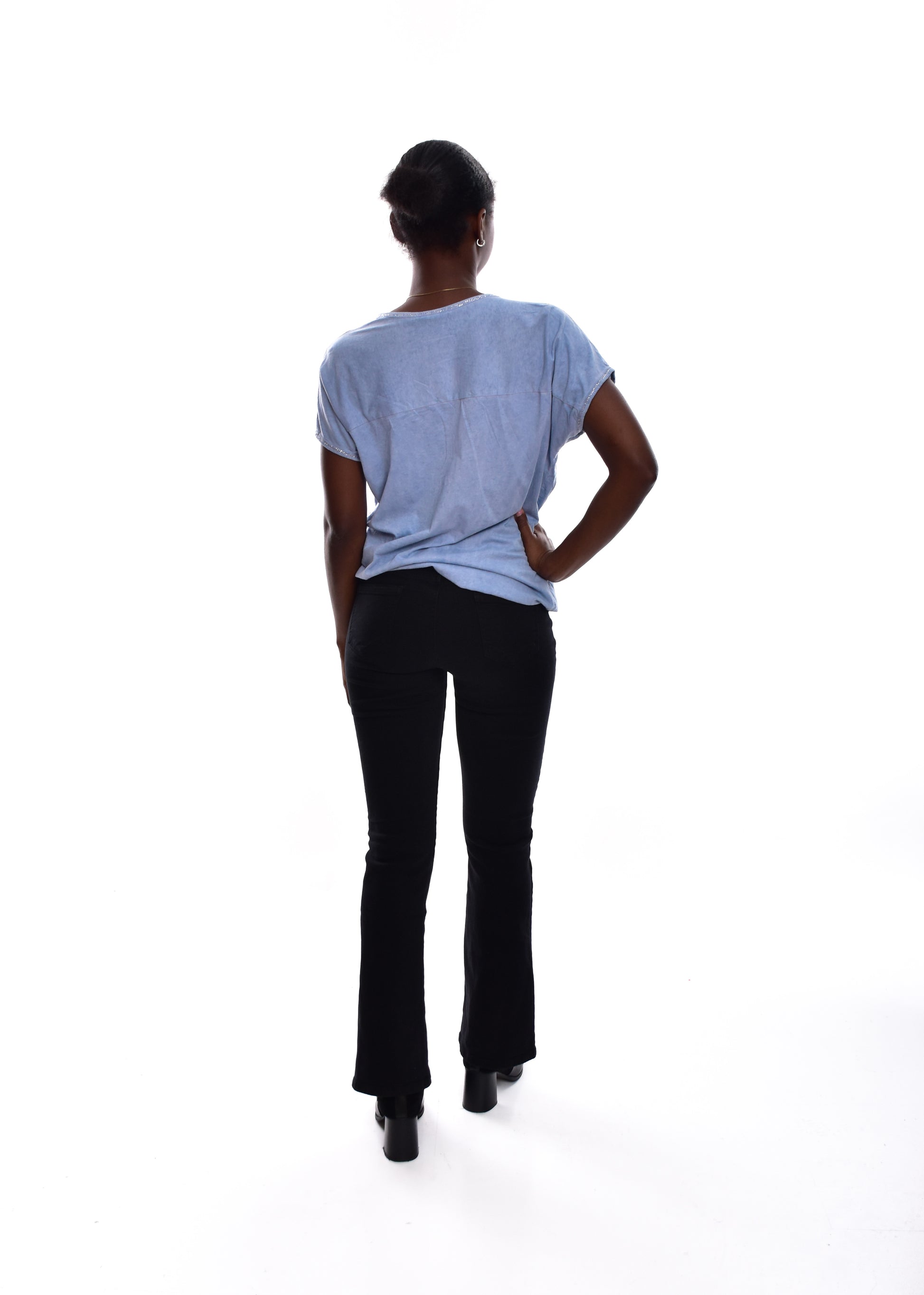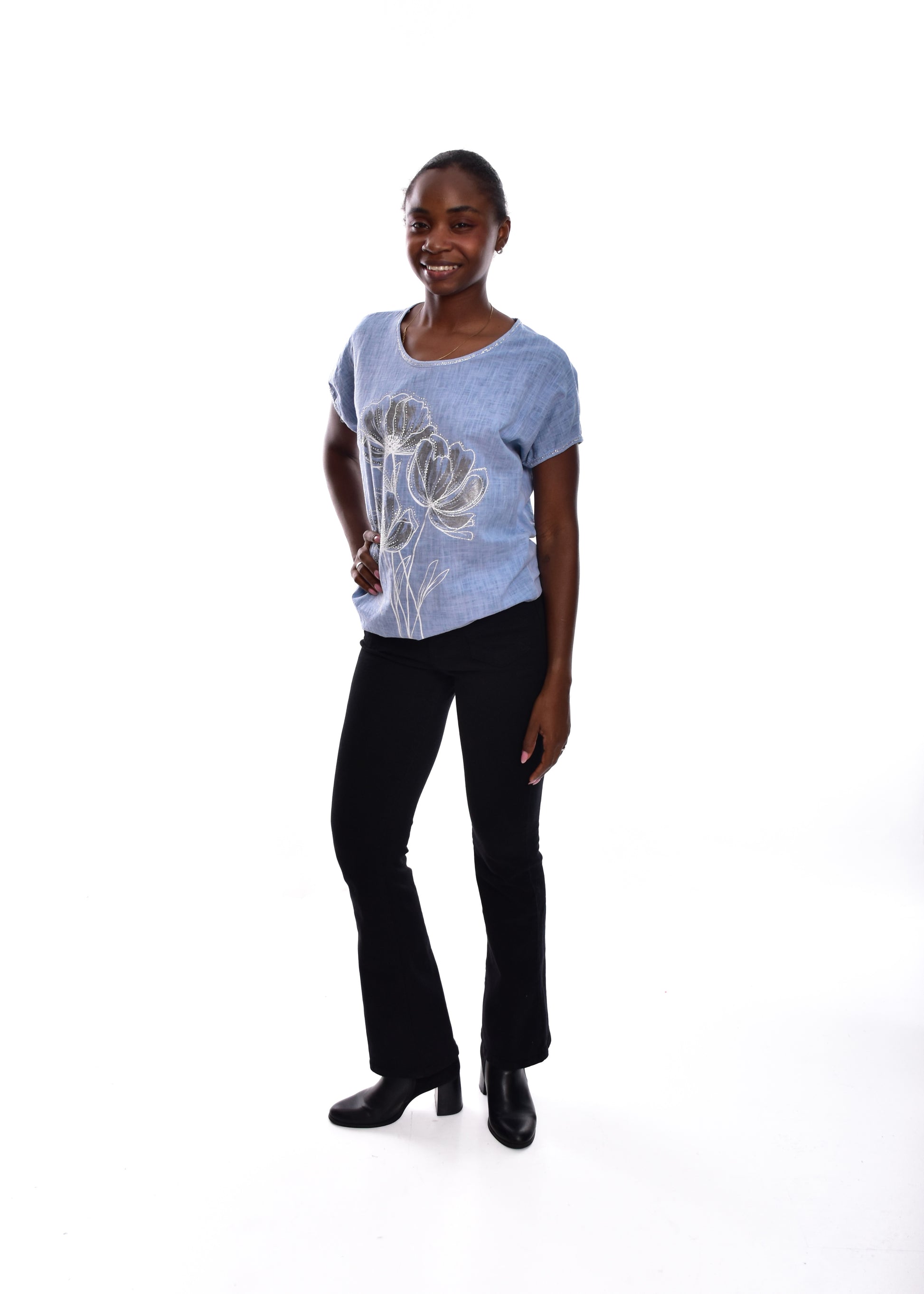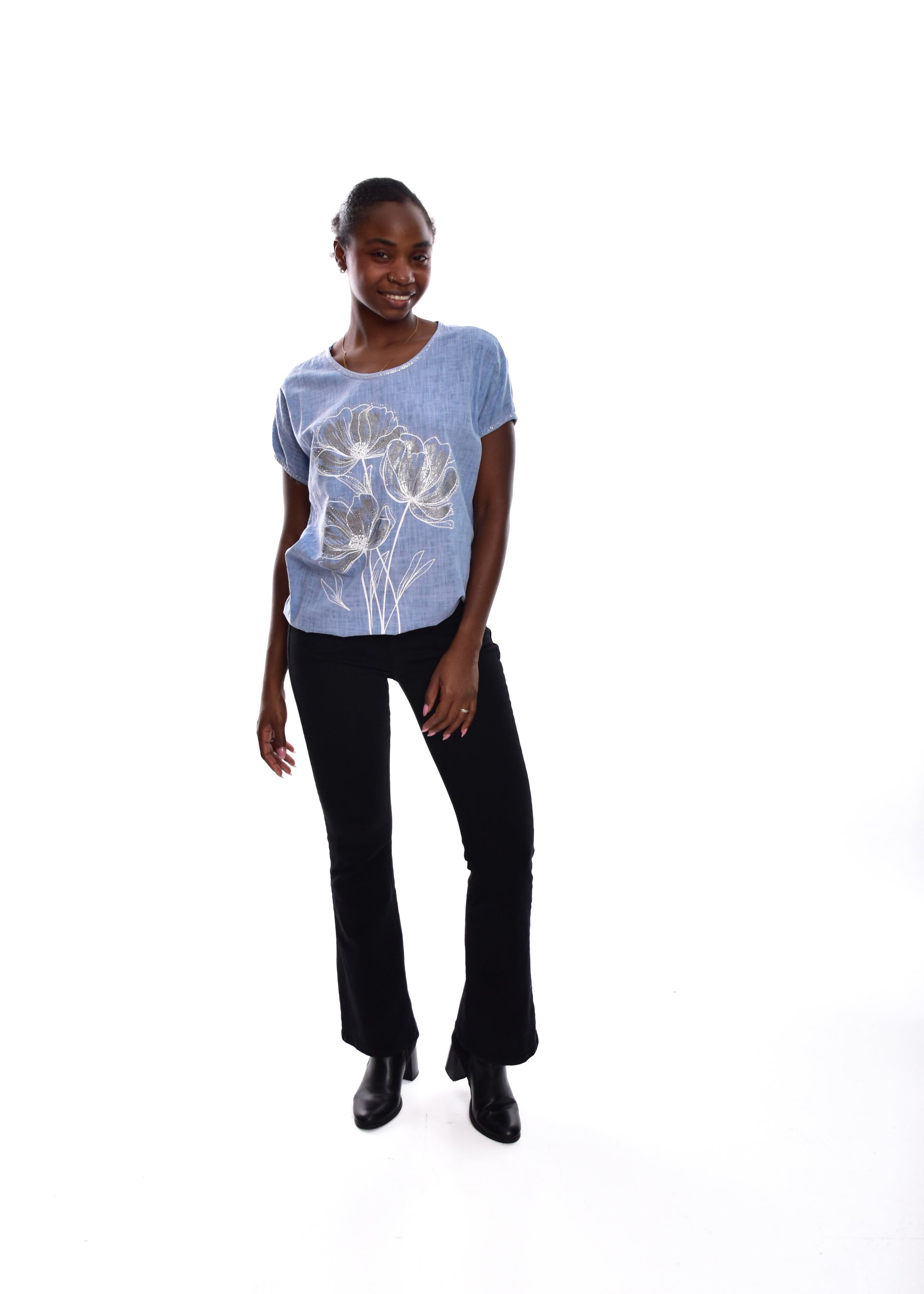 Camiseta fluída en tejido de Lino y algodón .Esta prenda está disponible en talla única, en este caso es apto hasta una talla 42.