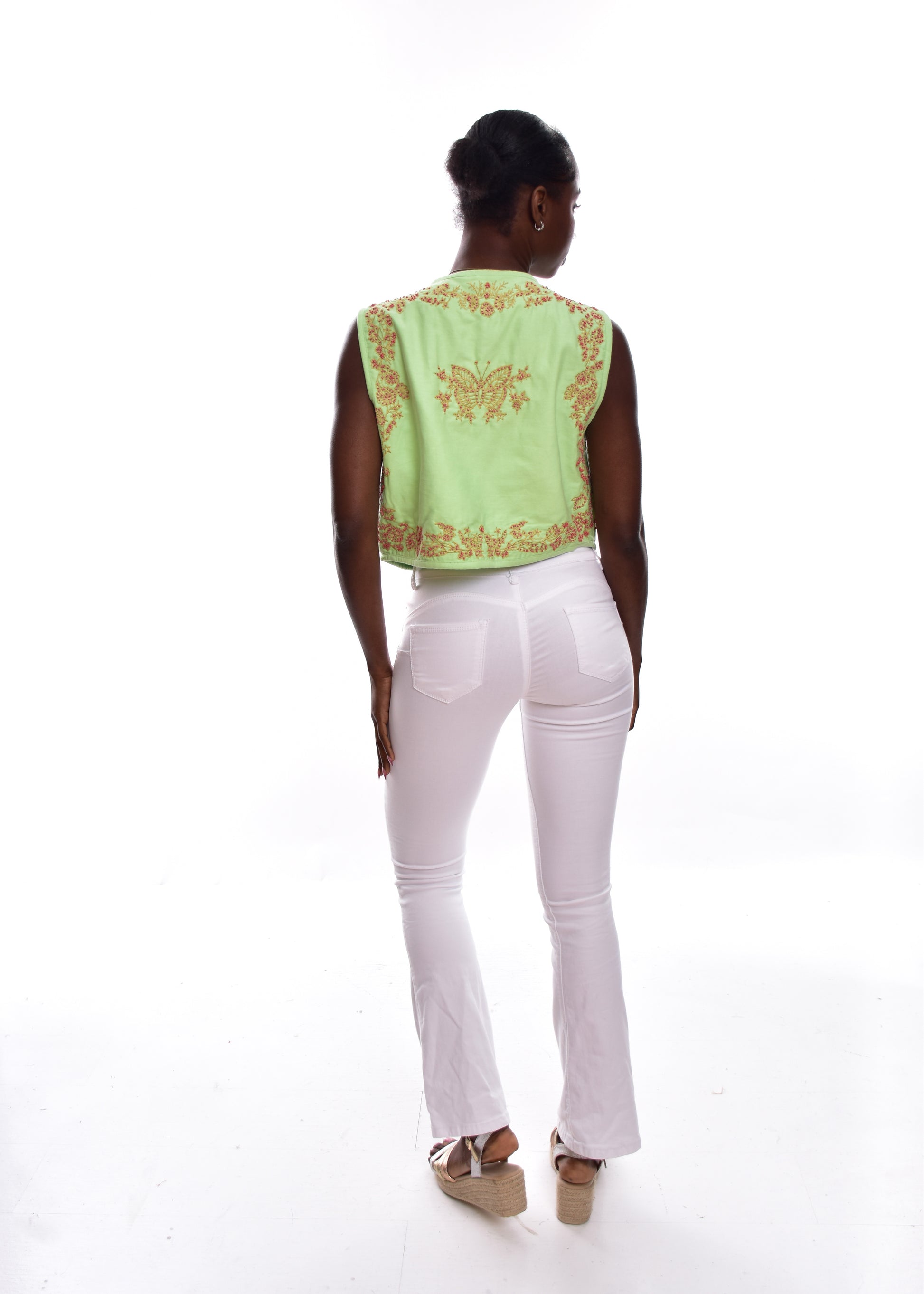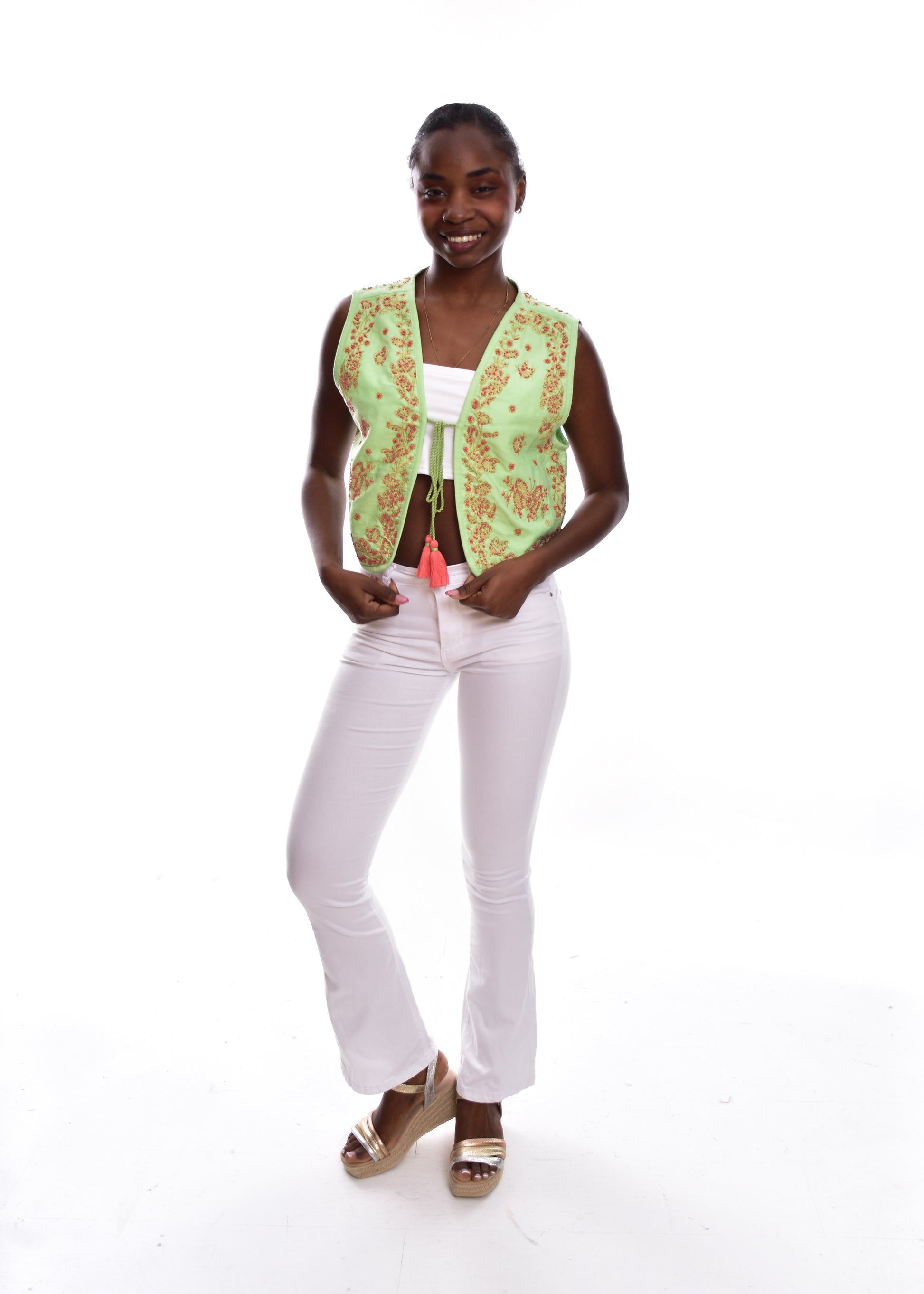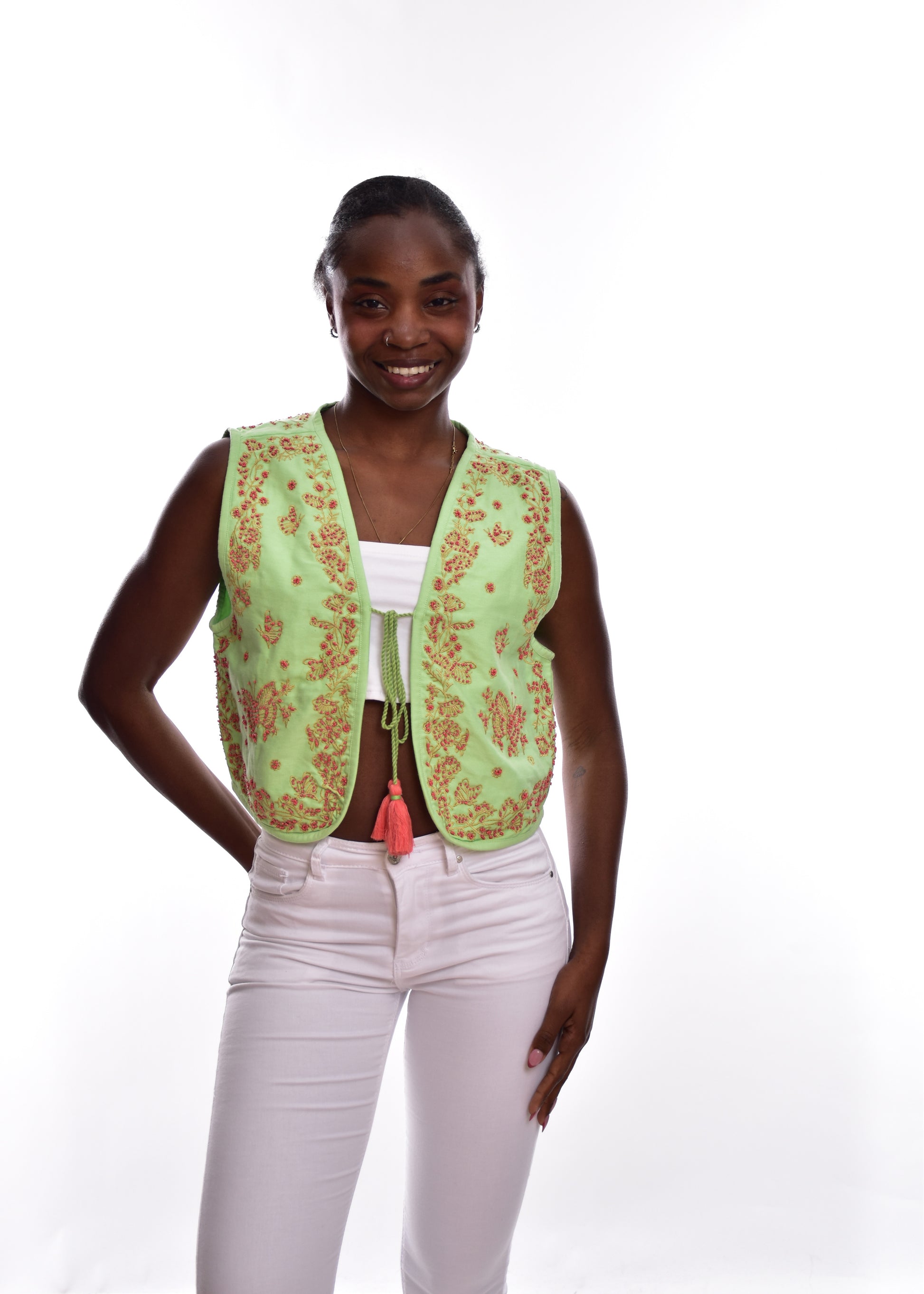 Chaleco bordado. Lleva detalles en pedrería y abalorios. Esta prenda es Talla Única, en este caso es apta hasta una talla 42. Si lo deseas puedes comprobar las medidas exactas de la prenda en el apartado " Talla y Medidas"