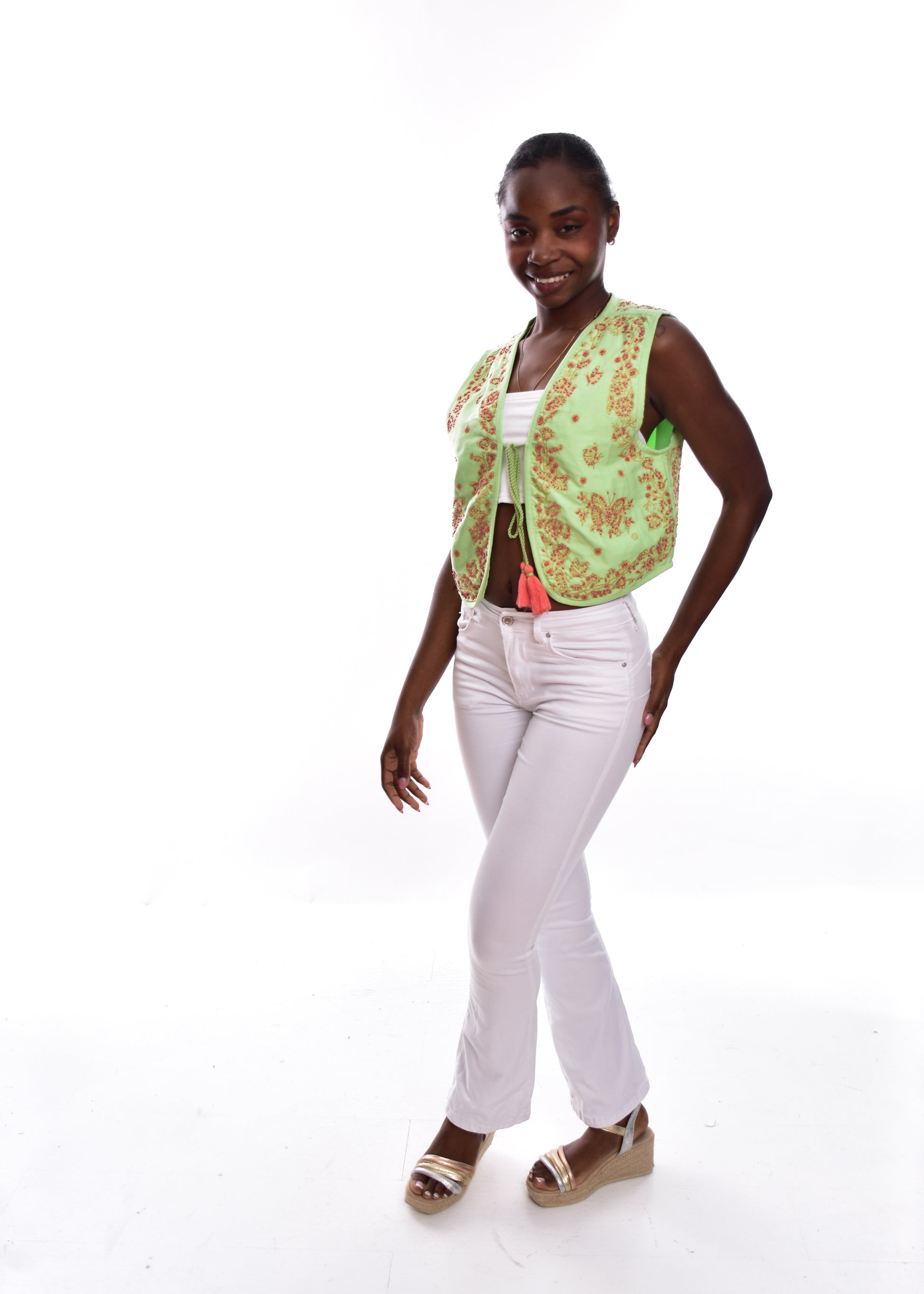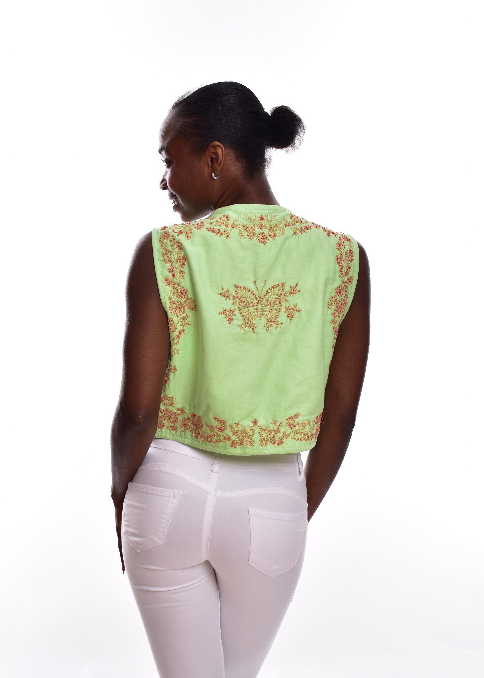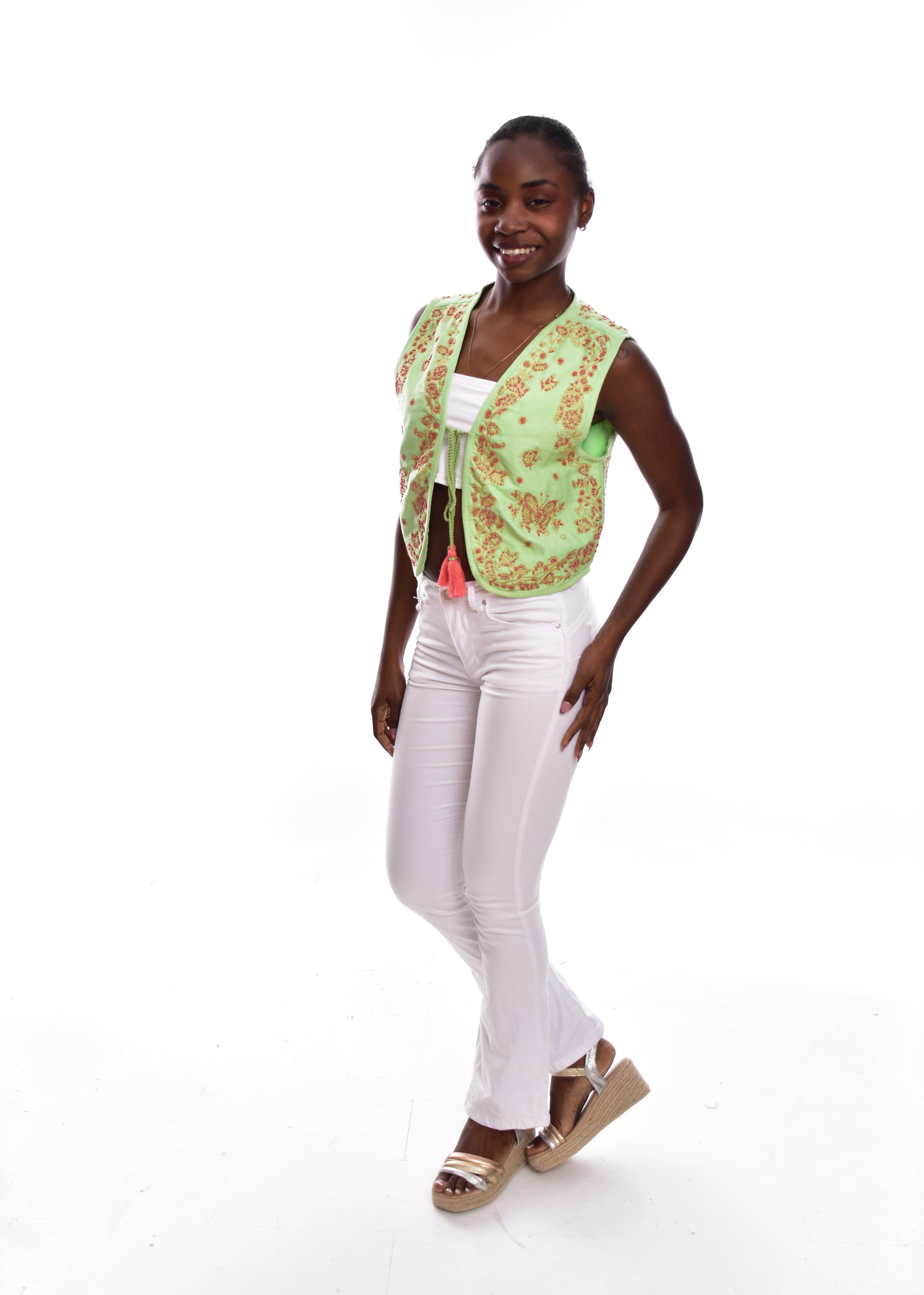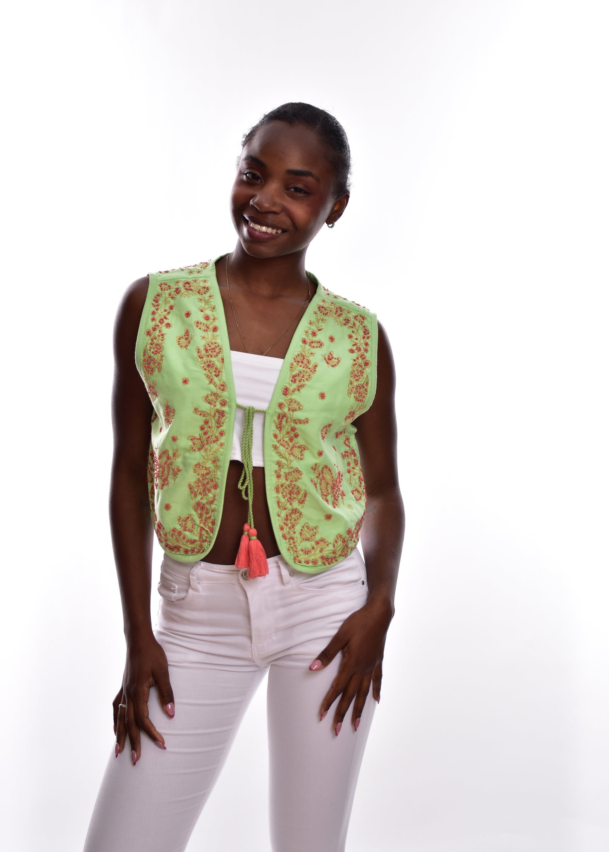 Chaleco bordado. Lleva detalles en pedrería y abalorios. Esta prenda es Talla Única, en este caso es apta hasta una talla 42. Si lo deseas puedes comprobar las medidas exactas de la prenda en el apartado " Talla y Medidas"