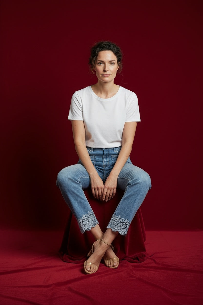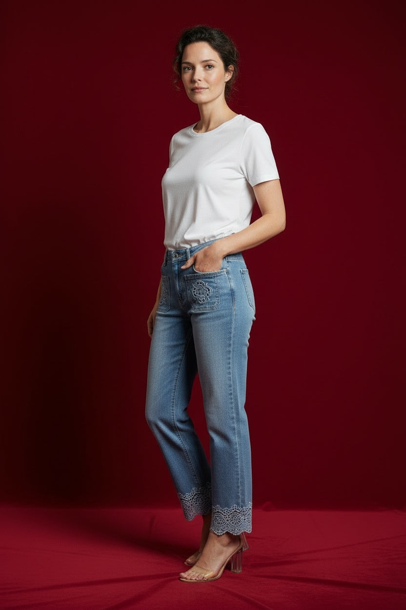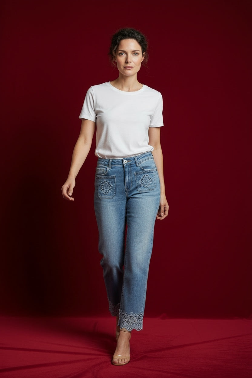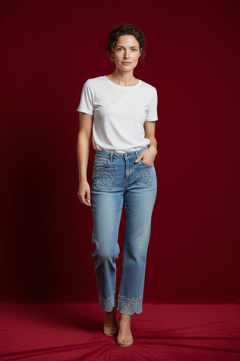 Pantalón vaquero con troquelados. Esta prenda está disponible de la talla XS a la XXL, en este caso es apto hasta una talla 44.
