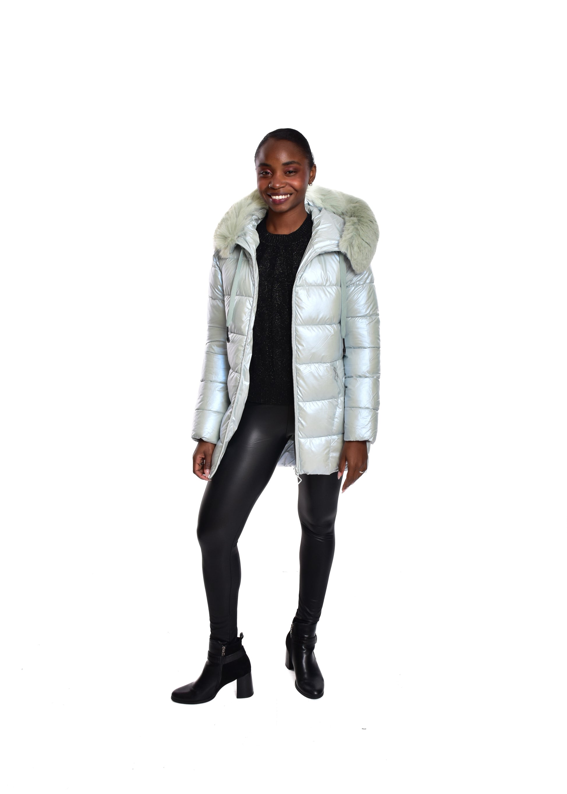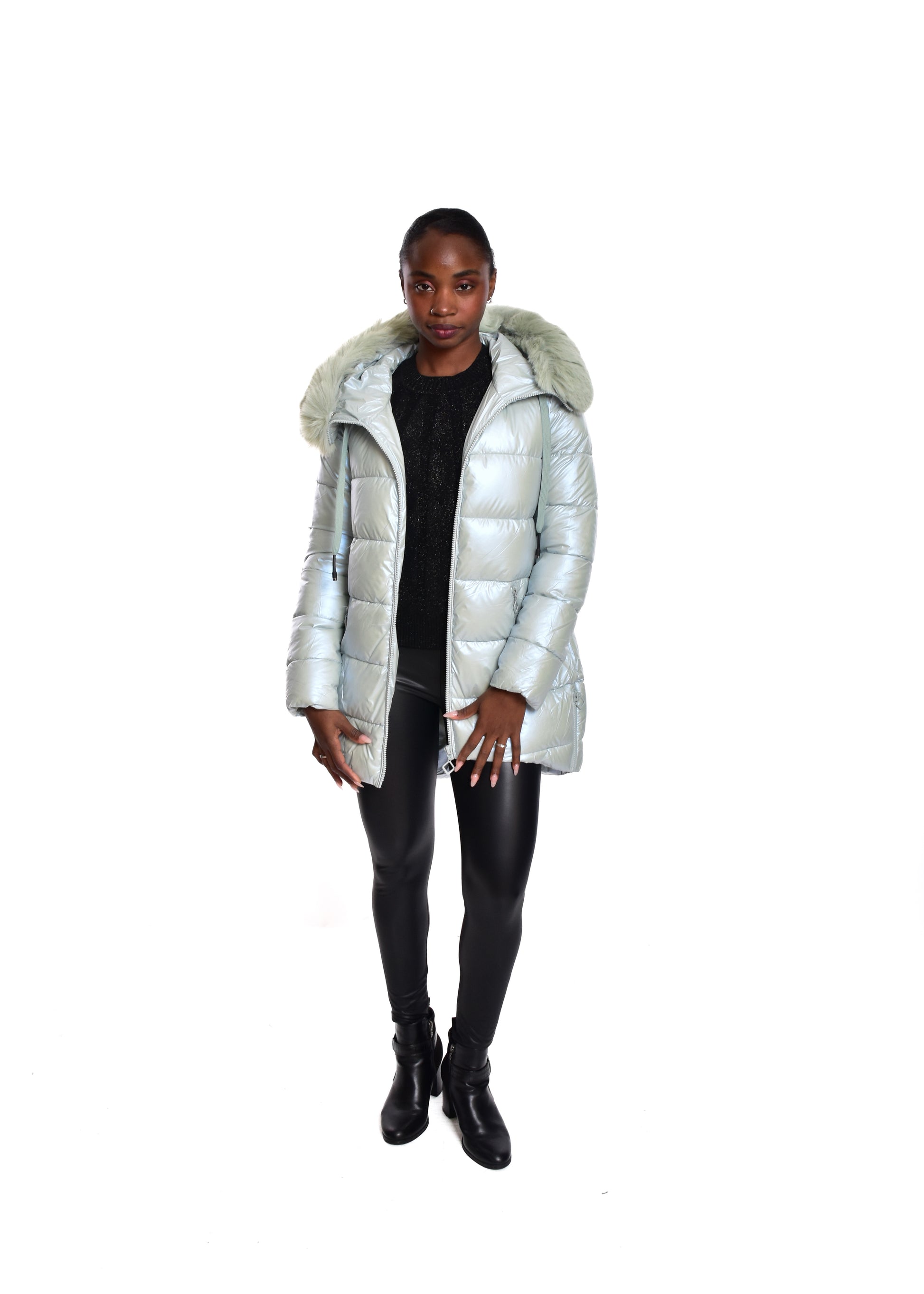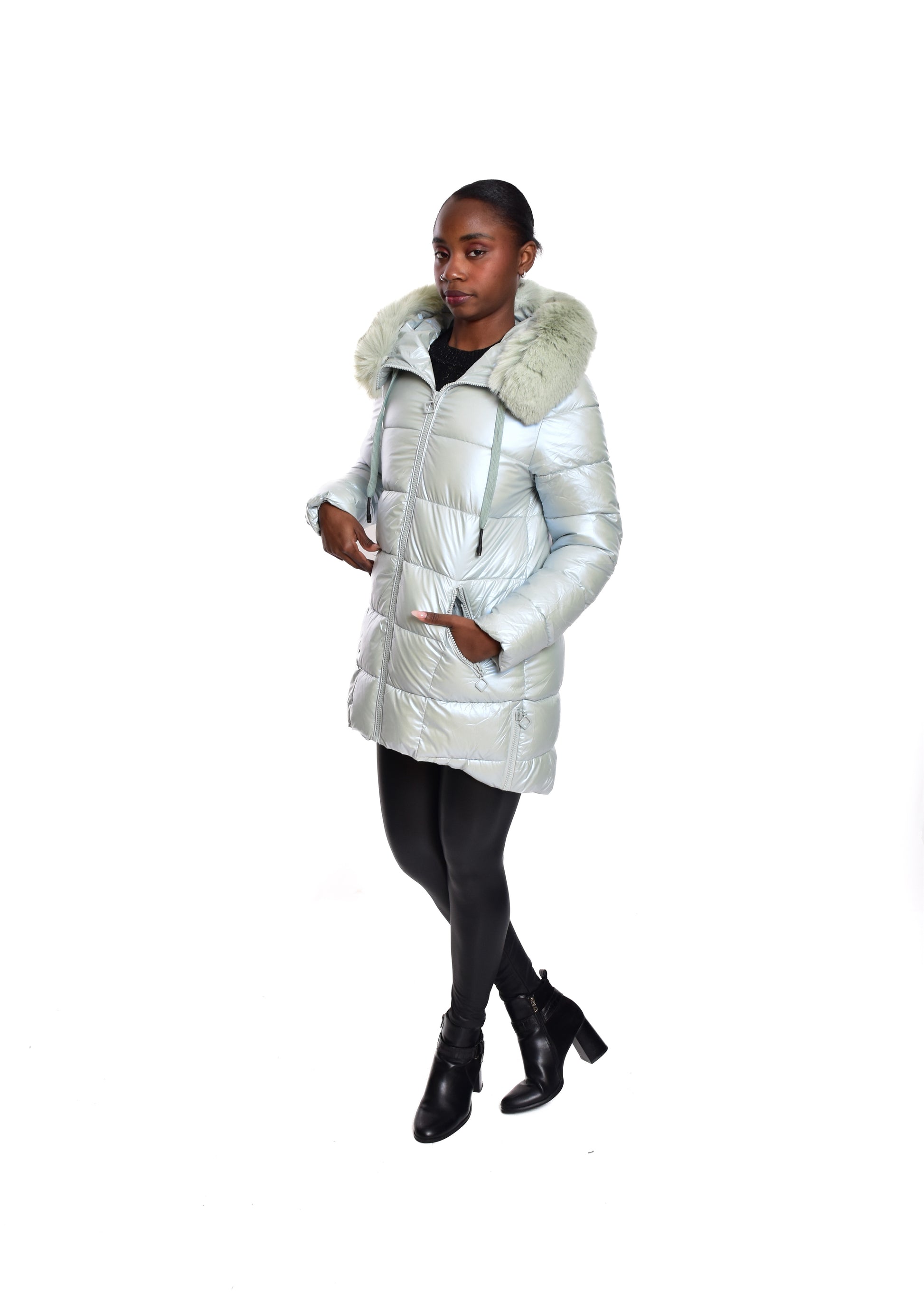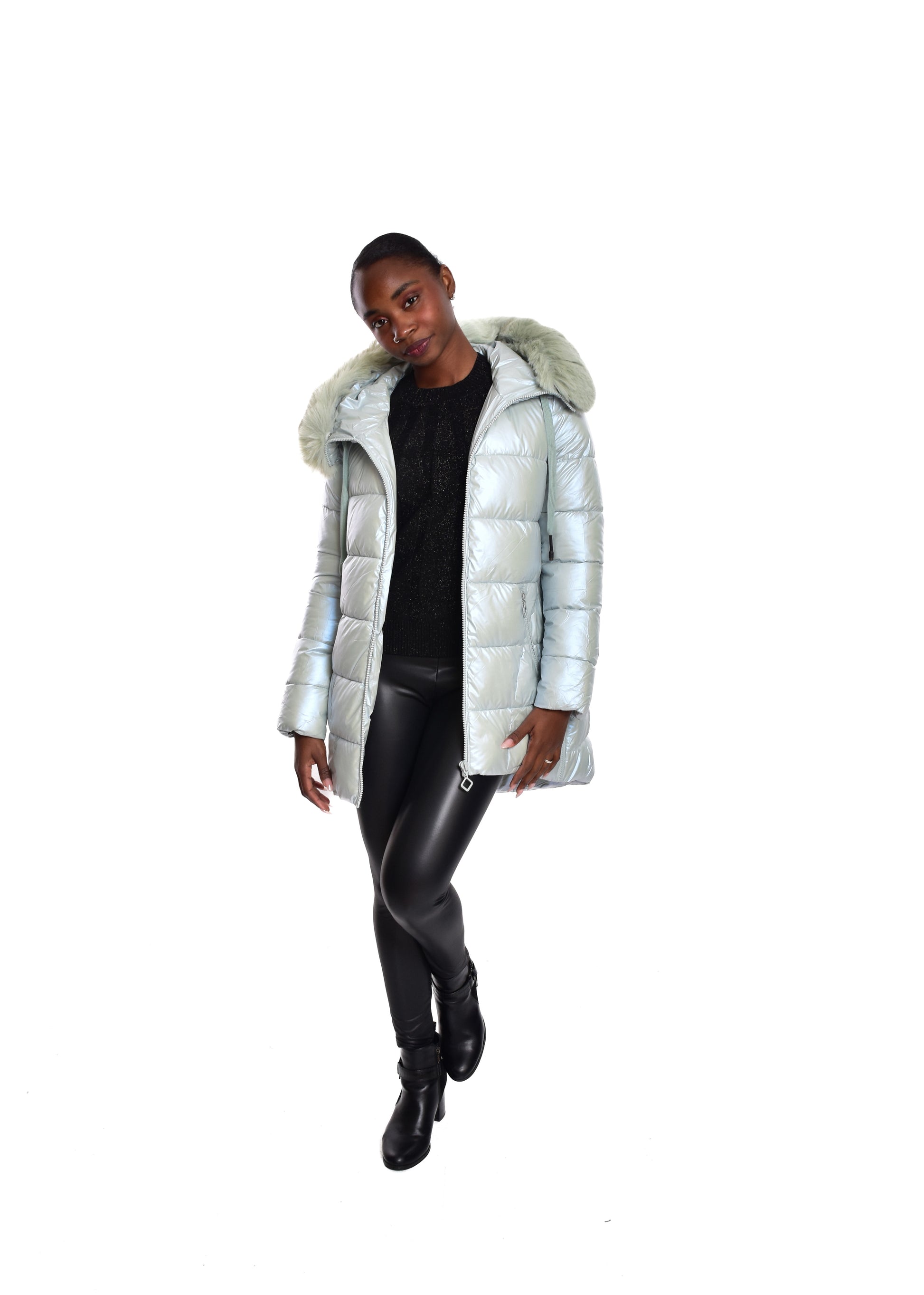 Cazadora Acolchada con efecto brillante. Cuenta con múltiples bolsillos. El pelo de la capucha se puede retirar.Este modelo está disponible de la talla S a la XXL, en este caso es apta hasta una talla 42.