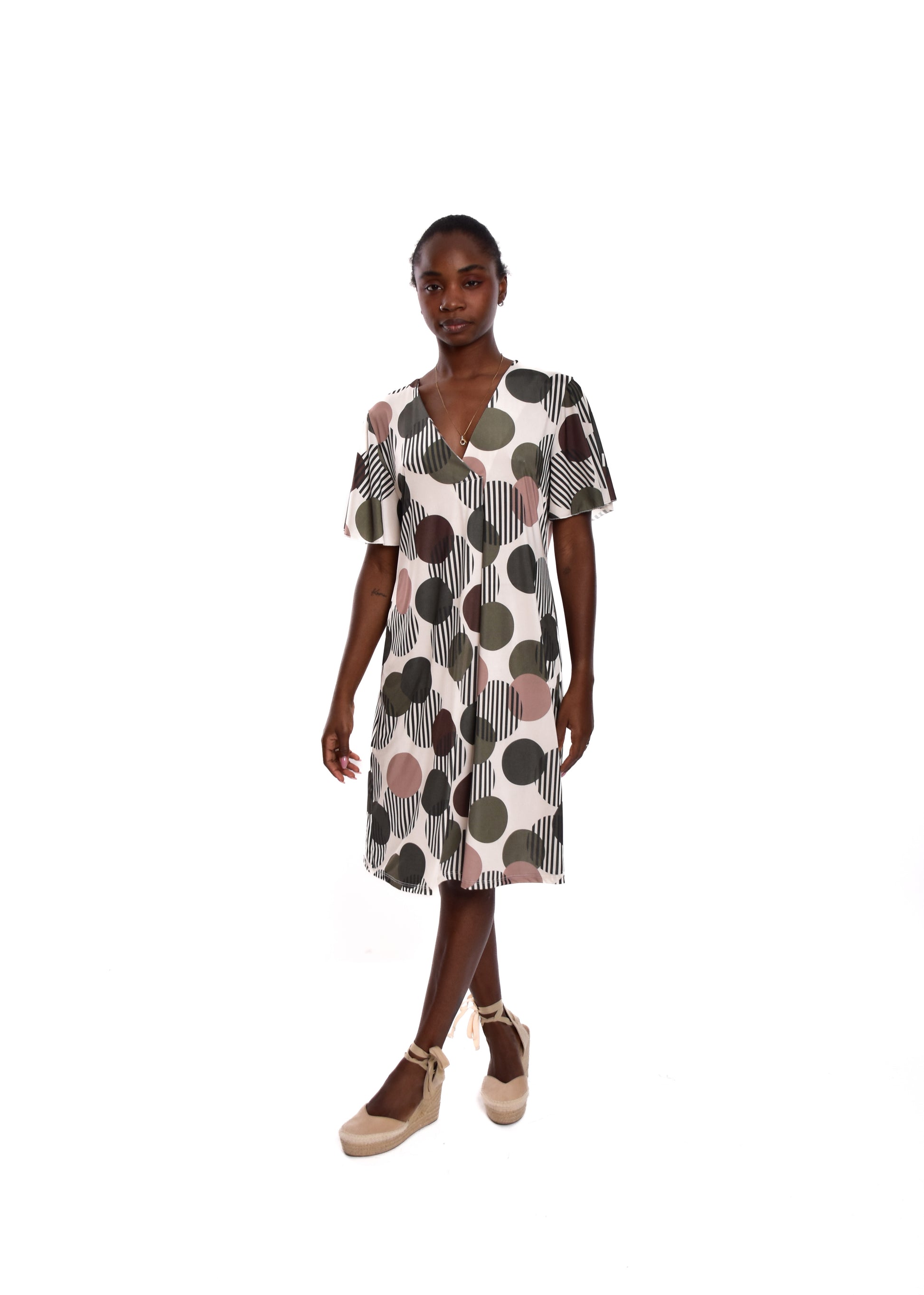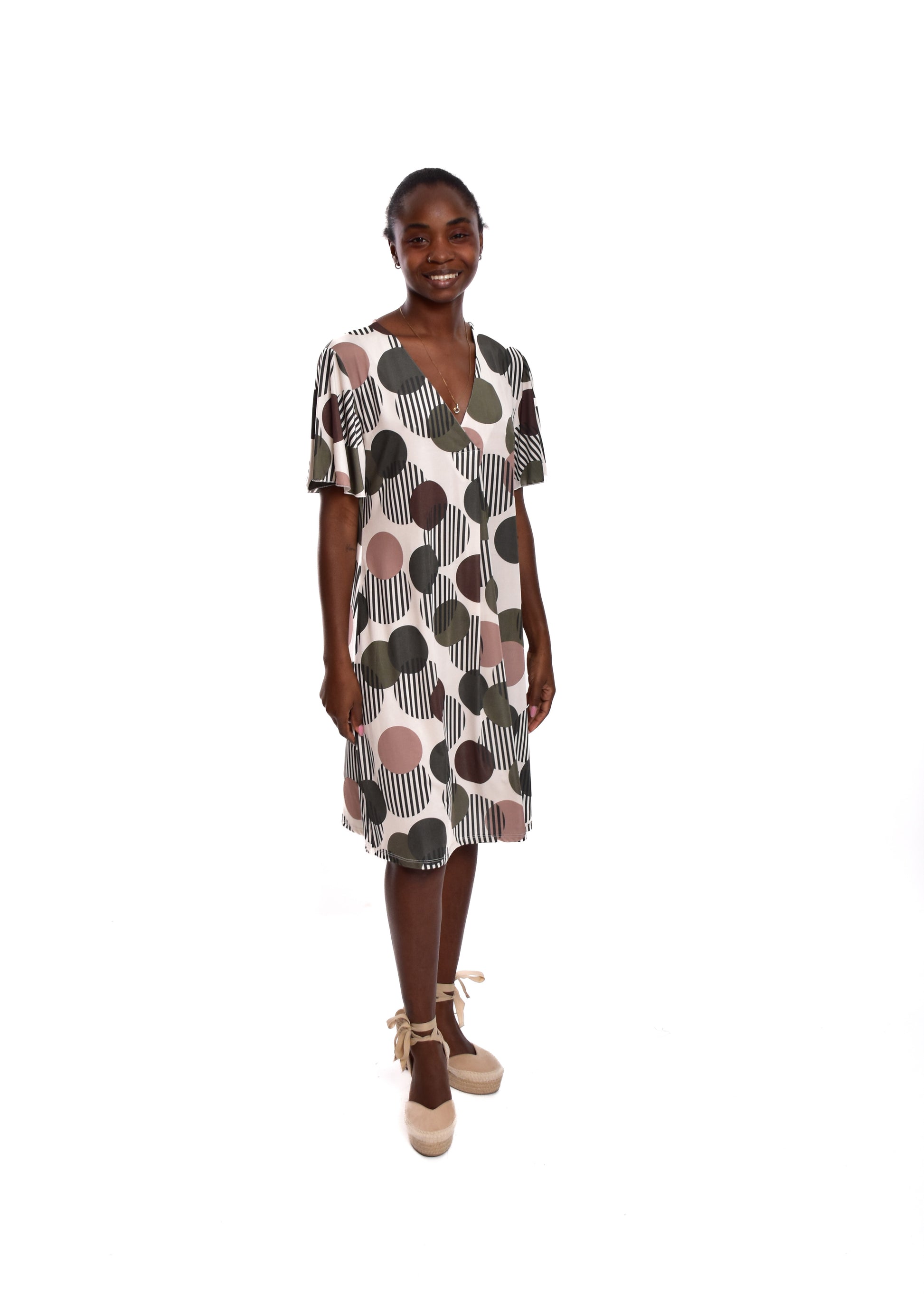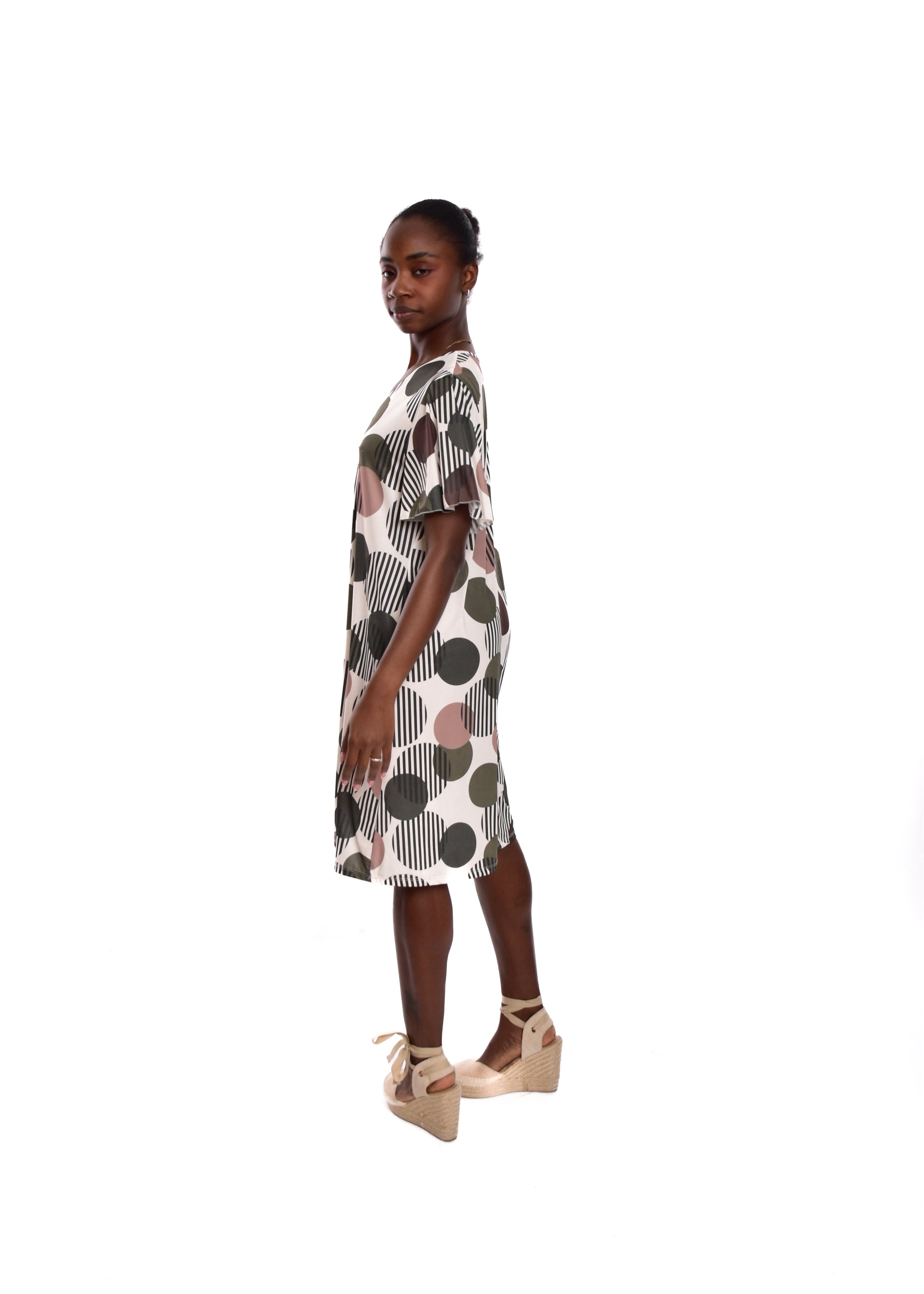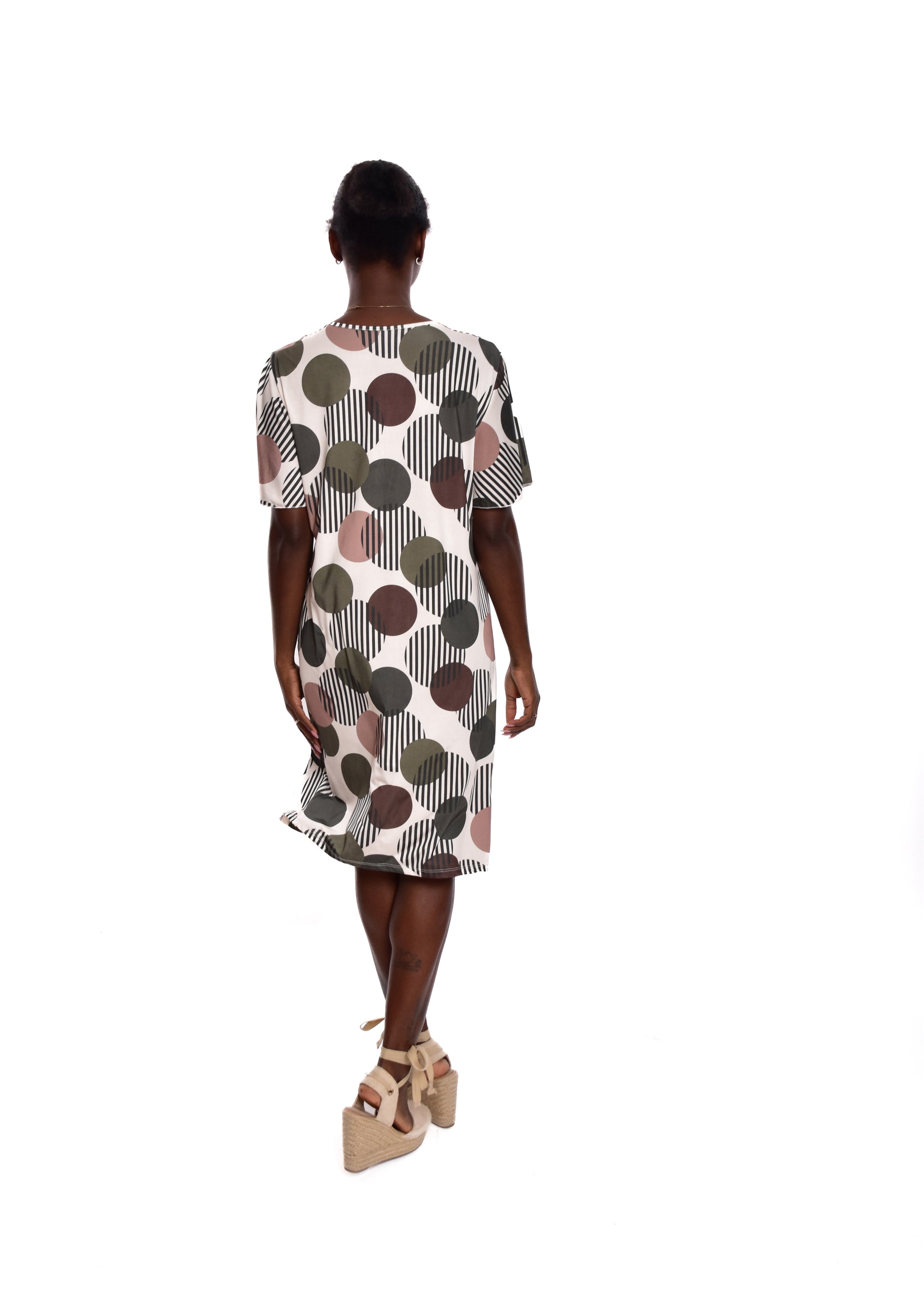 Un vestido cómodo y fresco con estampado de círculos en tonos khaki. Su manga corta y corte ajustado lo hacen perfecto para el día a día, aportando estilo y comodidad sin esfuerzo.