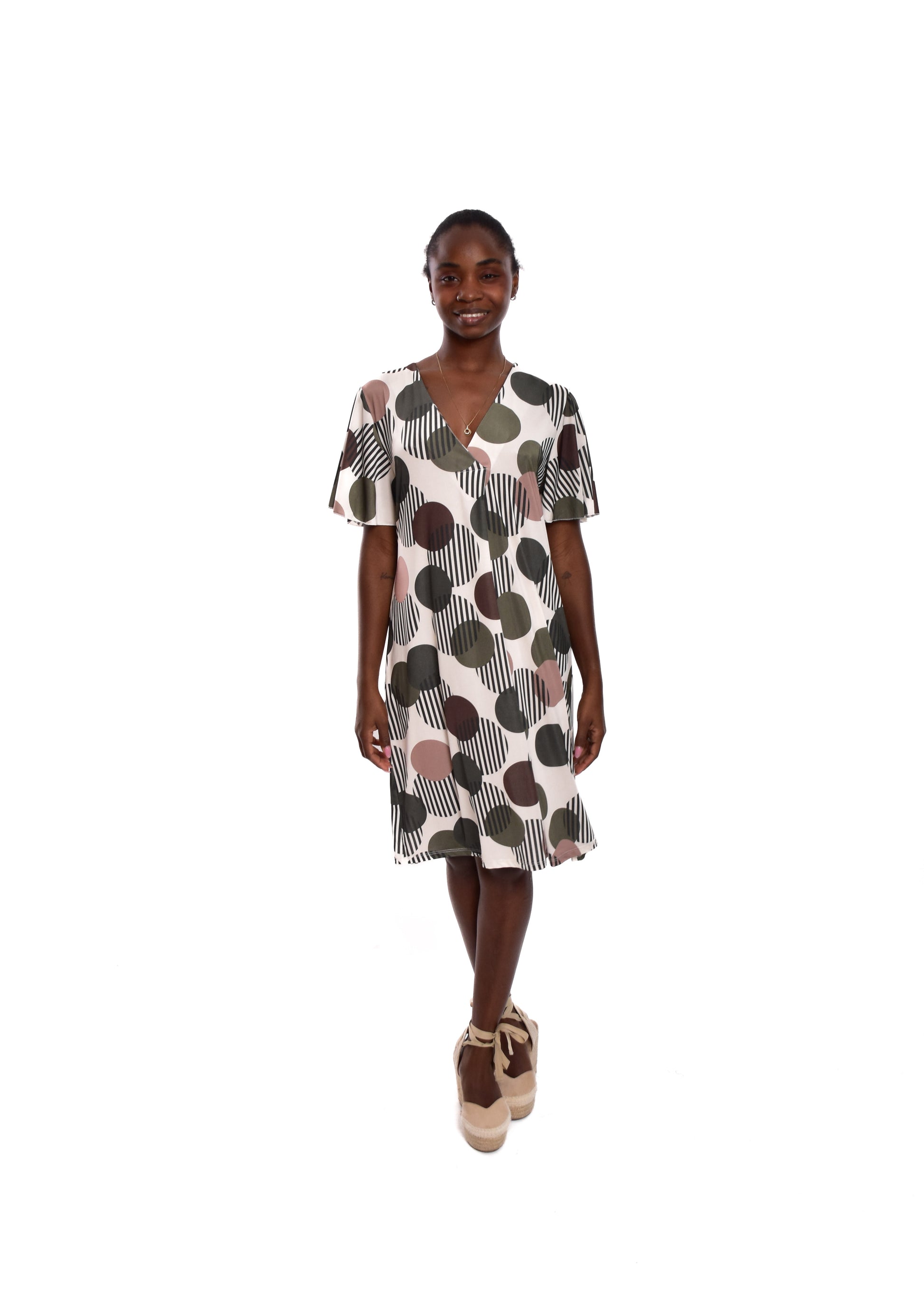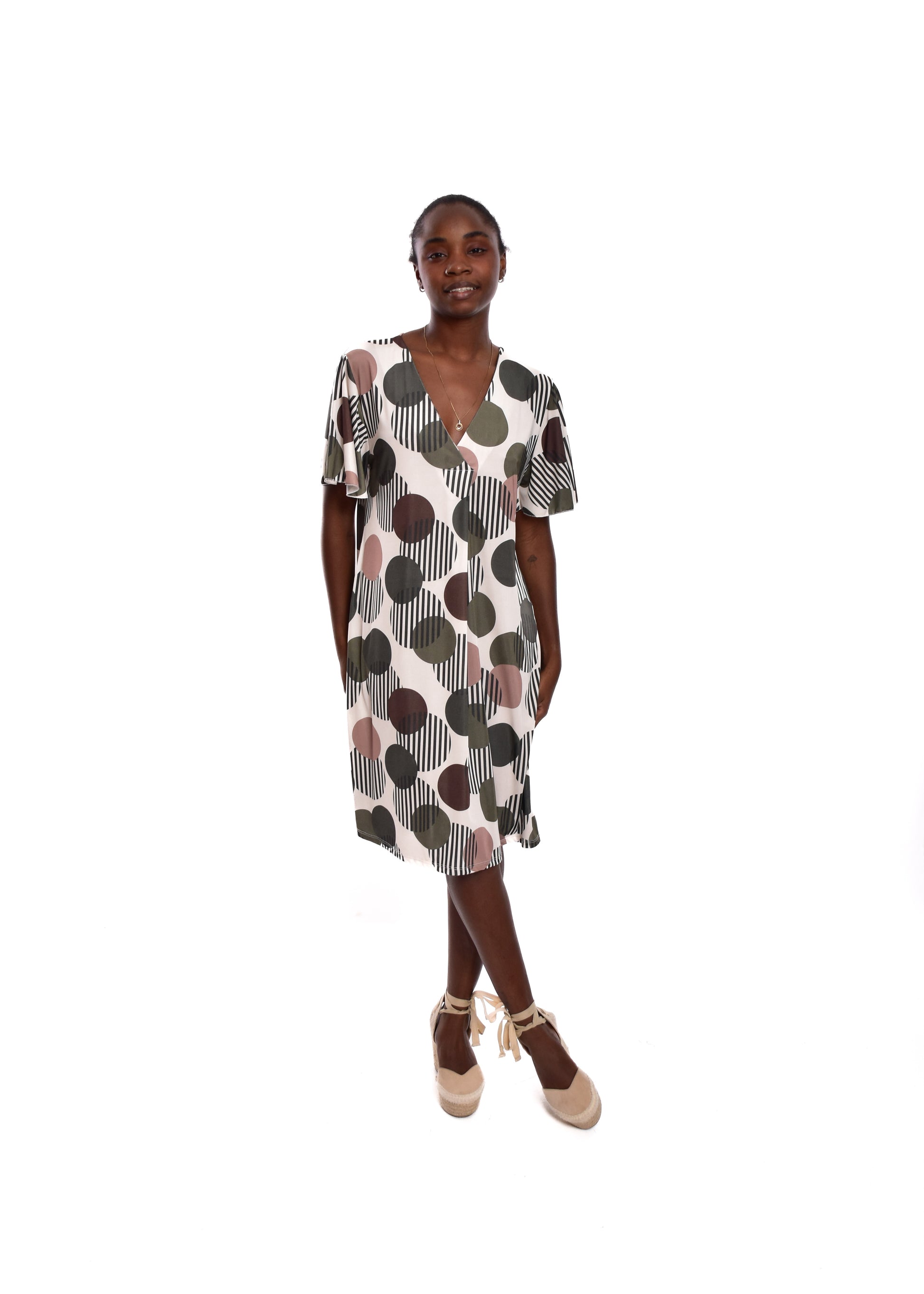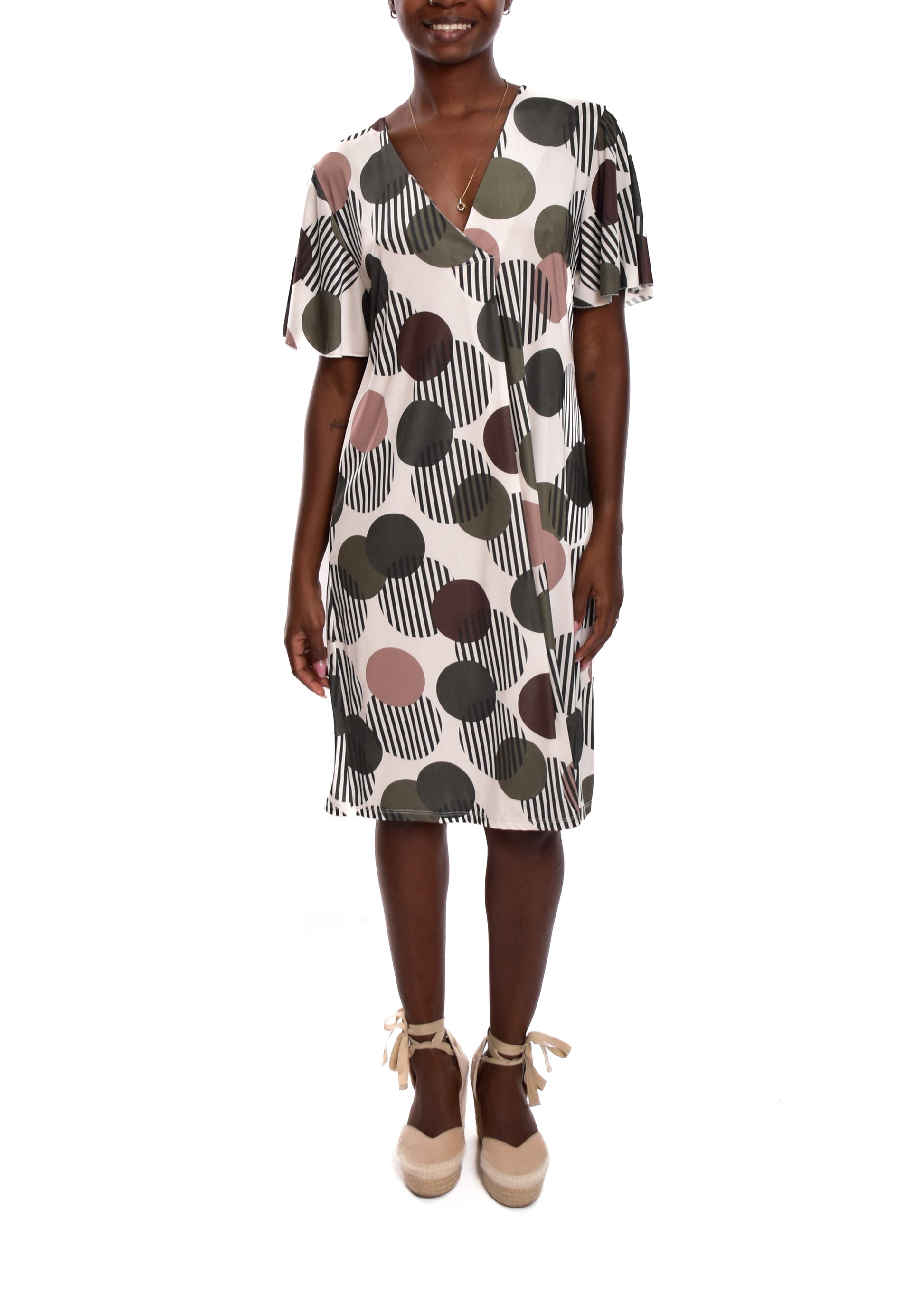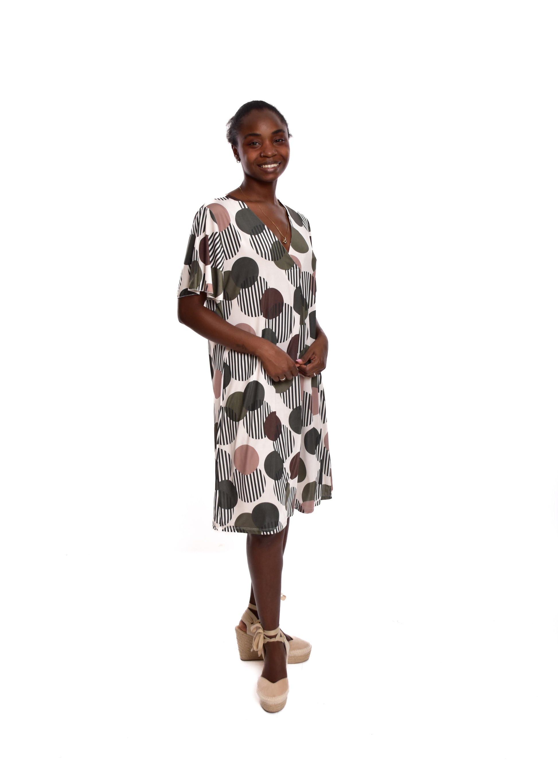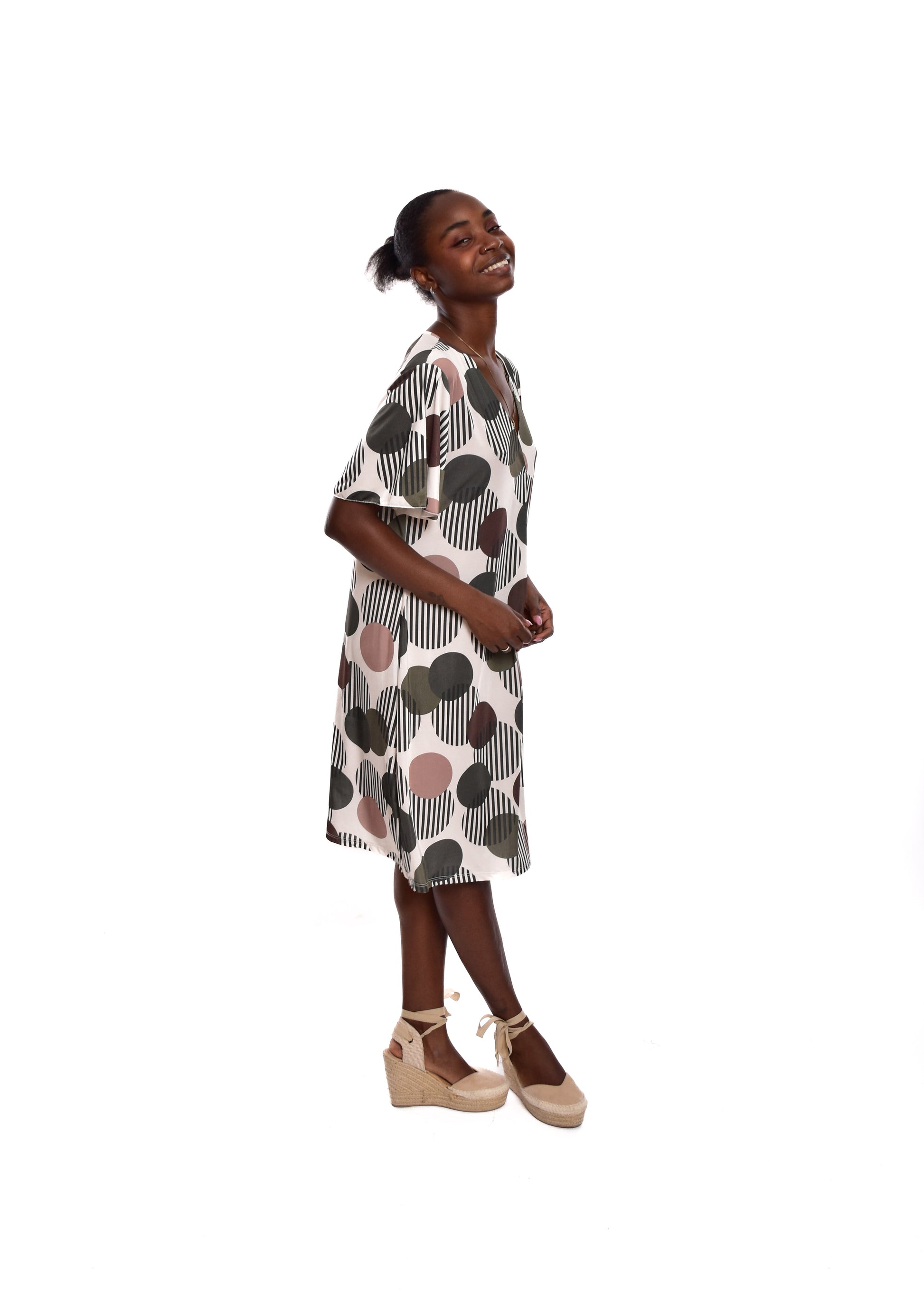 Un vestido cómodo y fresco con estampado de círculos en tonos khaki. Su manga corta y corte ajustado lo hacen perfecto para el día a día, aportando estilo y comodidad sin esfuerzo.