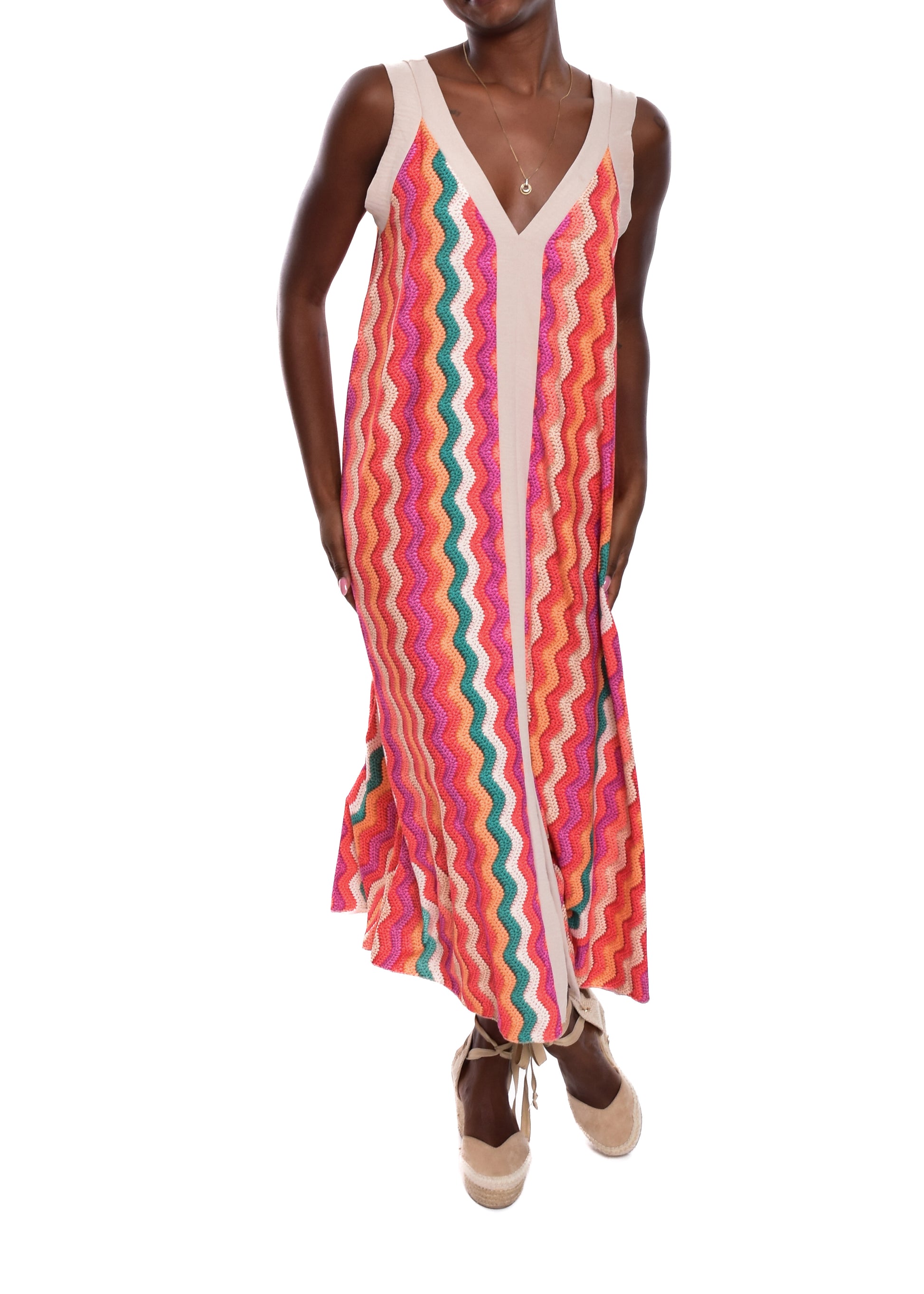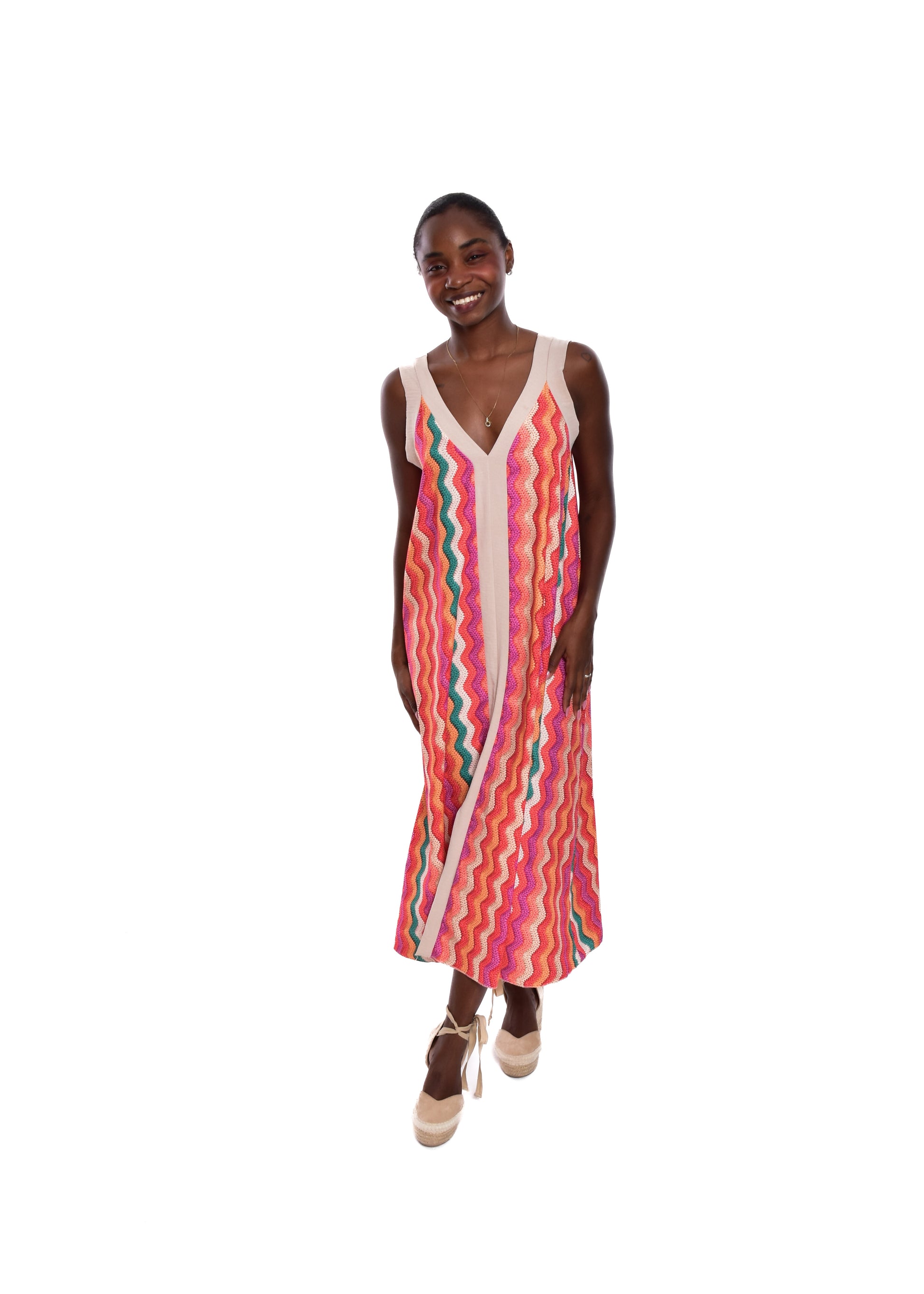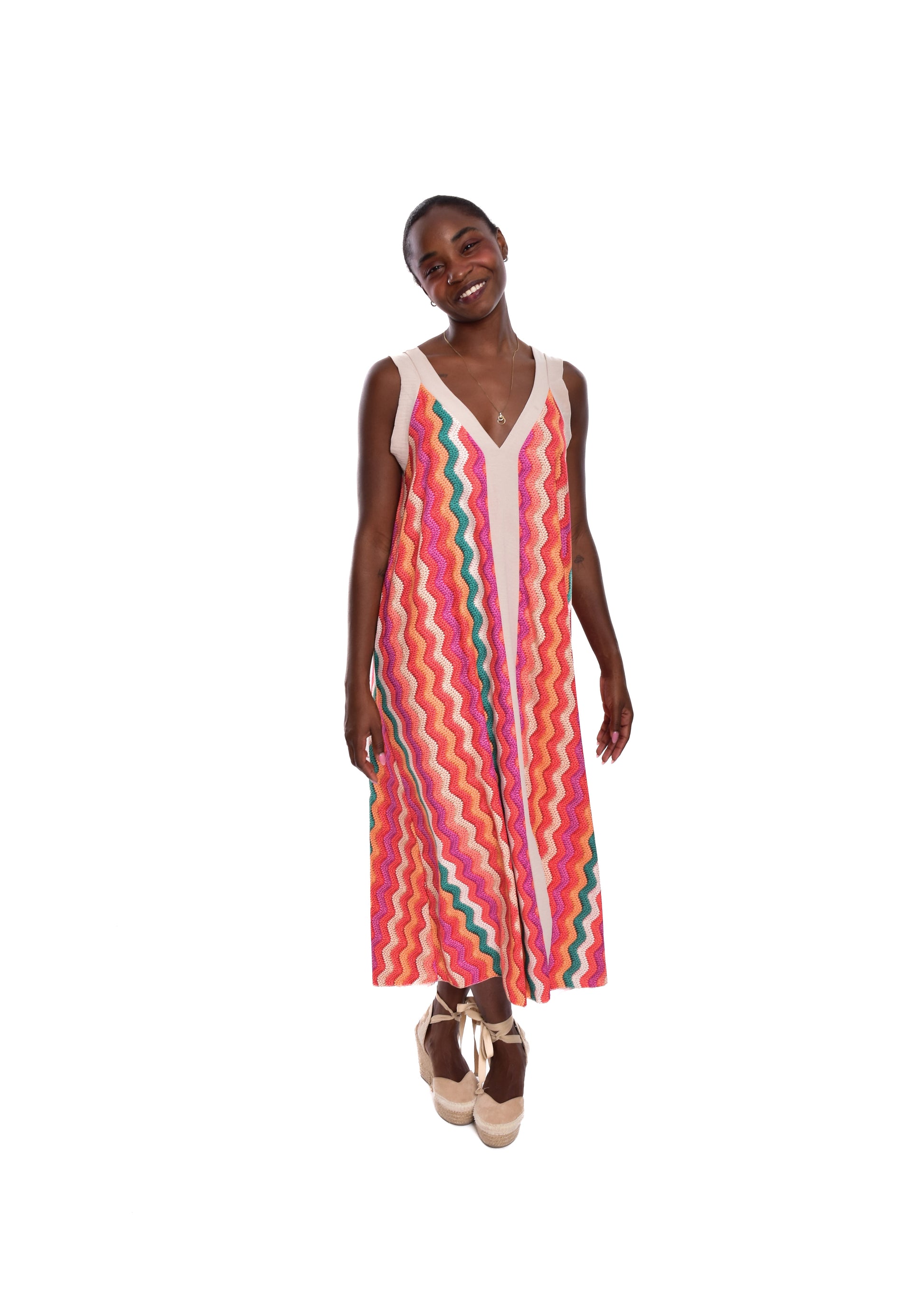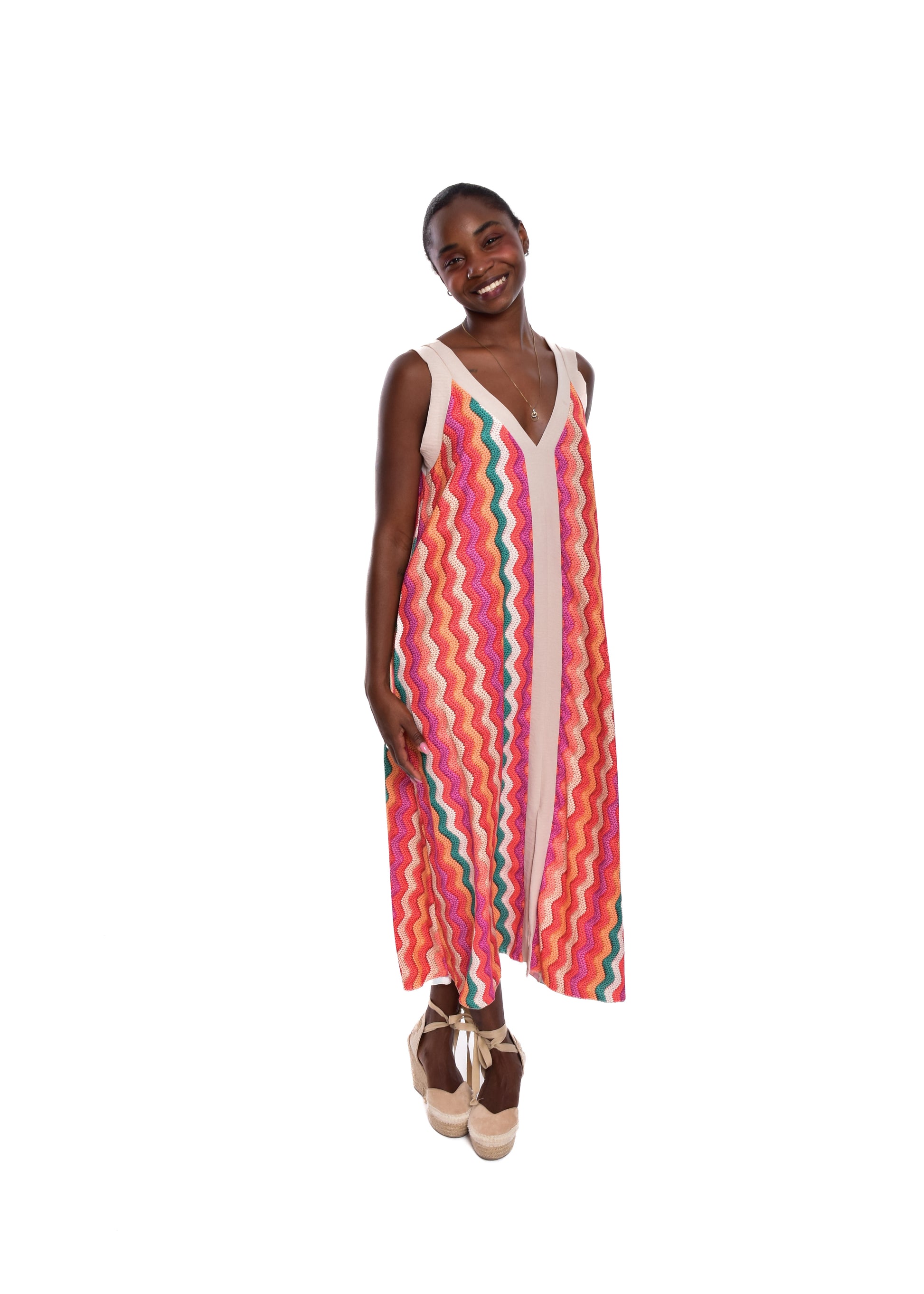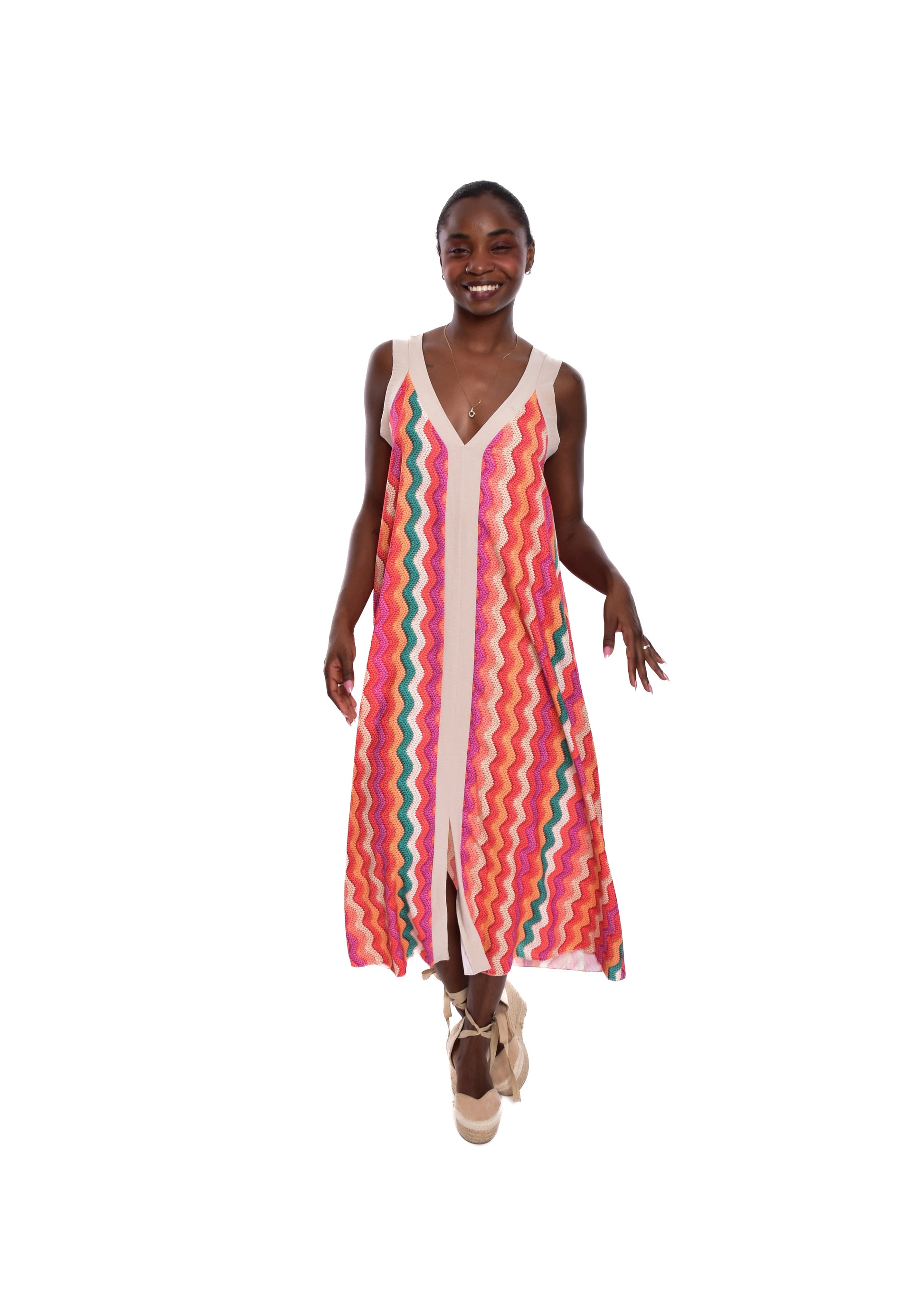 Vestido fluído con escote en pico. Estampado con forma de ondas. Este modelo está disponible en talla única. En este caso es apto de una 38 a una 42.