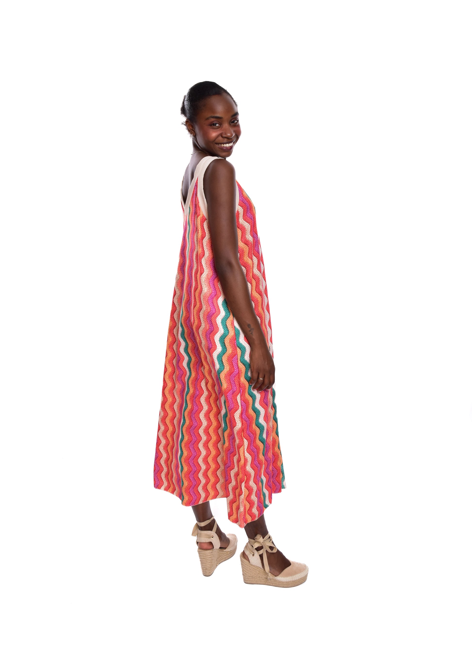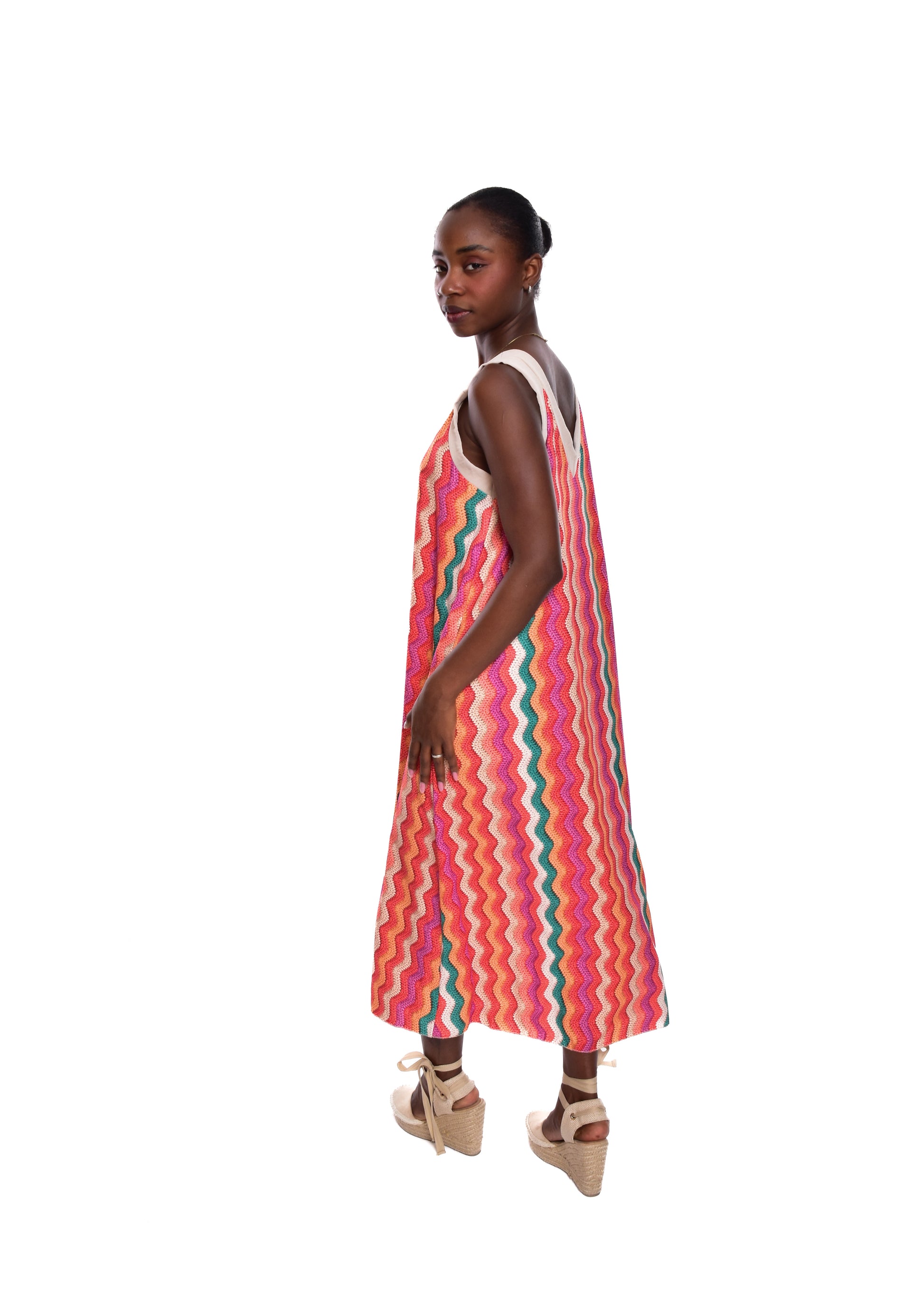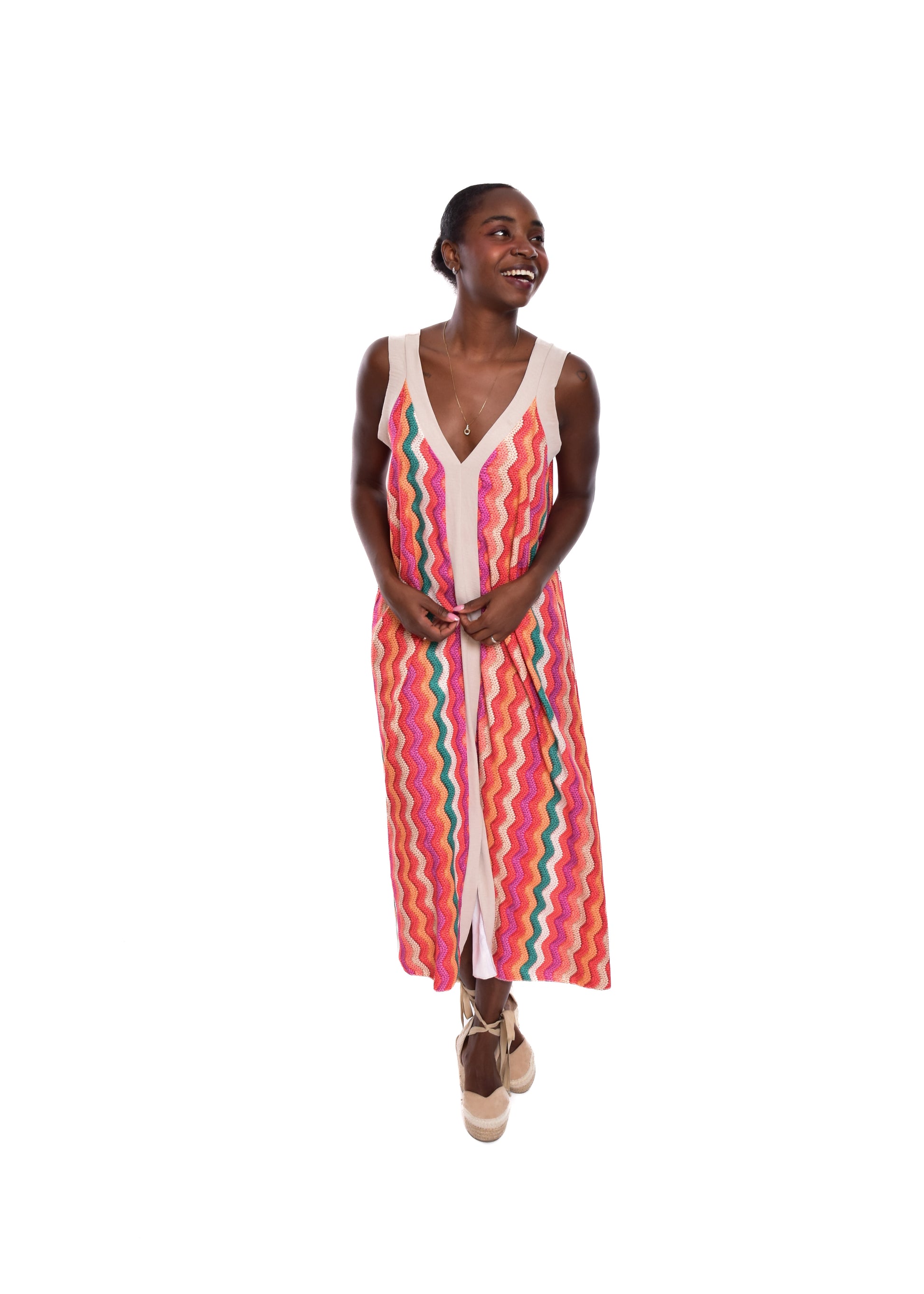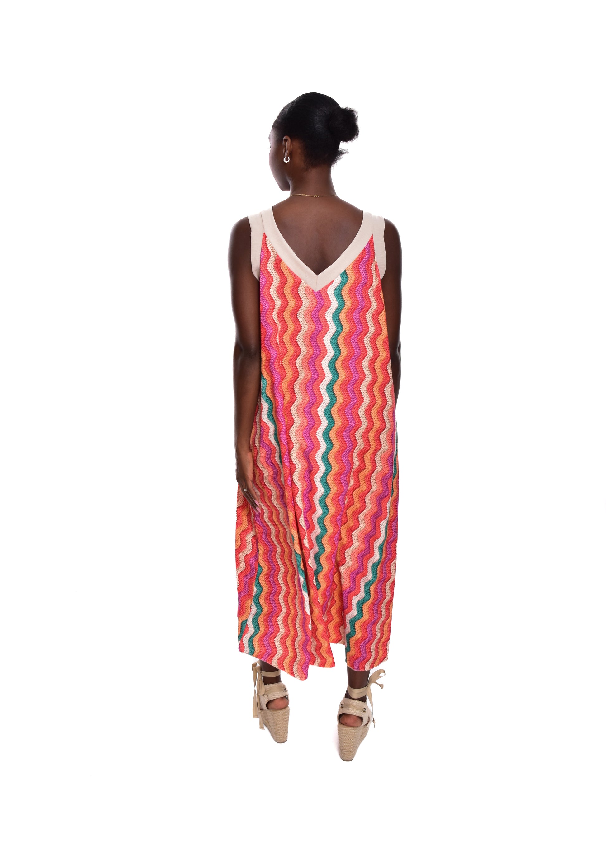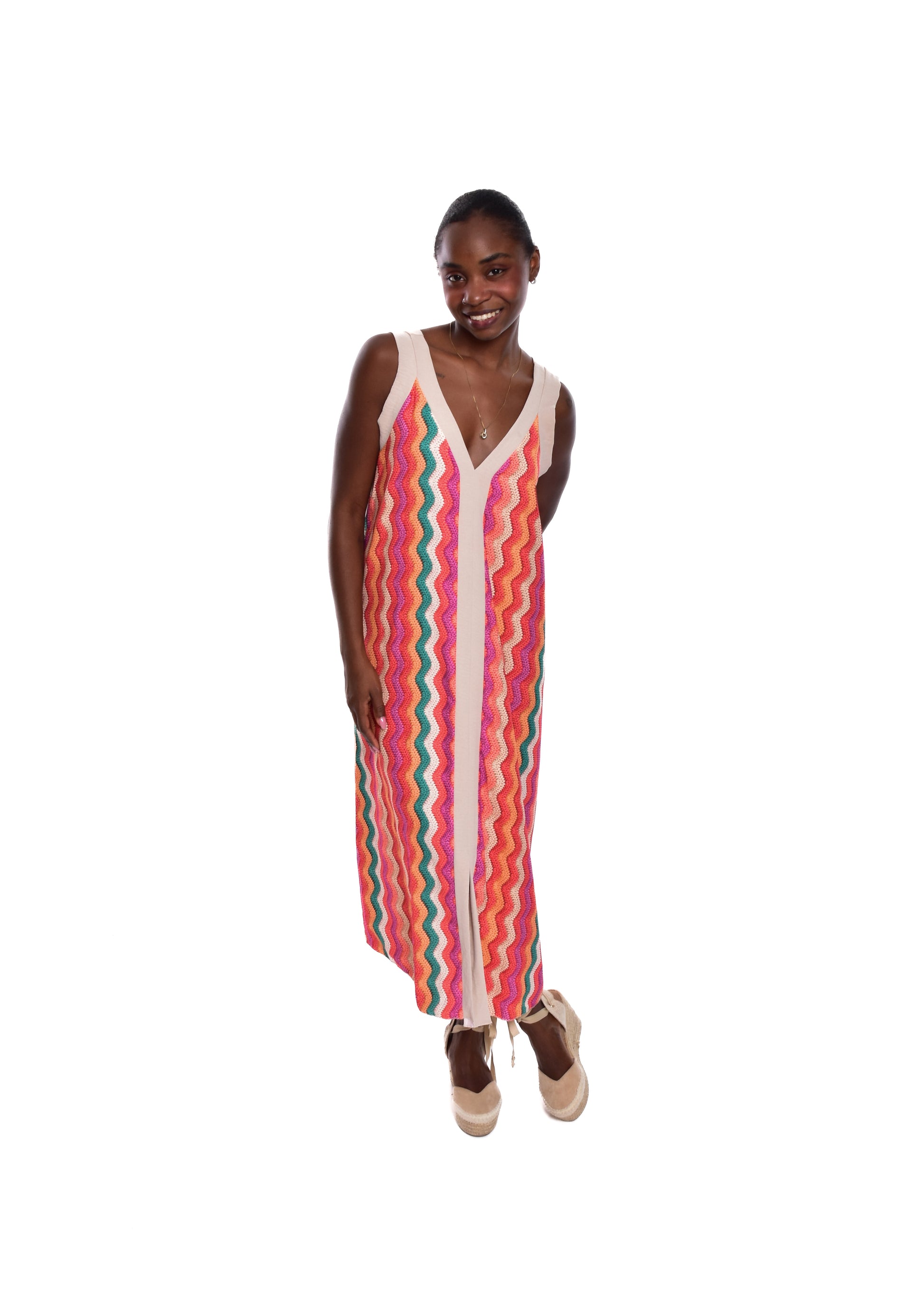 Vestido fluído con escote en pico. Estampado con forma de ondas. Este modelo está disponible en talla única. En este caso es apto de una 38 a una 42.