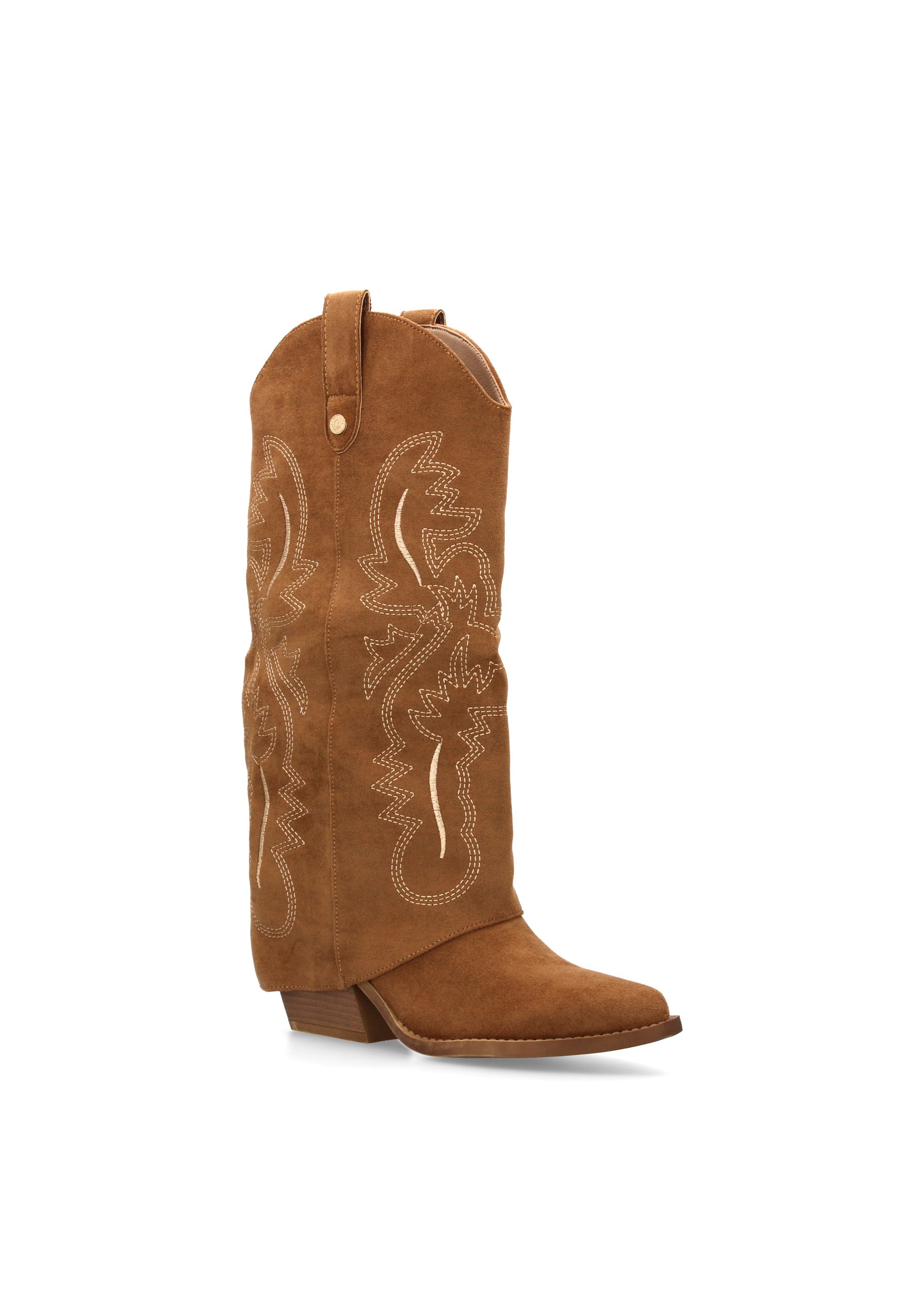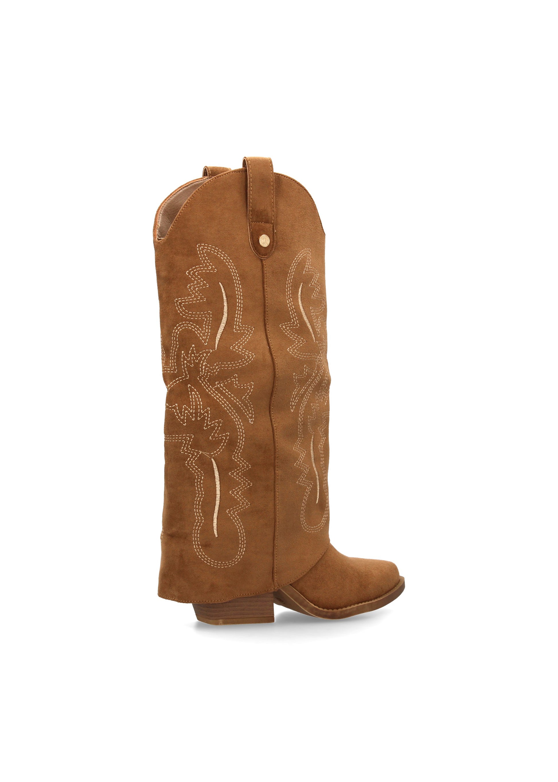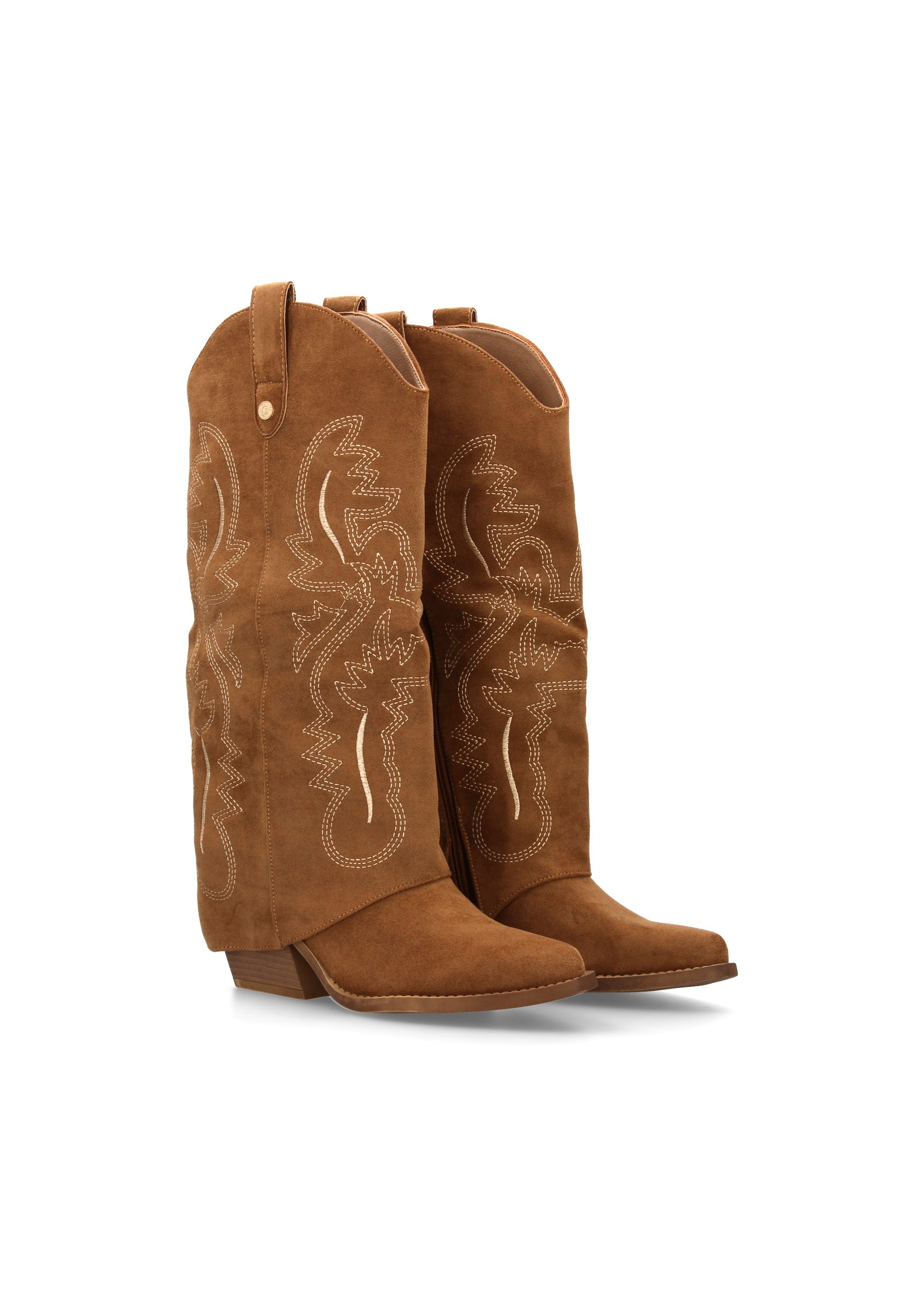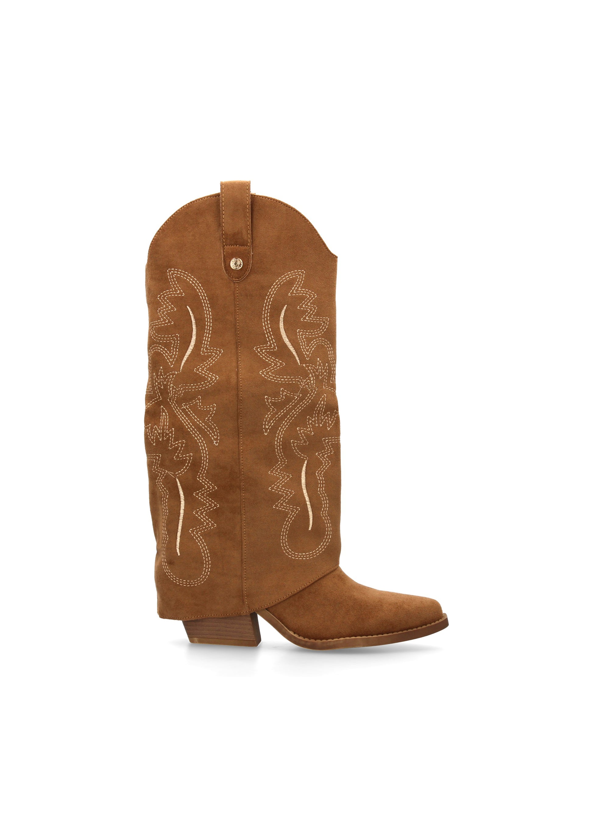 Bota para mujer estilo cowboy acabada en punta y con grabados bordados en la caña. Tacon cubano y cierre de cremallera.