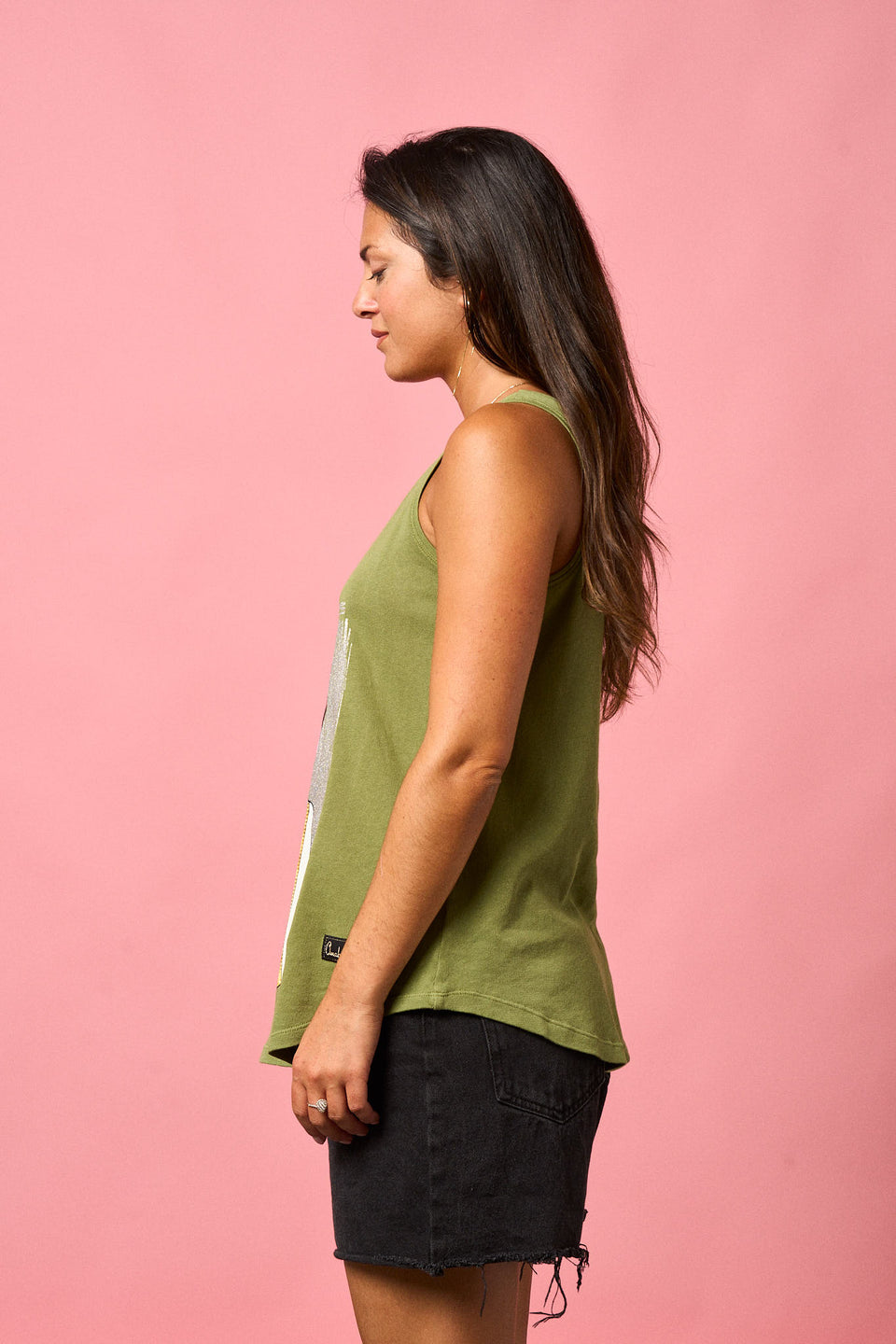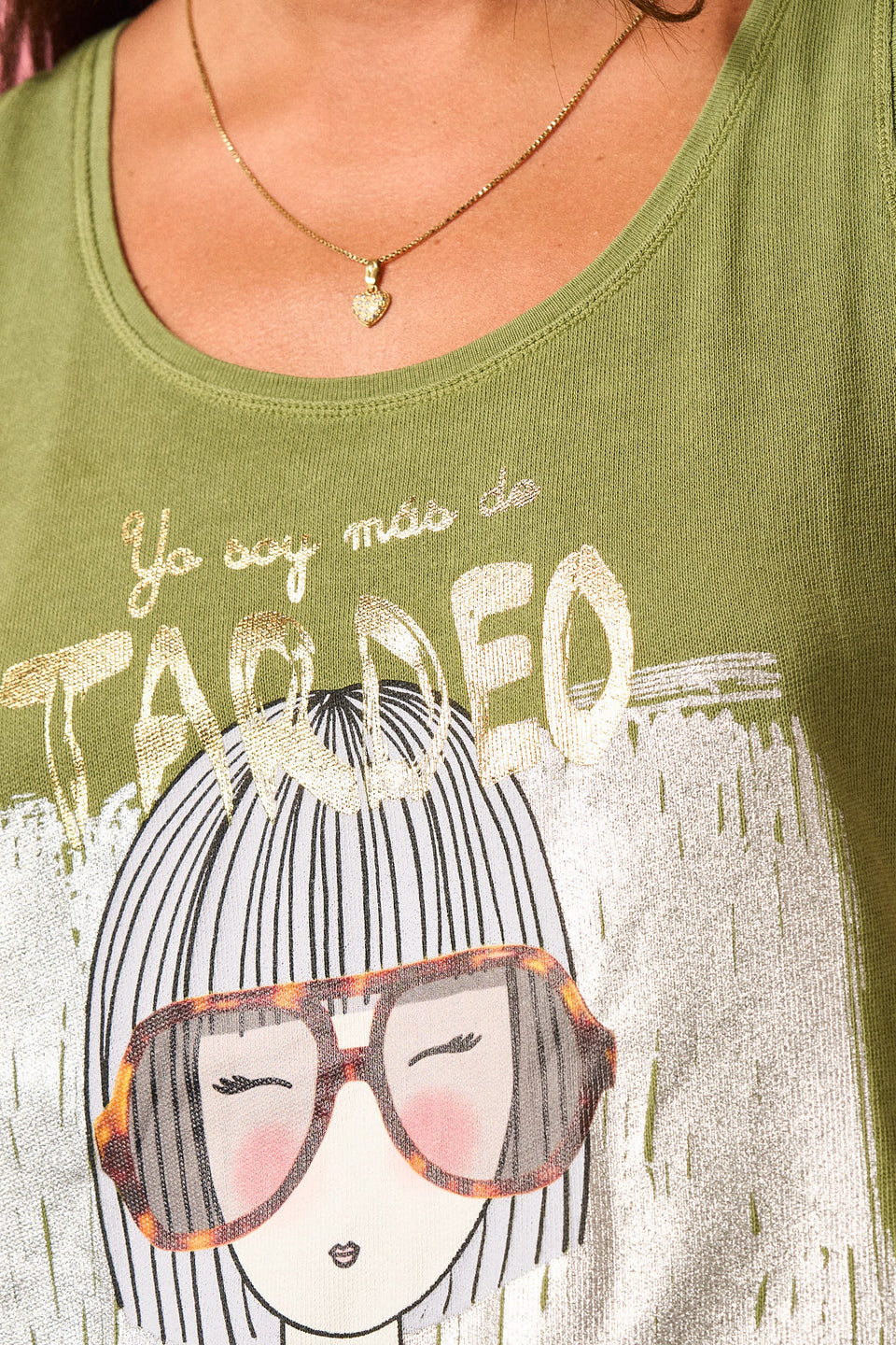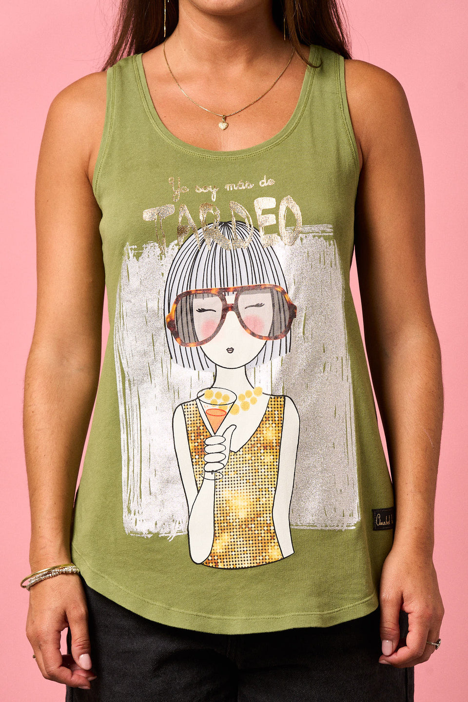 "Yo soy más de tardeo" Camiseta de tirantes anchos, escote redondo y bajos redondeados.Detalle de serigrafia dorada y plateada.Maxi print delantero con efectos fotográficos.