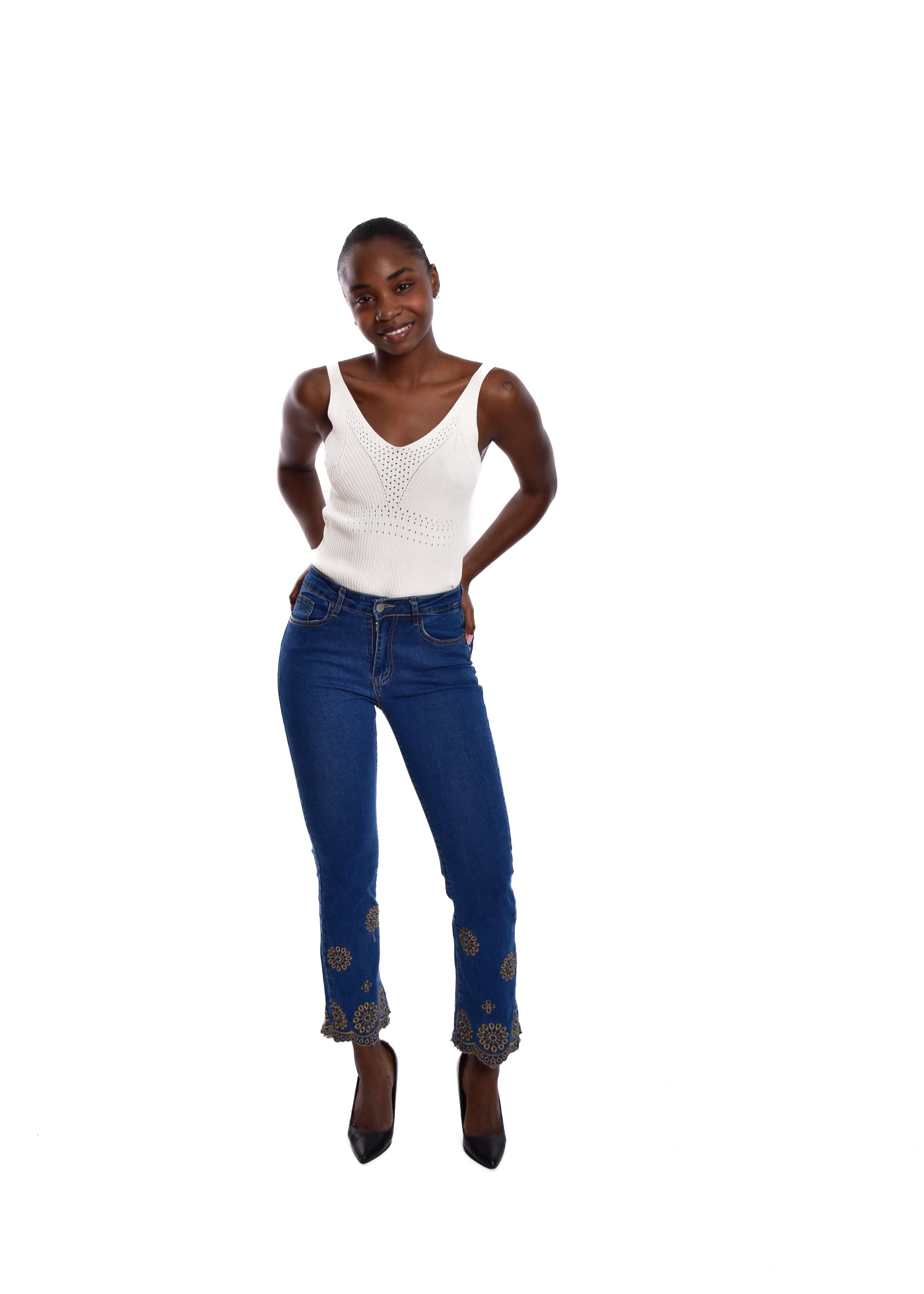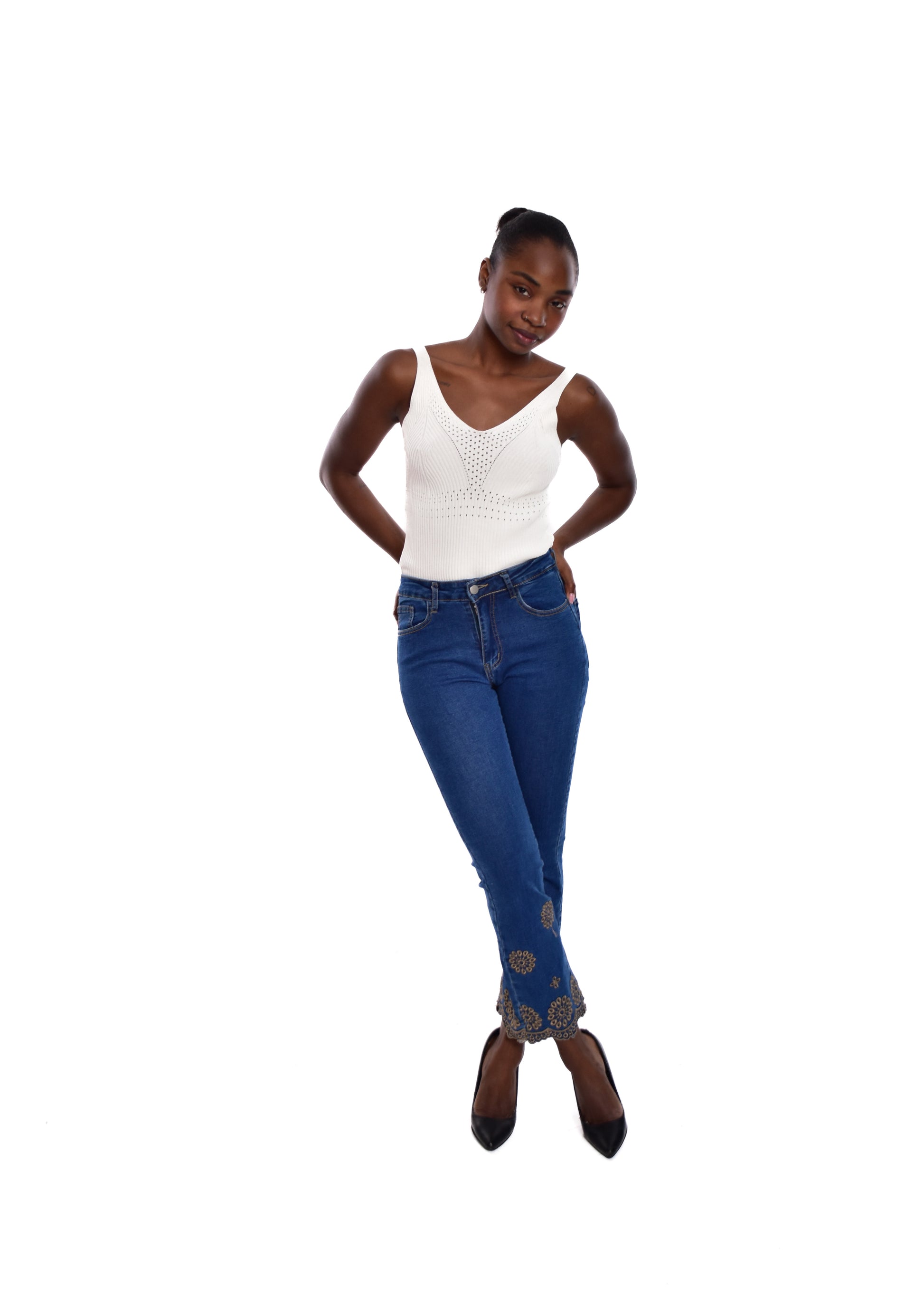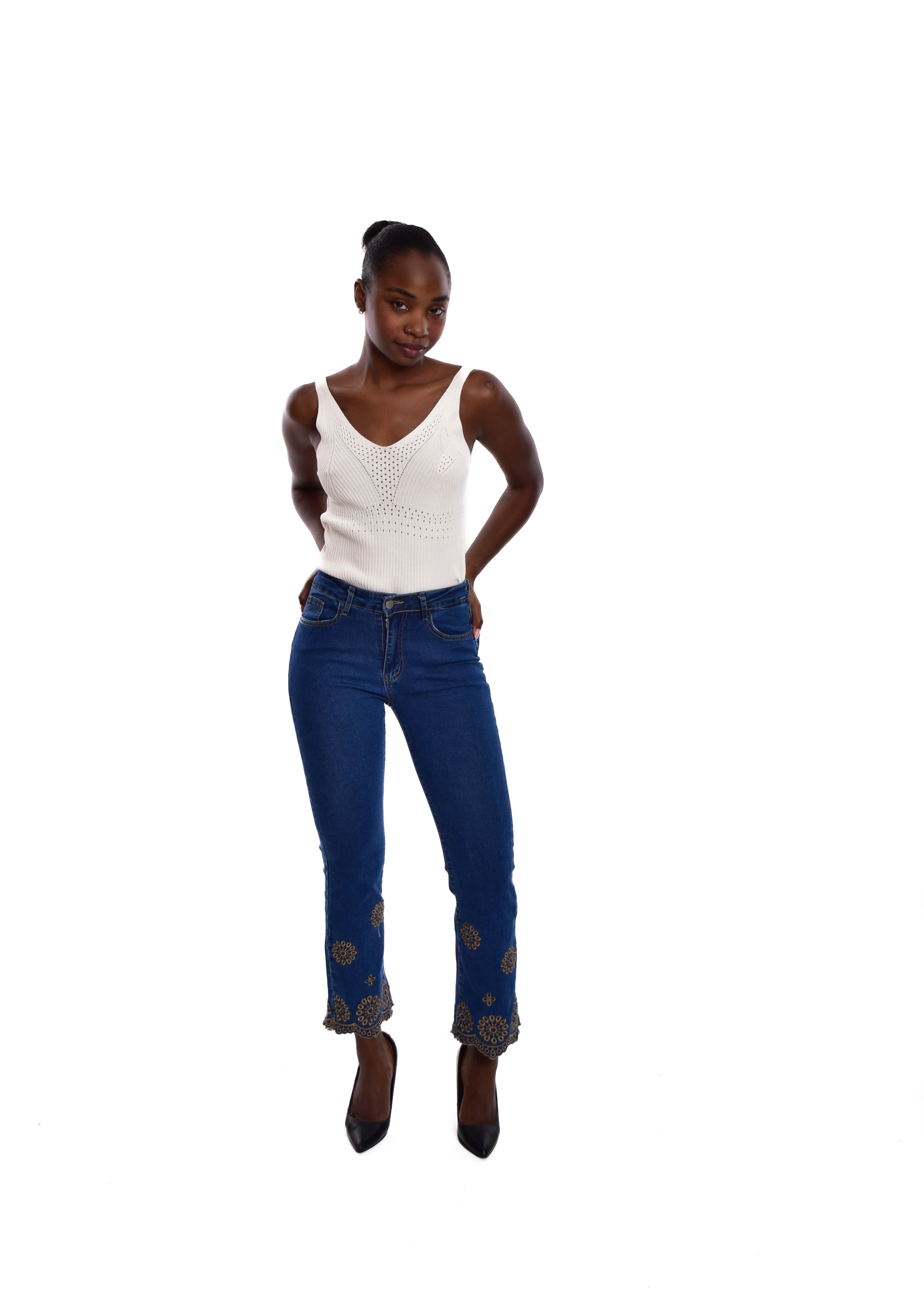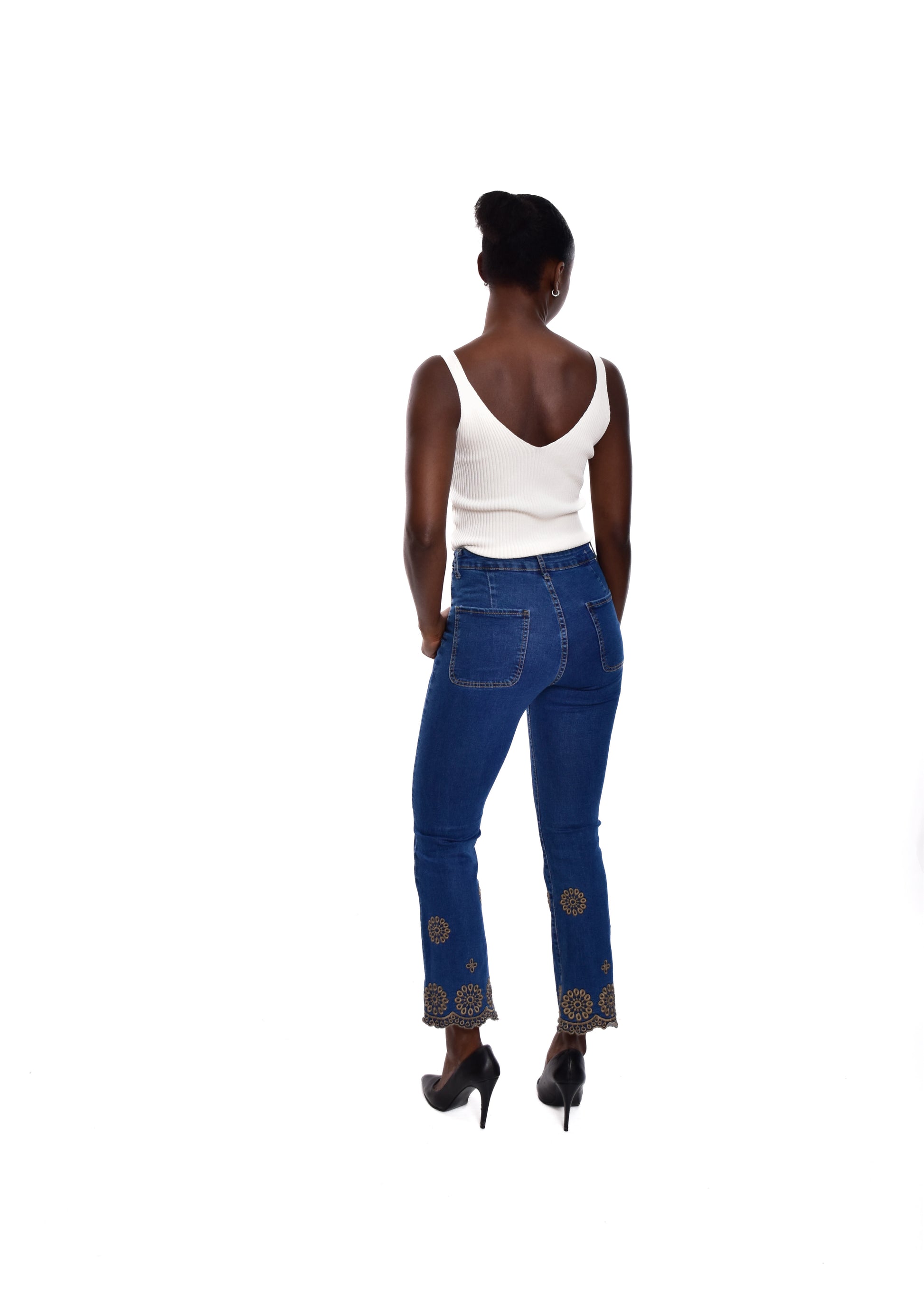 Pantalón acampado con bordados. Esta prenda está disponible de la talla XS a la XXL , en este caso es apta hasta una talla 44. Si lo deseas puedes comprobar las medidas exactas de la prenda en el apartado " Talla y Medidas"