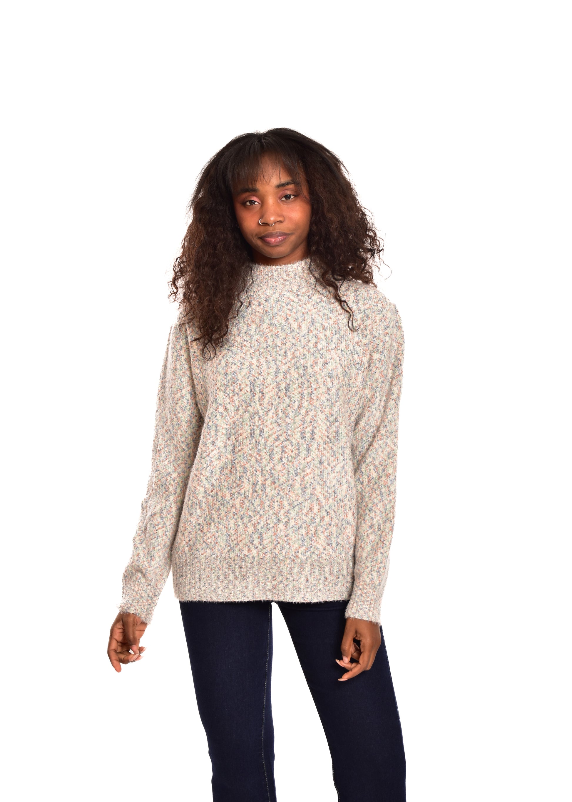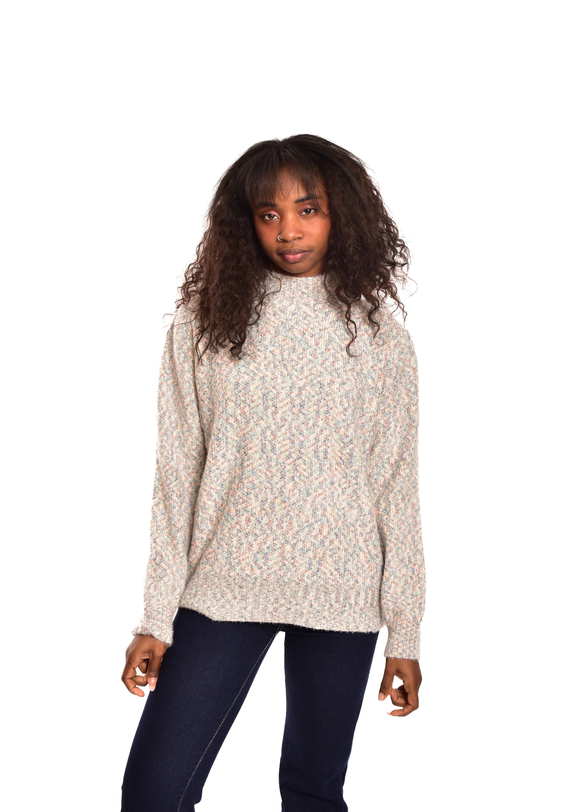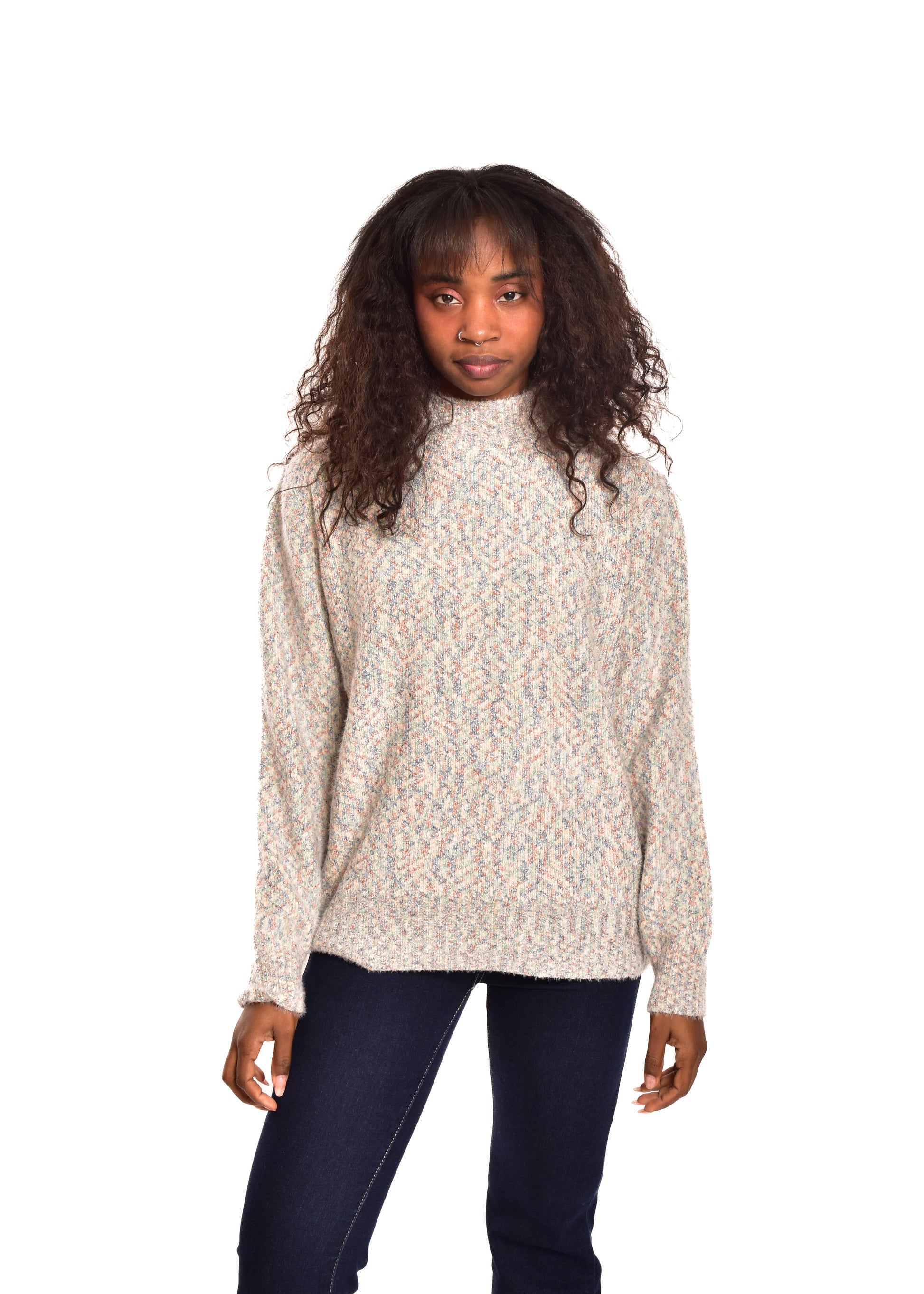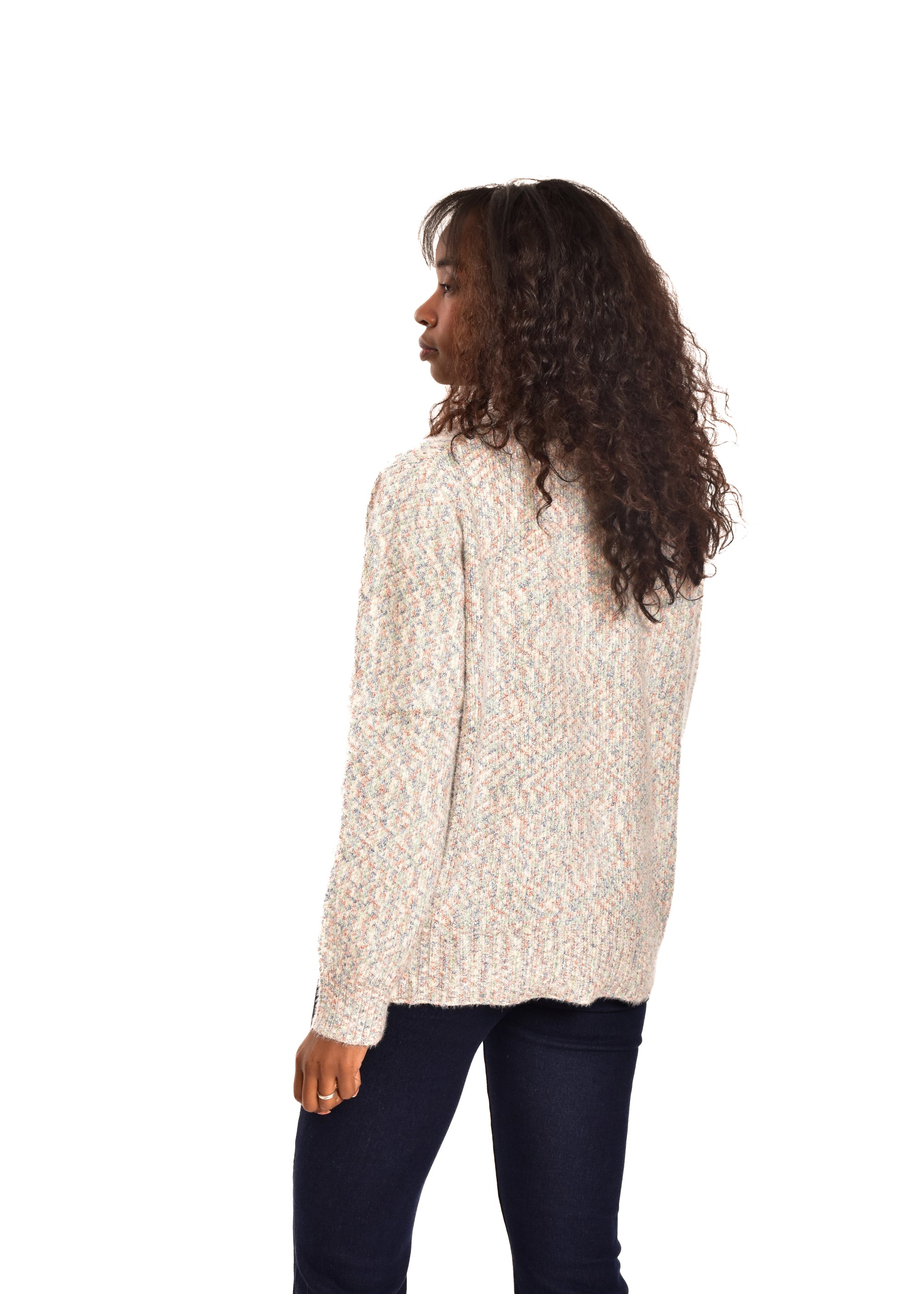 Jersey de punto jaspeado. Tejido súper suave. Esta prenda está disponible en doble talla M/L y XL/XXL, en este caso es apto hasta una talla 42.