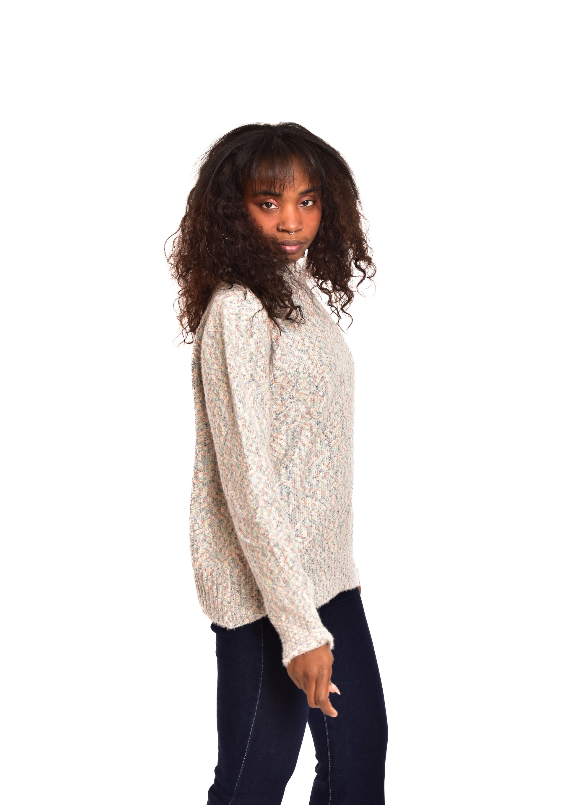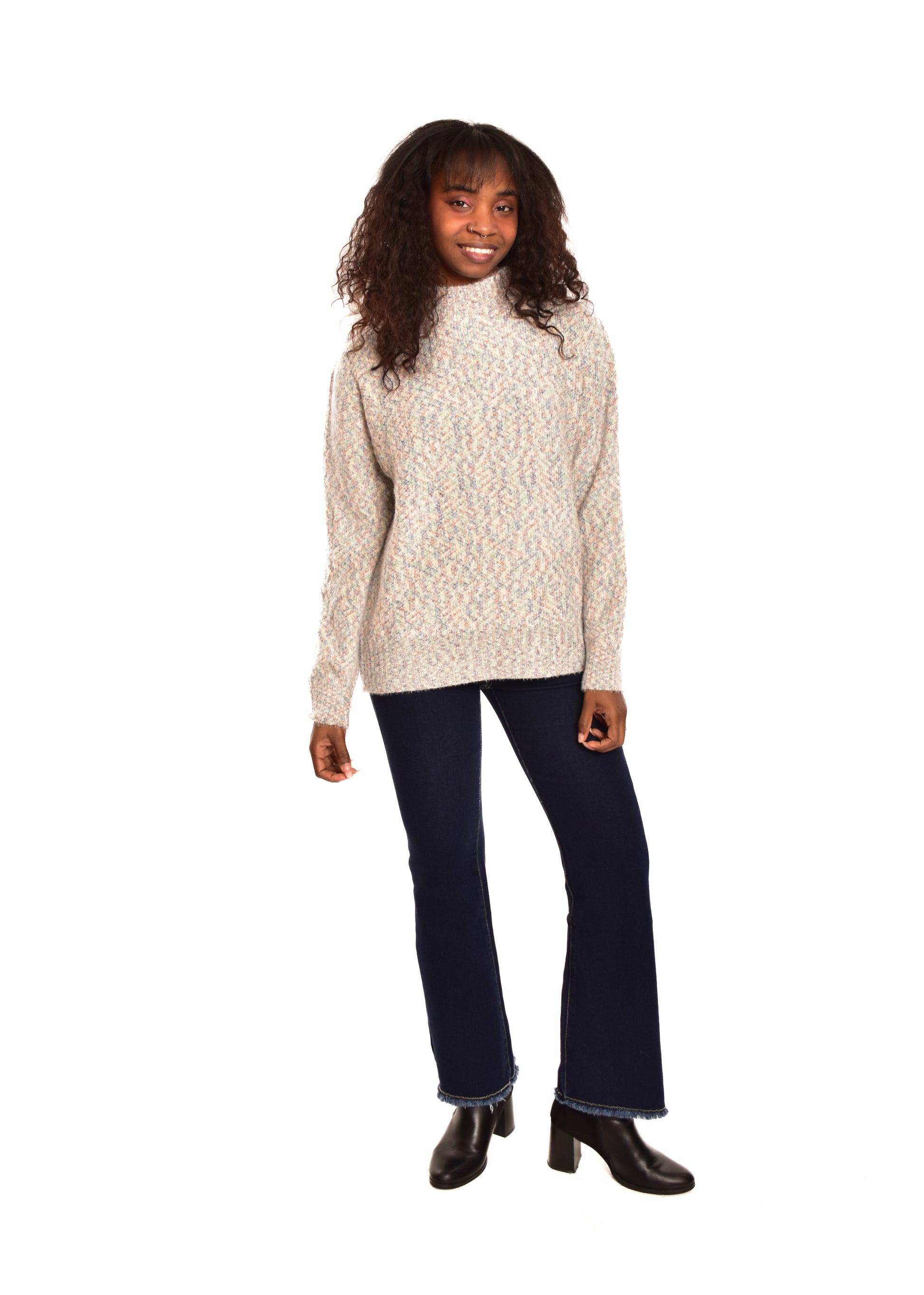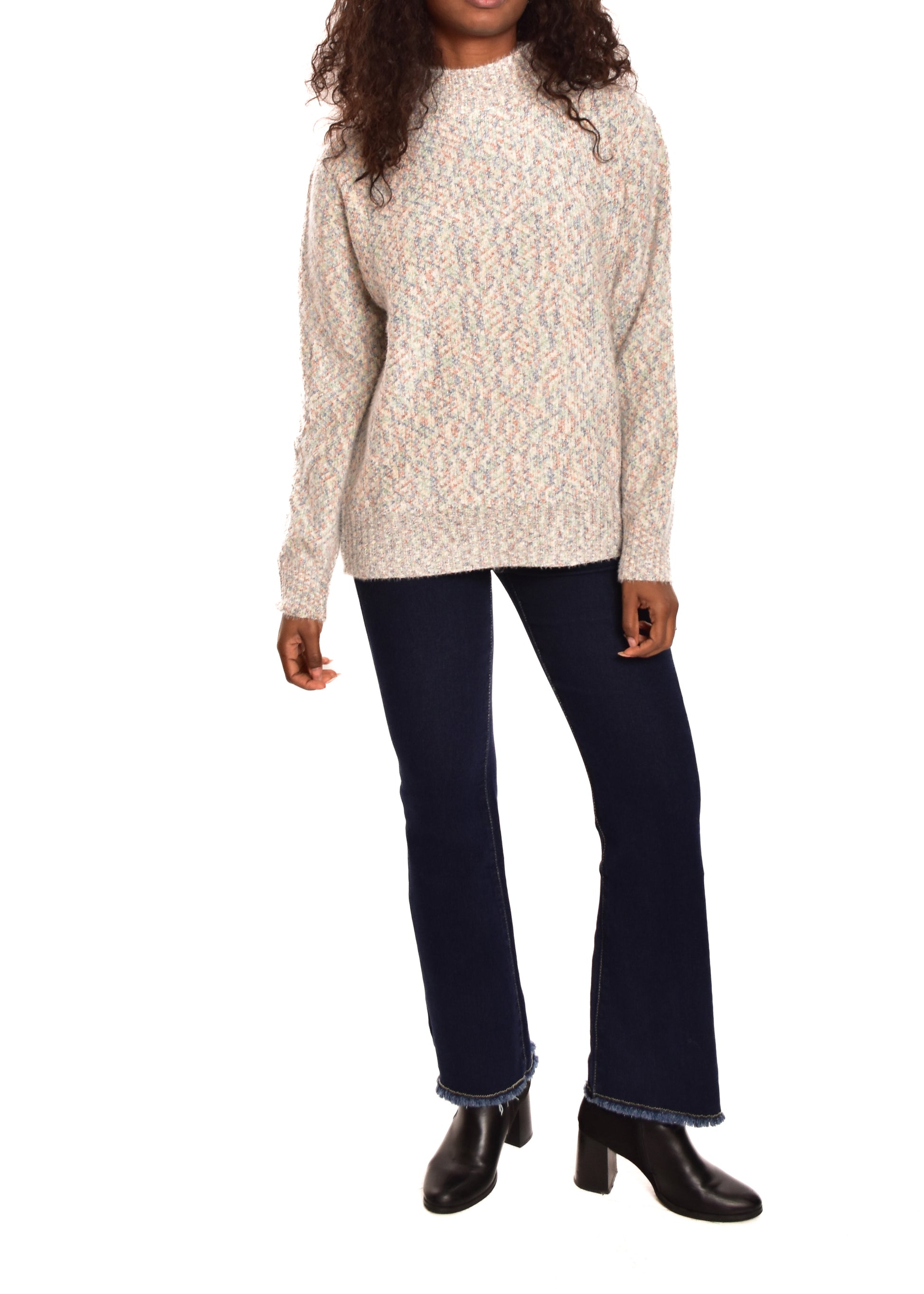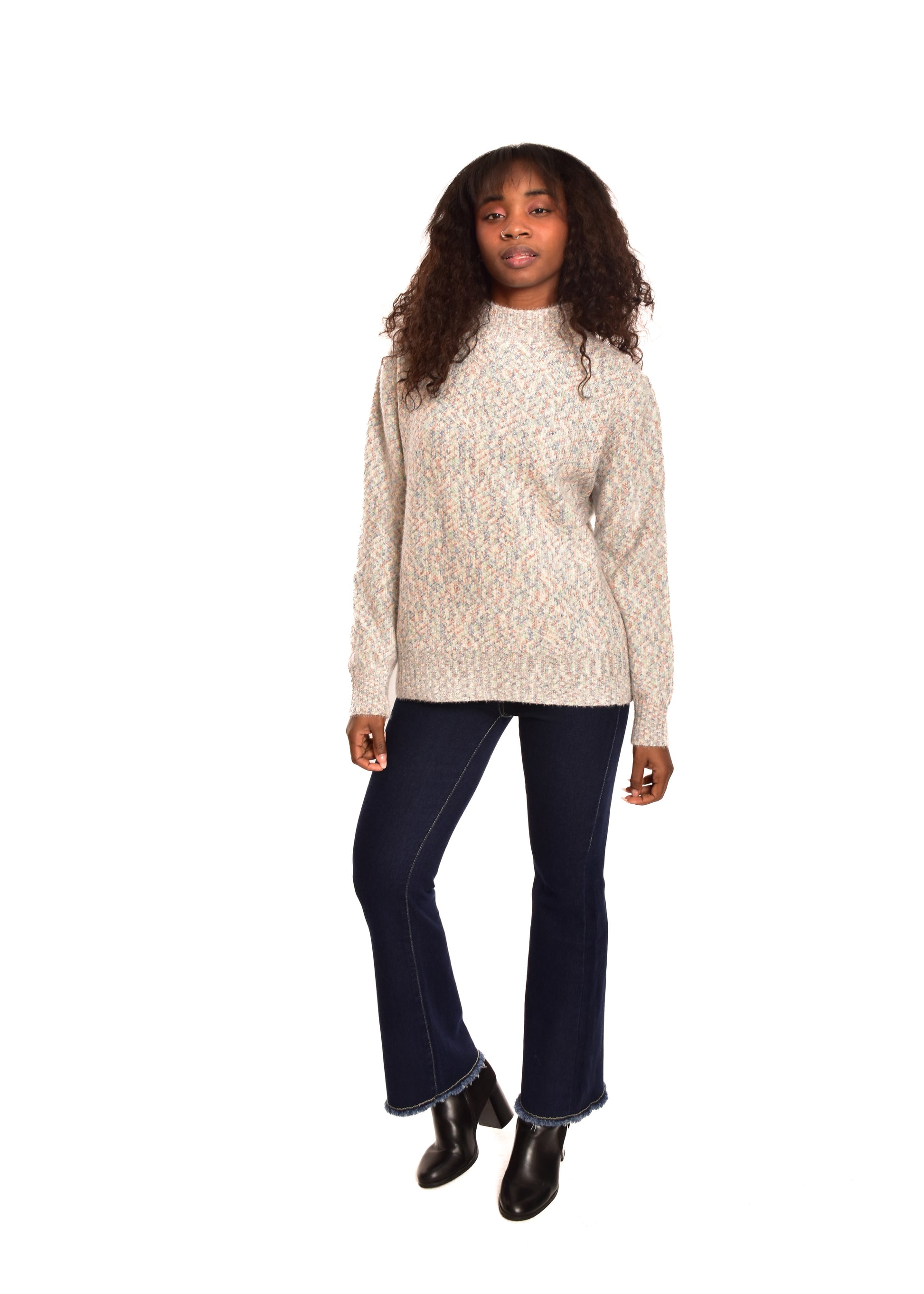 Jersey de punto jaspeado. Tejido súper suave. Esta prenda está disponible en doble talla M/L y XL/XXL, en este caso es apto hasta una talla 42.