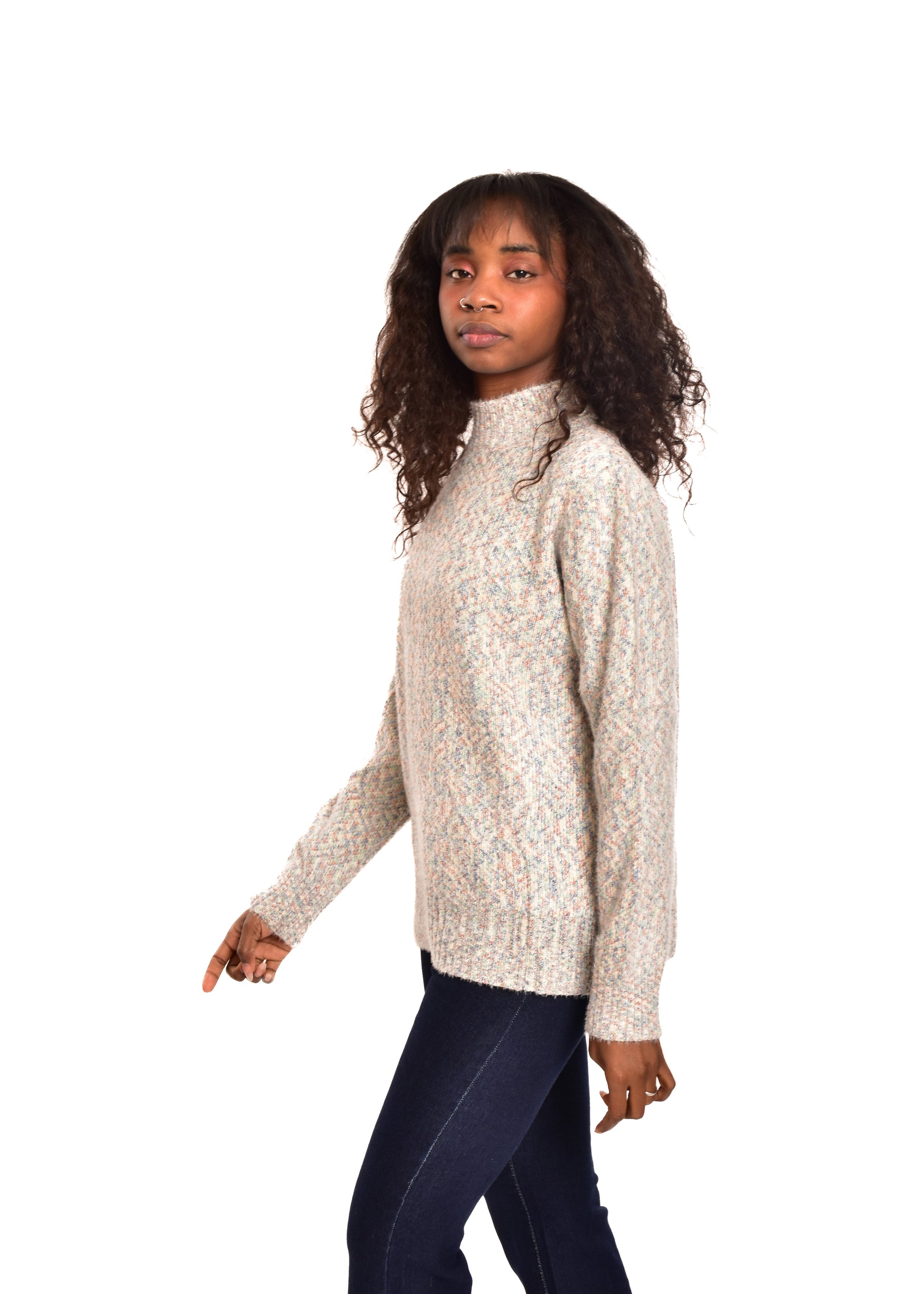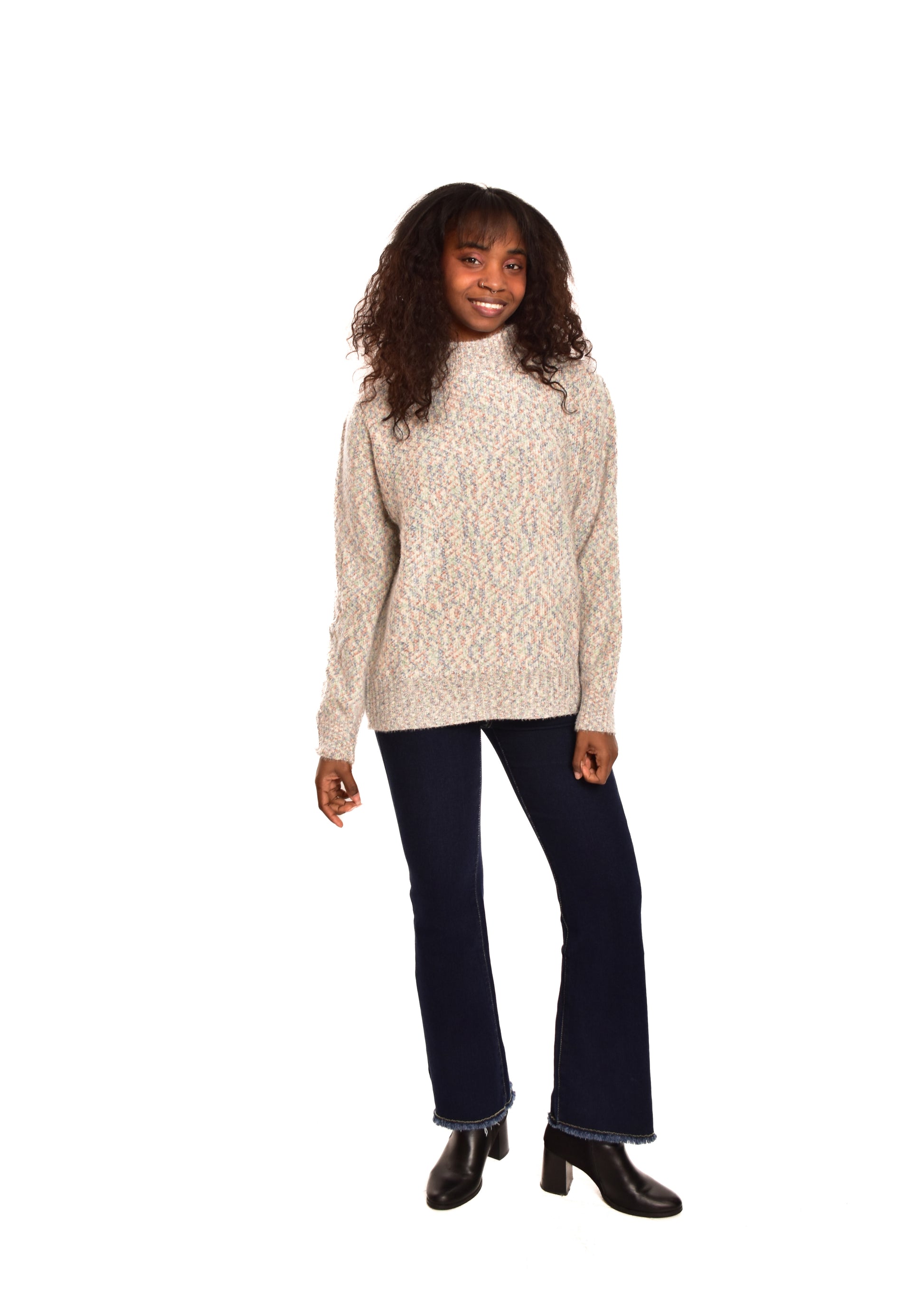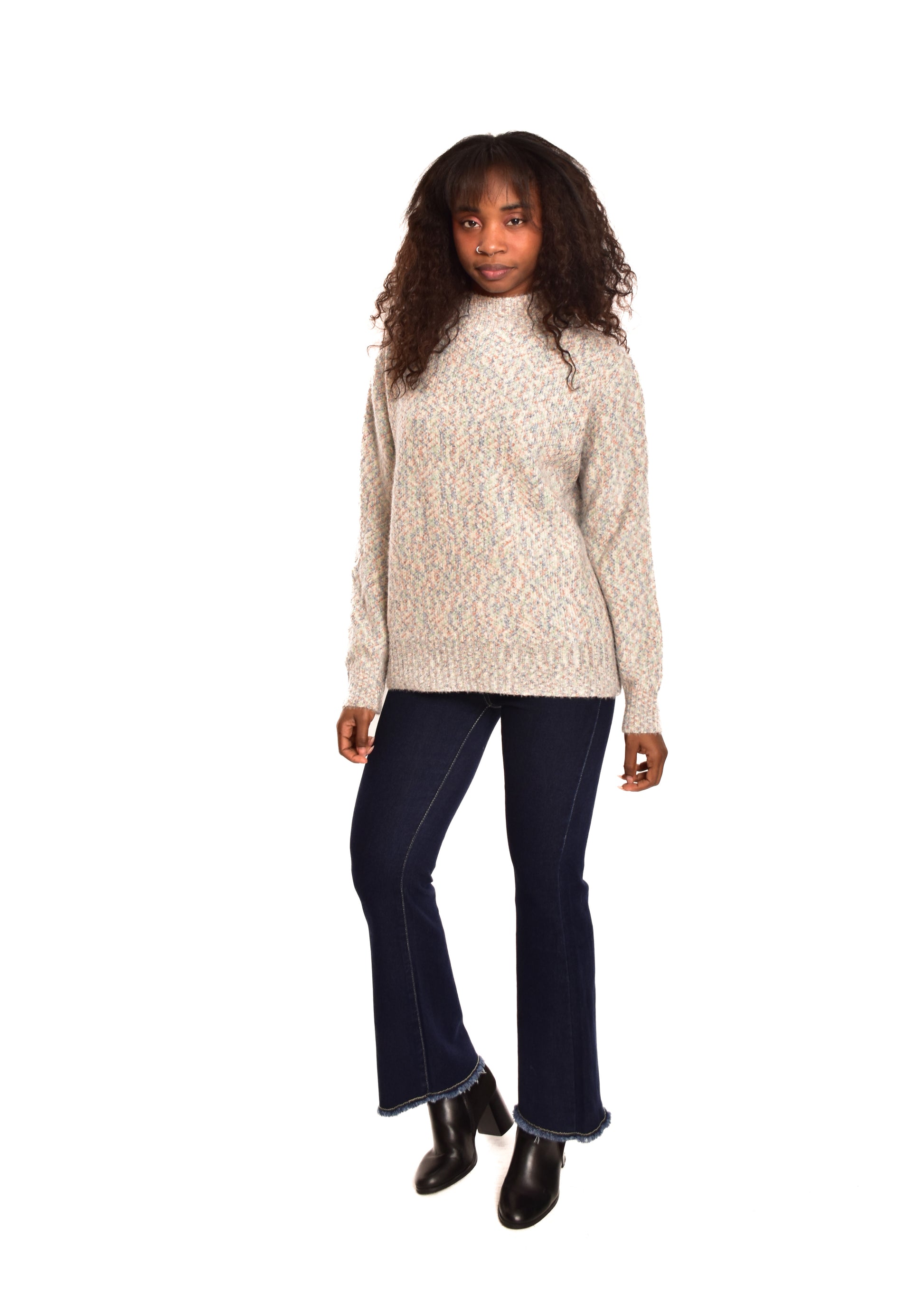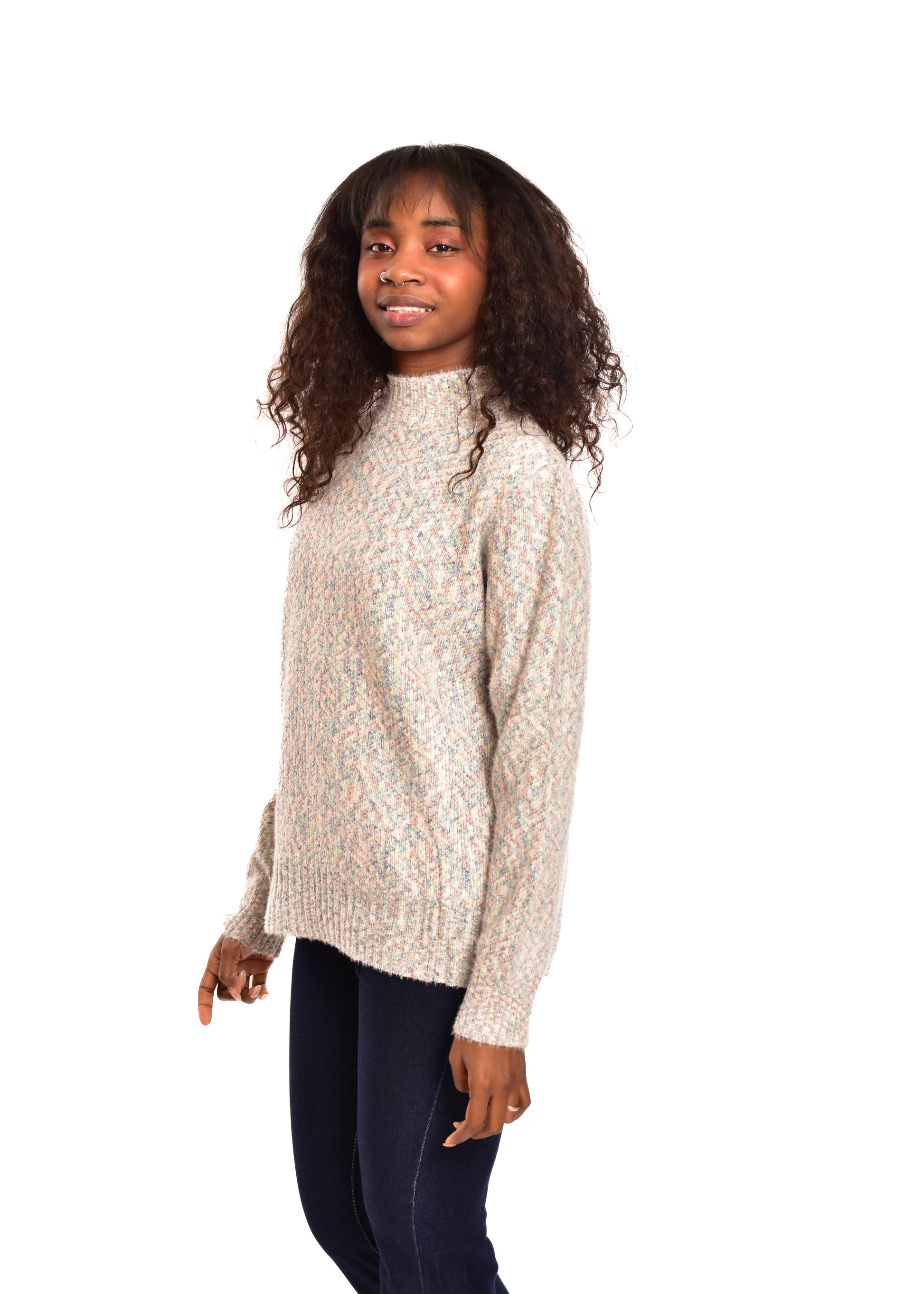 Jersey de punto jaspeado. Tejido súper suave. Esta prenda está disponible en doble talla M/L y XL/XXL, en este caso es apto hasta una talla 42.