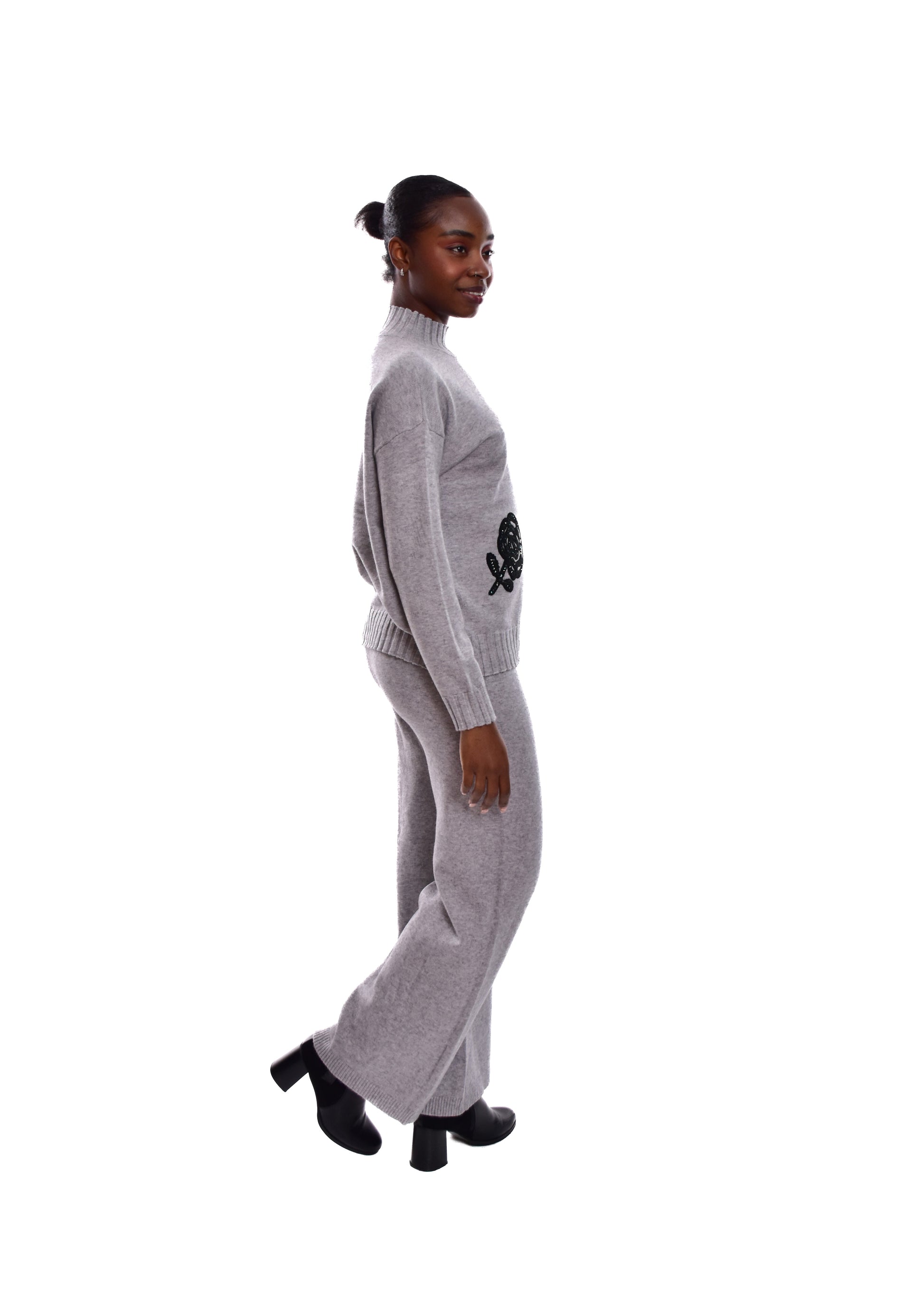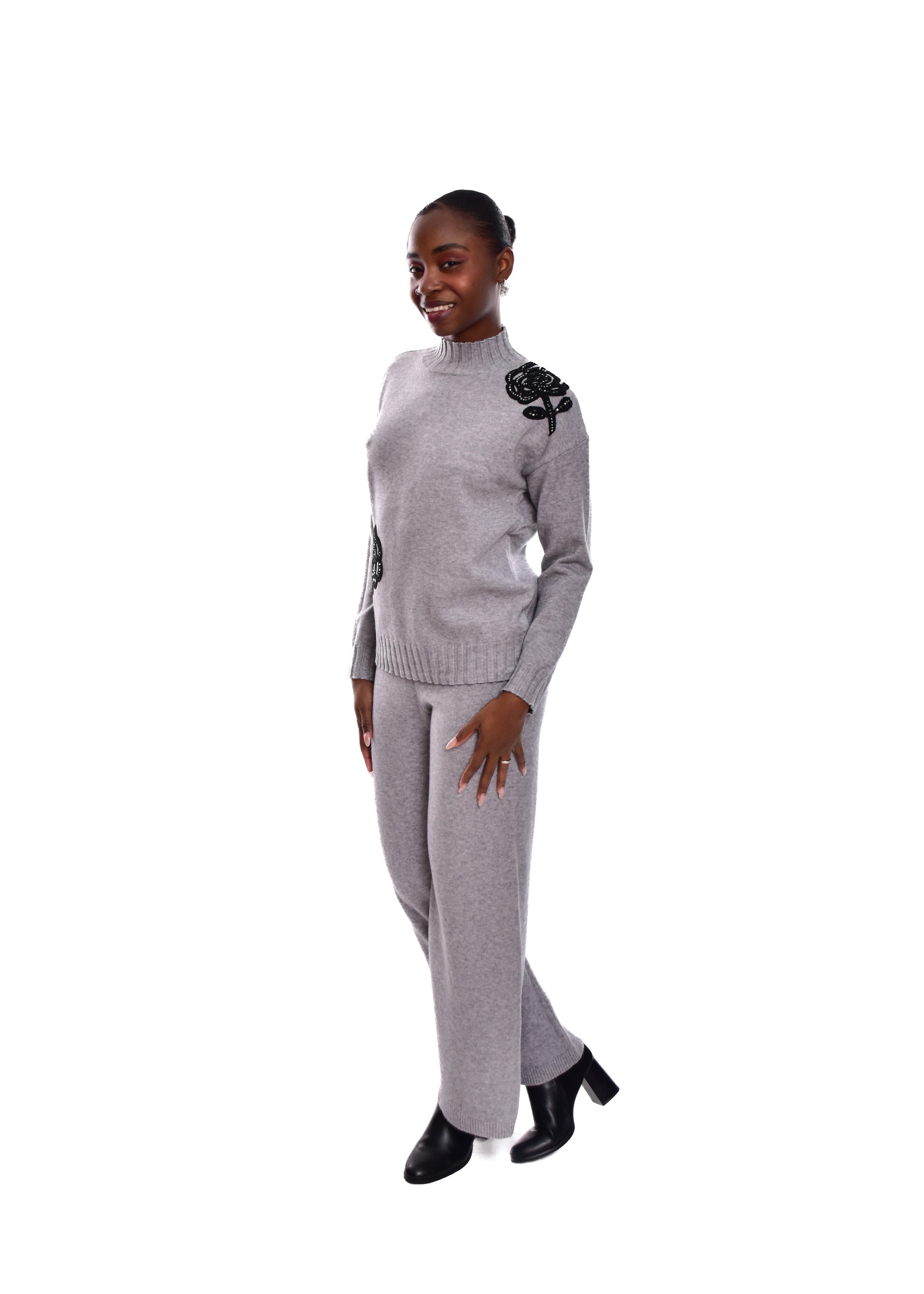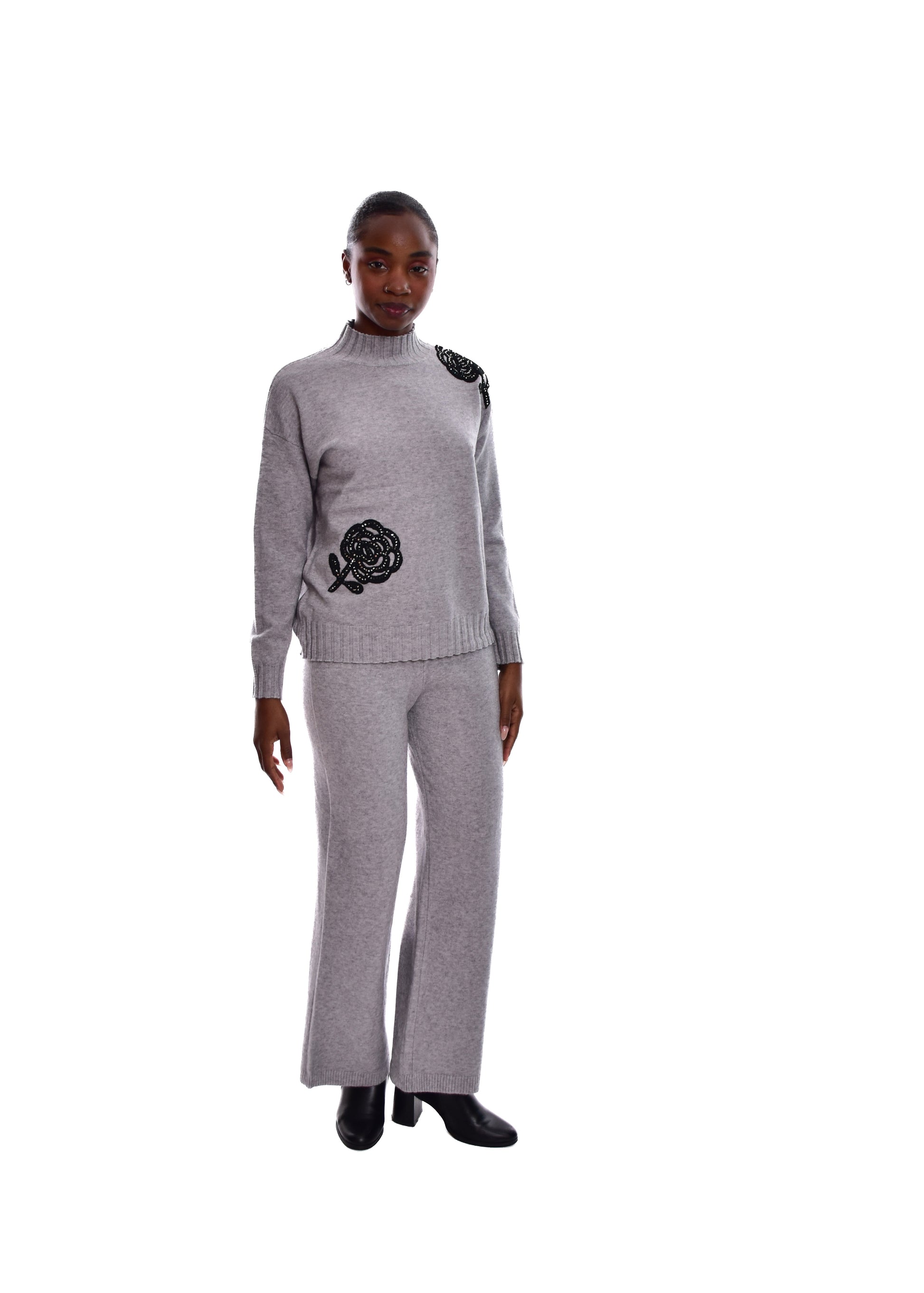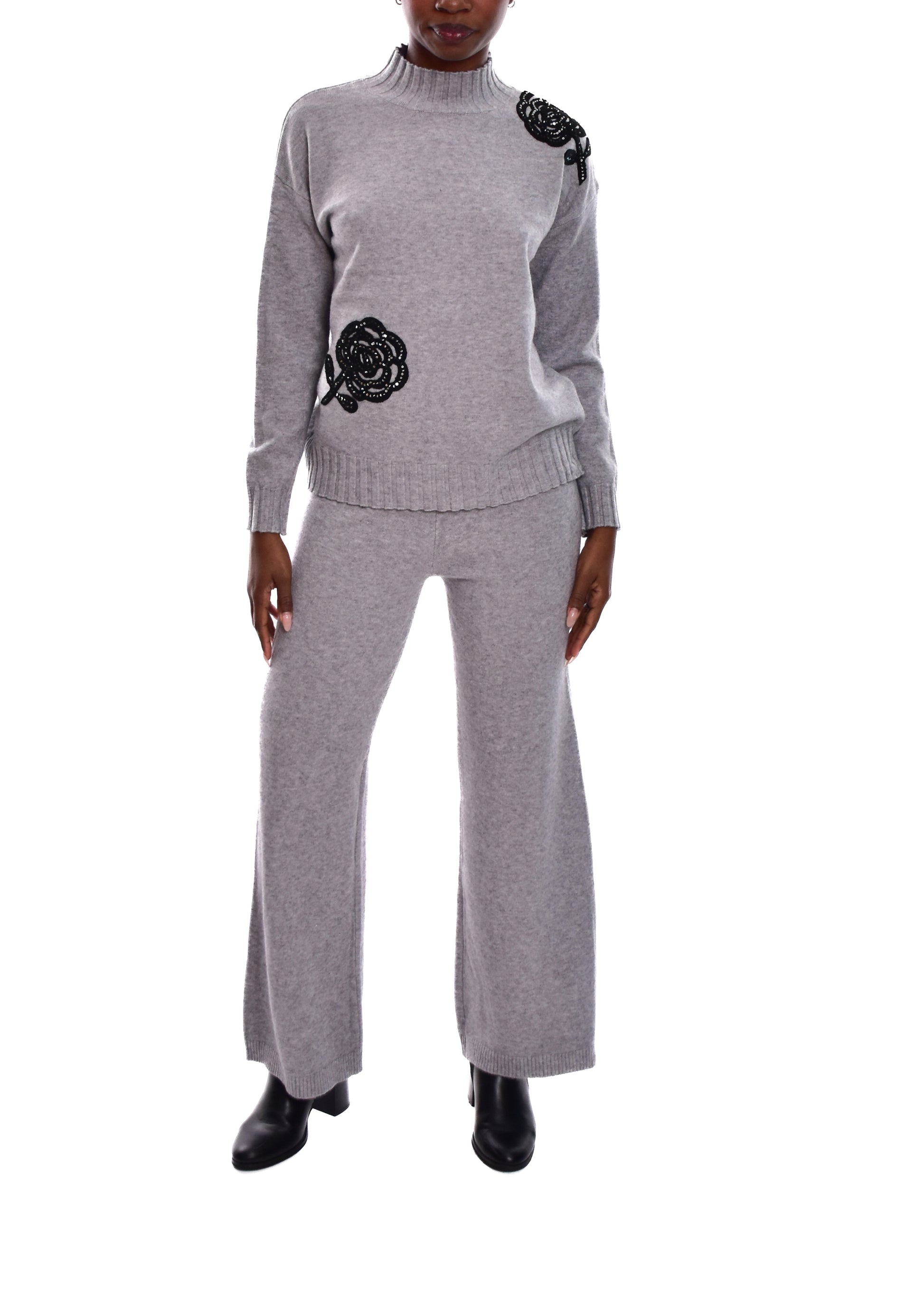 Conjunto compuesto por jersey de punto y pantalón. Detalles en pedrería. Este modelo está disponible en Talla única, en este caso es apto hasta una talla 42.