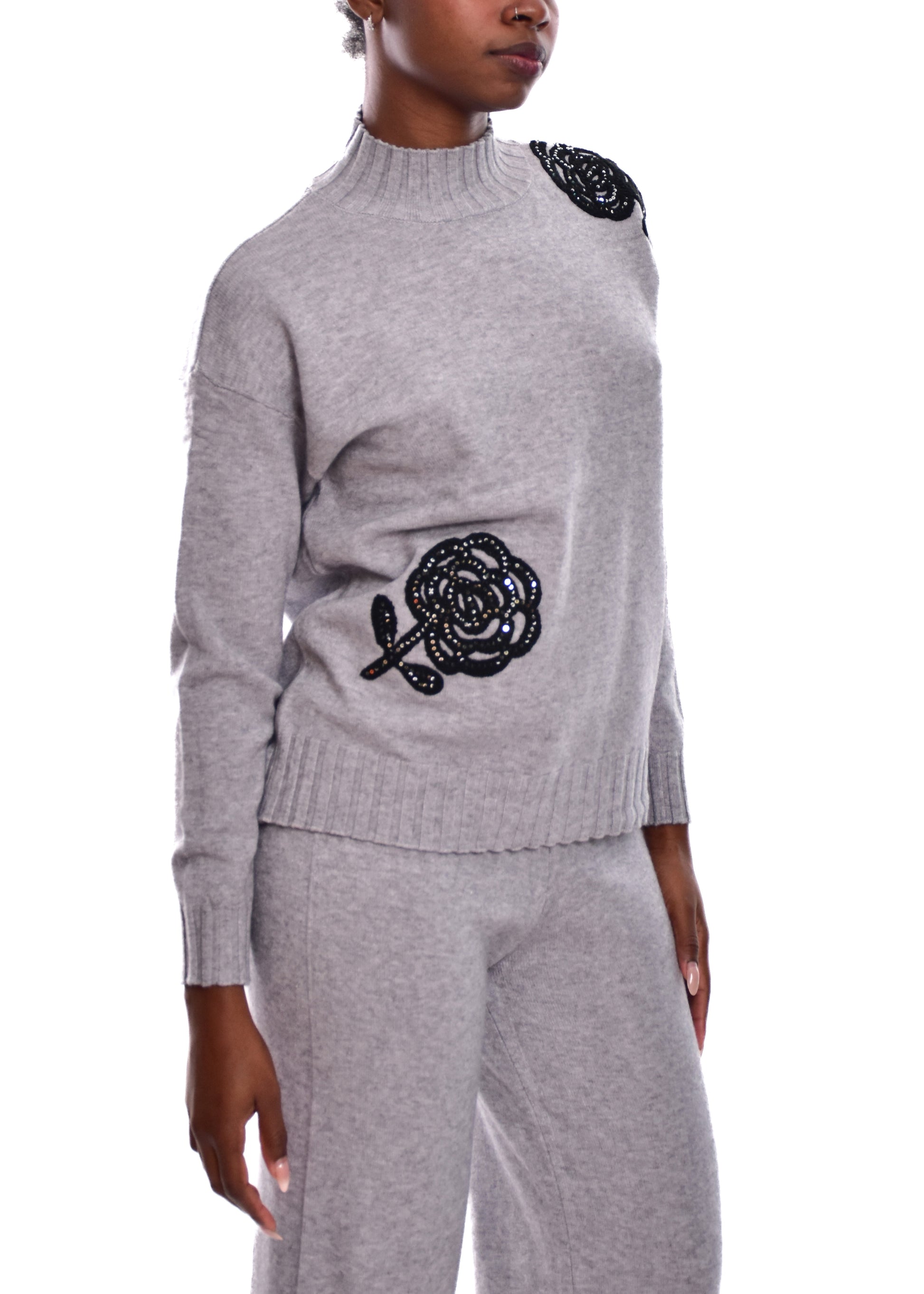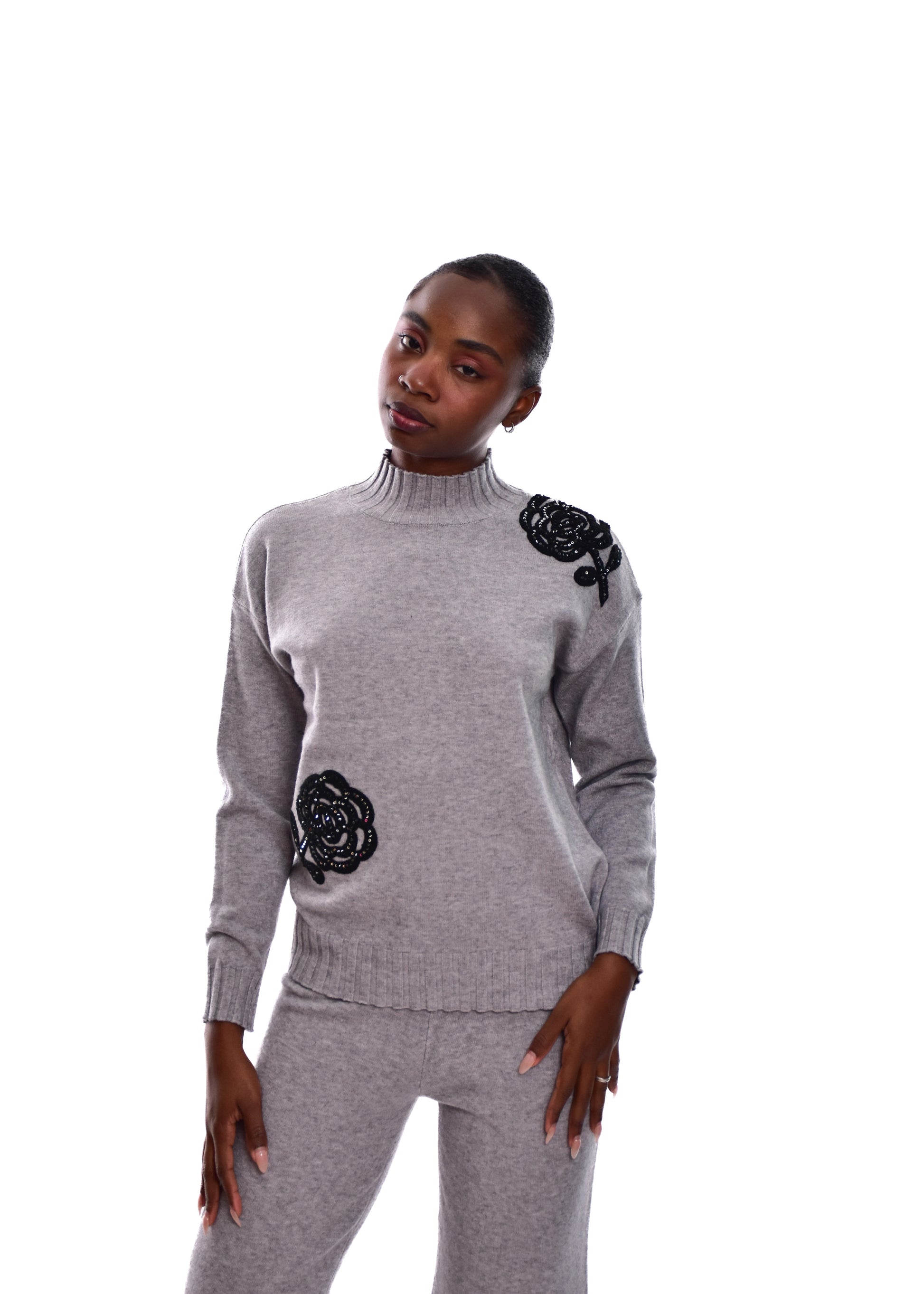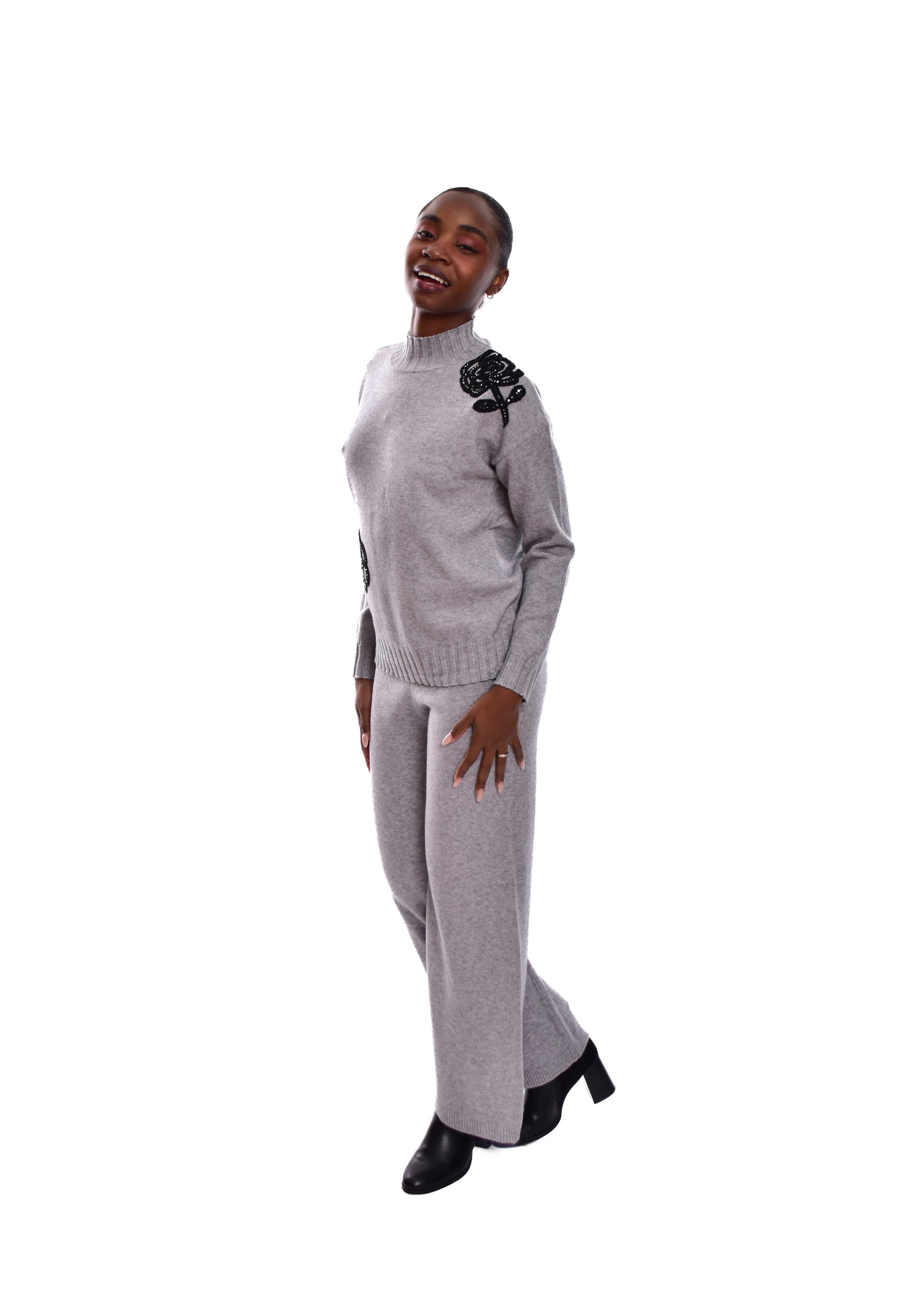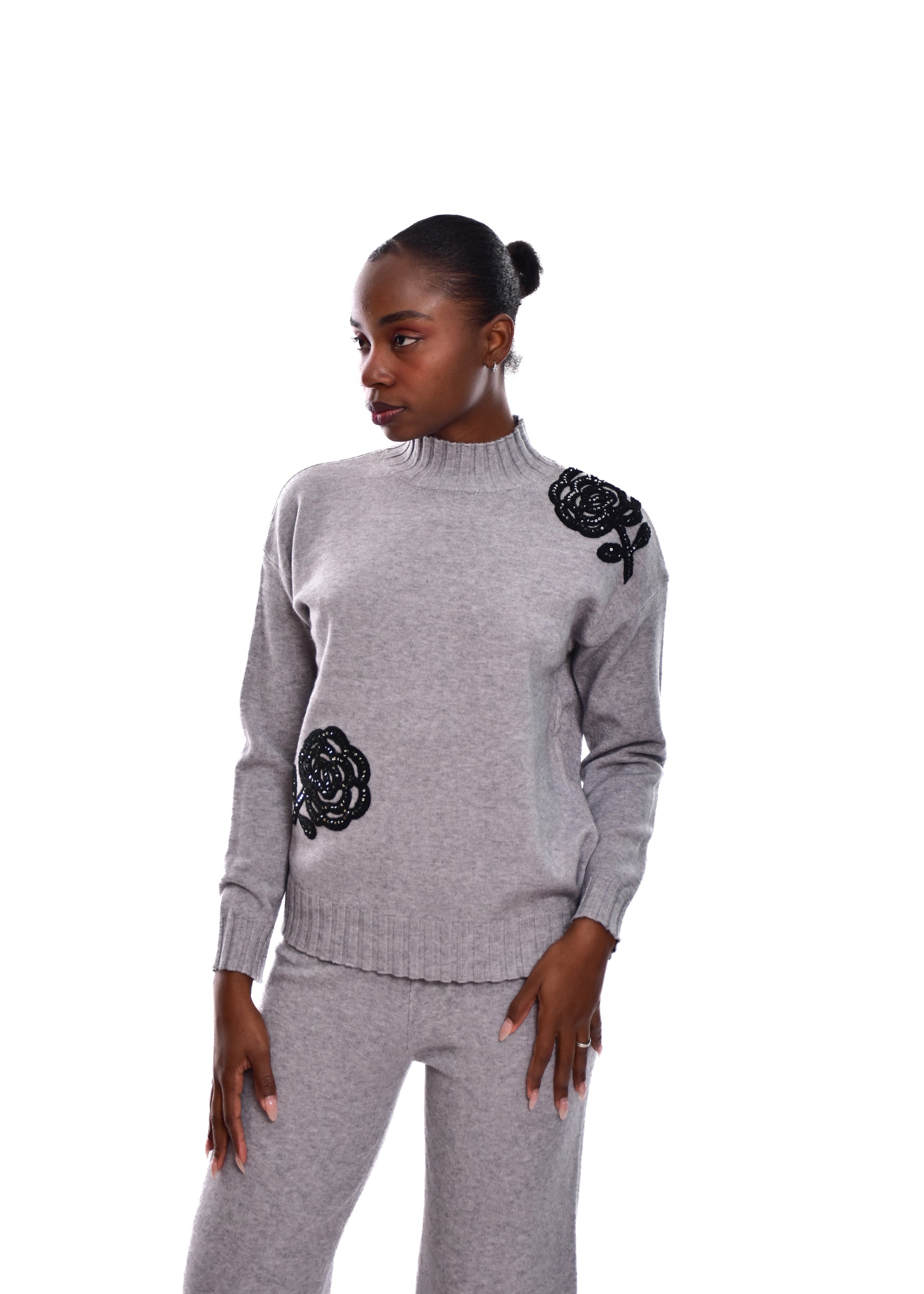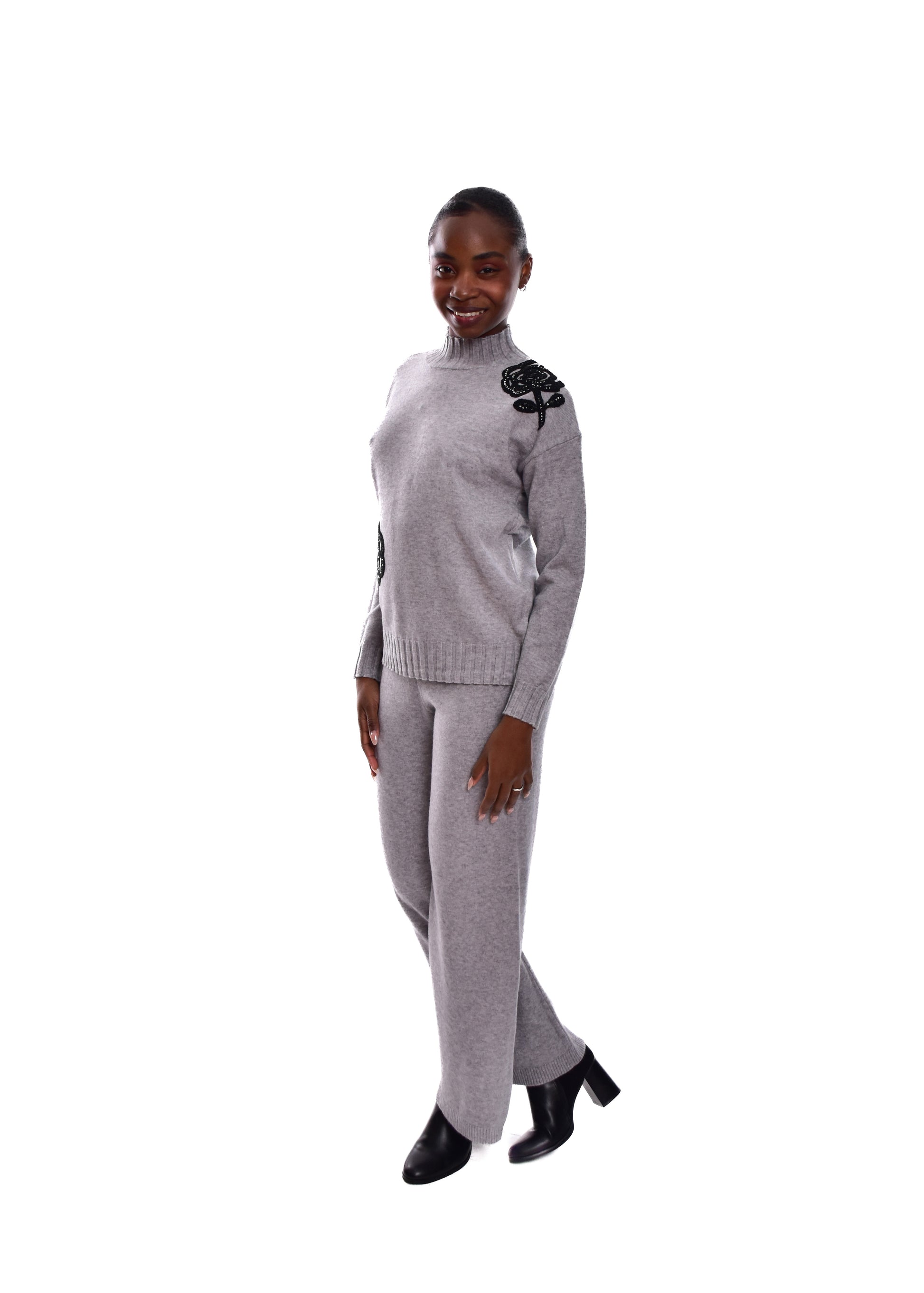 Conjunto compuesto por jersey de punto y pantalón. Detalles en pedrería. Este modelo está disponible en Talla única, en este caso es apto hasta una talla 42.