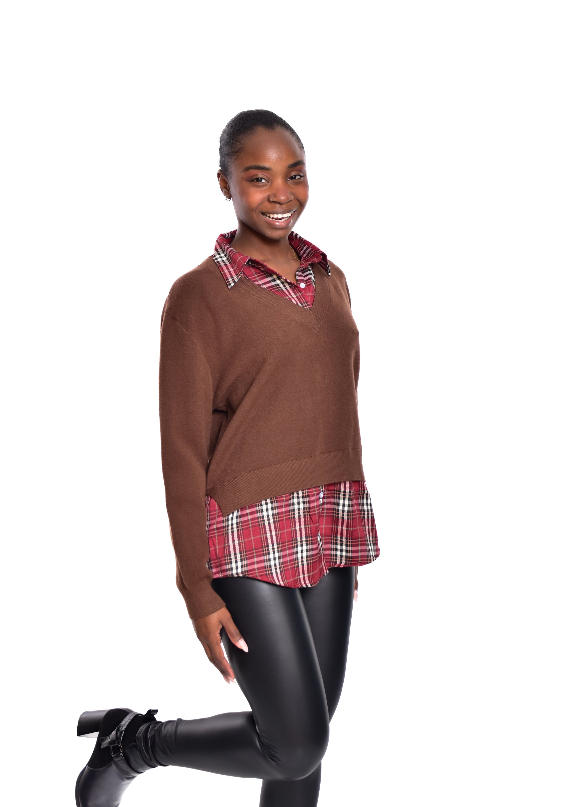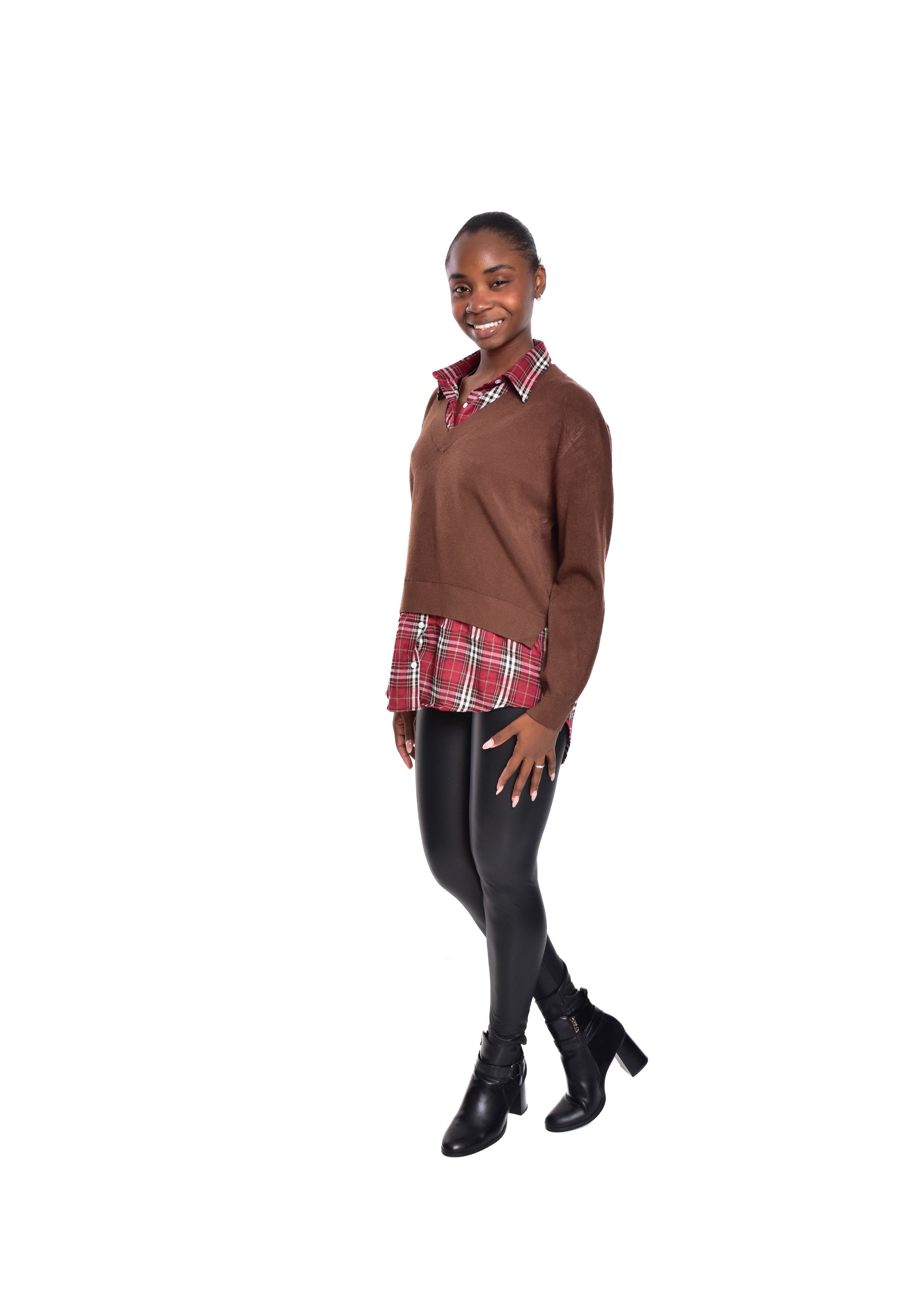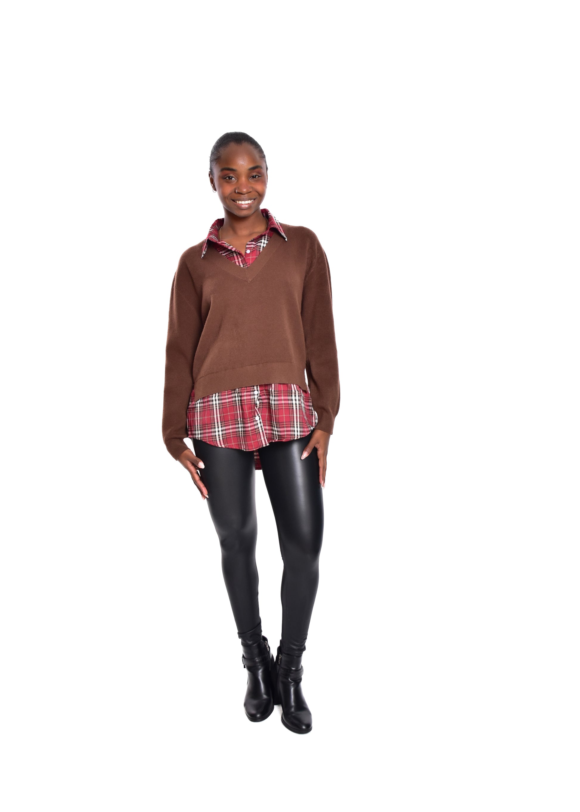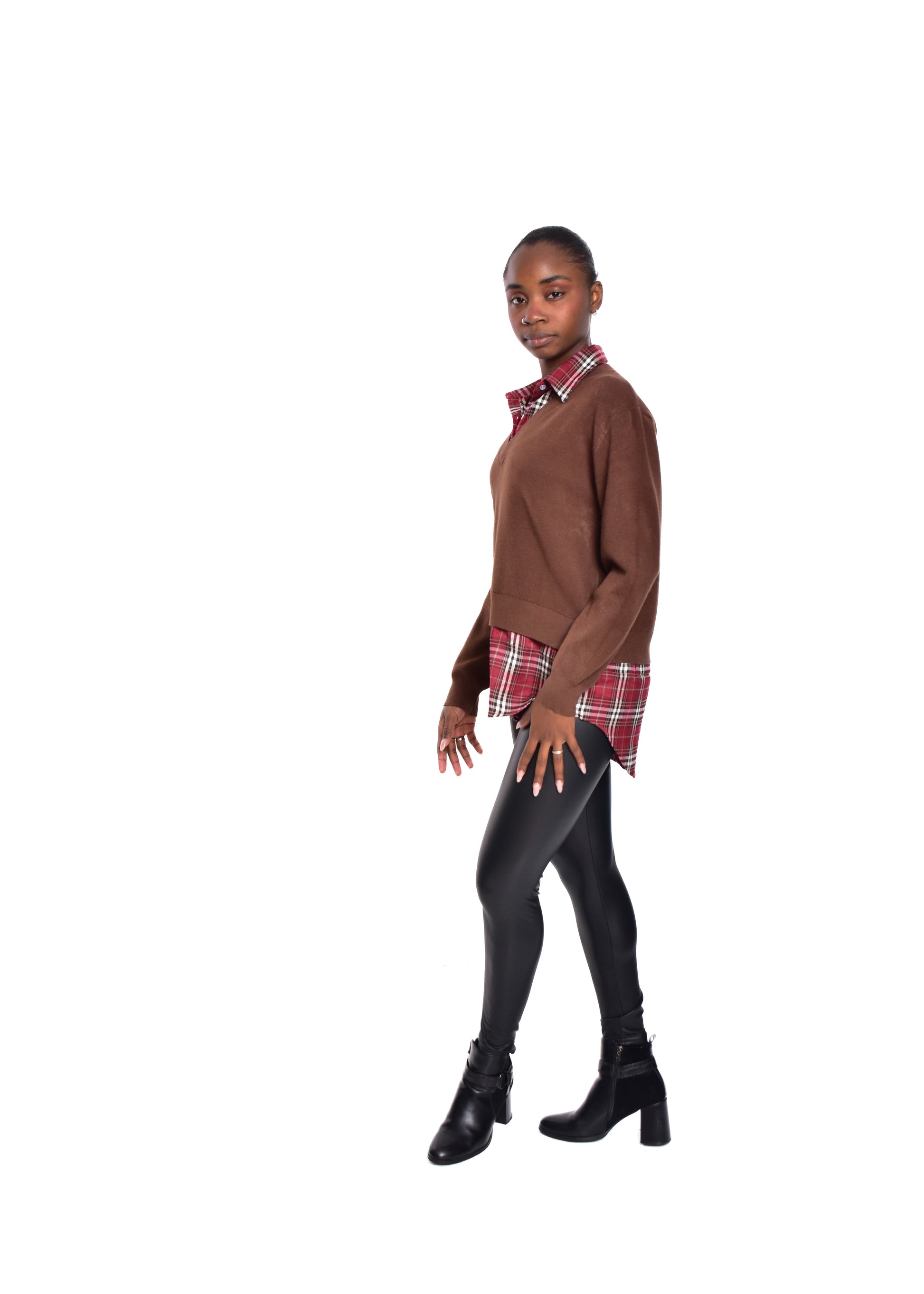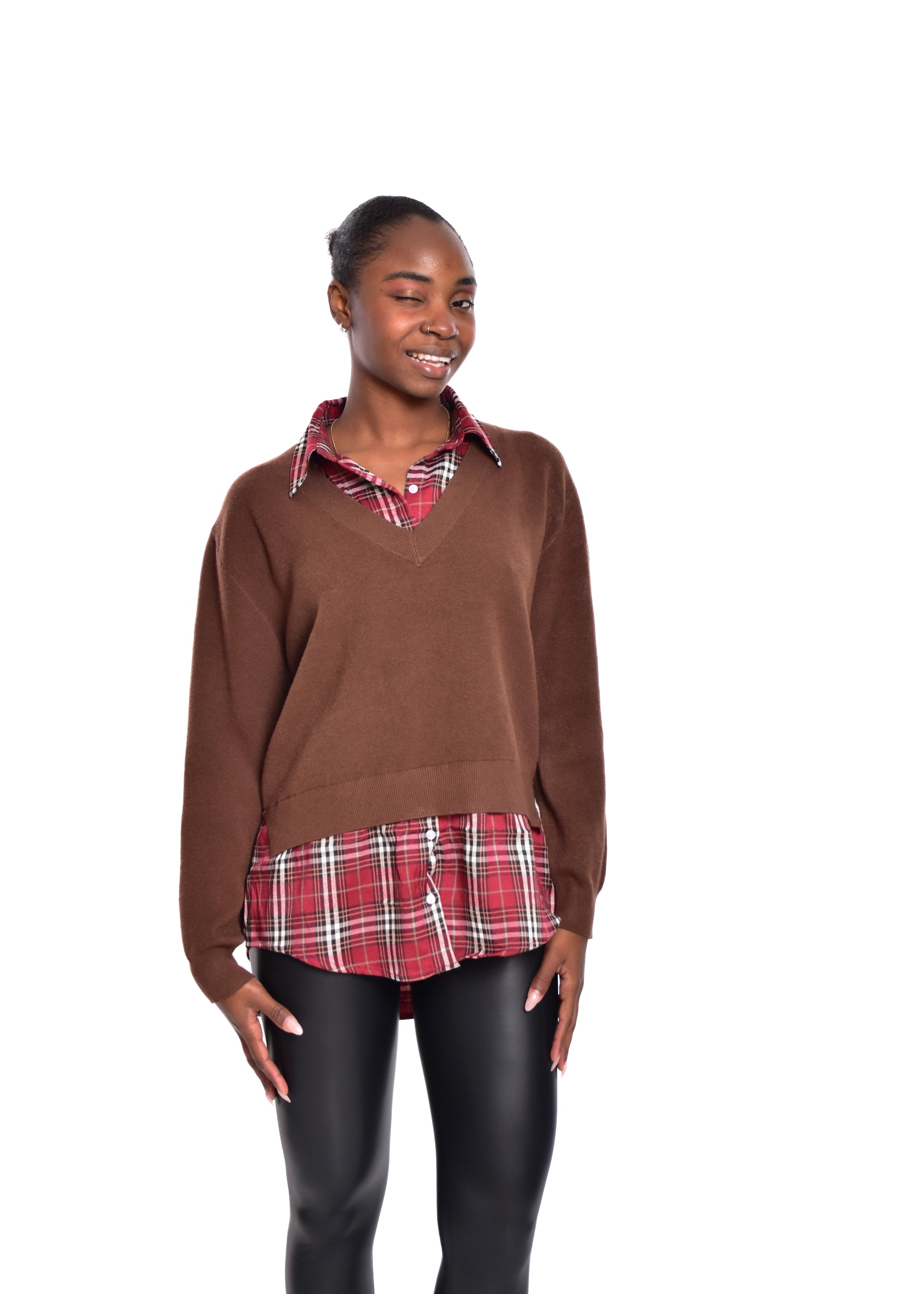 Jersey de punto grueso. Combinado con tela en estampado de cuadros.Ambas prendas van unidas. Esta prenda está disponible en talla única, en este caso es apto hasta una talla 42.
