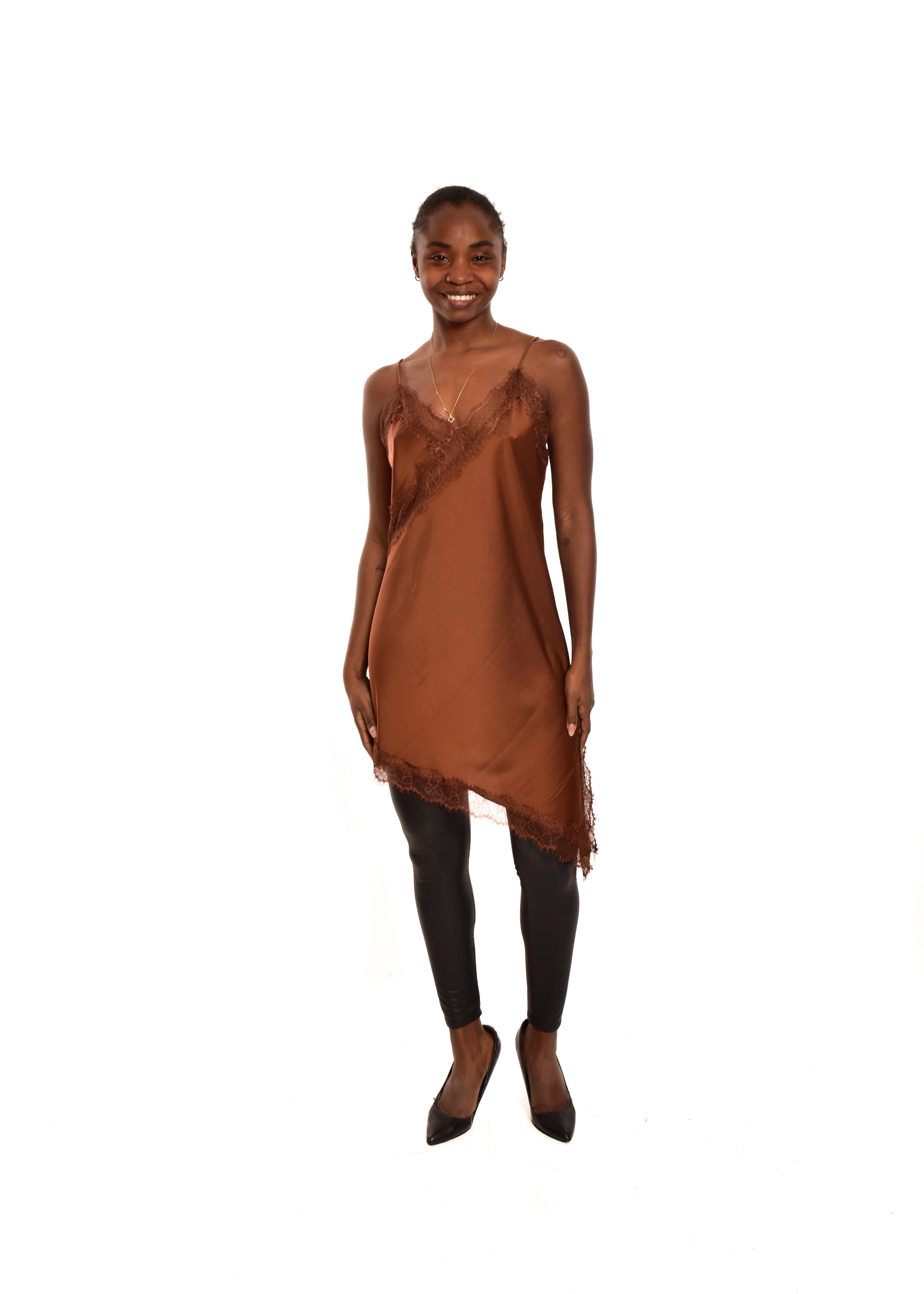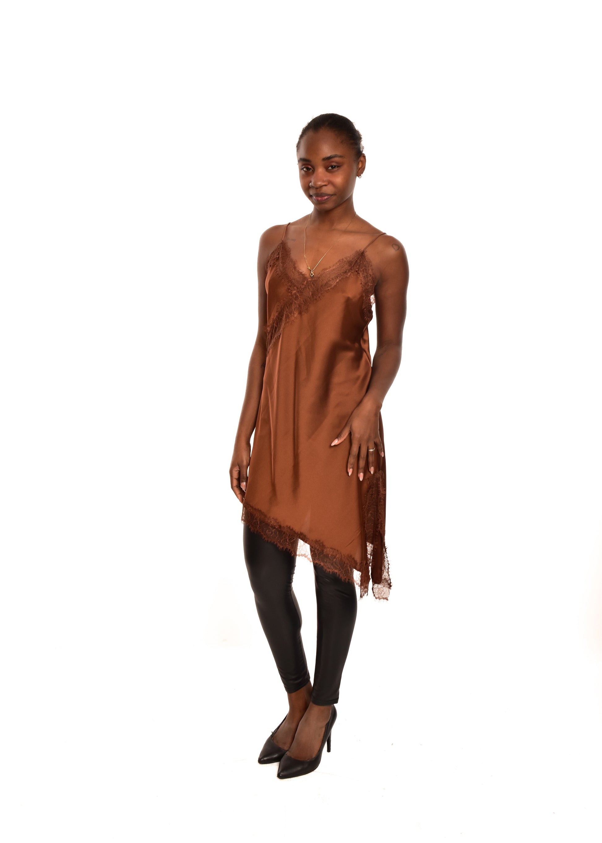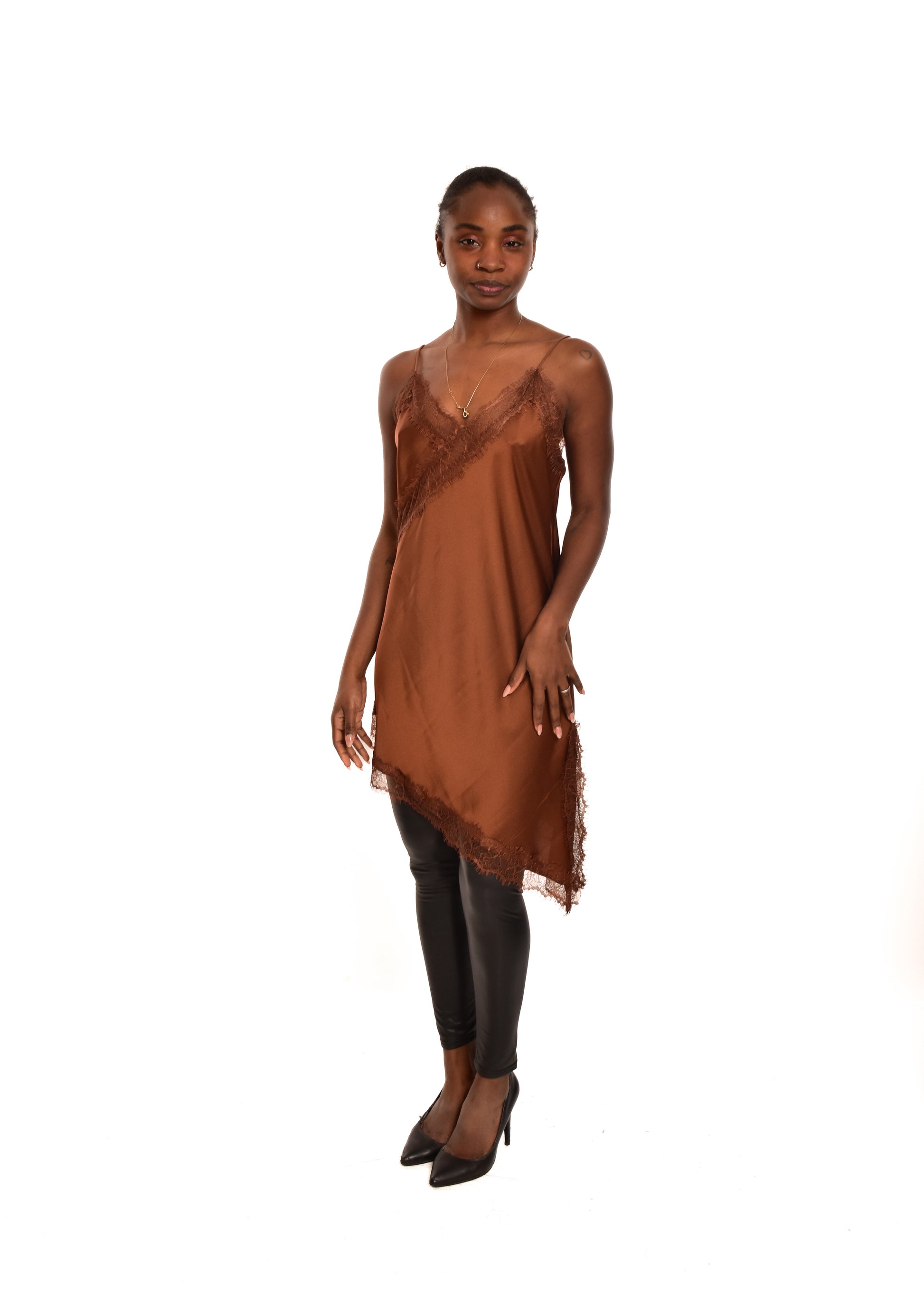 Vestido lencero con corte asimétrico. Esta prenda está disponible en talla única, en este caso es apto hasta una talla 40.