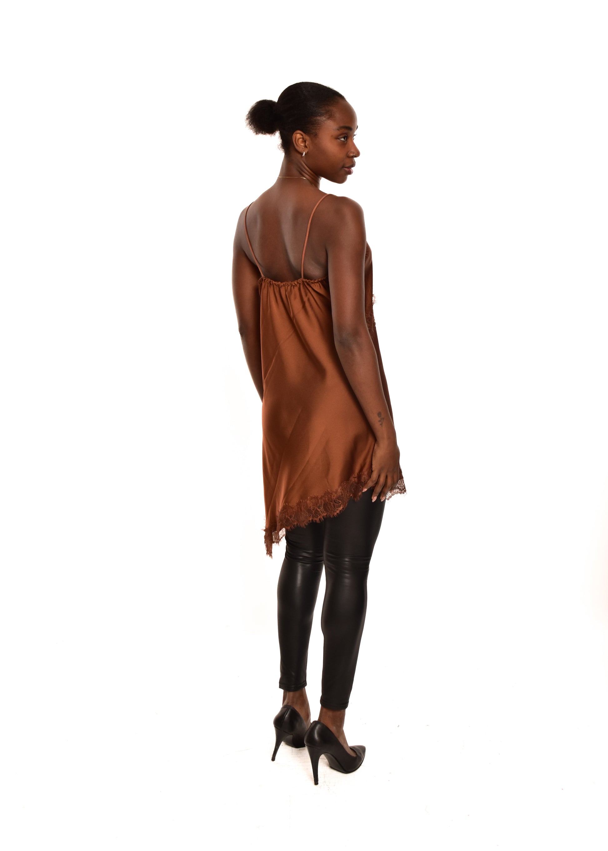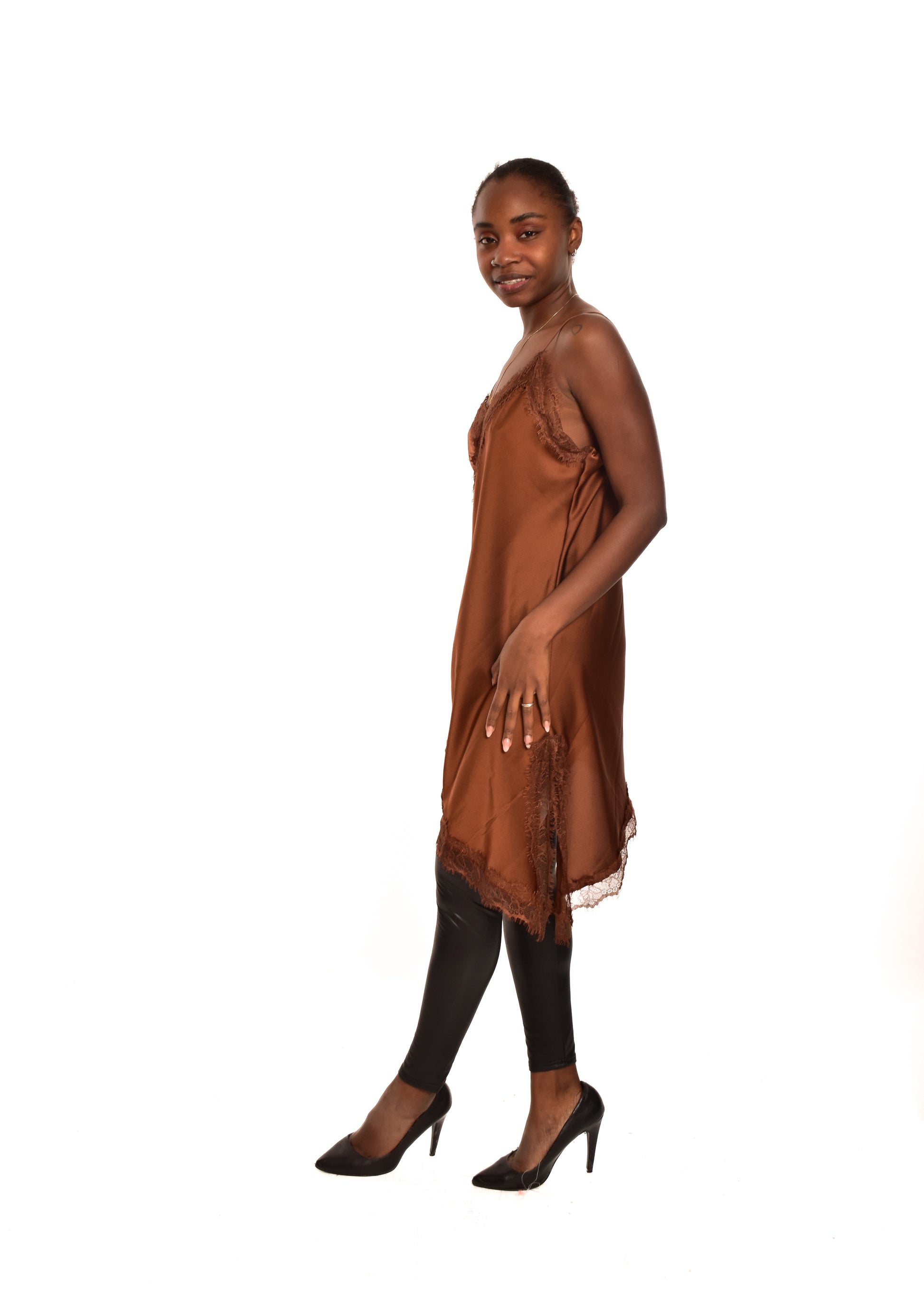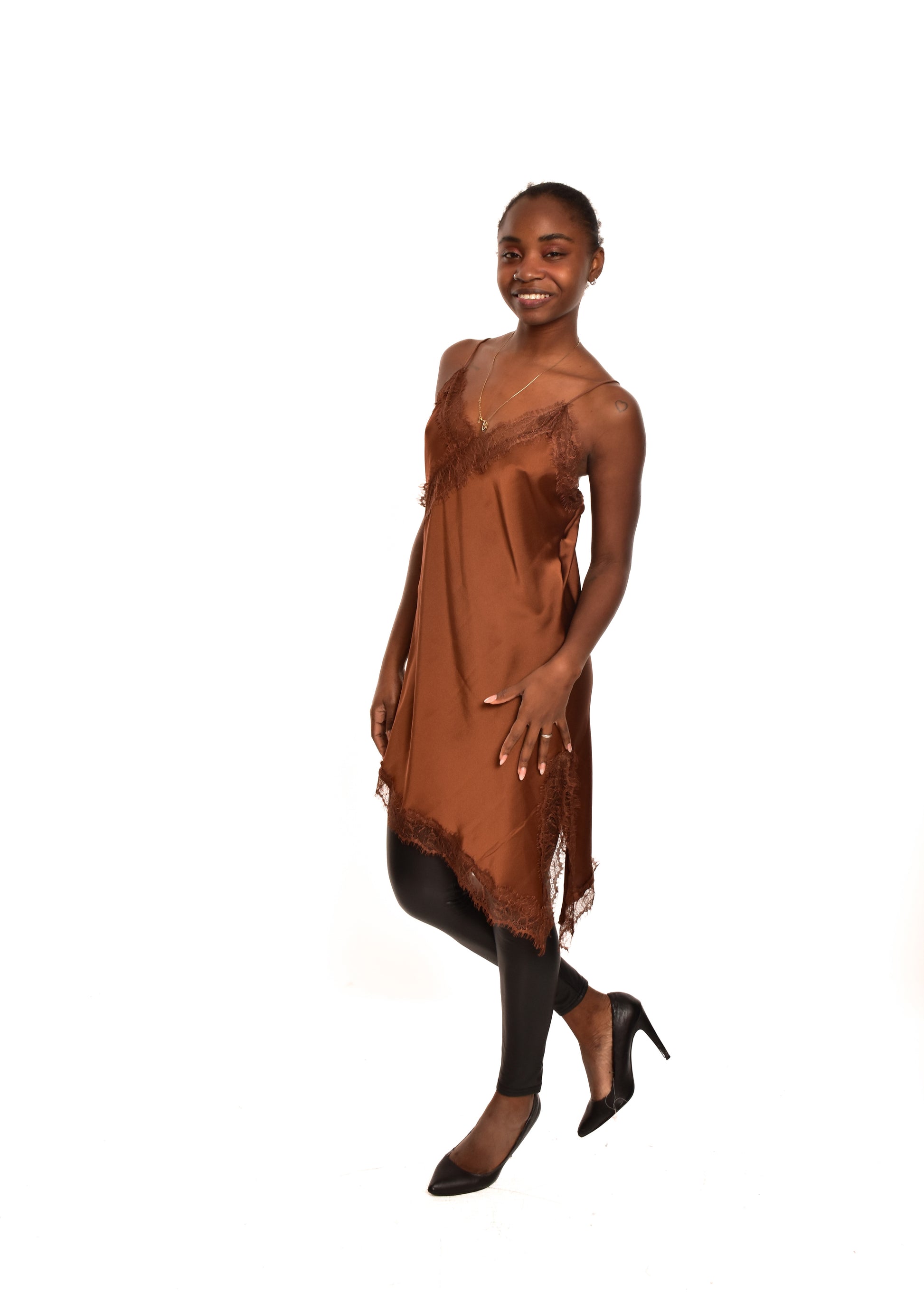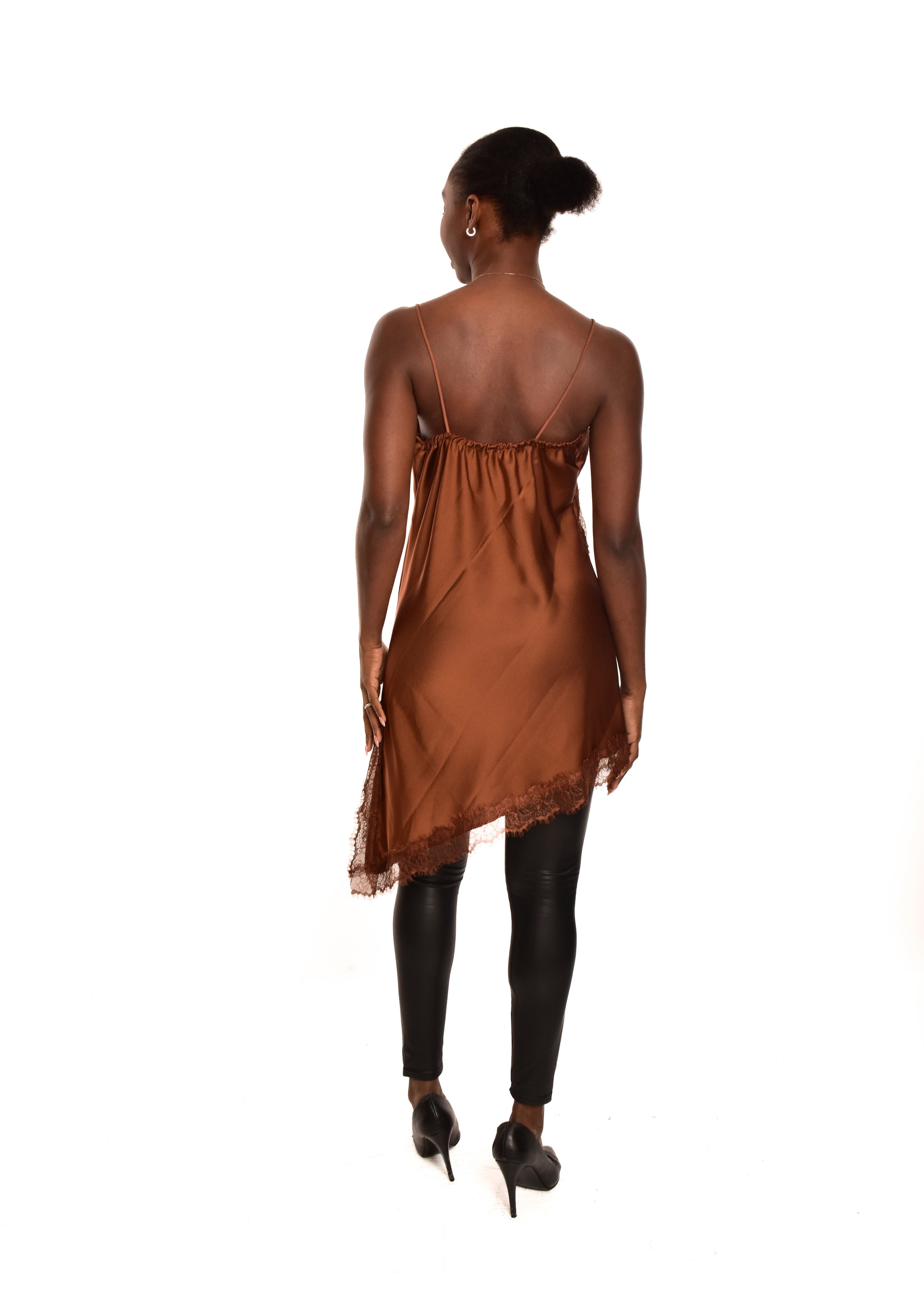 Vestido lencero con corte asimétrico. Esta prenda está disponible en talla única, en este caso es apto hasta una talla 40.