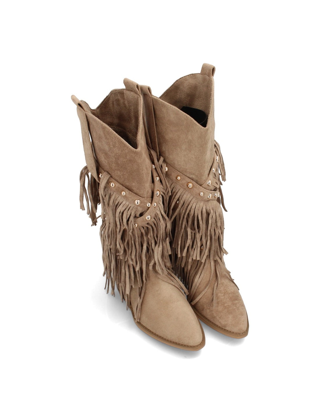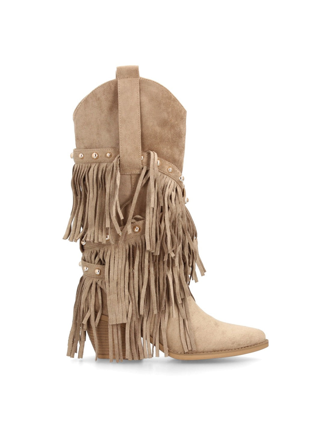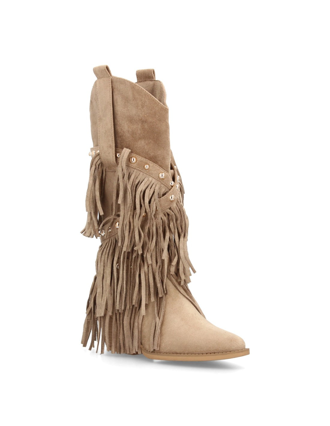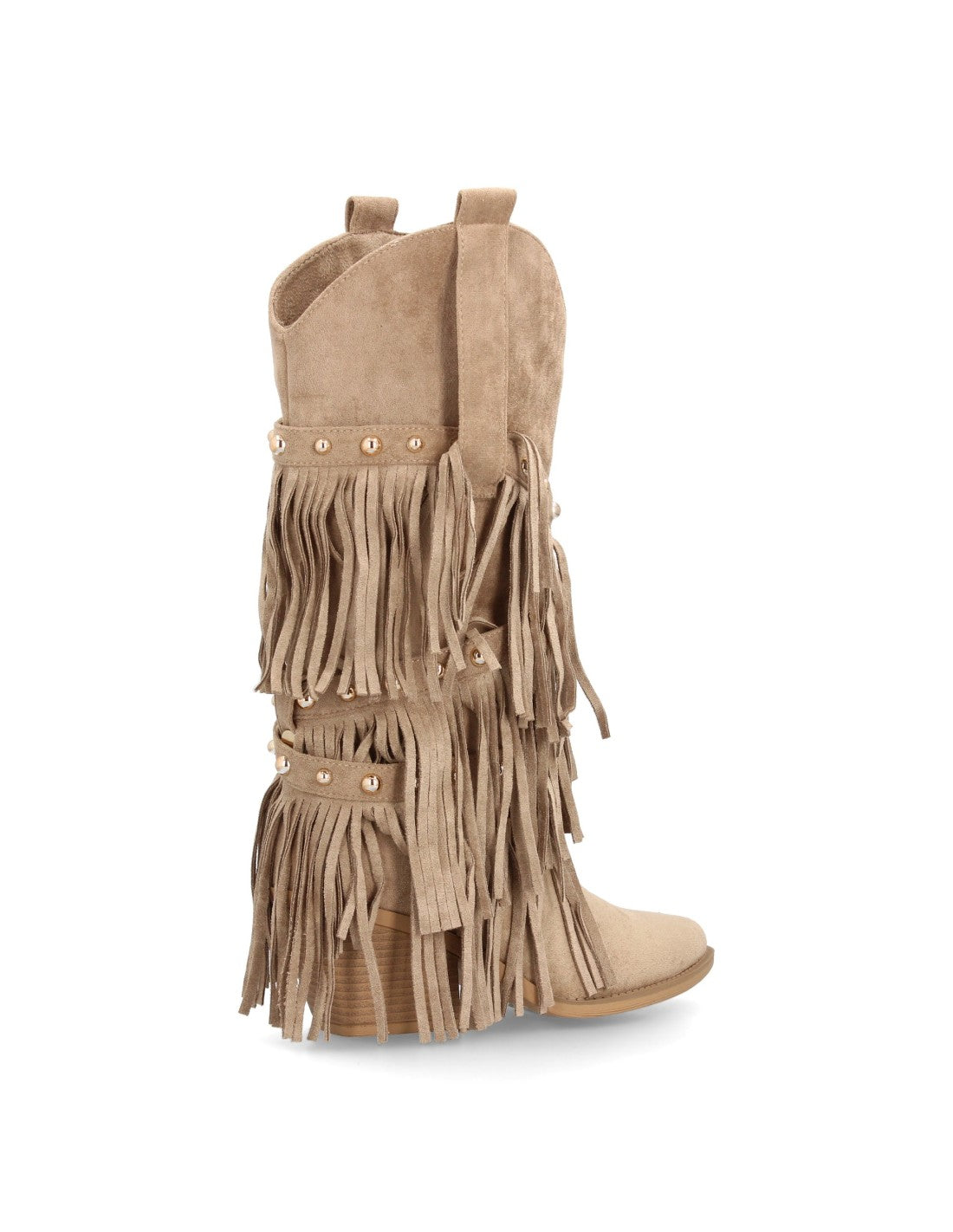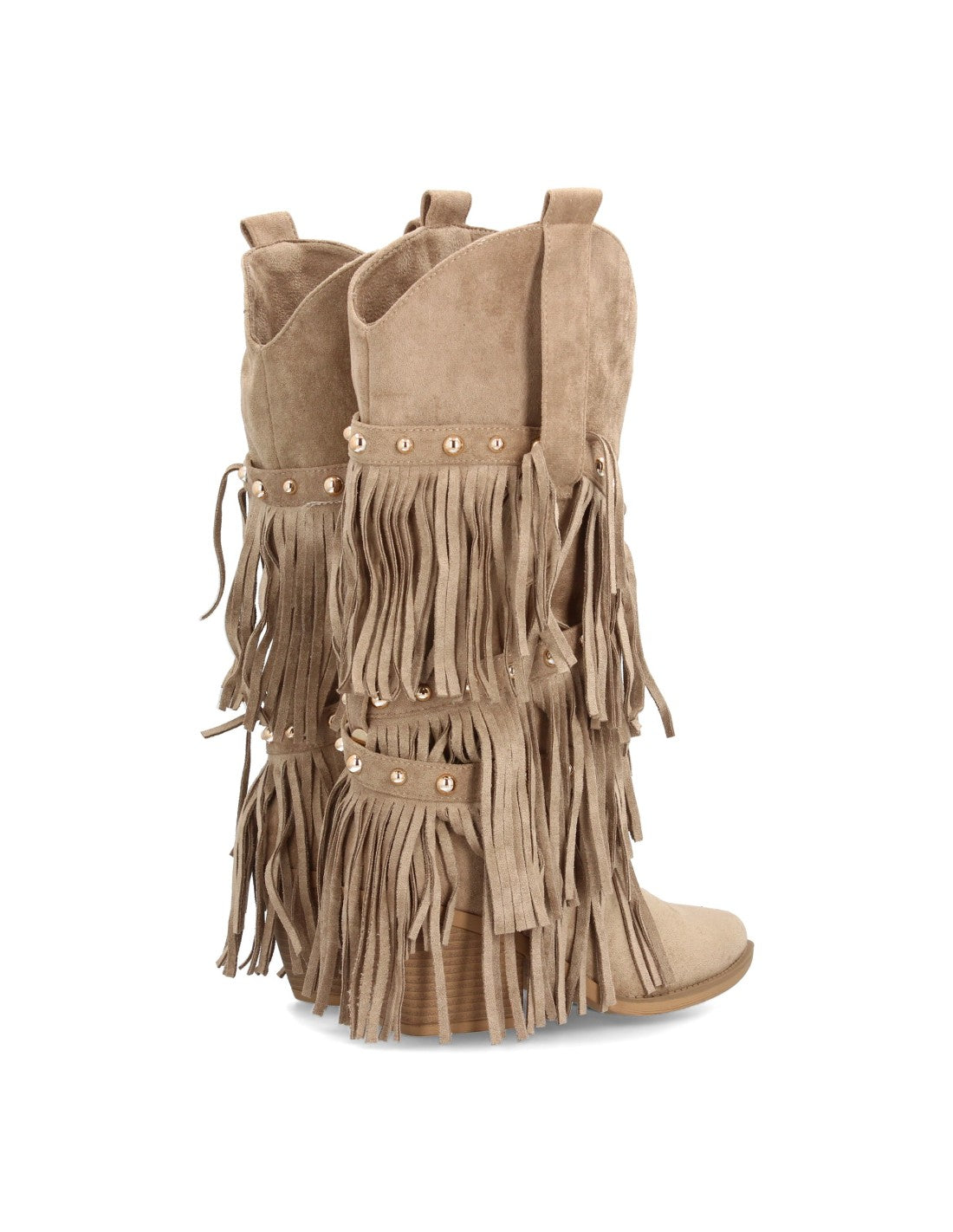 Bota de estilo western con caña alta decorada con flecos en cascada y tachuelas metálicas punta fina y tacón cubano. Ideal para mujer en temporada de Otoño Invierno. Tacón: 8cm , Plataforma: 1cm