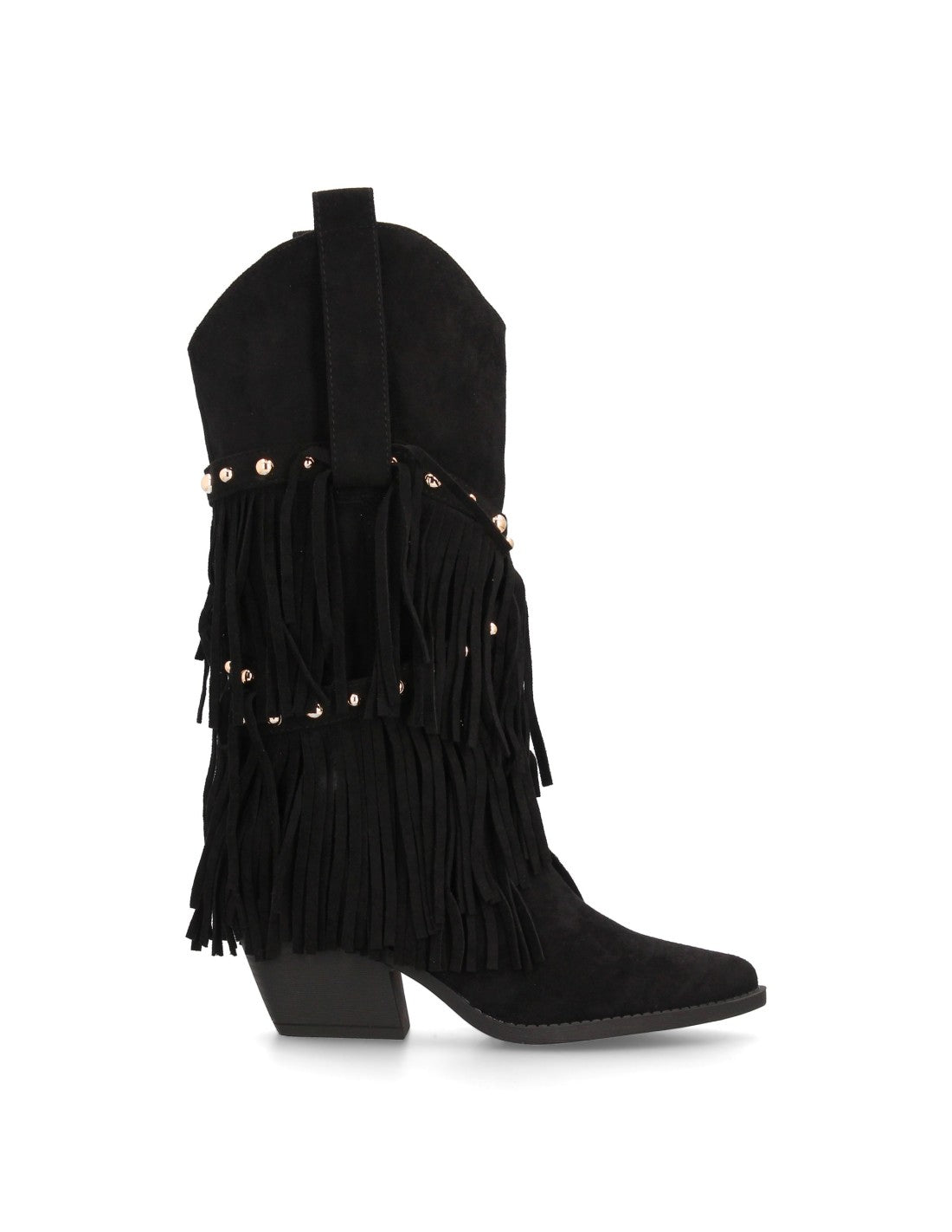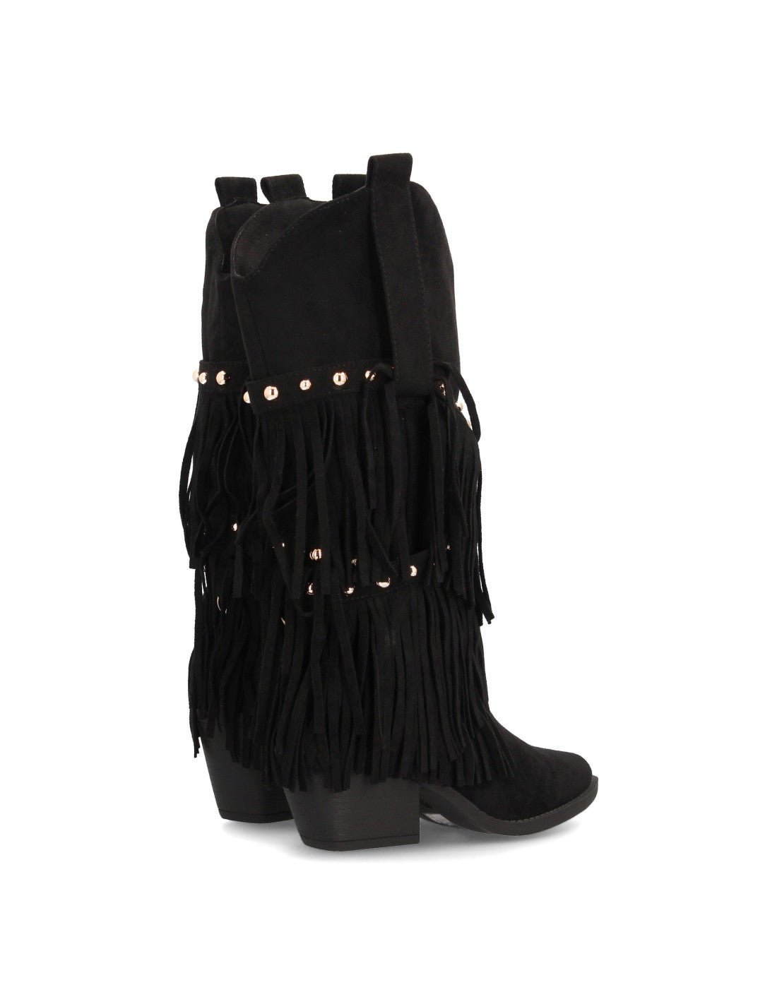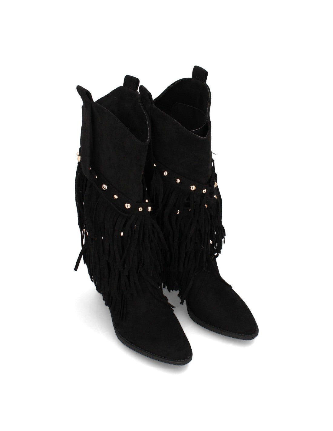 Bota de estilo western con caña alta decorada con flecos en cascada y tachuelas metálicas punta fina y tacón cubano. Ideal para mujer en temporada de Otoño Invierno. Tacón: 8cm , Plataforma: 1cm