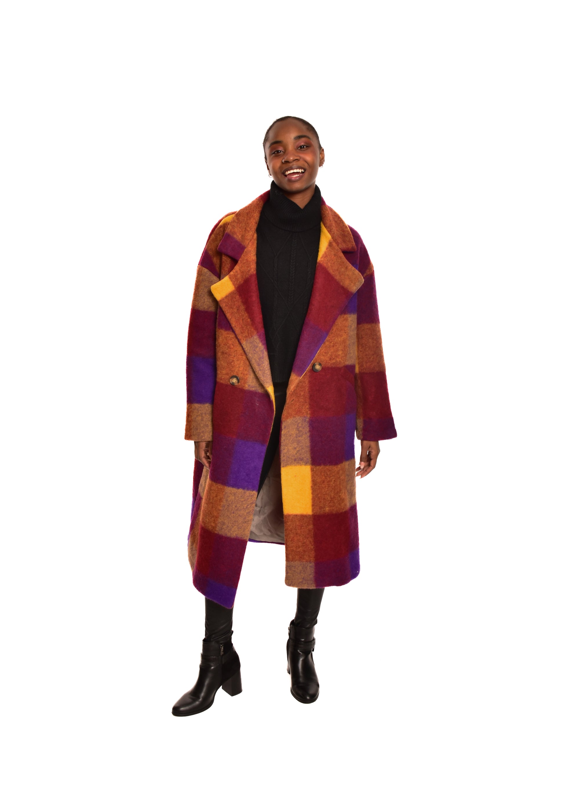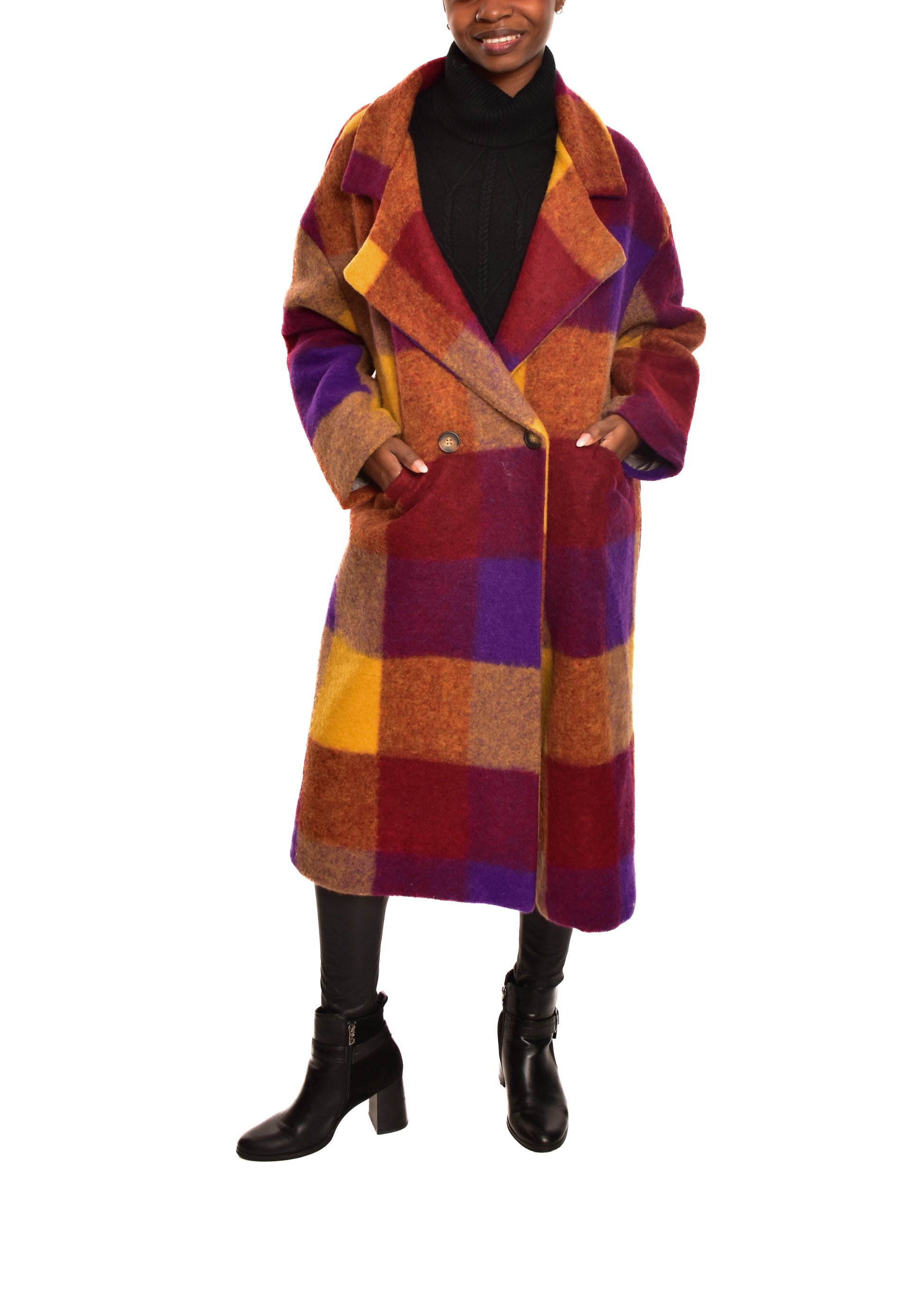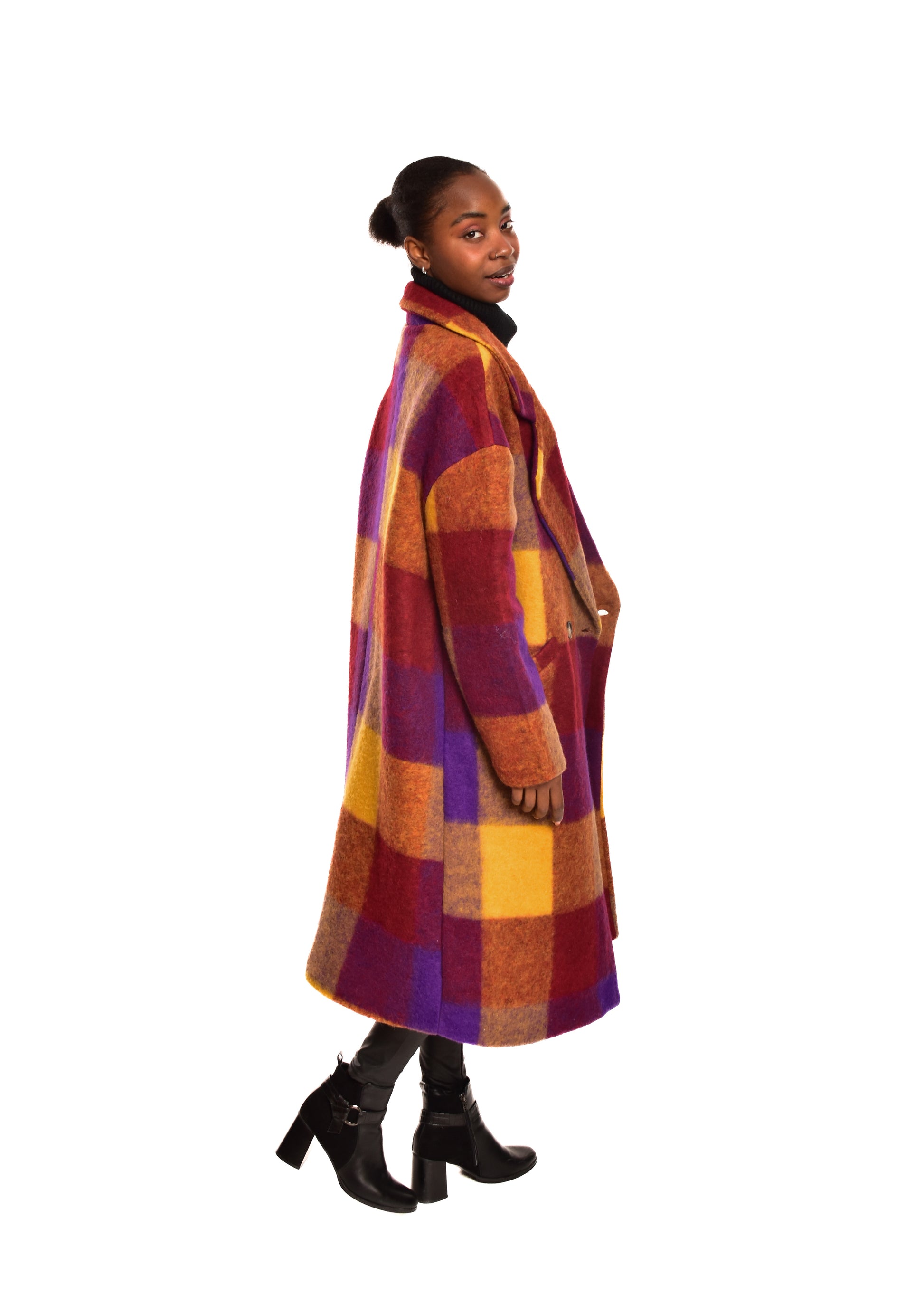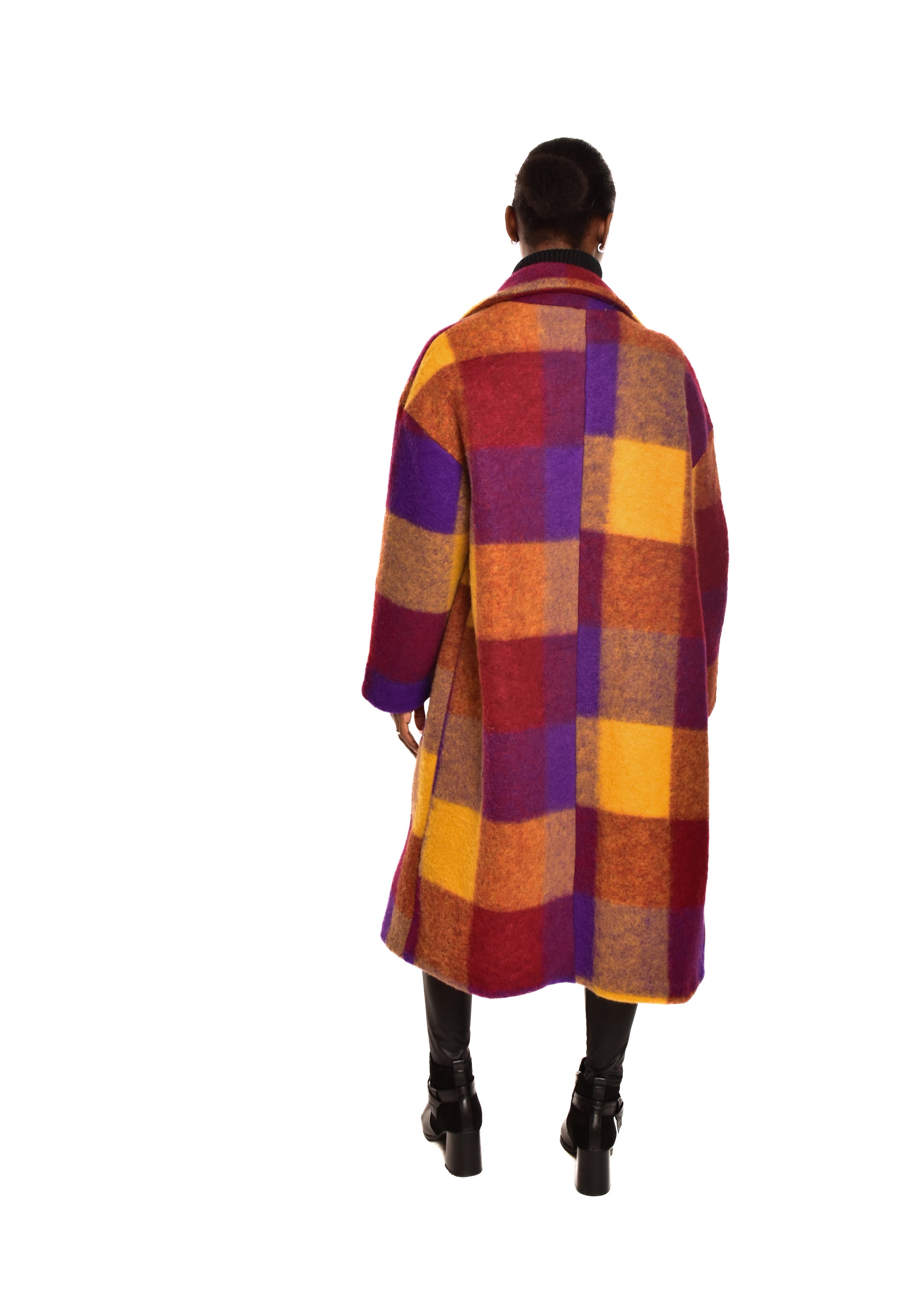 Abrigo en lana 100% con estampado colorido. La posición de los cuadros puede variar.Este modelo está disponible en talla única, en este caso es apta de una talla 44.