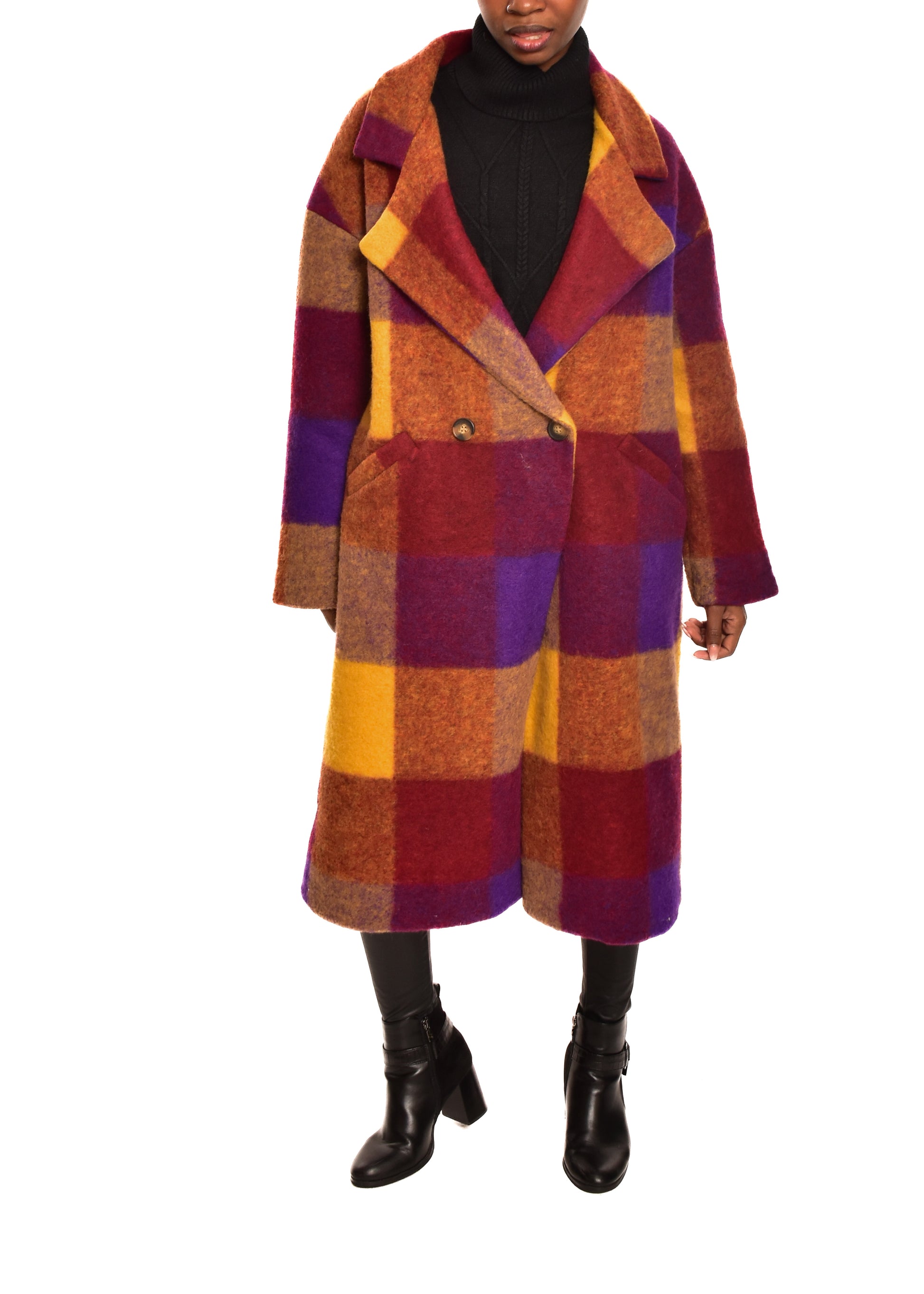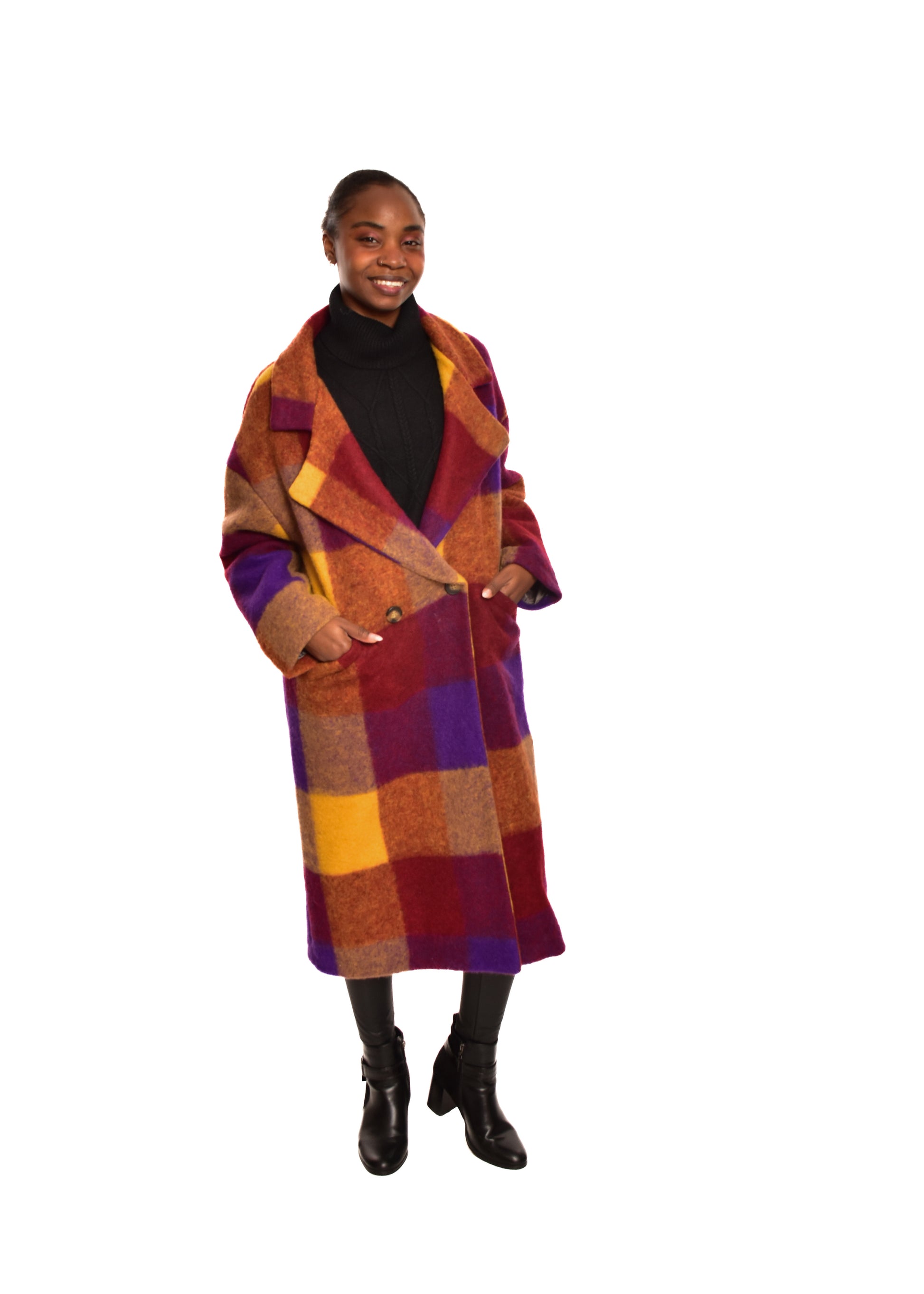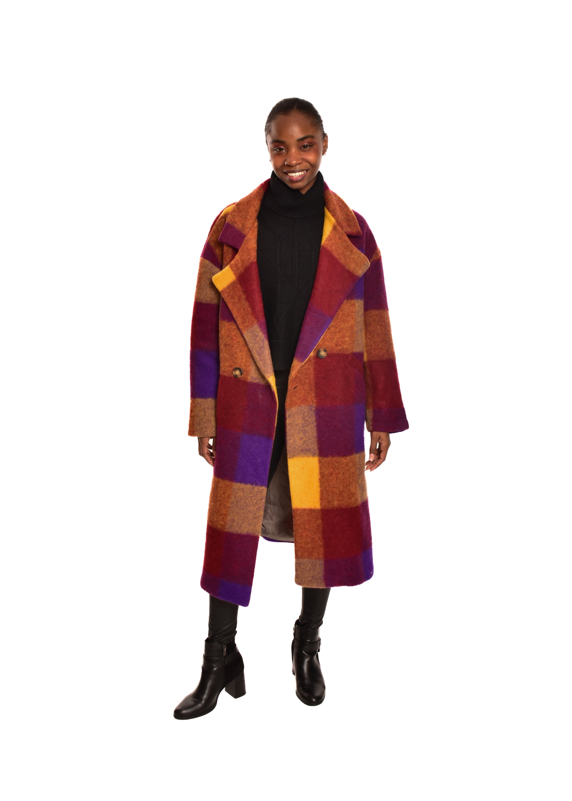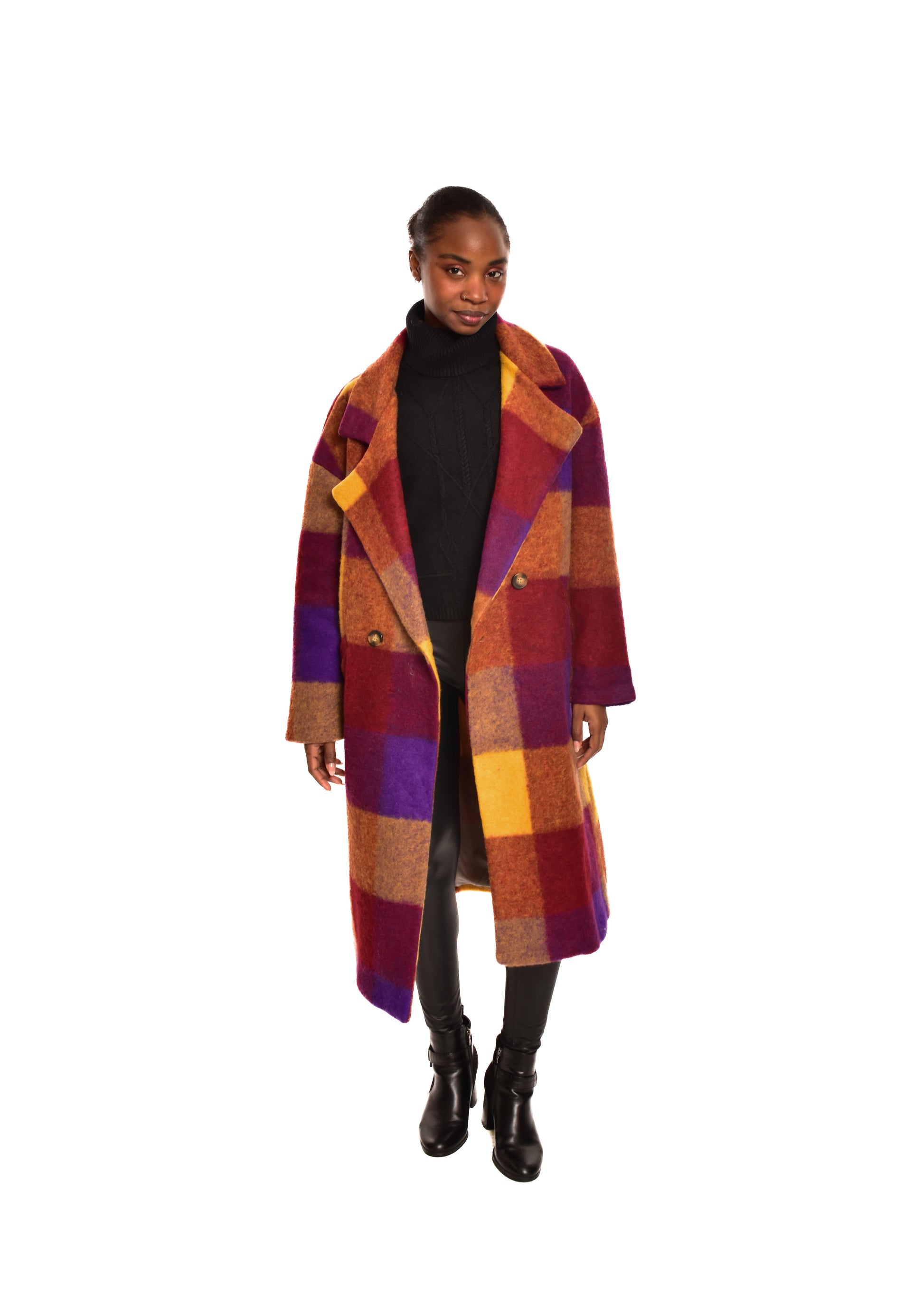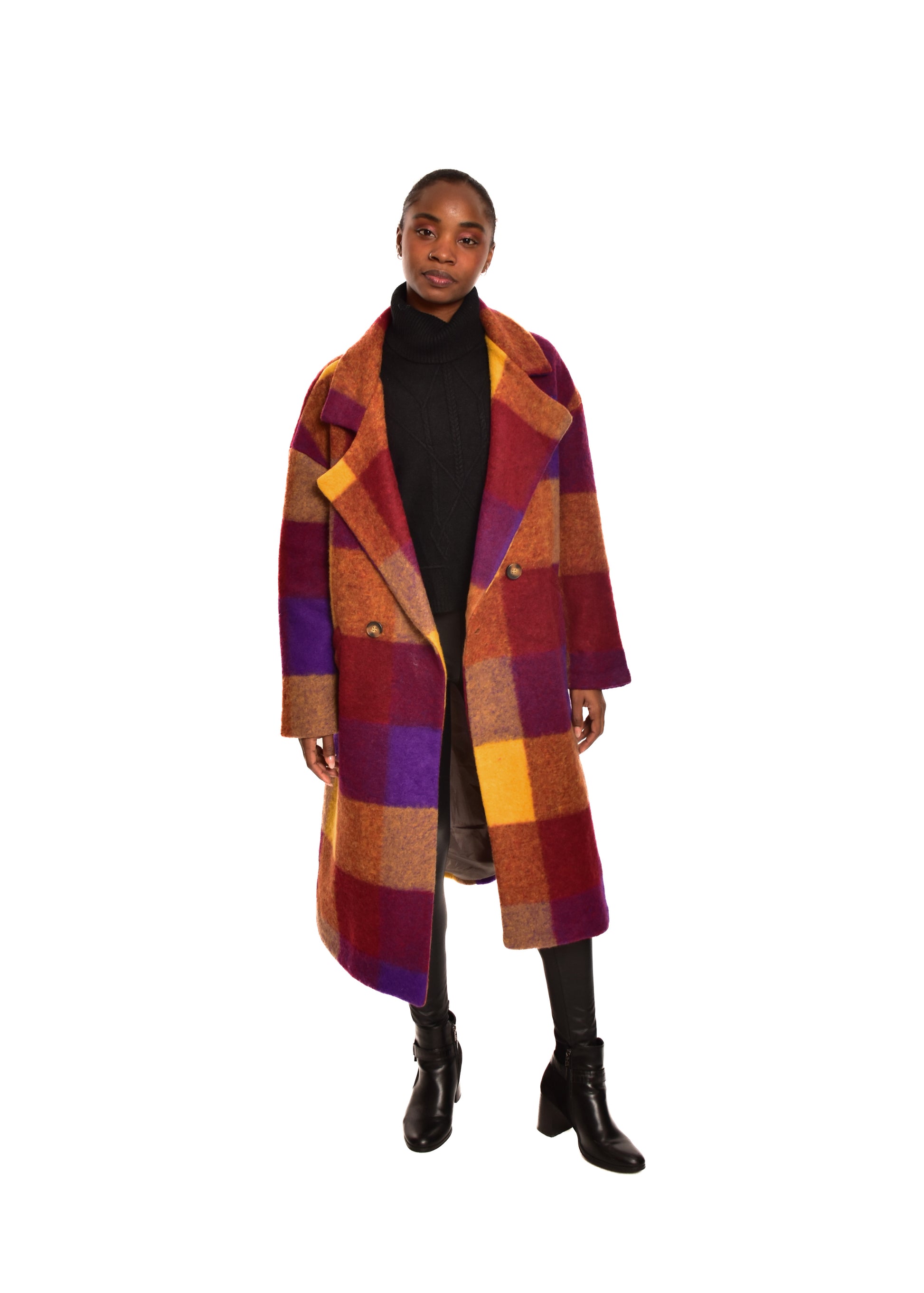 Abrigo en lana 100% con estampado colorido. La posición de los cuadros puede variar.Este modelo está disponible en talla única, en este caso es apta de una talla 44.