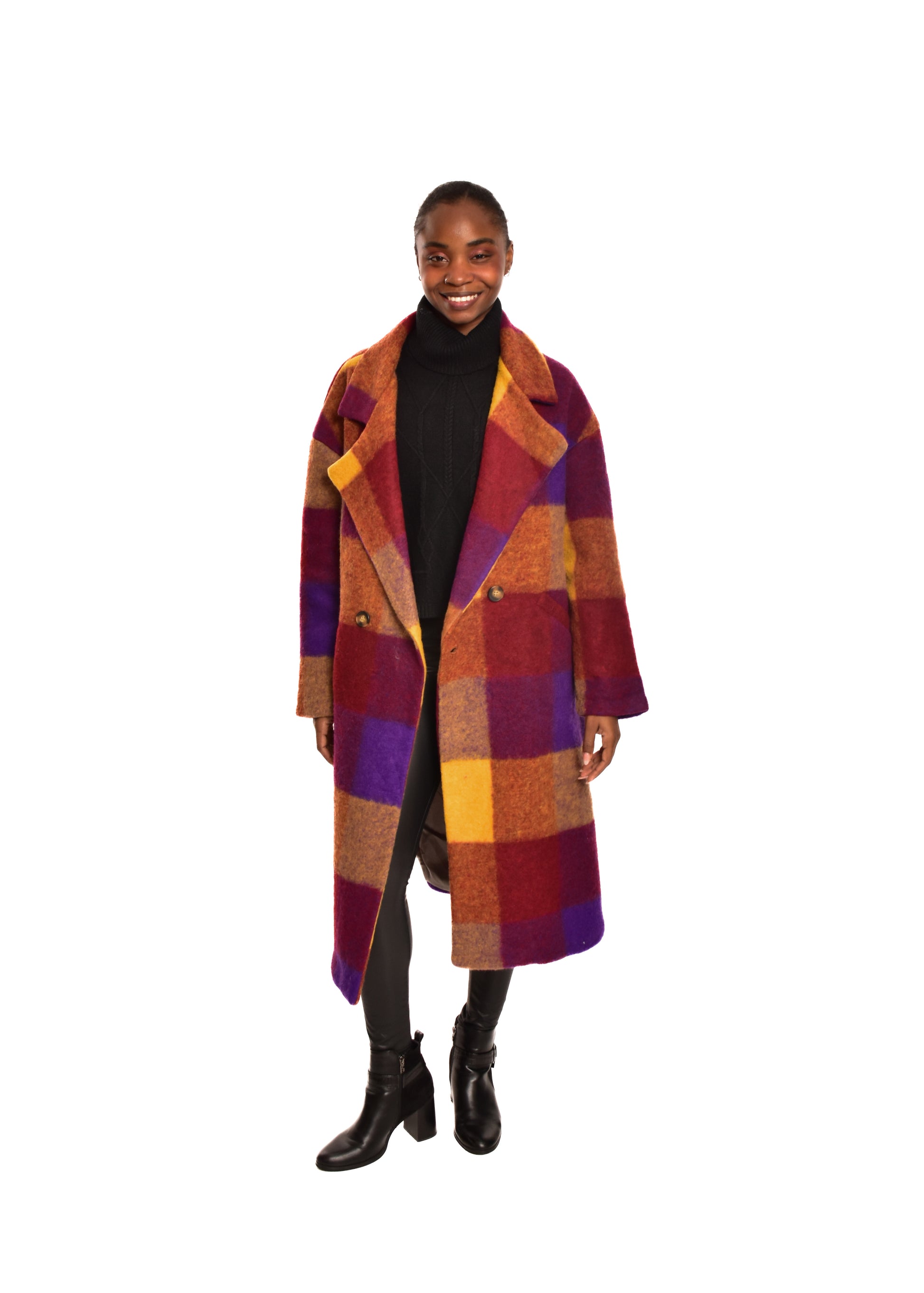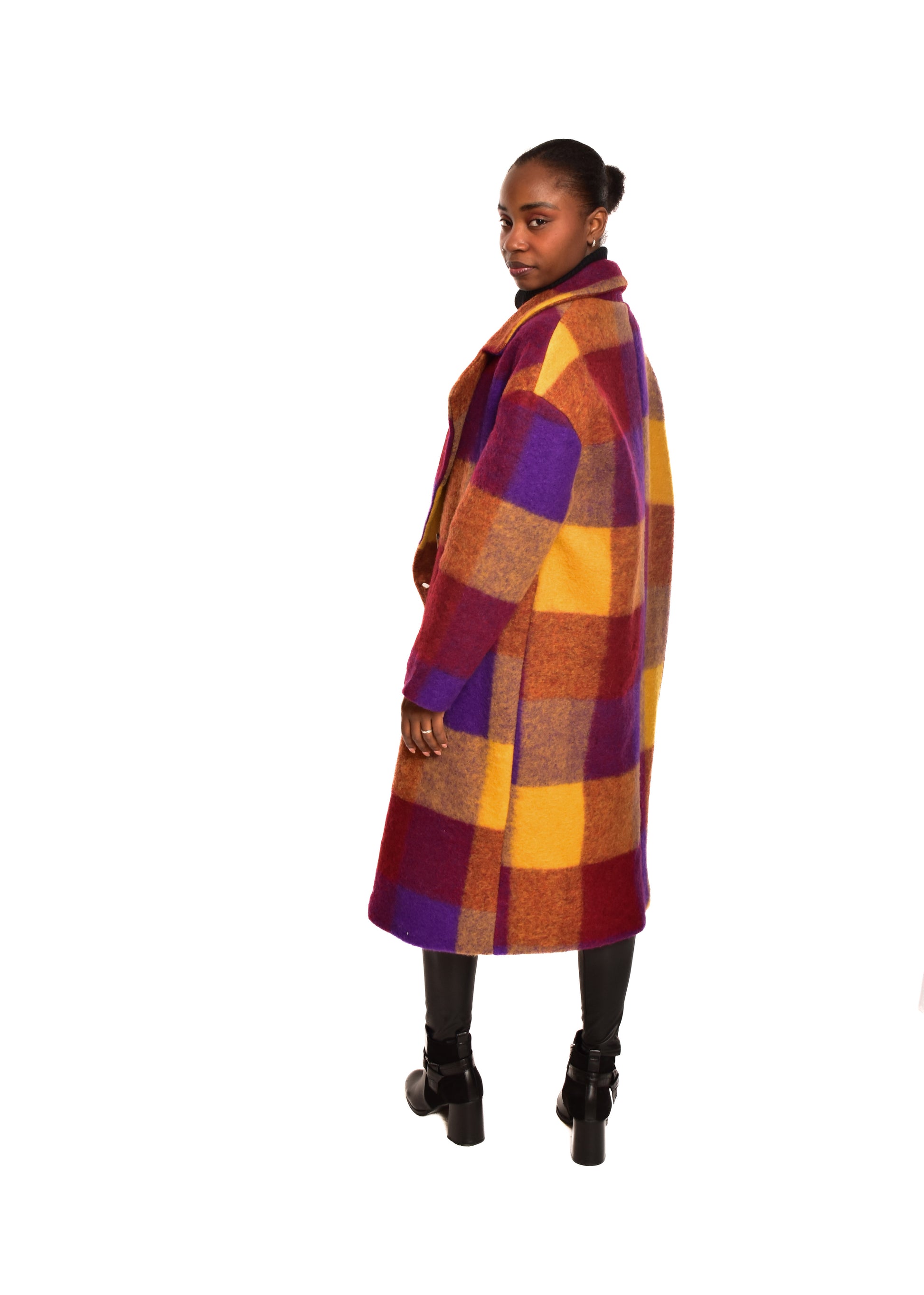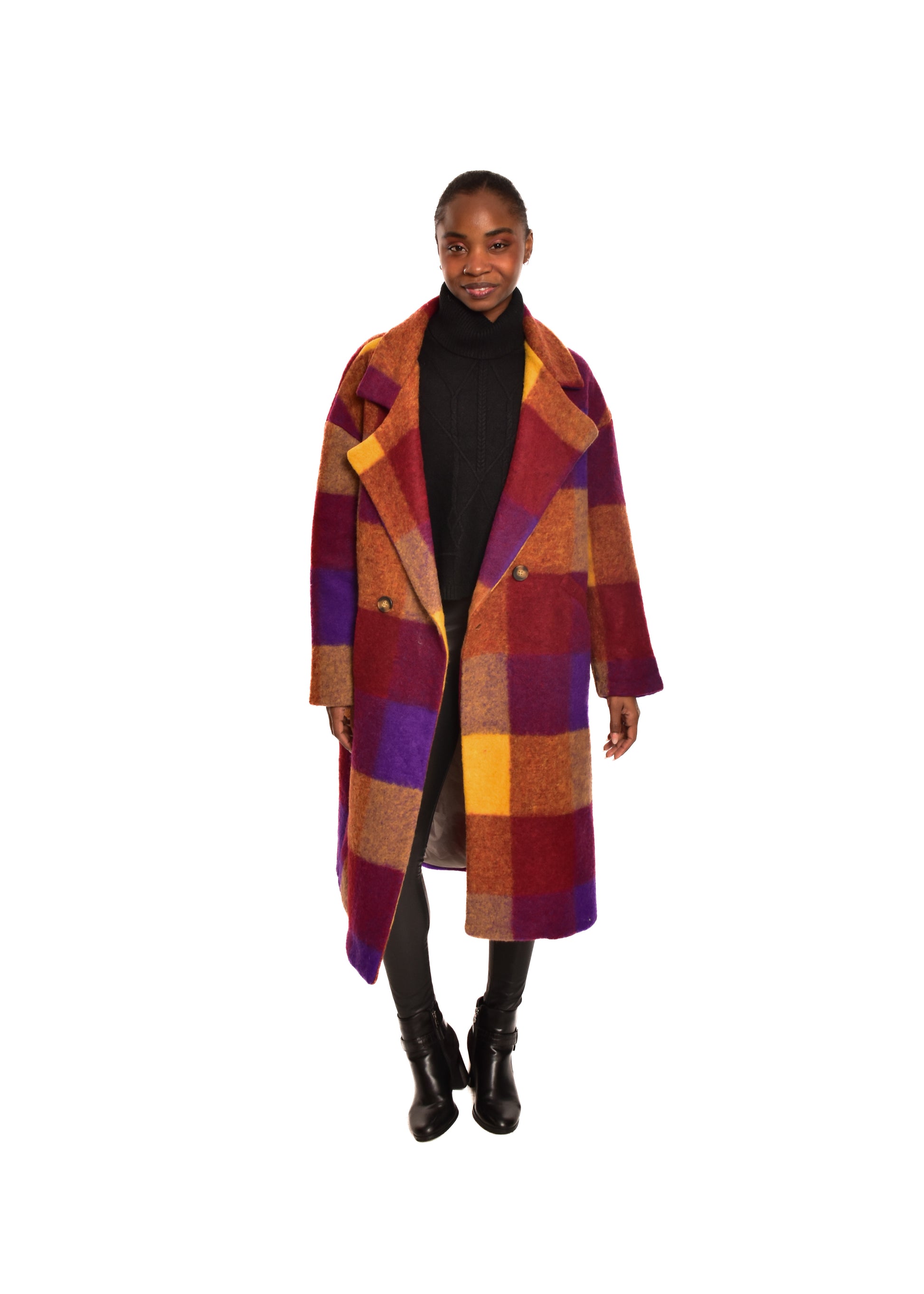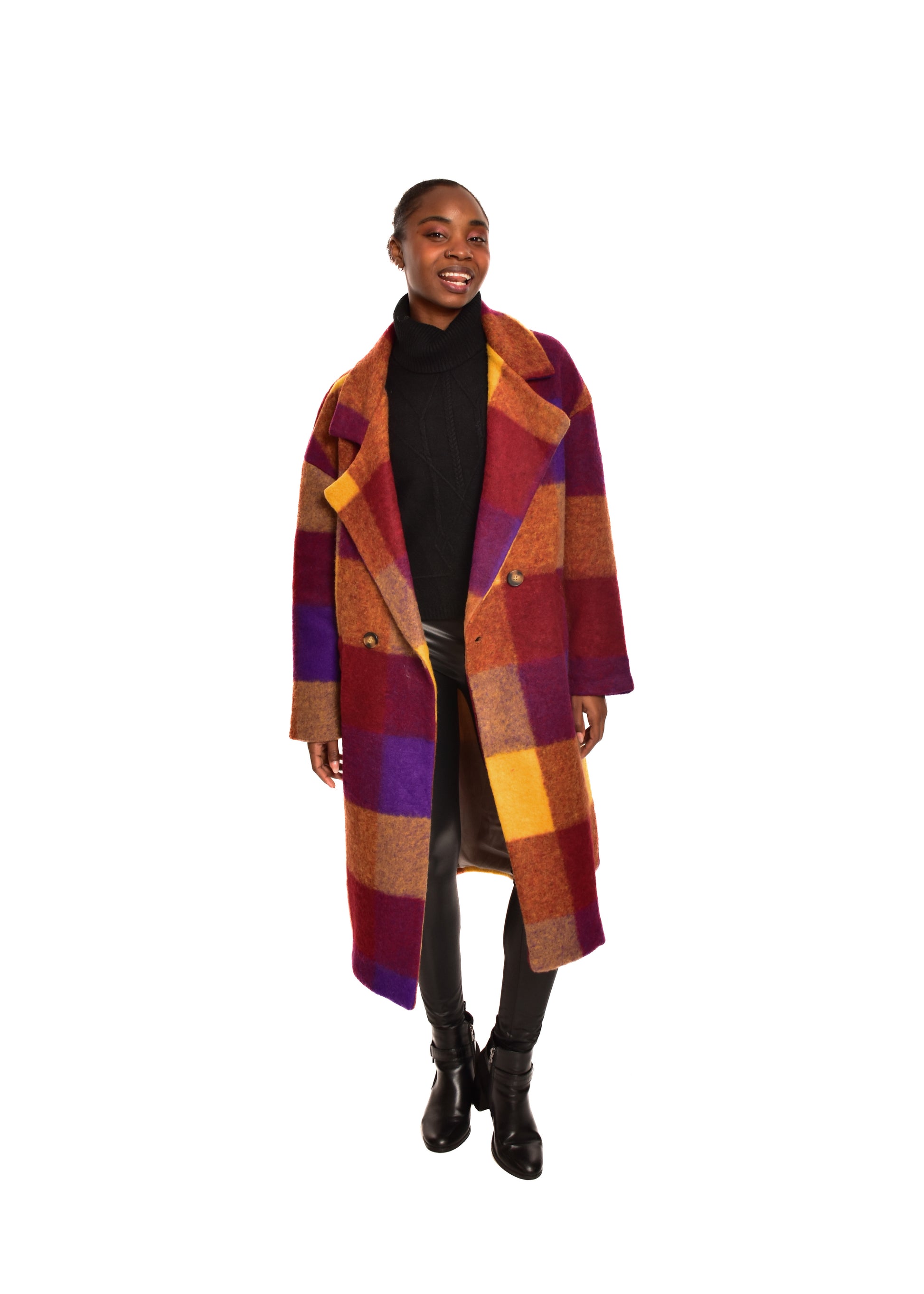 Abrigo en lana 100% con estampado colorido. La posición de los cuadros puede variar.Este modelo está disponible en talla única, en este caso es apta de una talla 44.