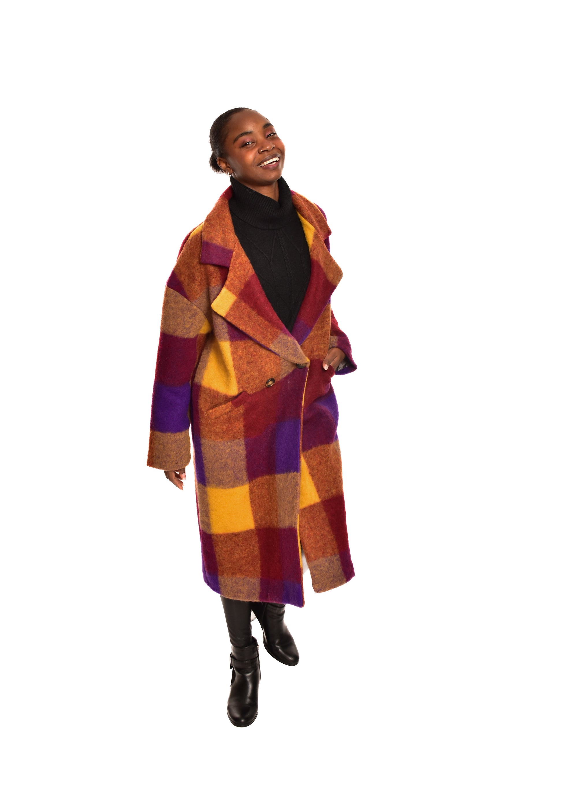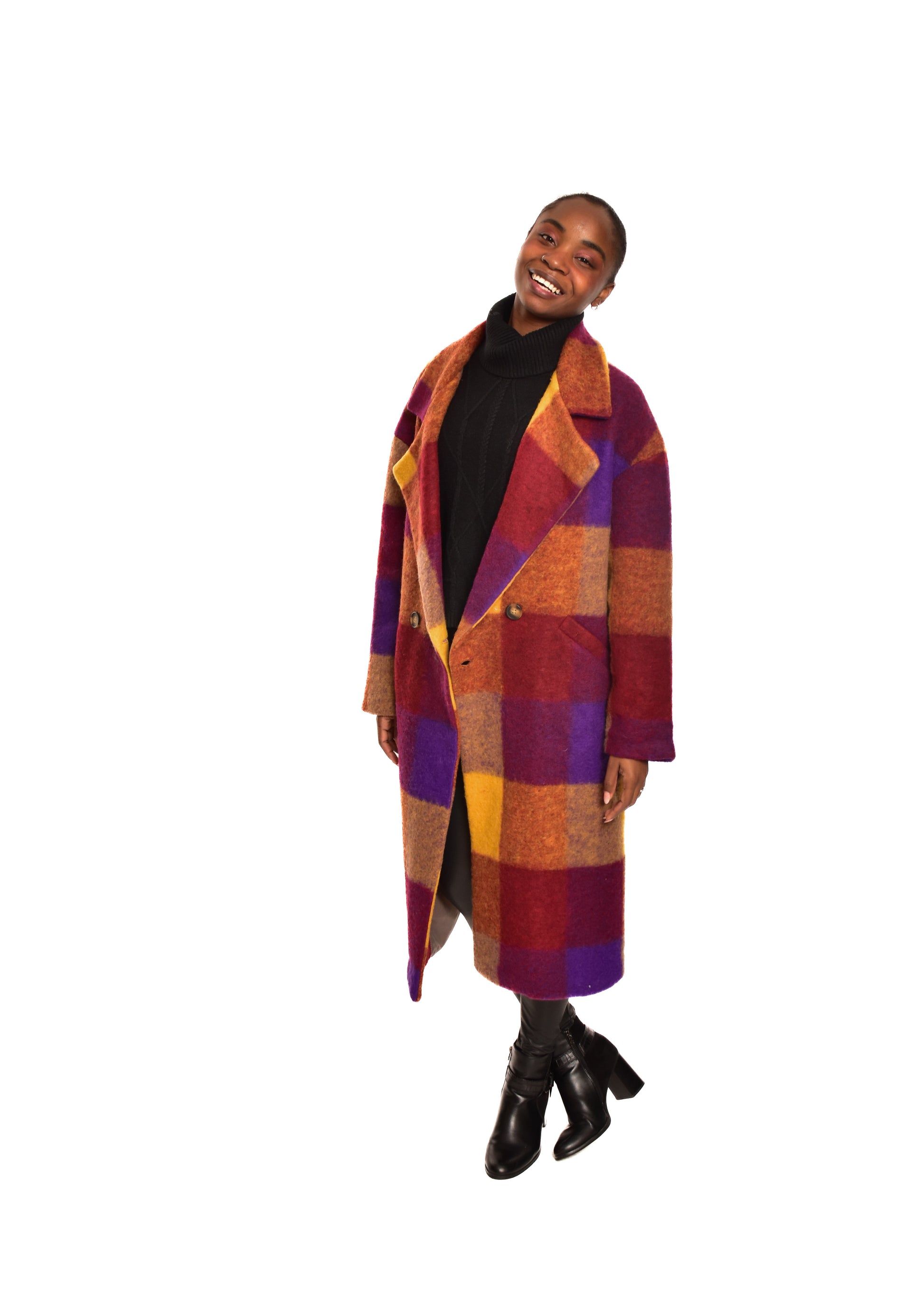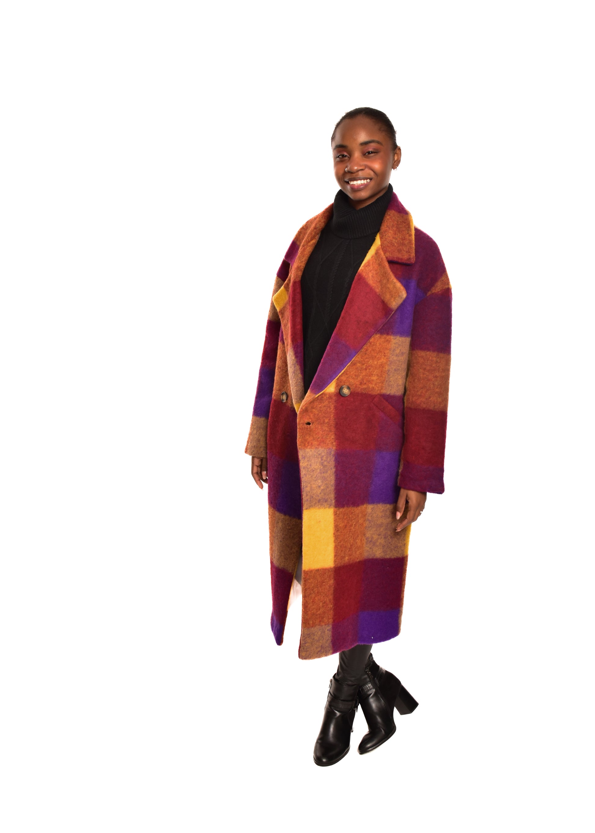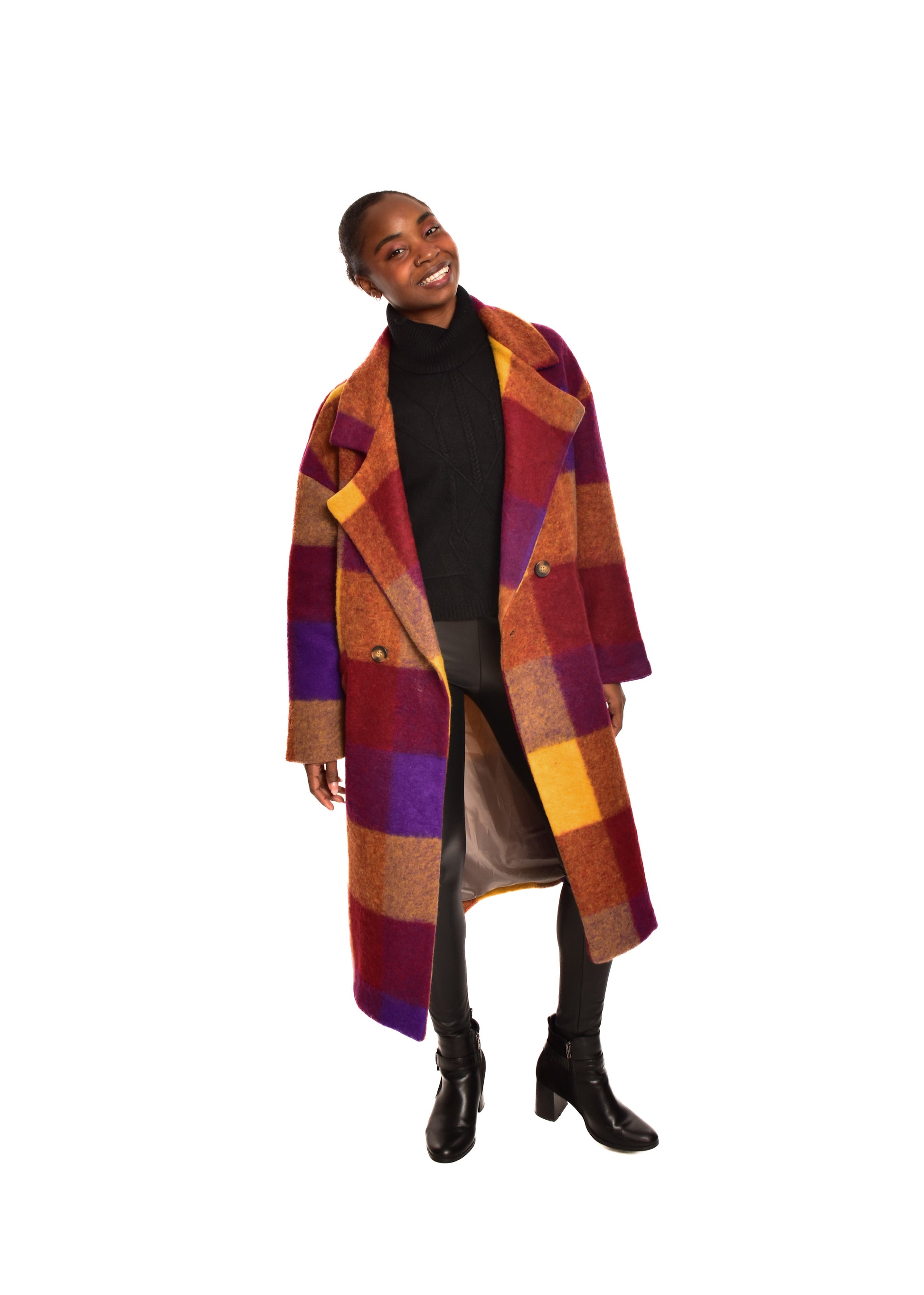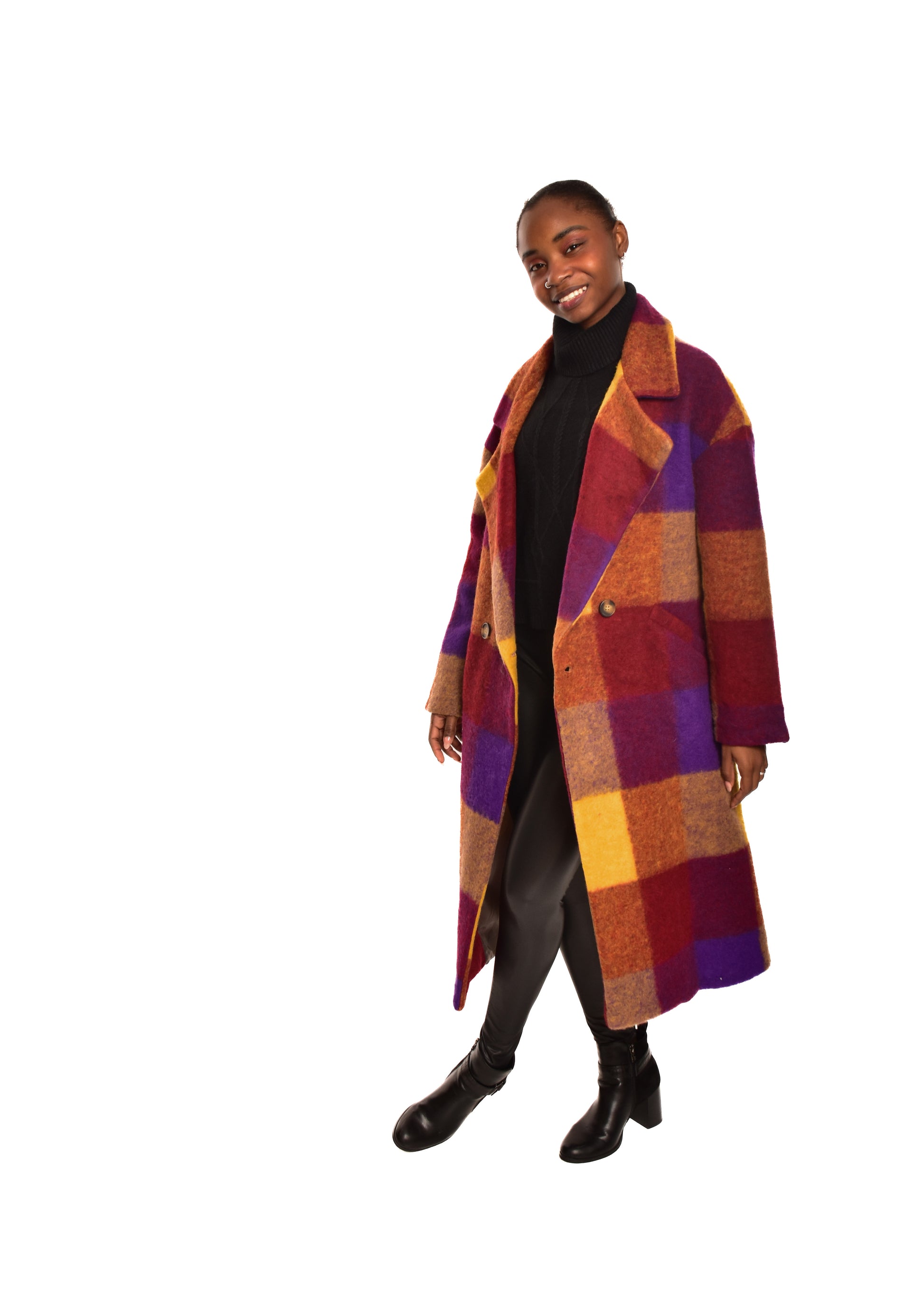 Abrigo en lana 100% con estampado colorido. La posición de los cuadros puede variar.Este modelo está disponible en talla única, en este caso es apta de una talla 44.