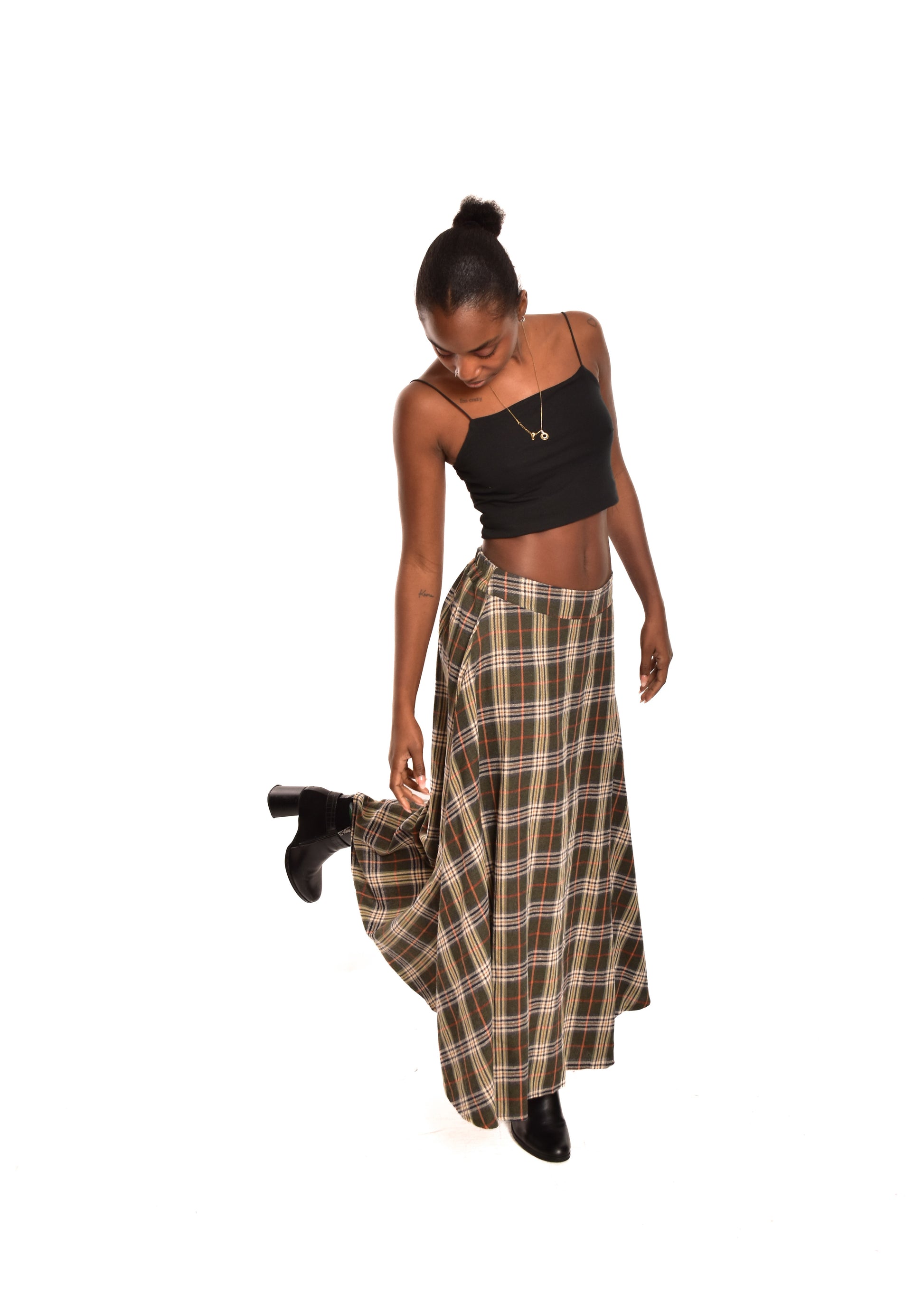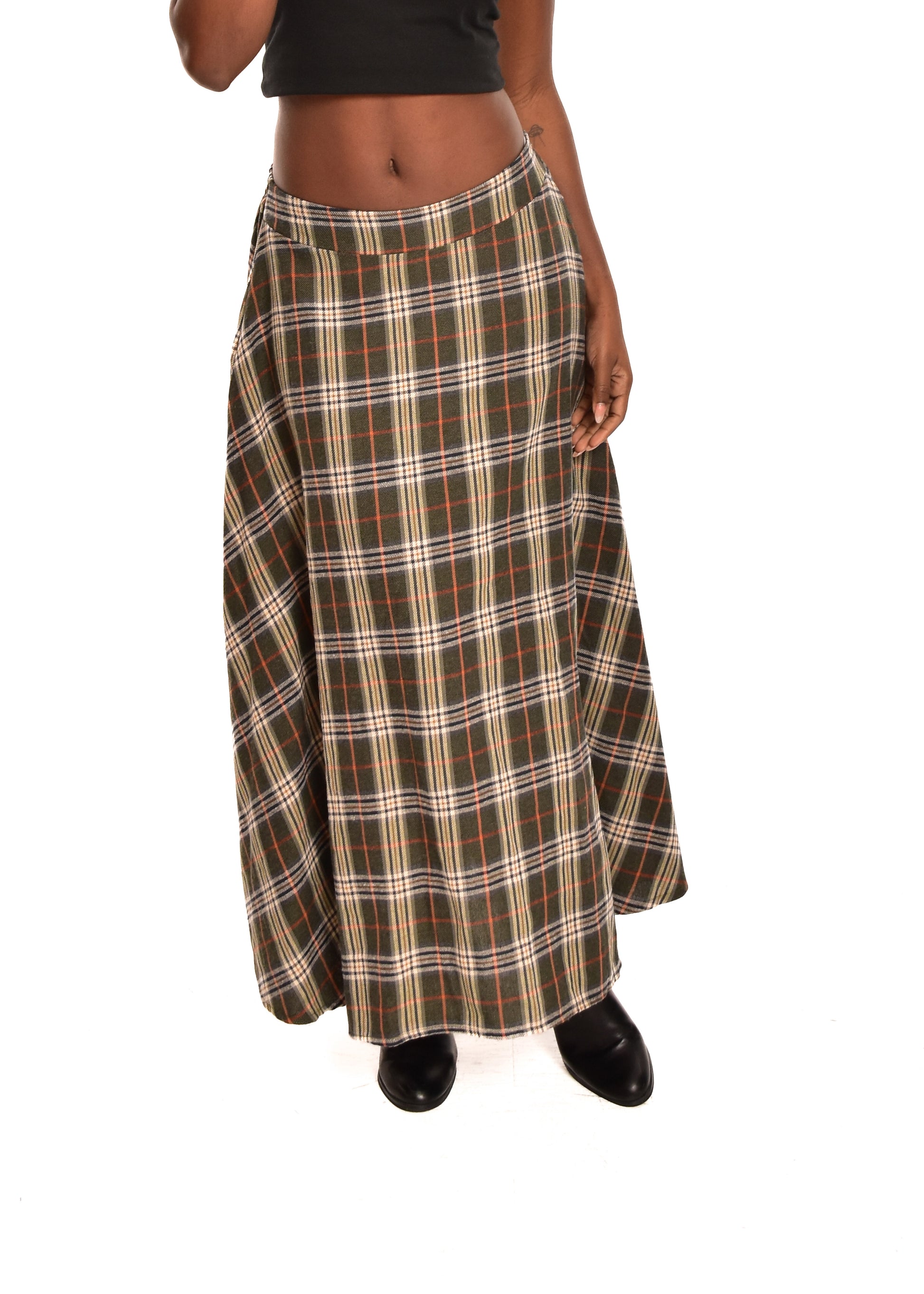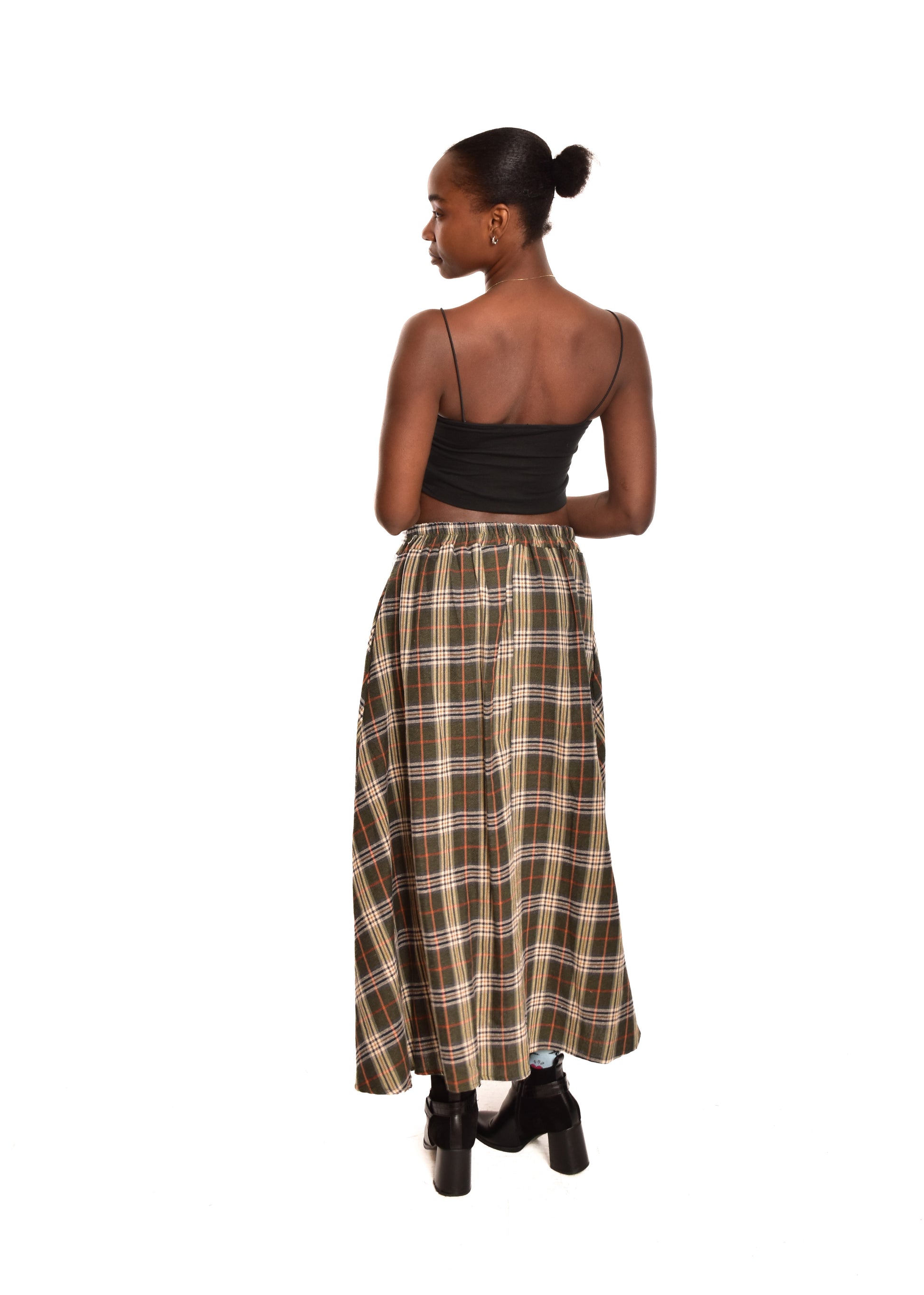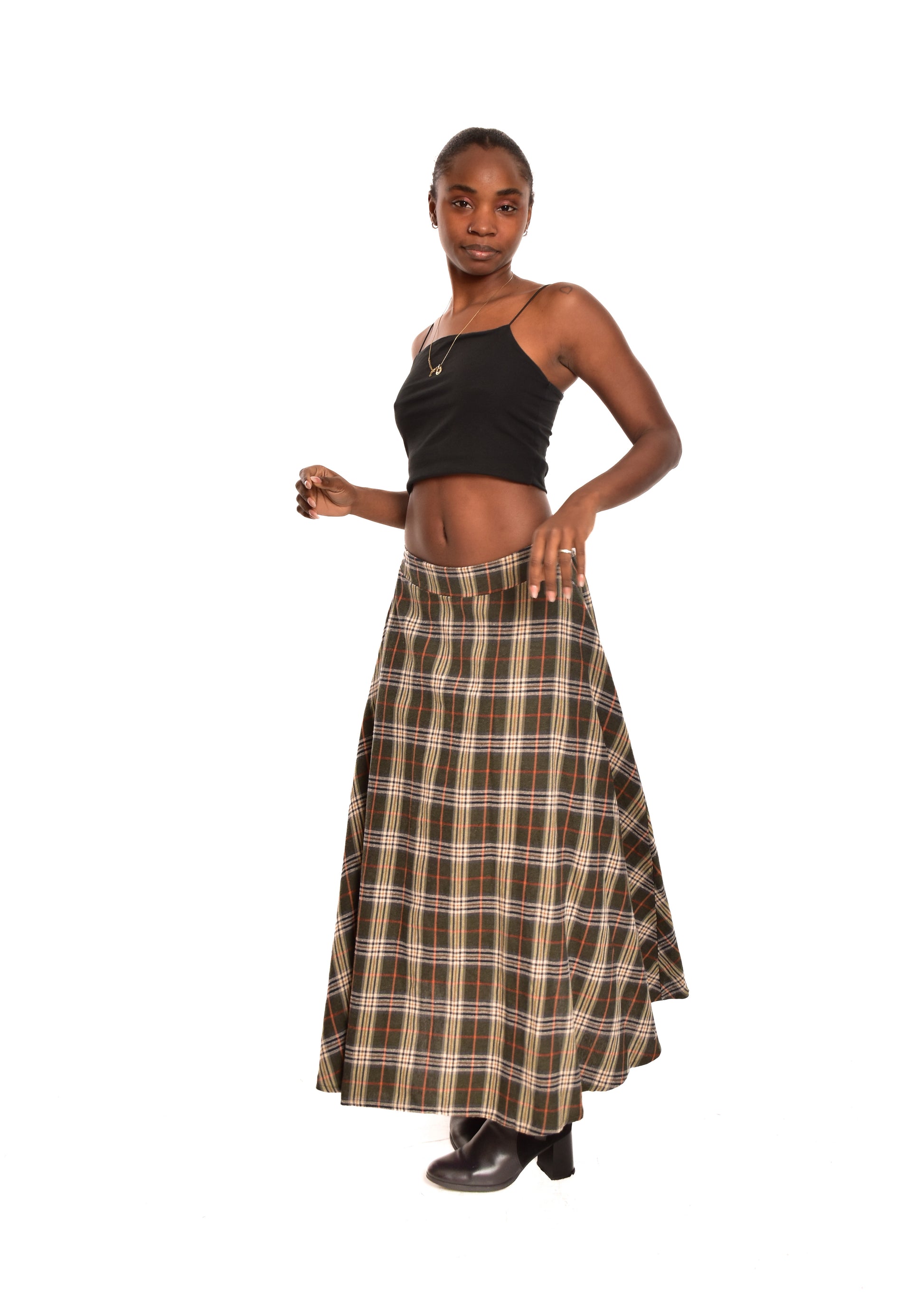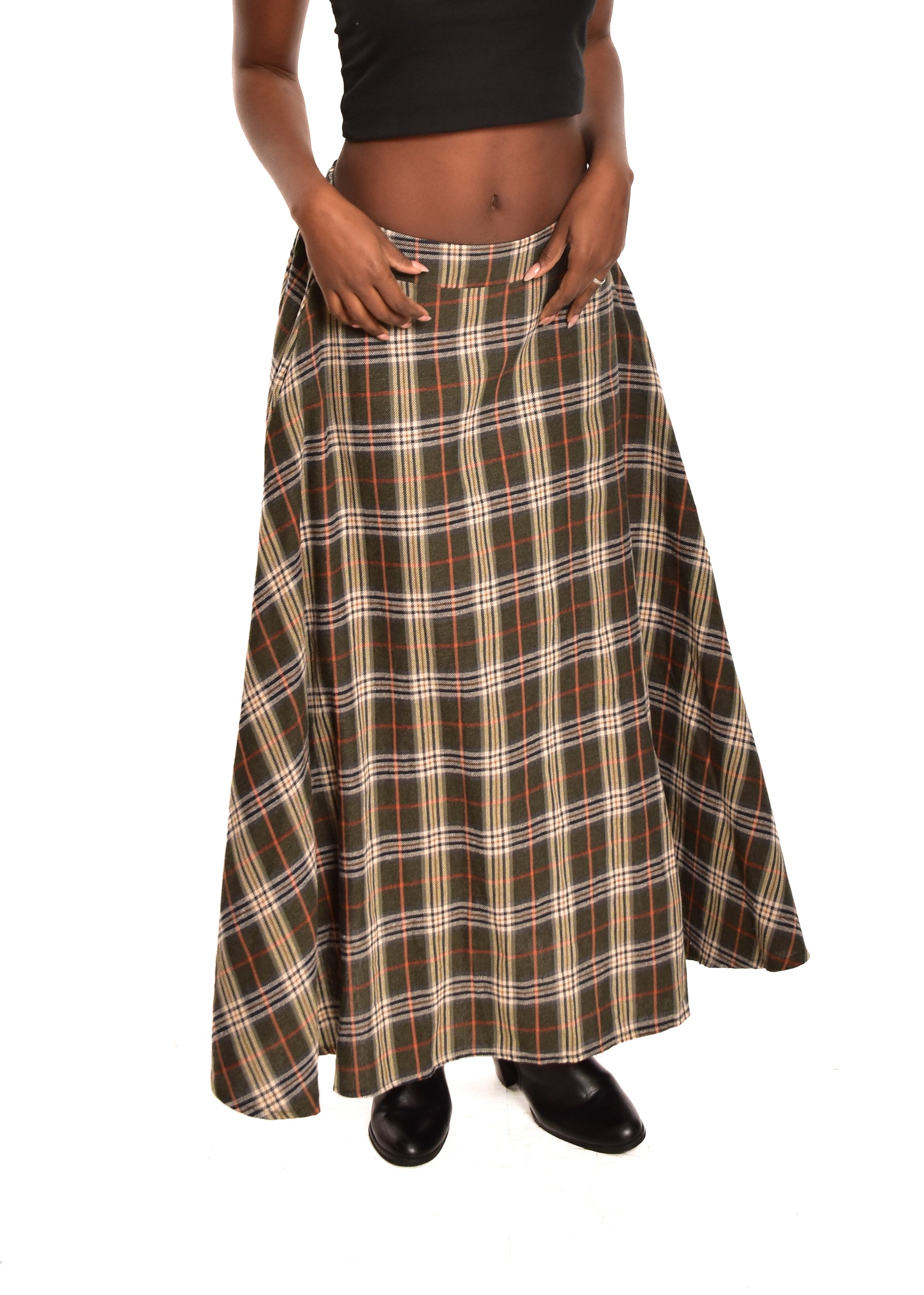 Falda larga con estampado de cuadros.Lleva goma en la cintura. Este modelo está disponible en talla única, en este caso es apto de una 38 a una 42.