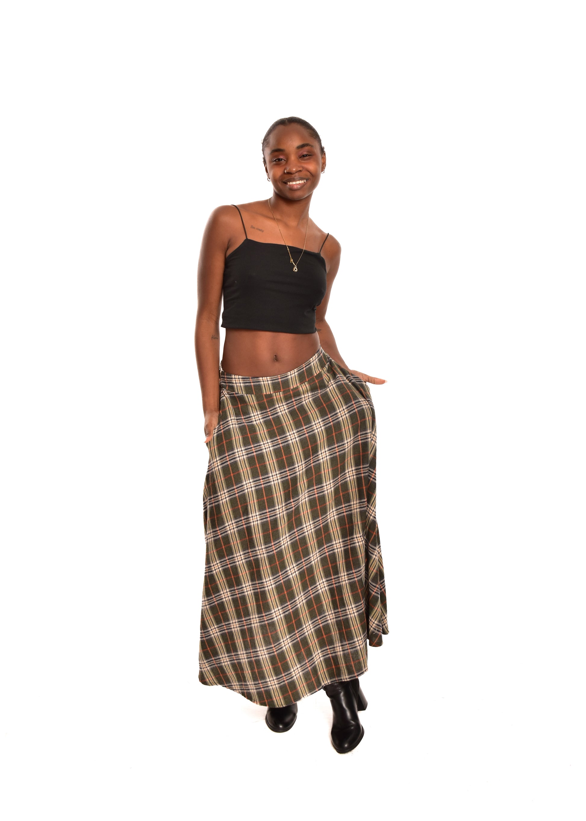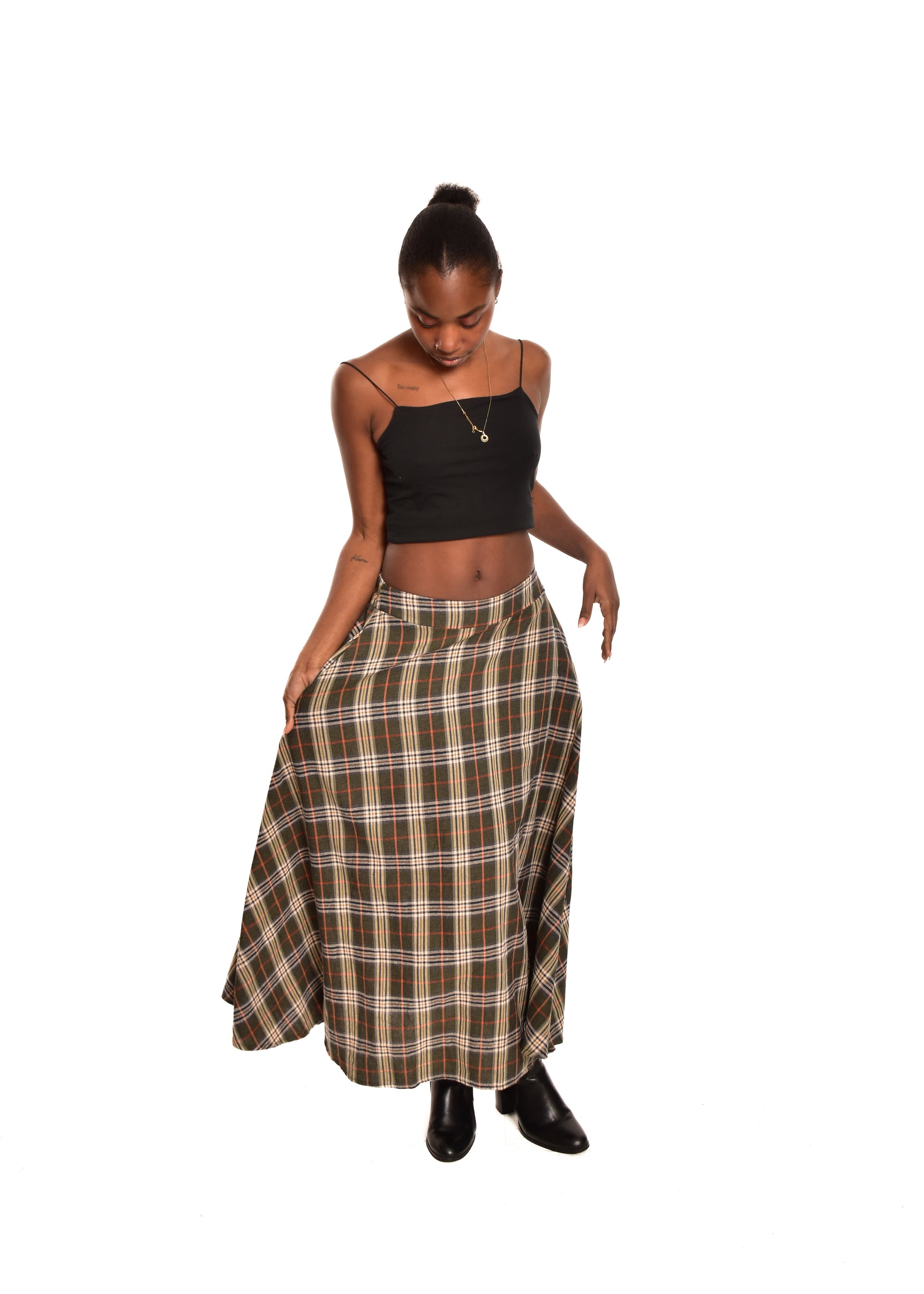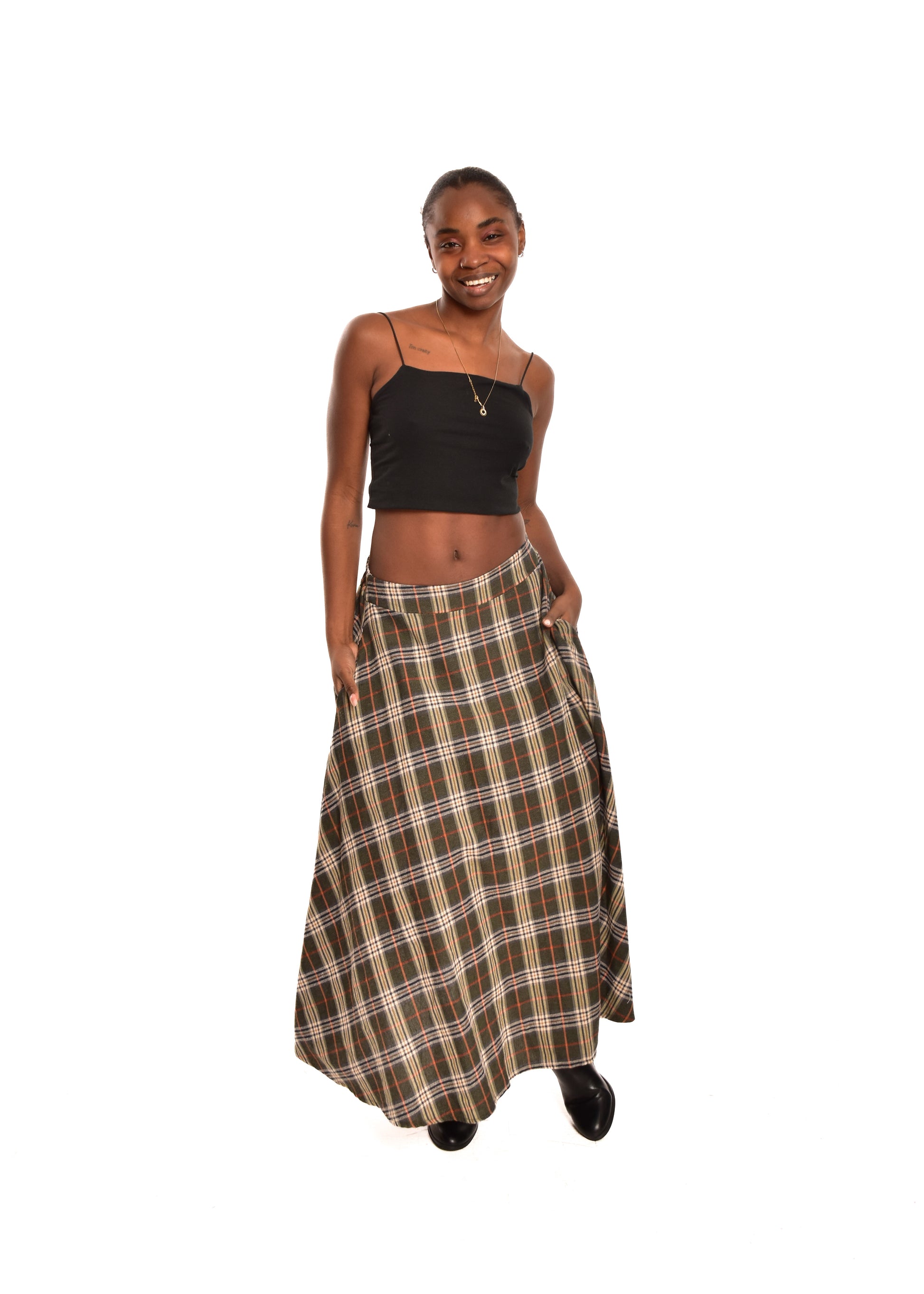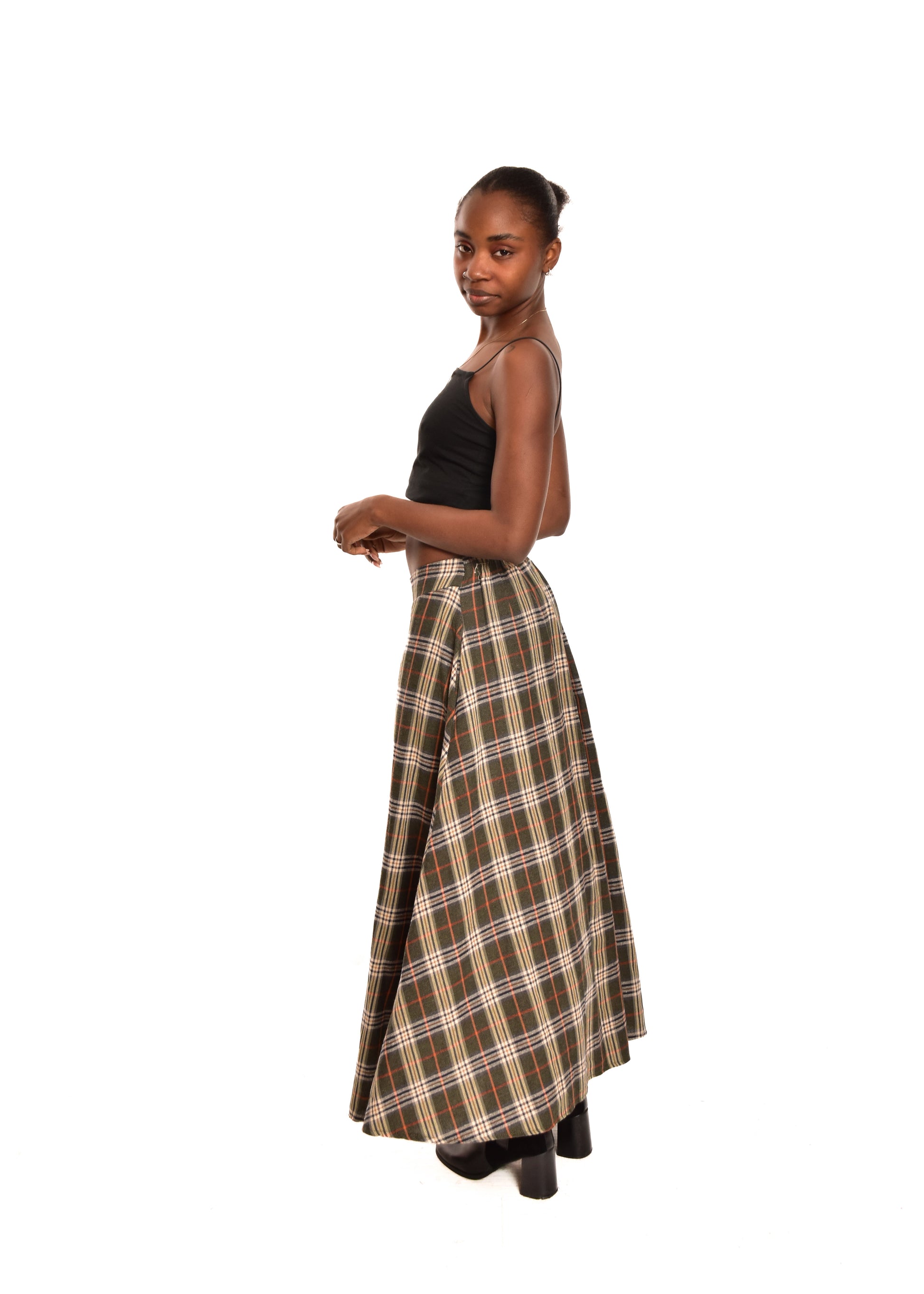 Falda larga con estampado de cuadros.Lleva goma en la cintura. Este modelo está disponible en talla única, en este caso es apto de una 38 a una 42.