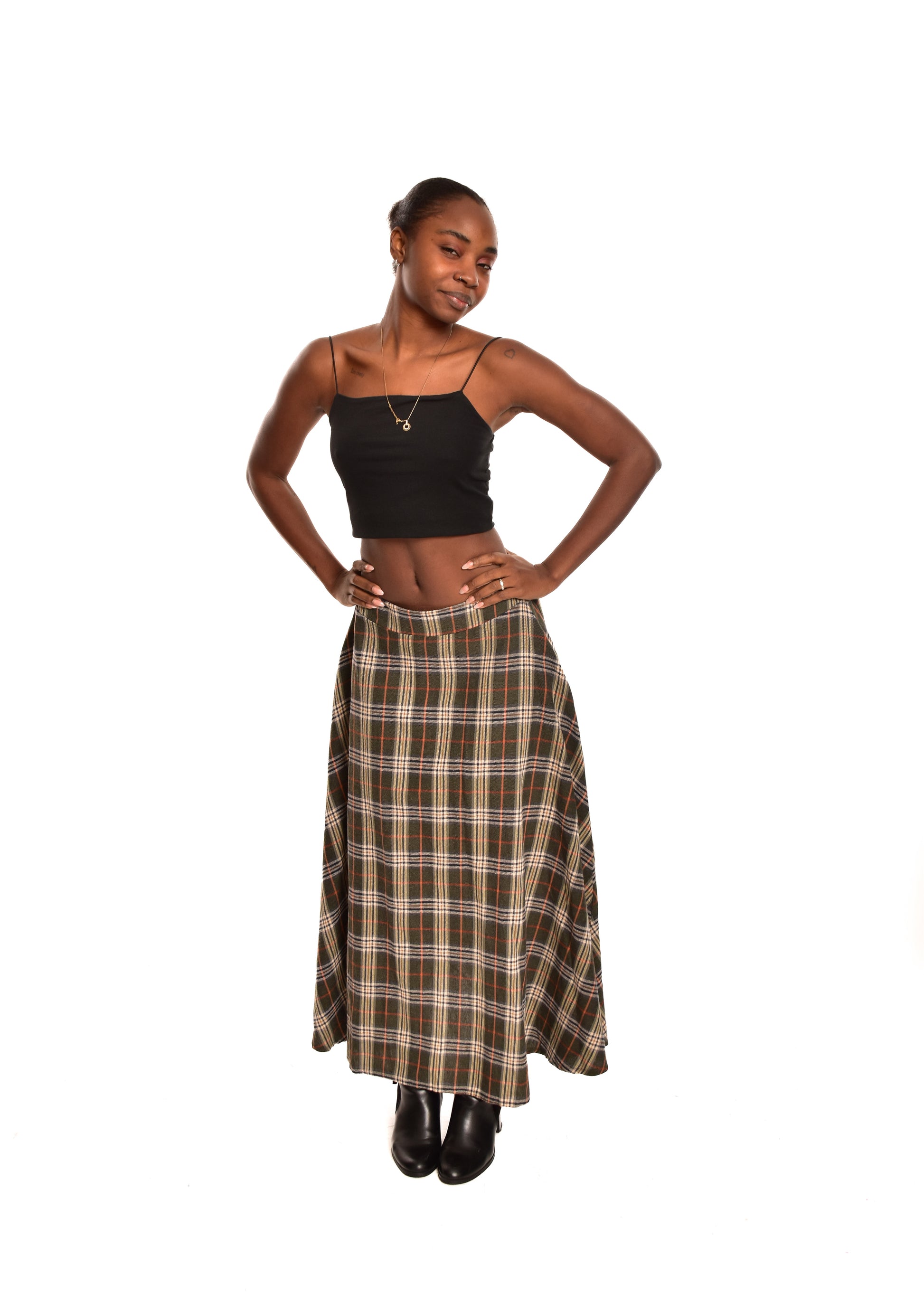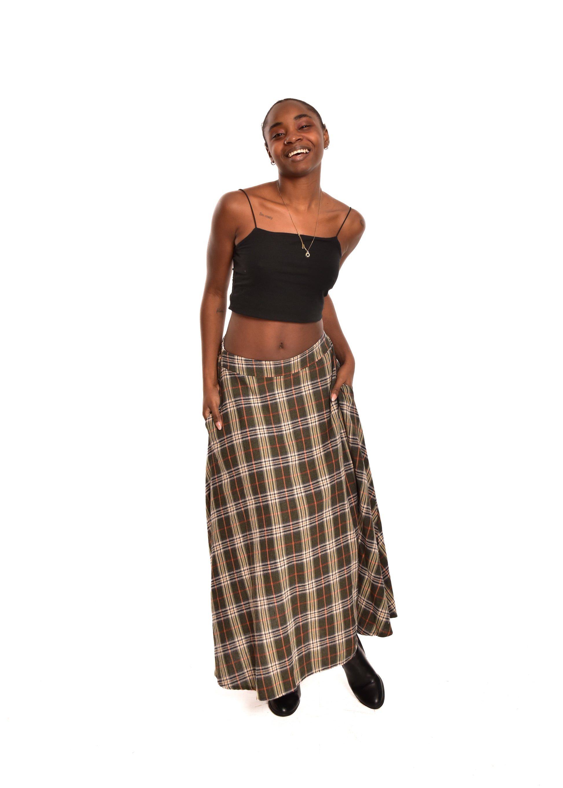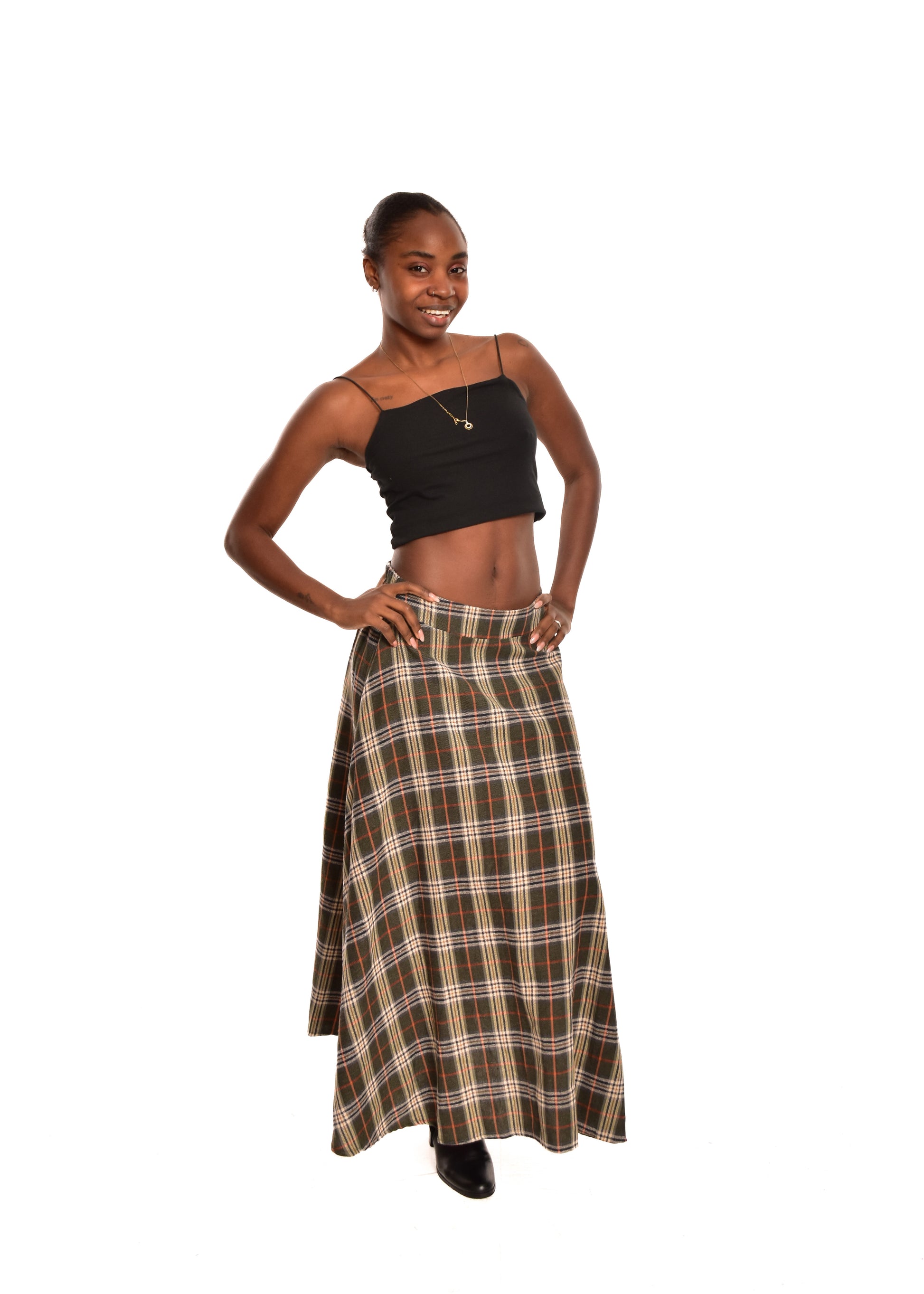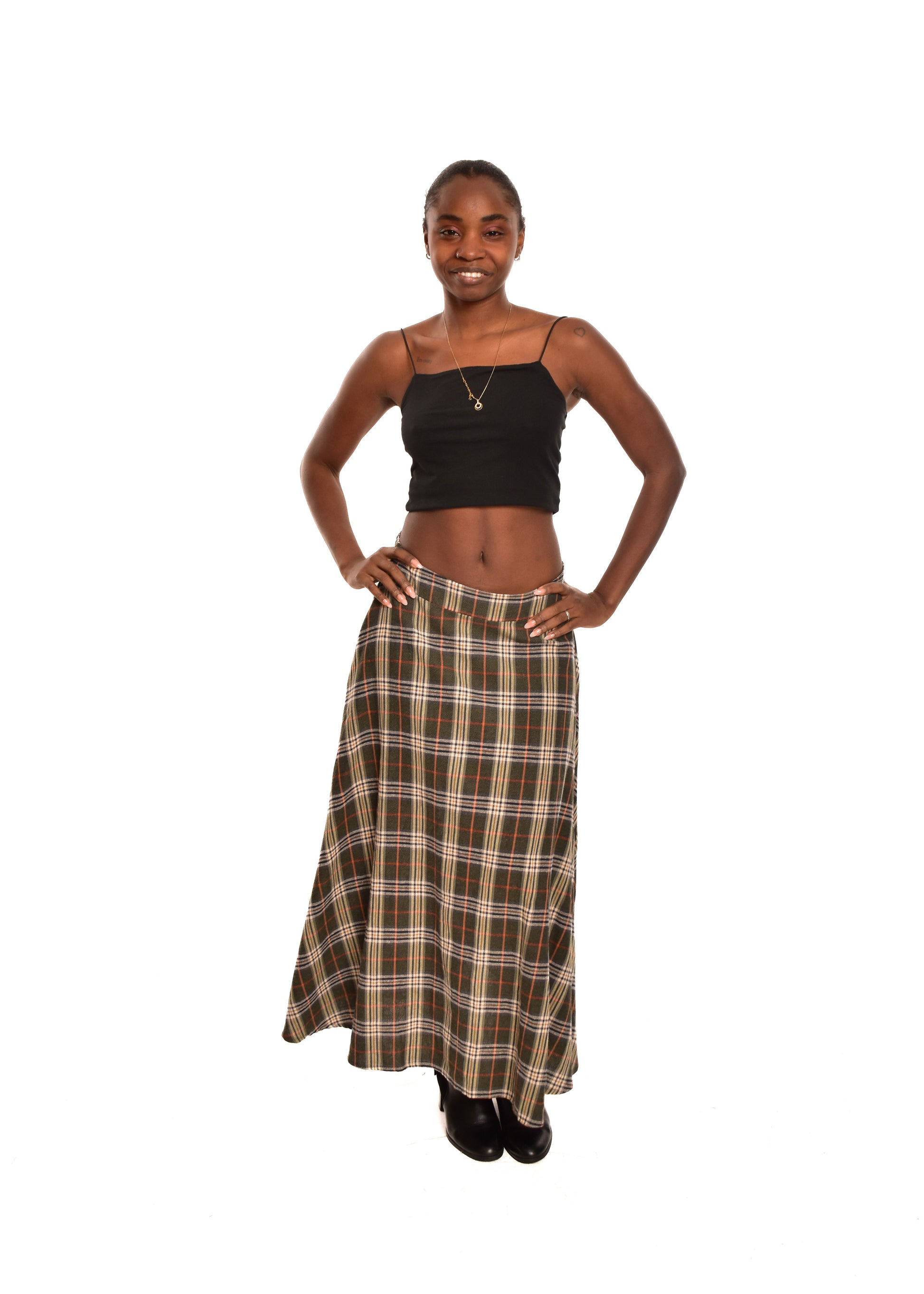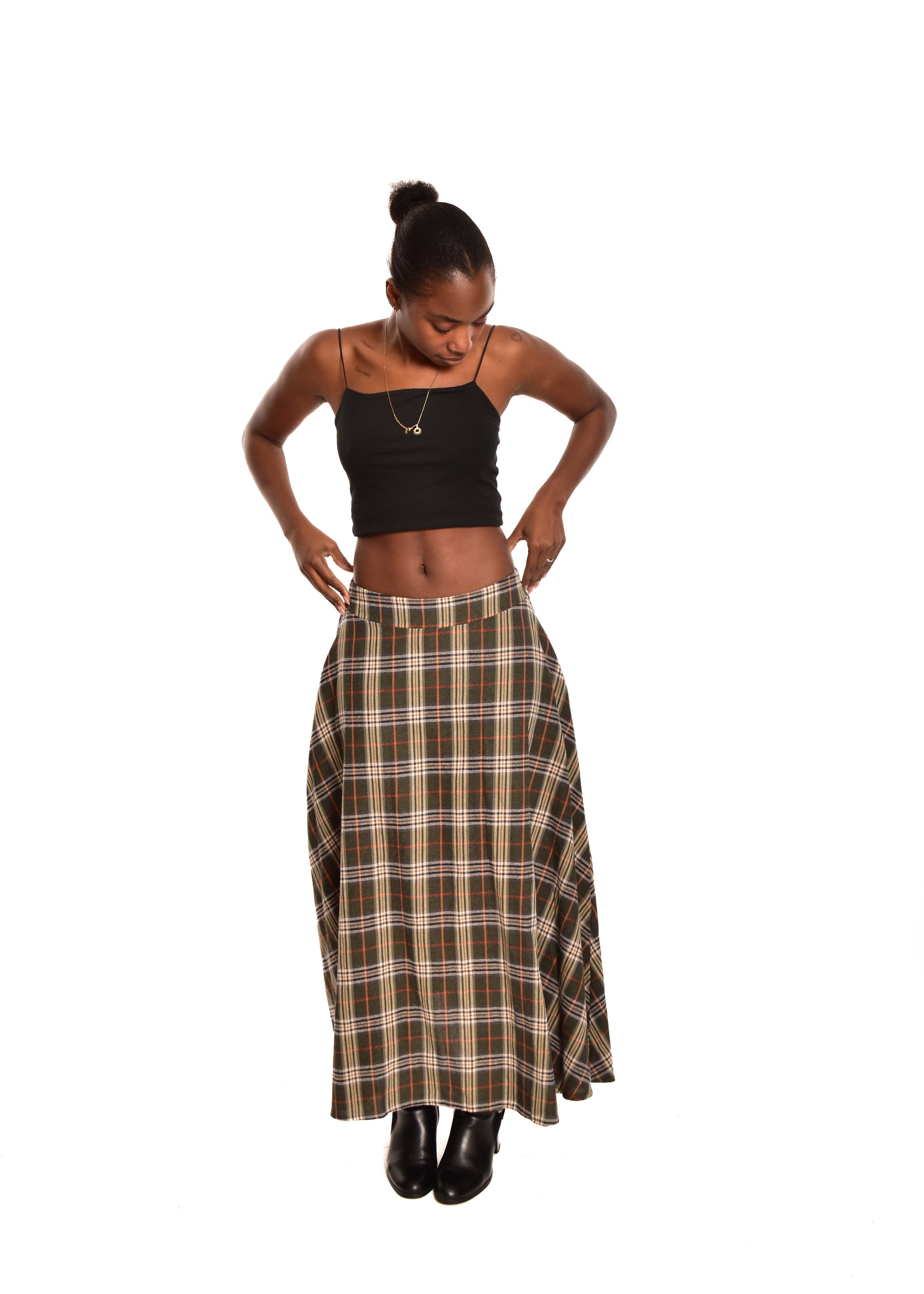 Falda larga con estampado de cuadros.Lleva goma en la cintura. Este modelo está disponible en talla única, en este caso es apto de una 38 a una 42.