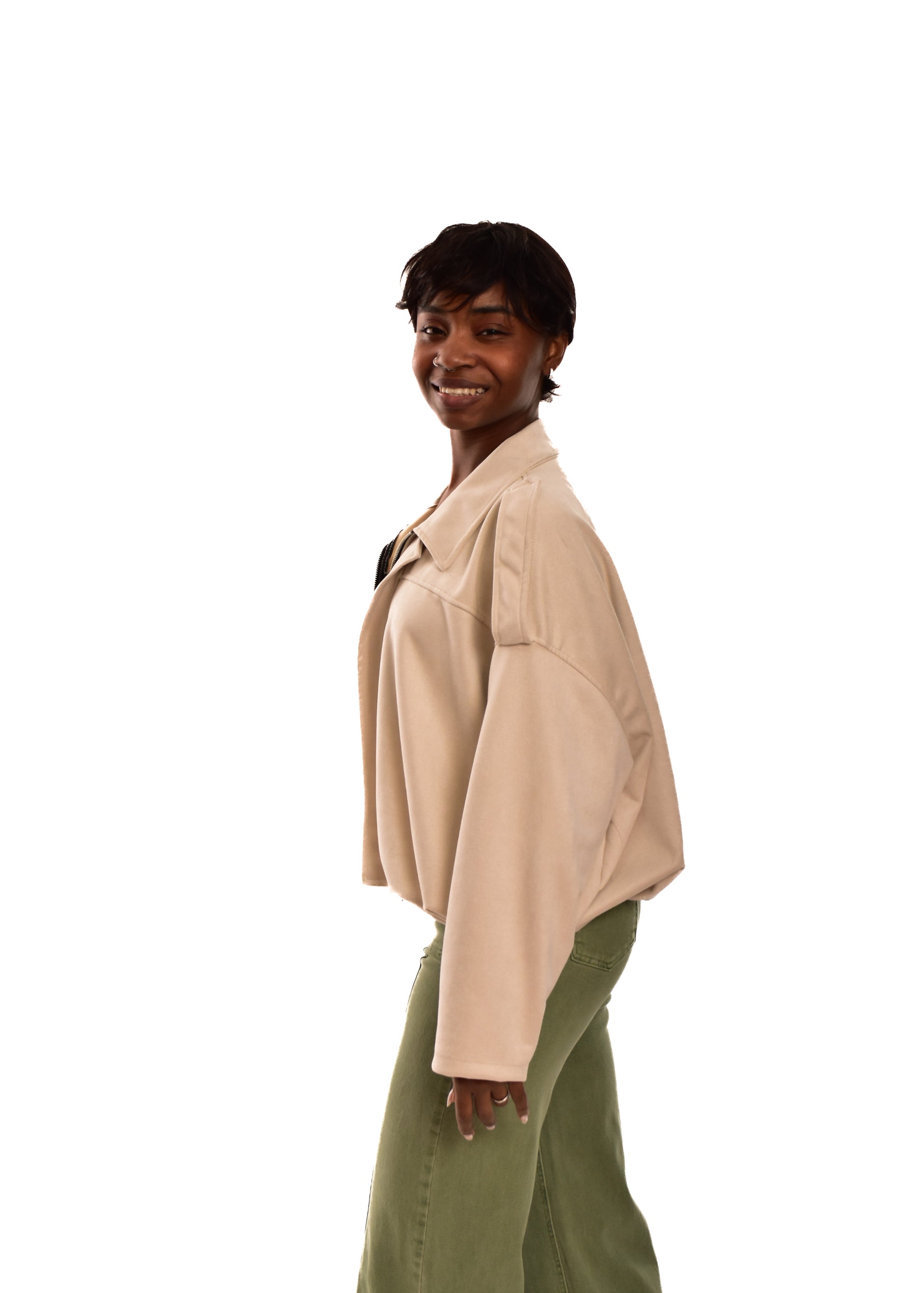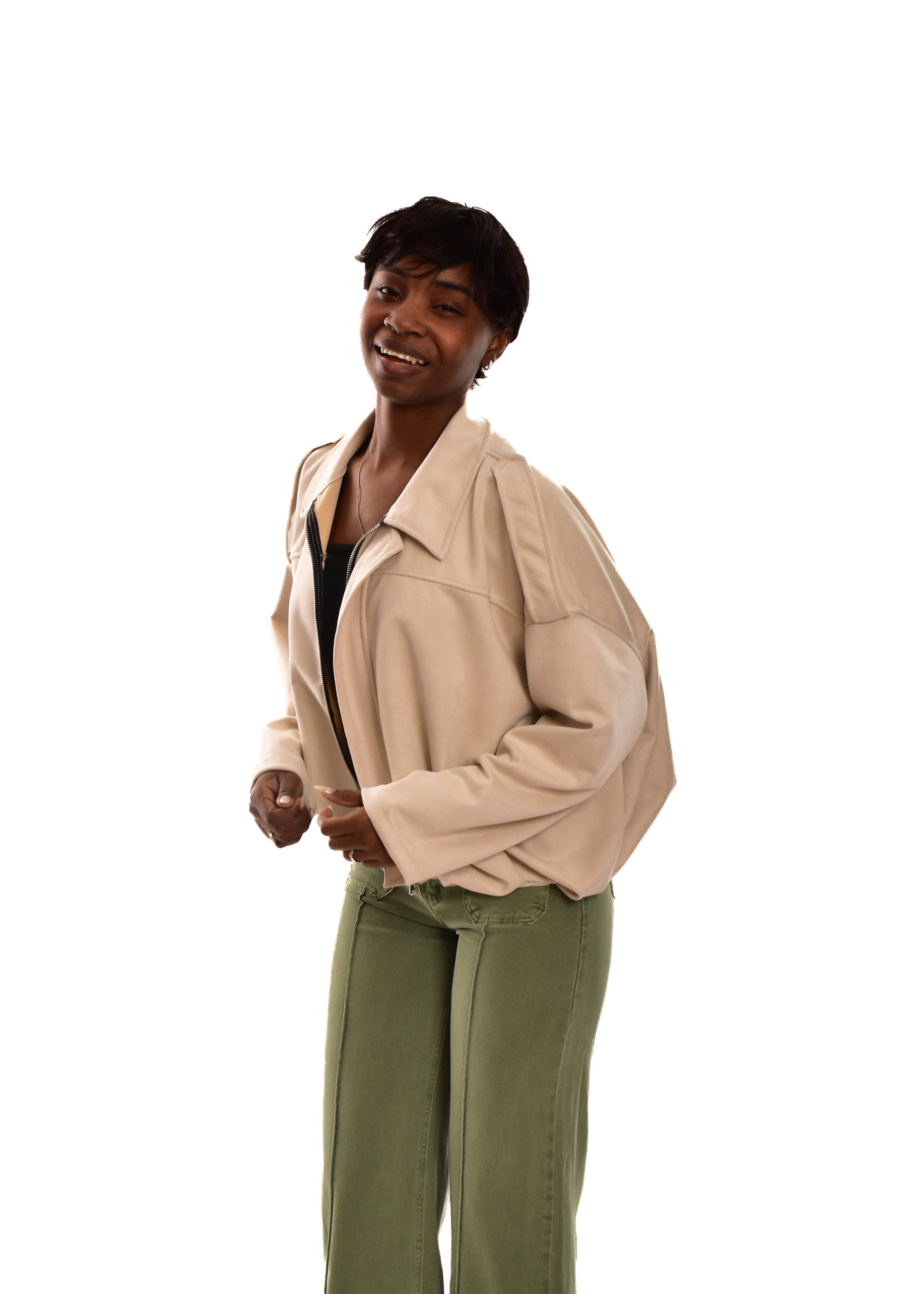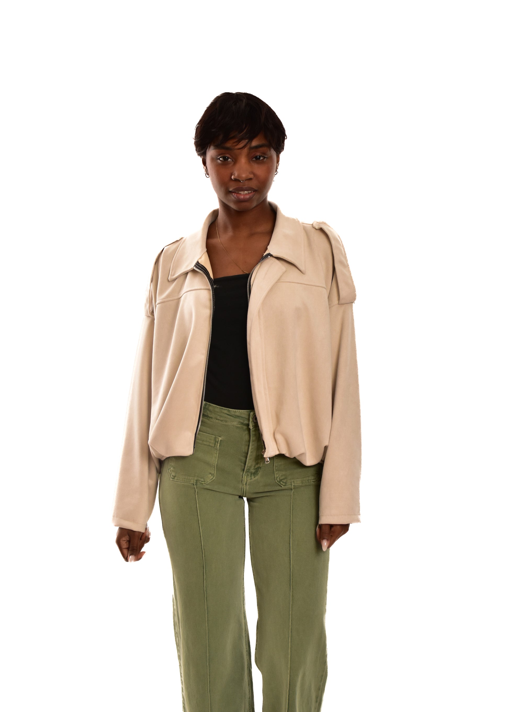 Bomber de antelina Cremallera central. Esta prenda está disponible en talla única, en este caso es apto hasta una talla 42.