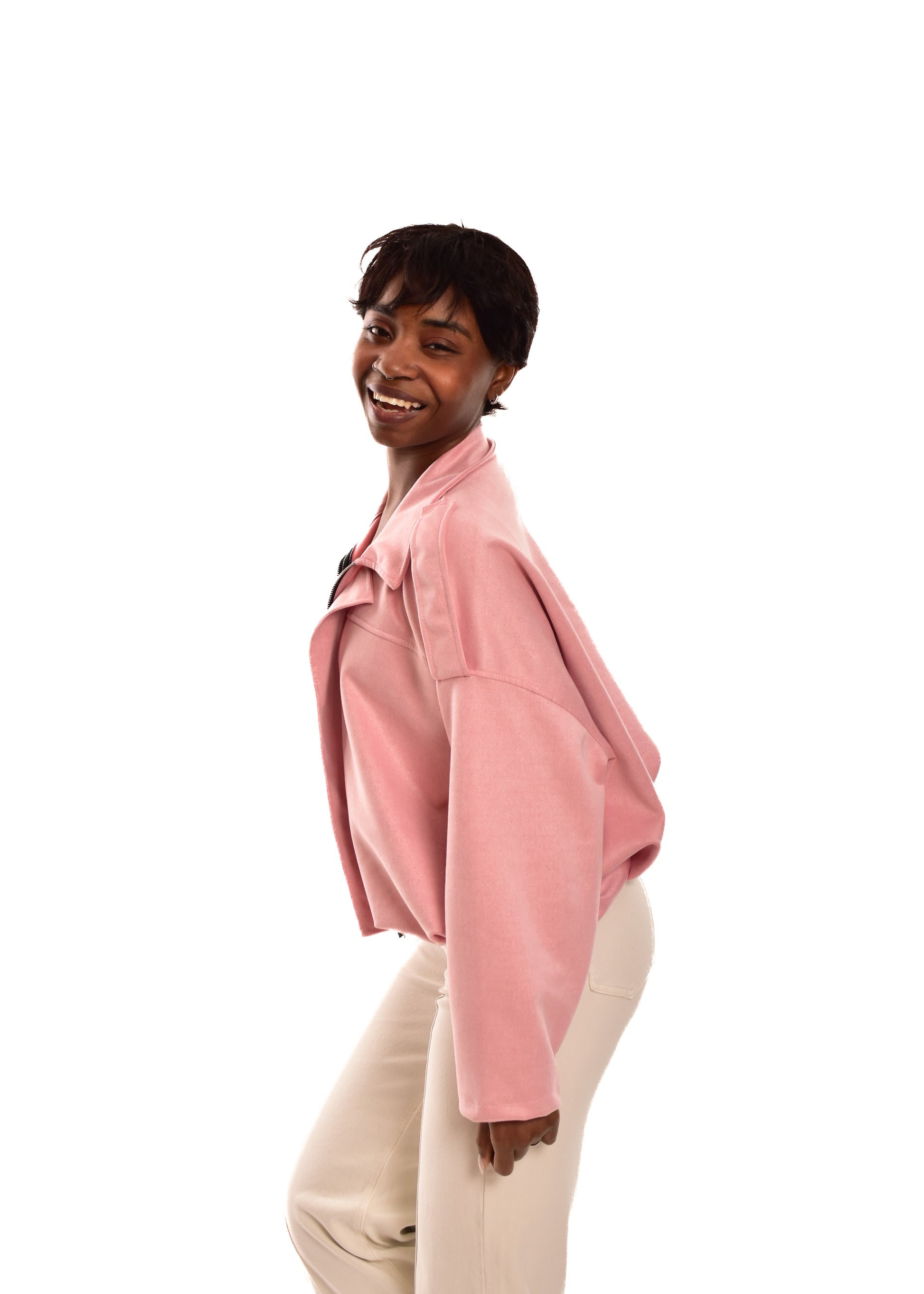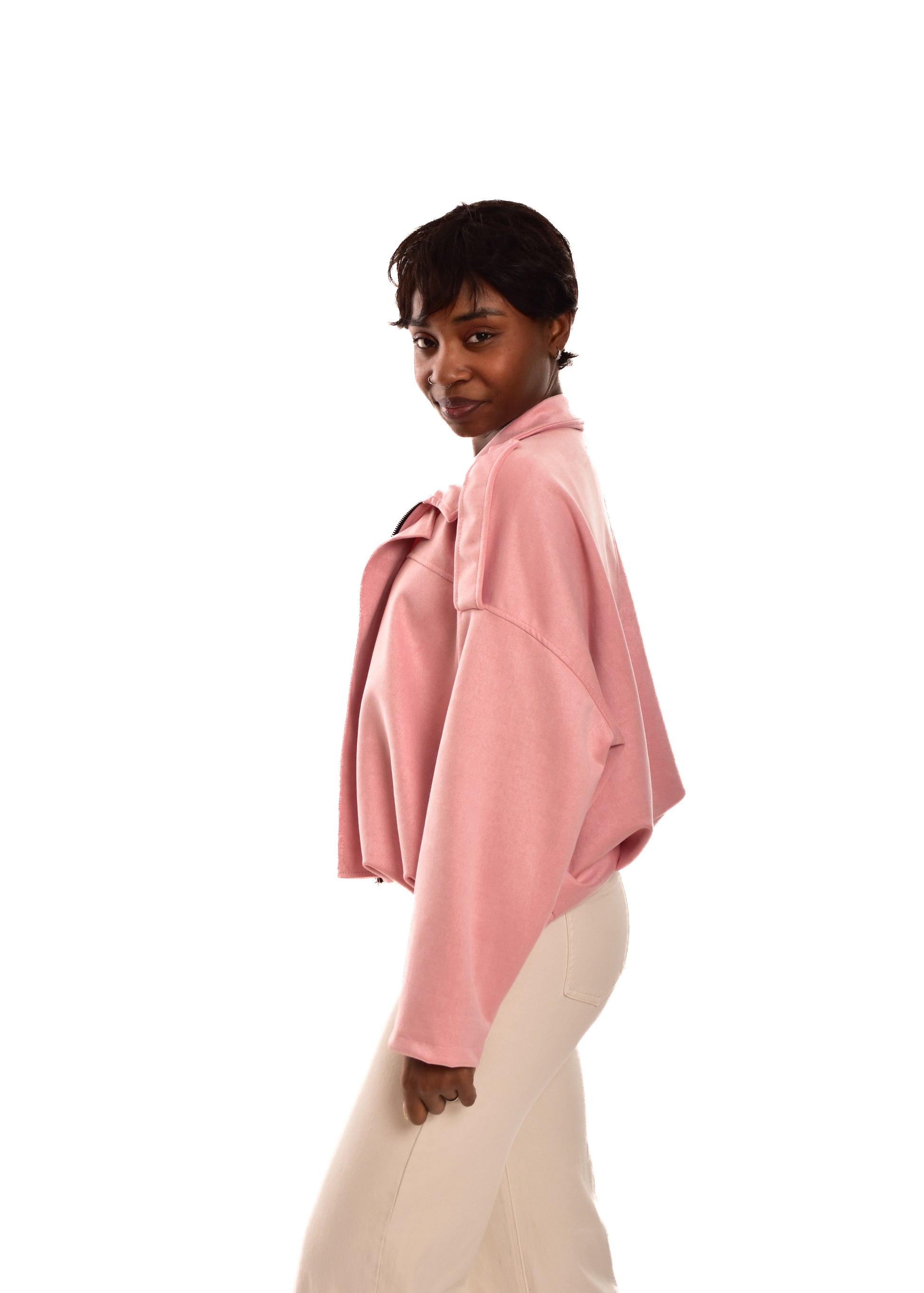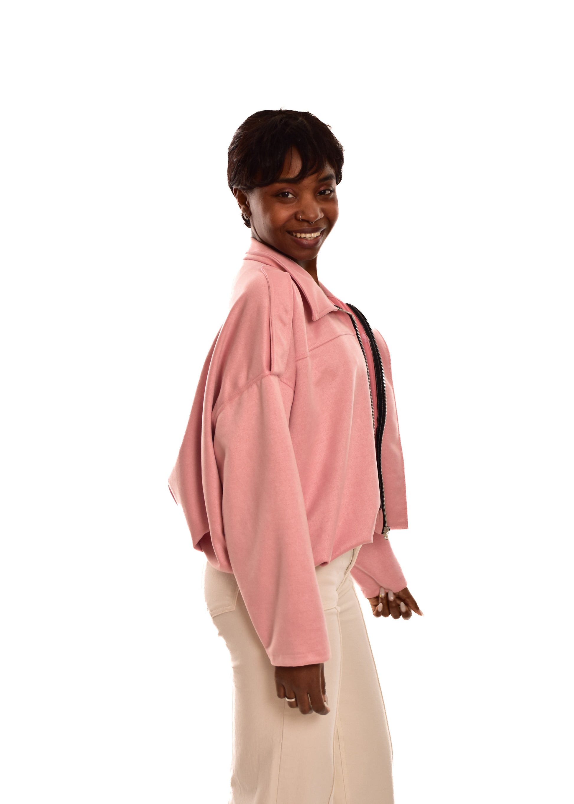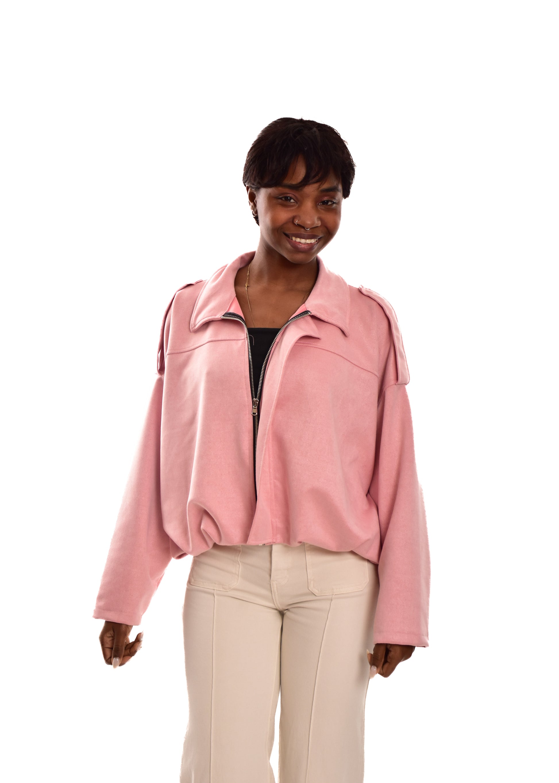 Bomber de antelina Cremallera central. Esta prenda está disponible en talla única, en este caso es apto hasta una talla 42.