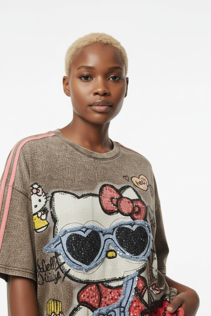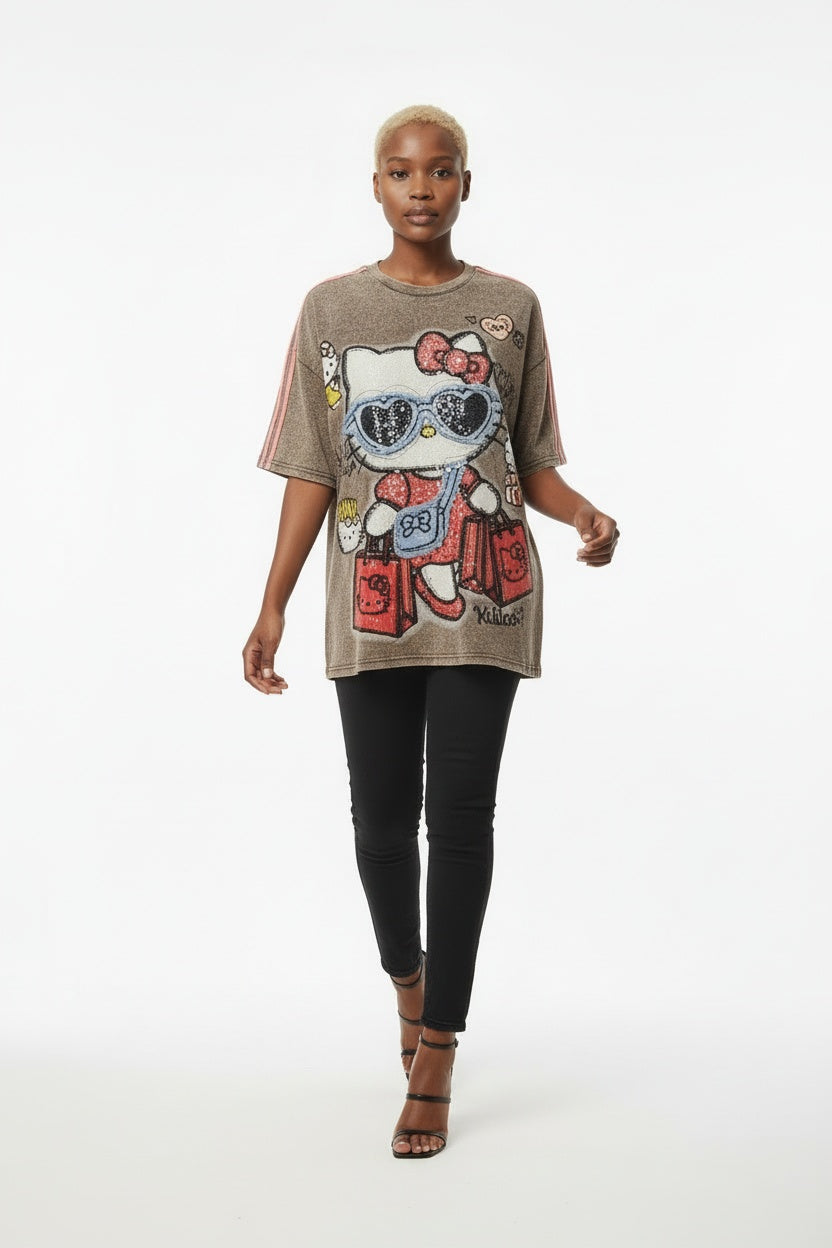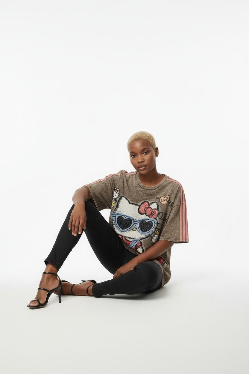 Camiseta en tejido de algodón 85%. Escote redondeado. Detalles en brillo. Este modelo está disponible en talla única, en este caso es apto hasta una 44.