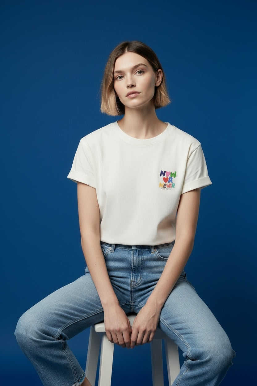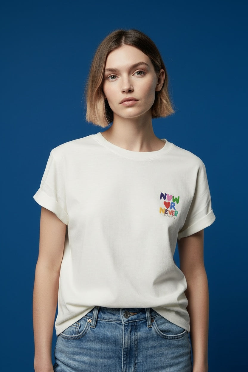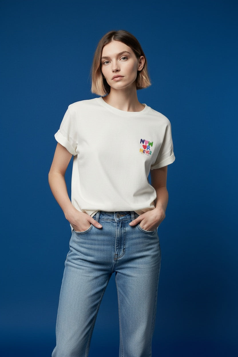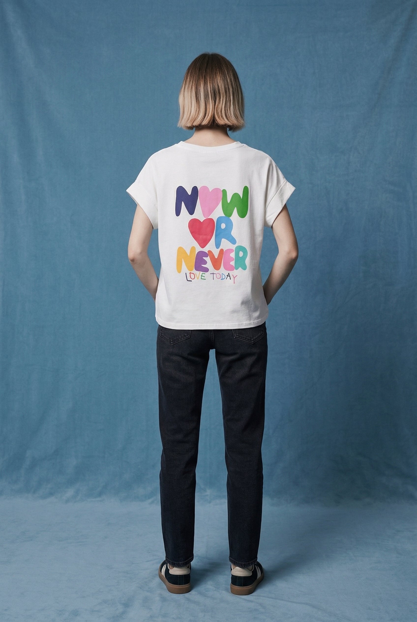 Camiseta en tejido de algodón. Selligrafía delantera. Efecto desgastado.Este modelo está disponible en talla única, en este caso es apto hasta una 42.