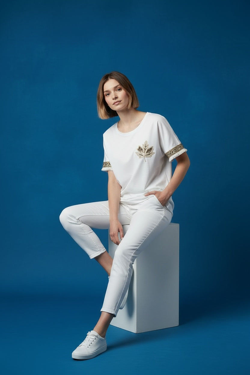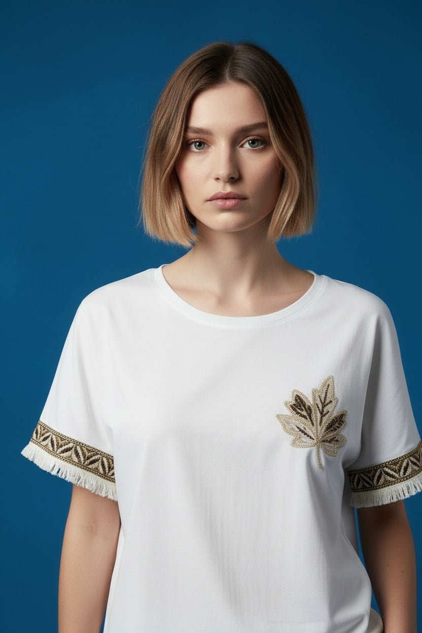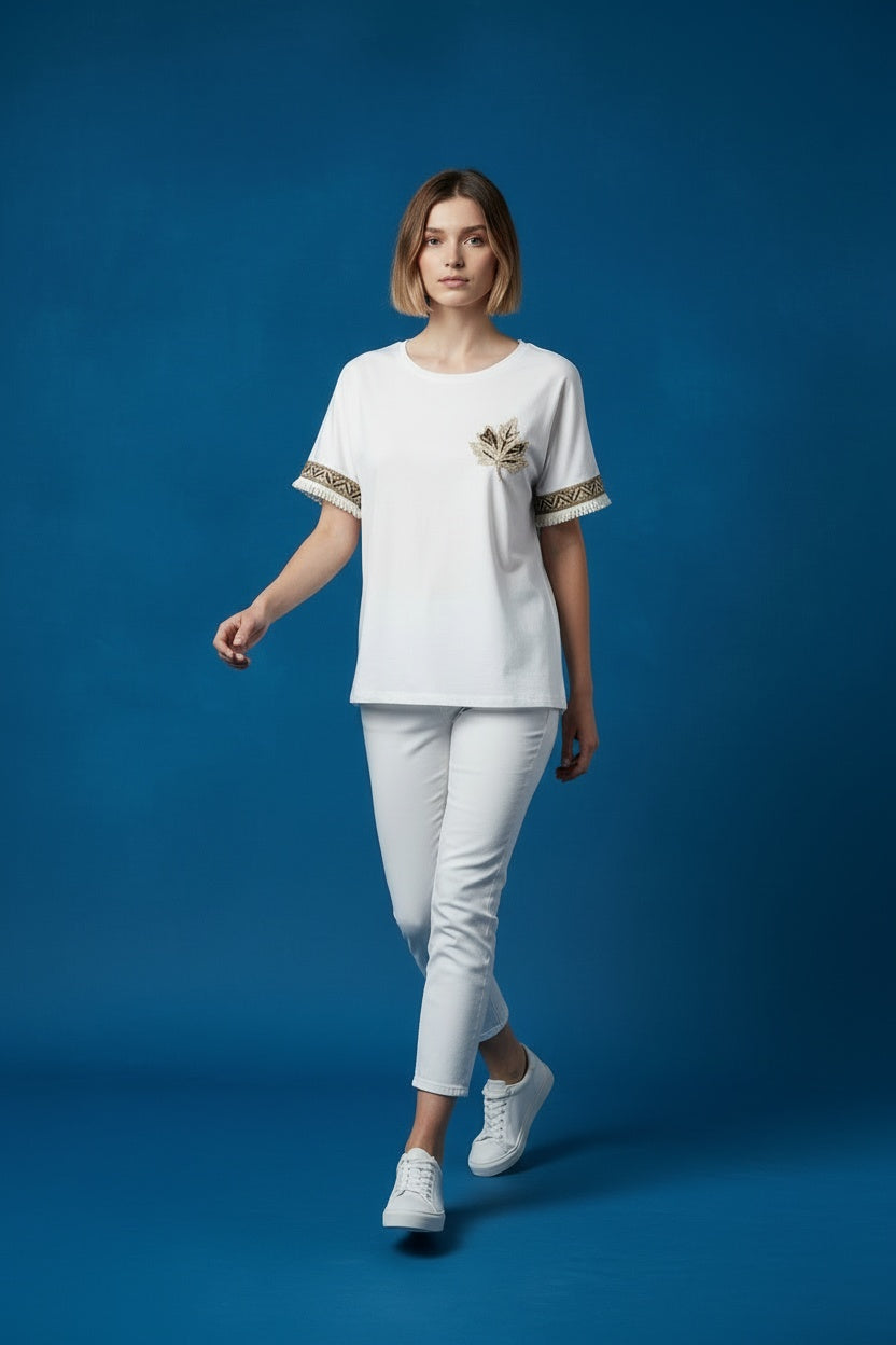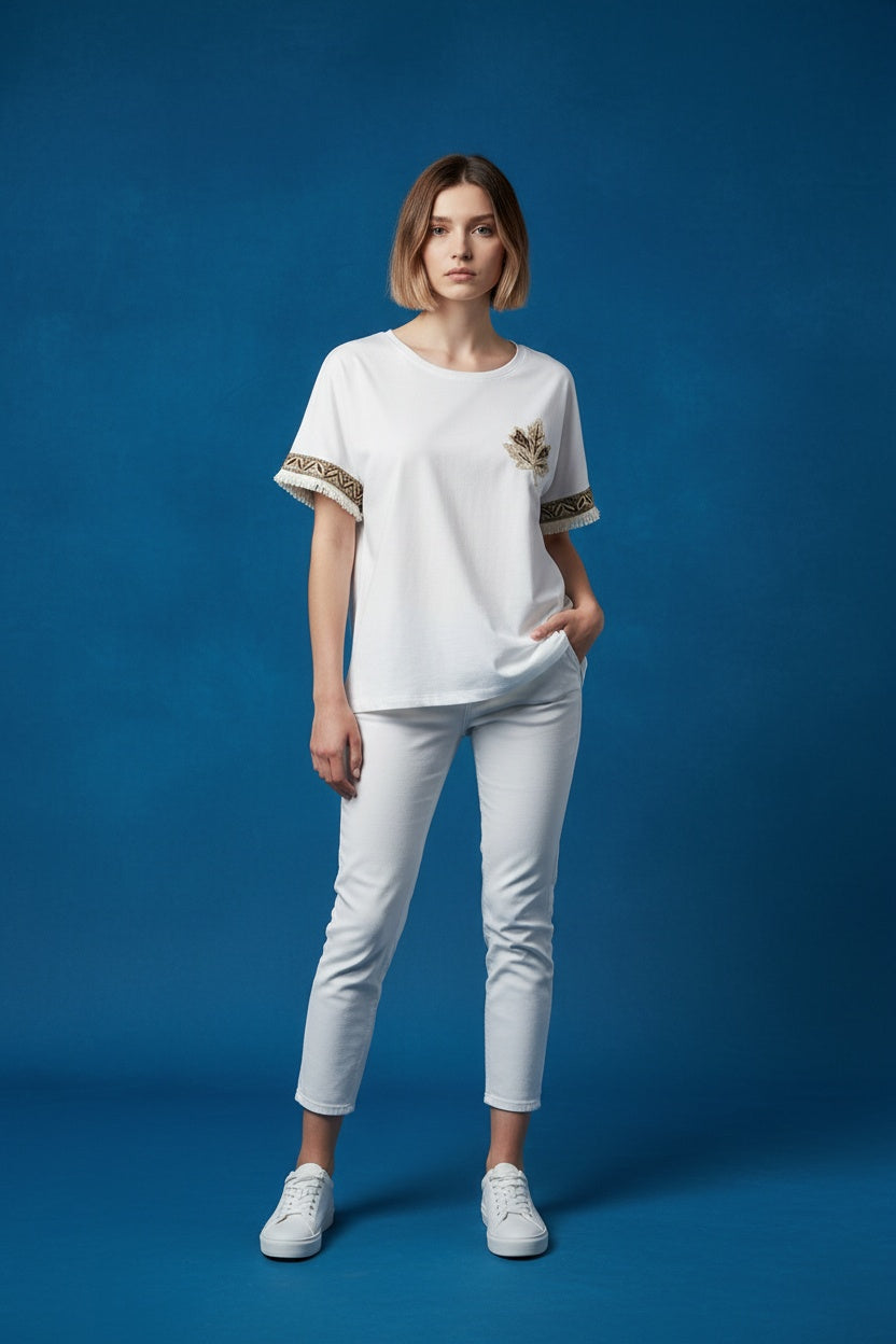 Camiseta en tejido de algodón 95%. Escote redondeado. Detalles de flequitos en la manga. Este modelo está disponible en talla única, en este caso es apto hasta una 42.