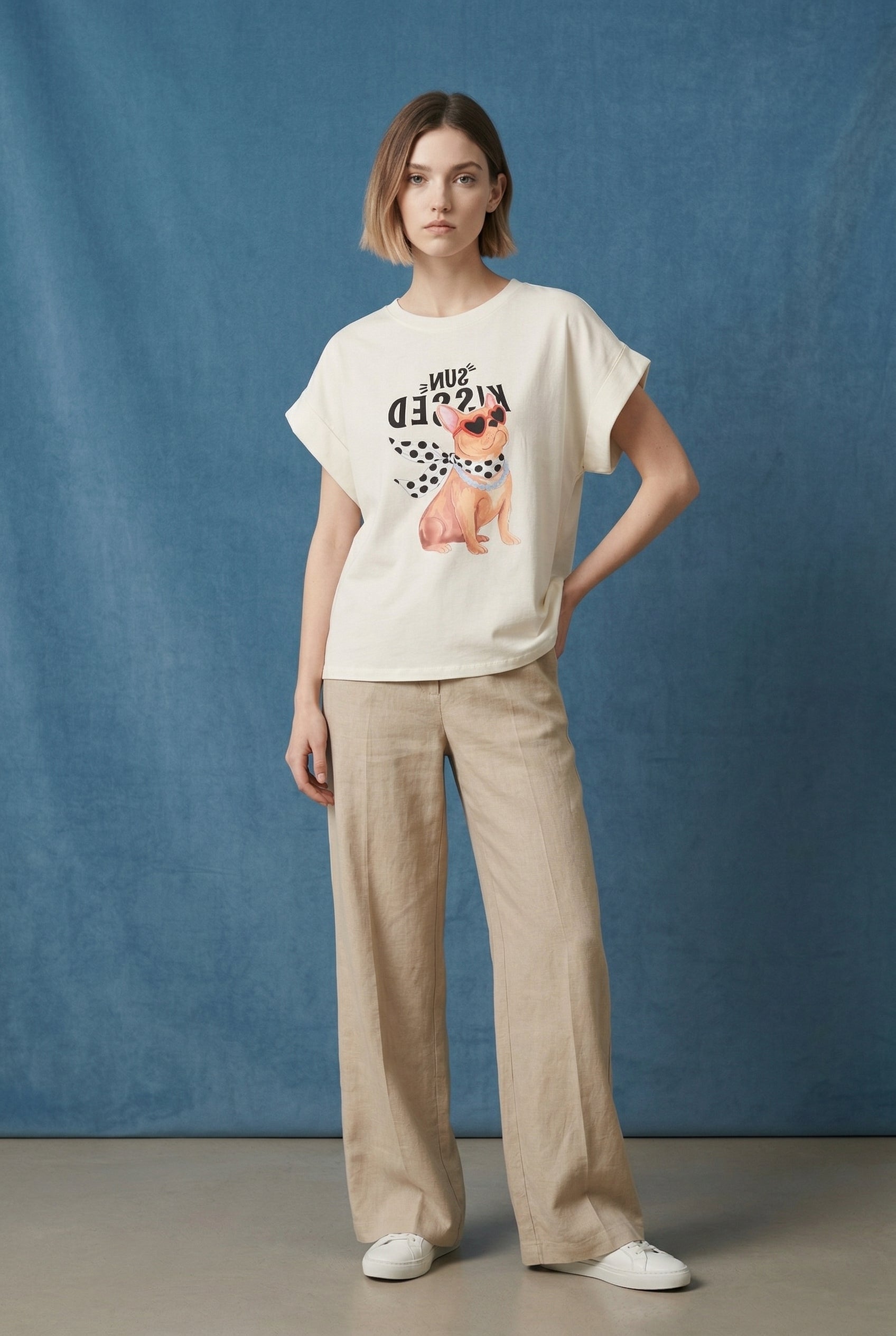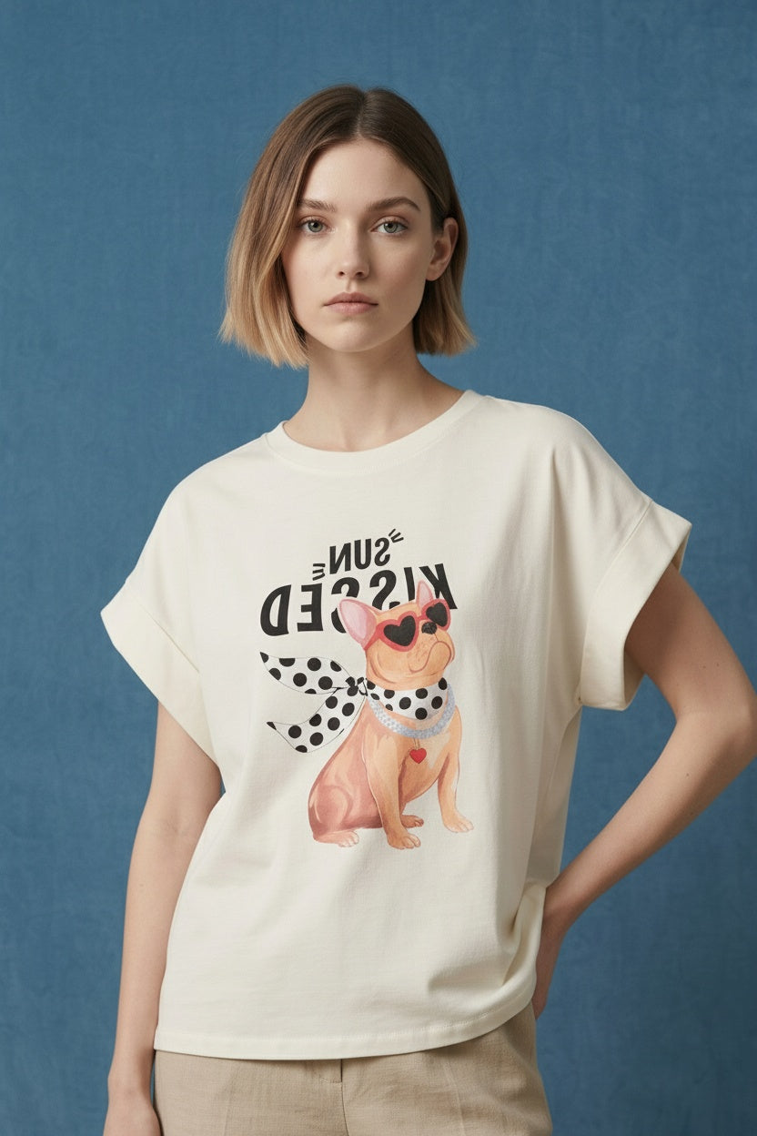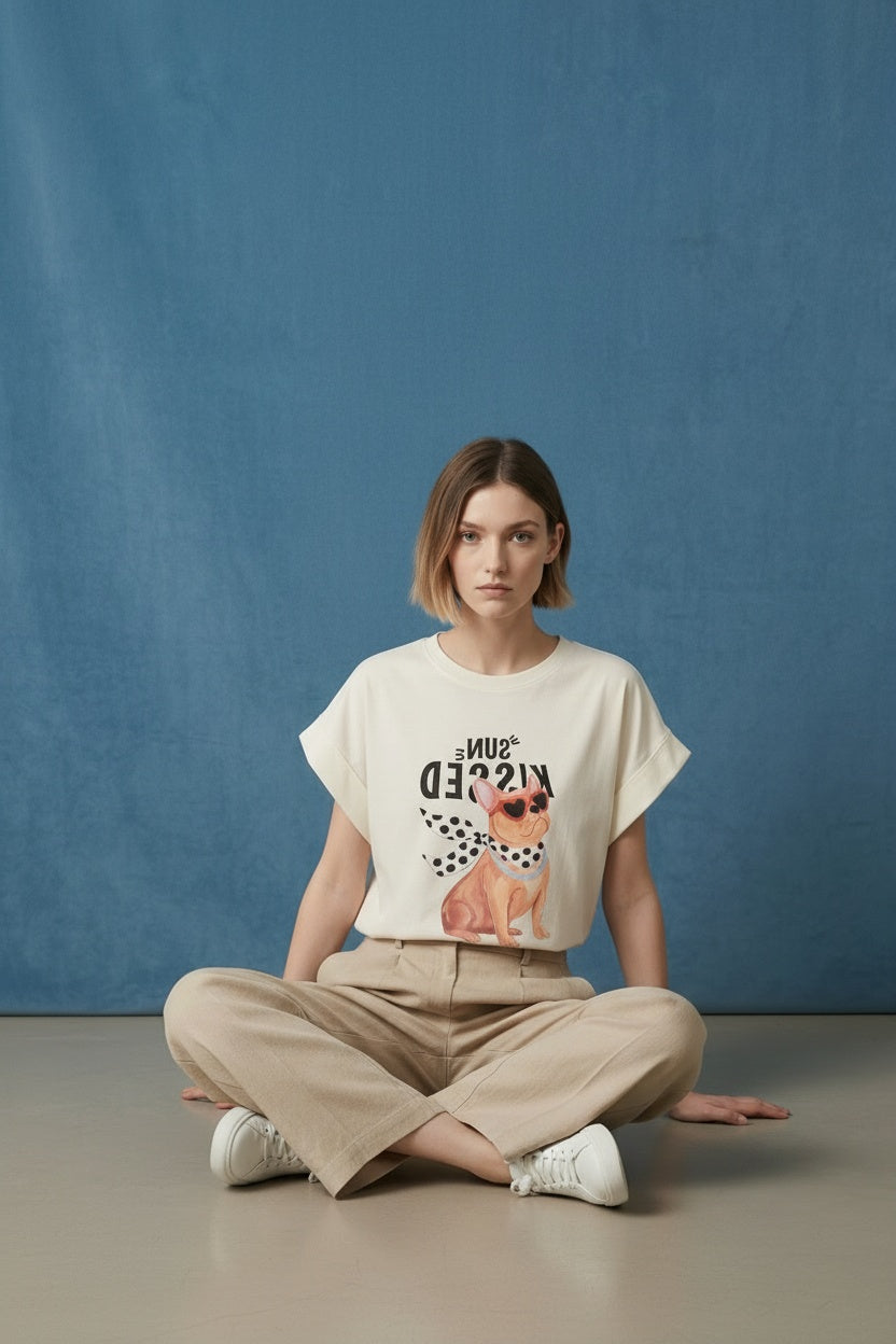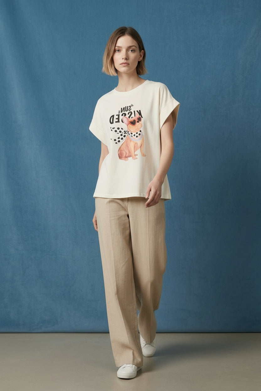 Camiseta en tejido de algodón. Selligrafía delantera. Efecto desgastado.Este modelo está disponible en talla única, en este caso es apto hasta una 42.
