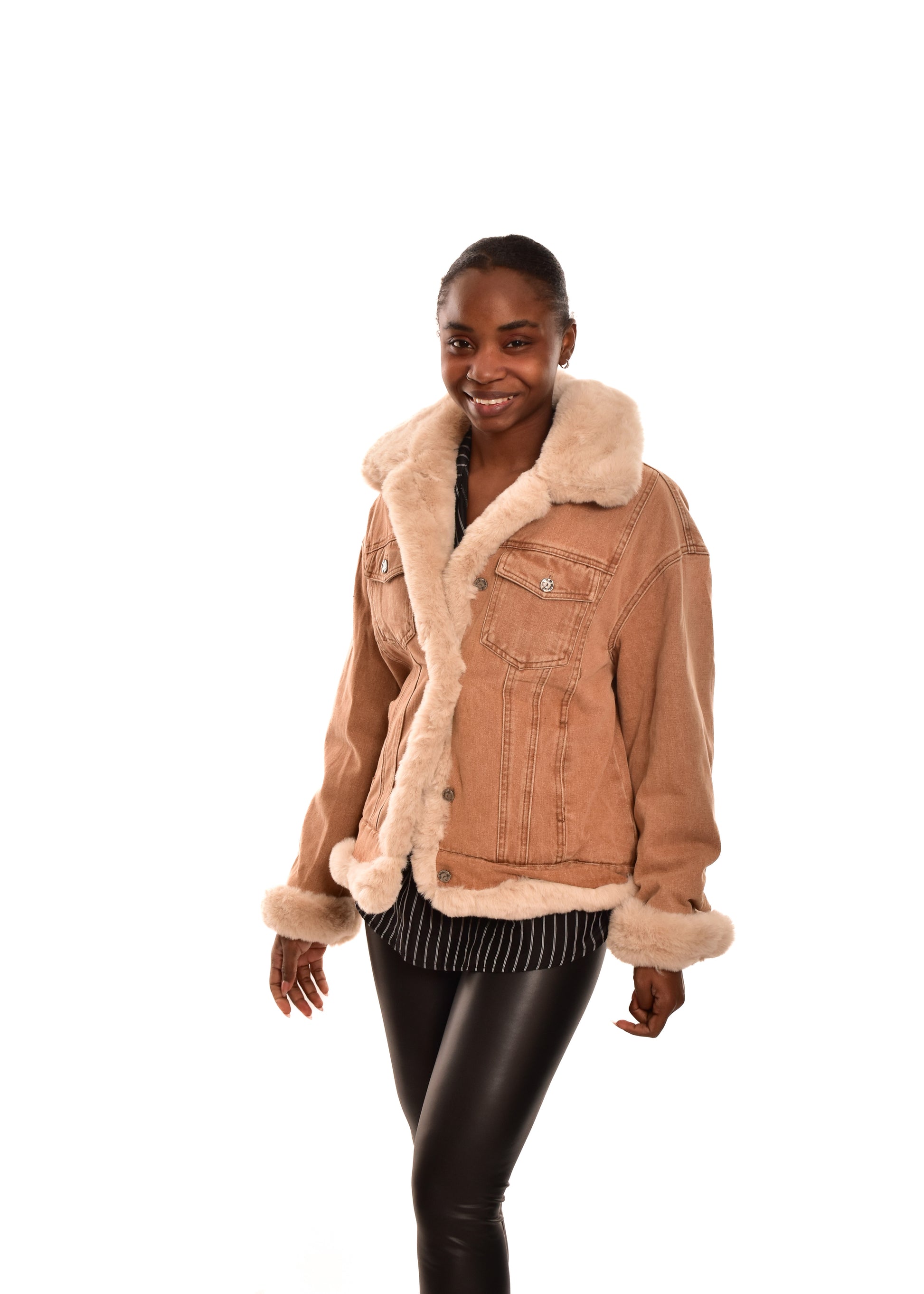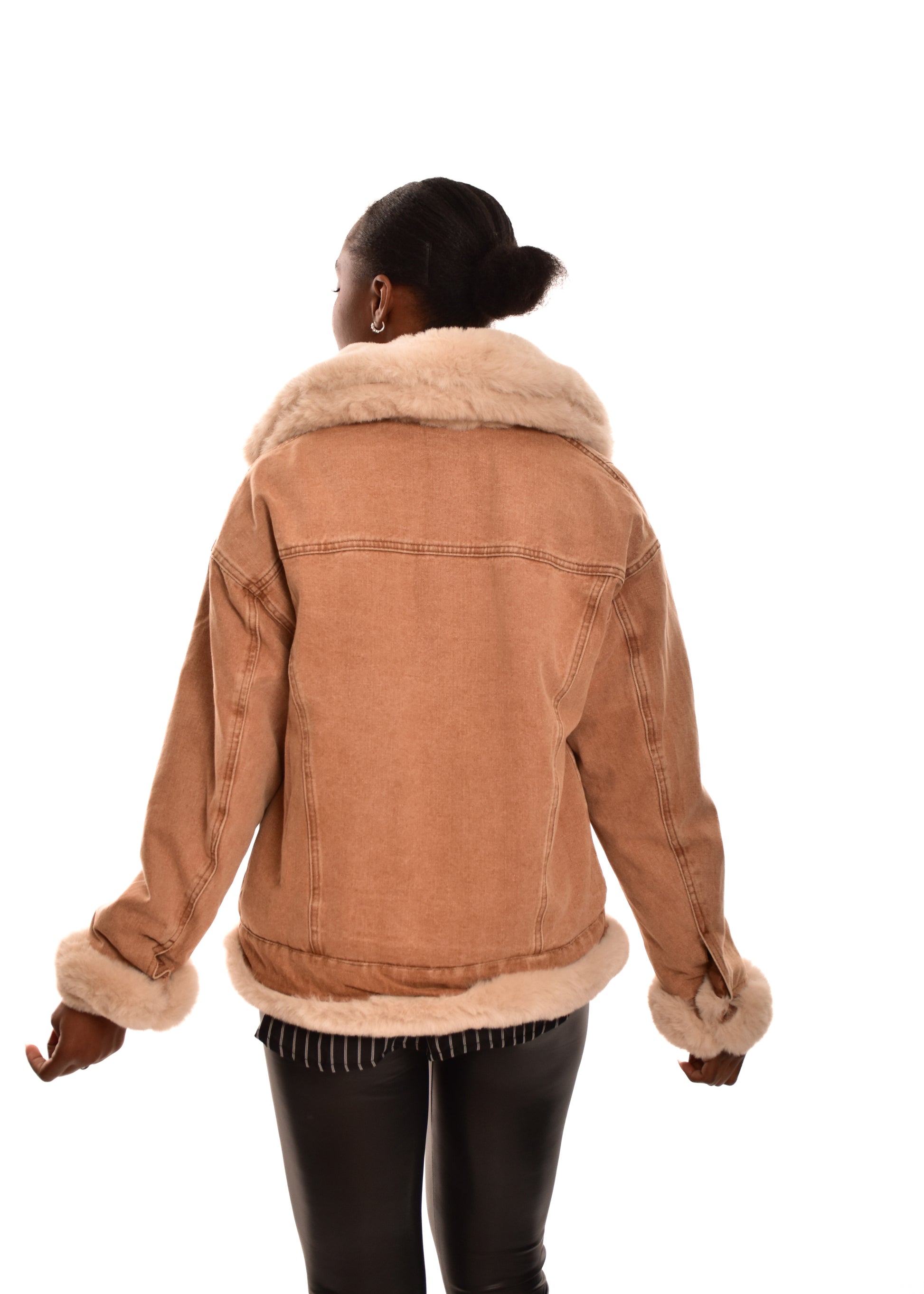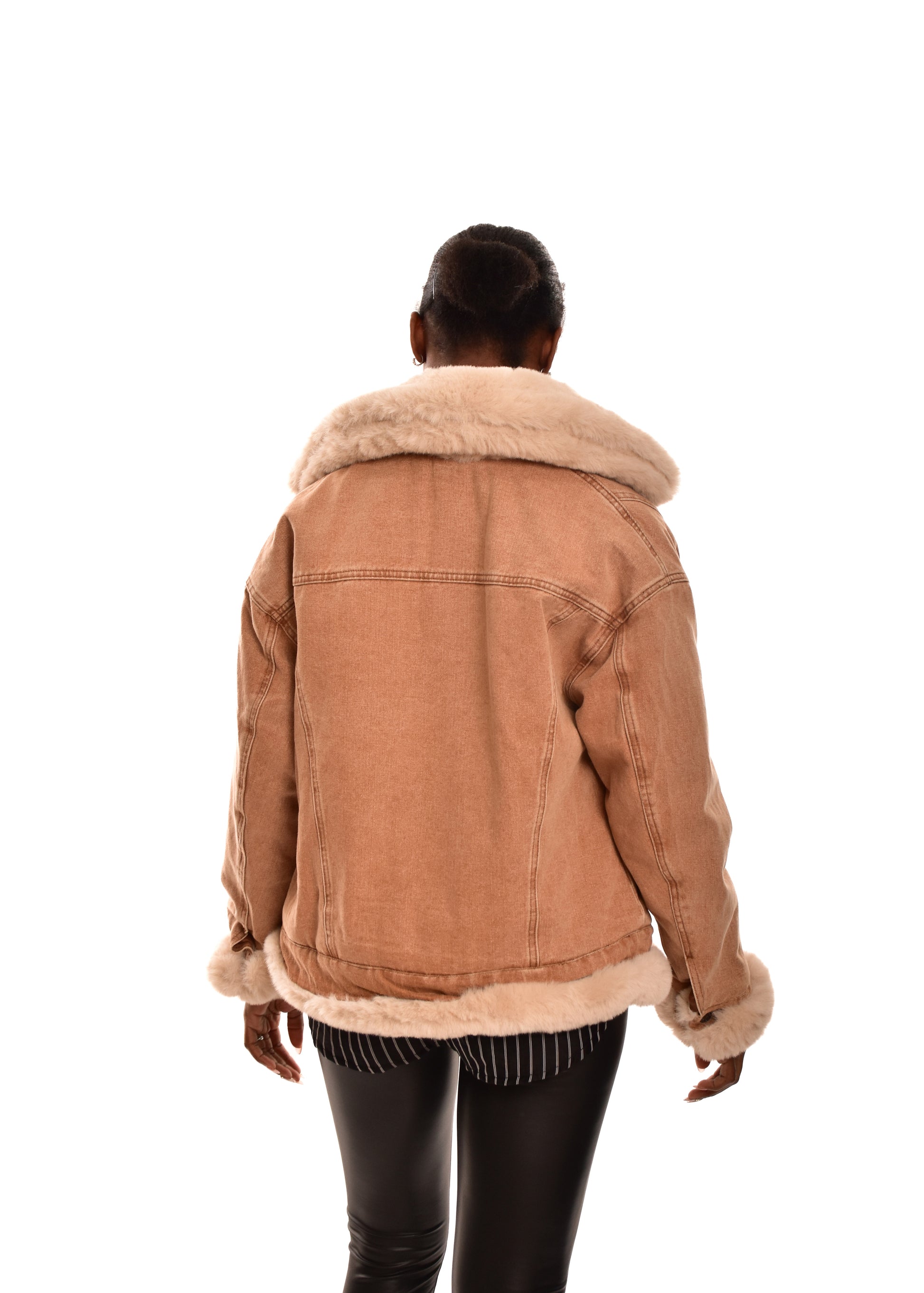 Abrigo combinado en tejido vaquero con bordes en pelo sintético. Guateado en la parte interior. Cierre con botones. Este modelo está disponible en talla única, en este caso es apto hasta una talla 40.