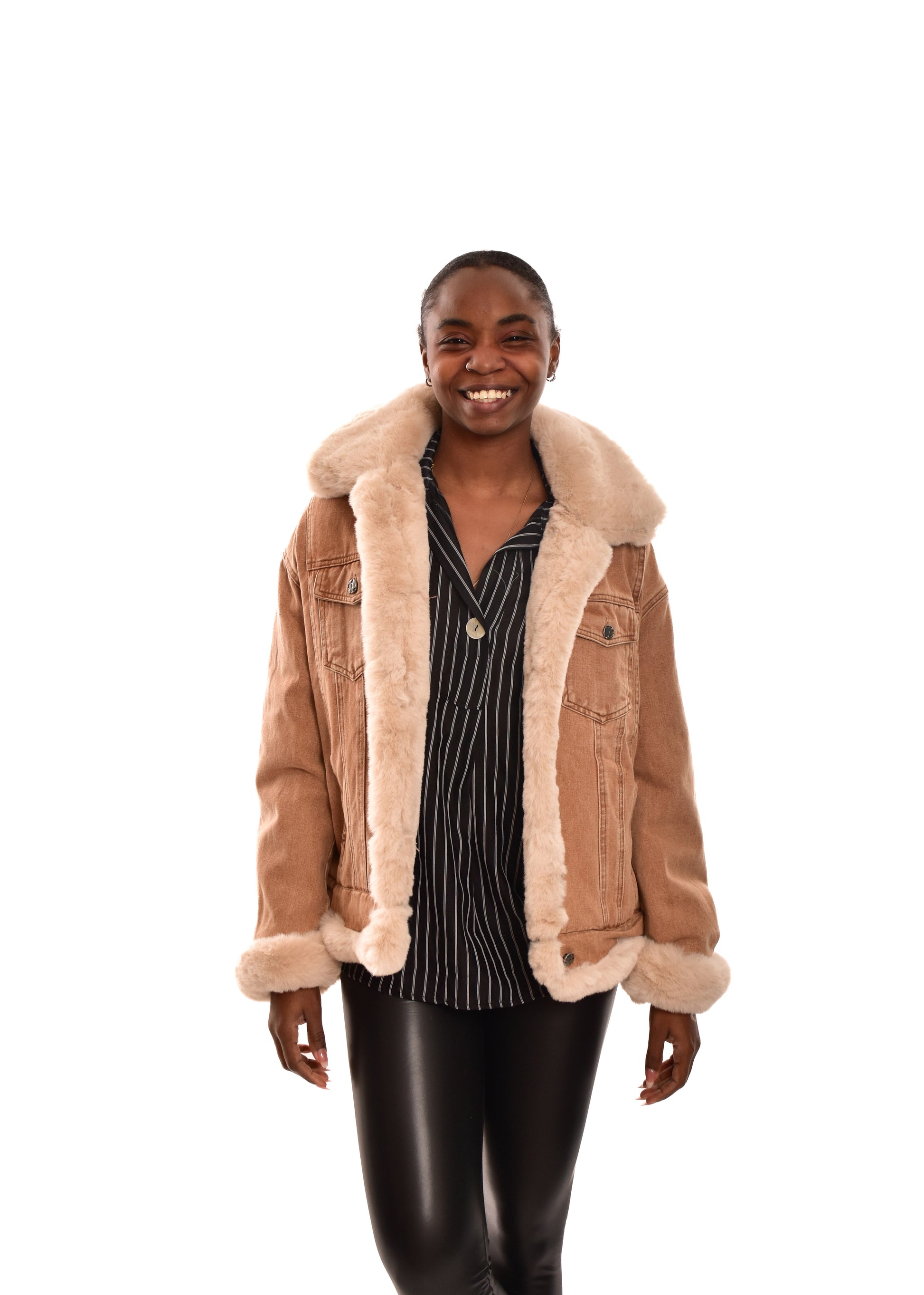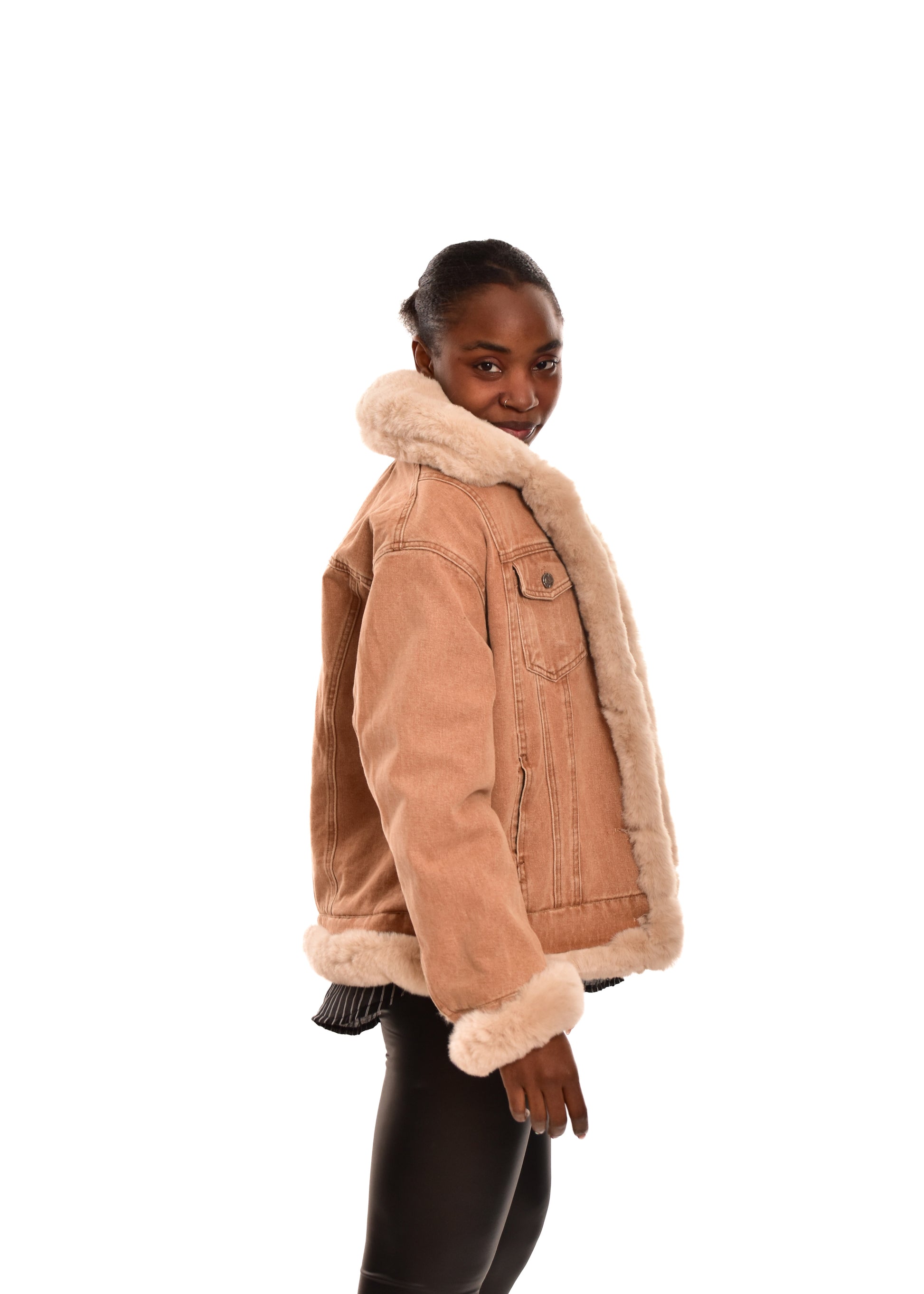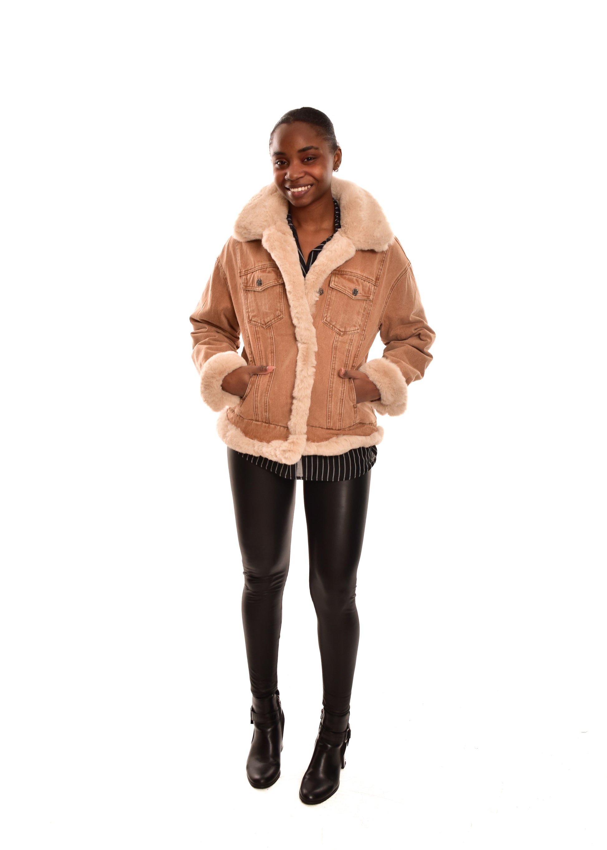 Abrigo combinado en tejido vaquero con bordes en pelo sintético. Guateado en la parte interior. Cierre con botones. Este modelo está disponible en talla única, en este caso es apto hasta una talla 40.
