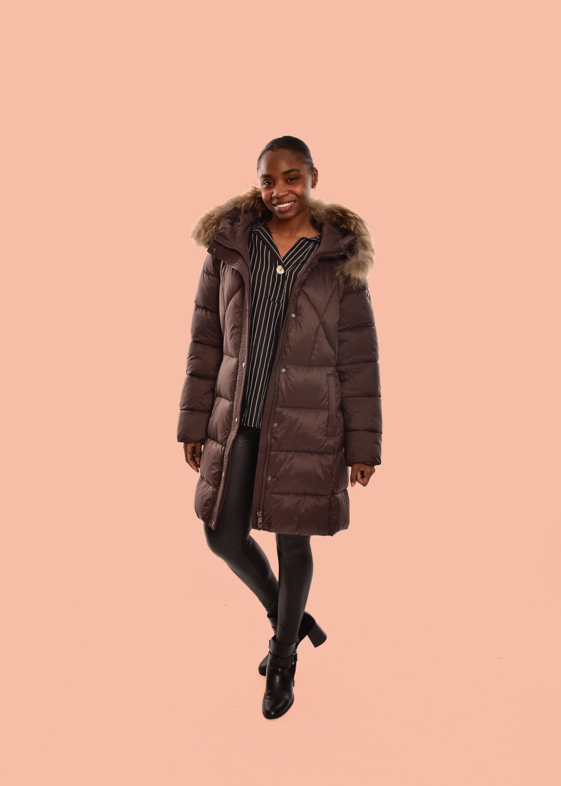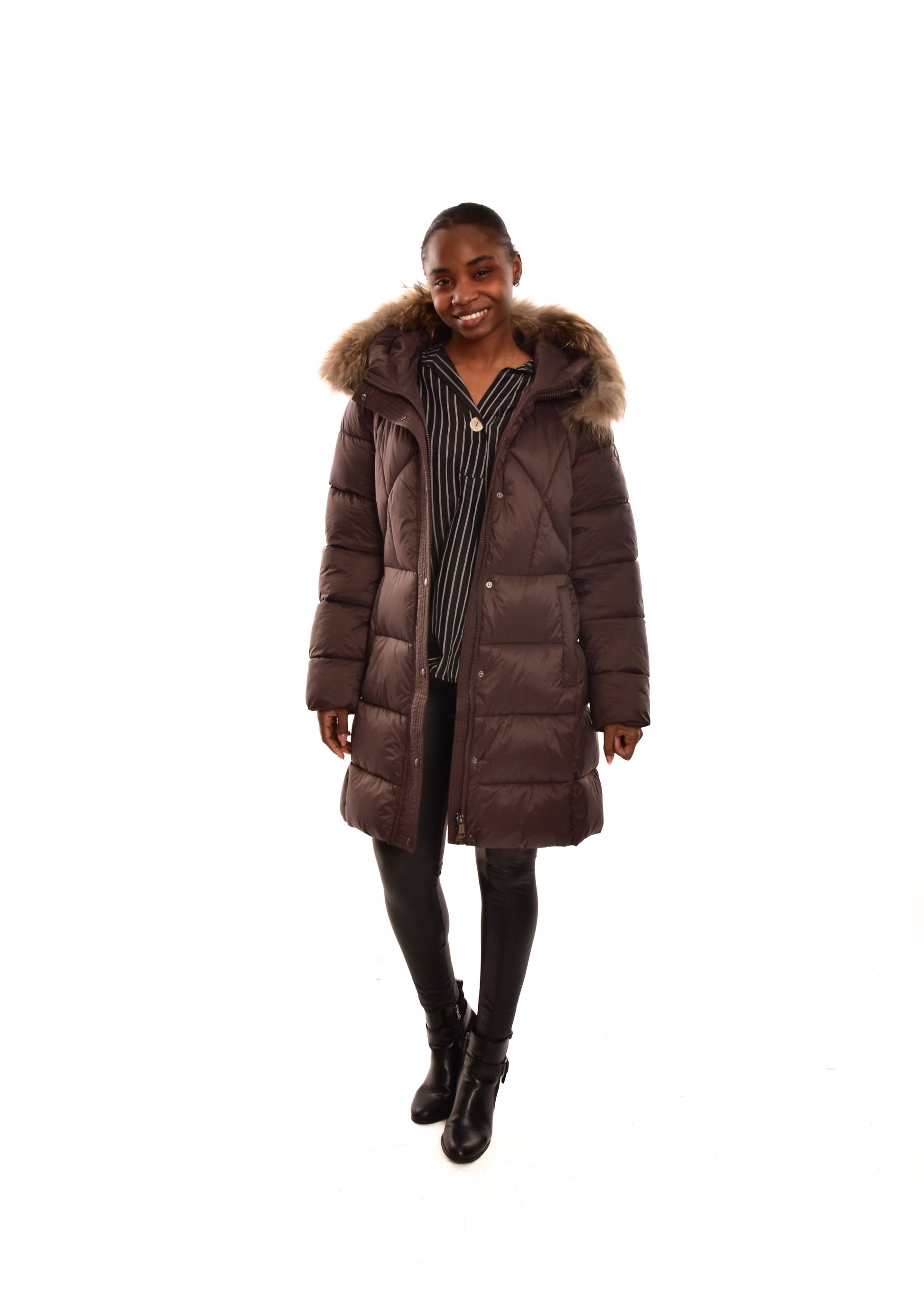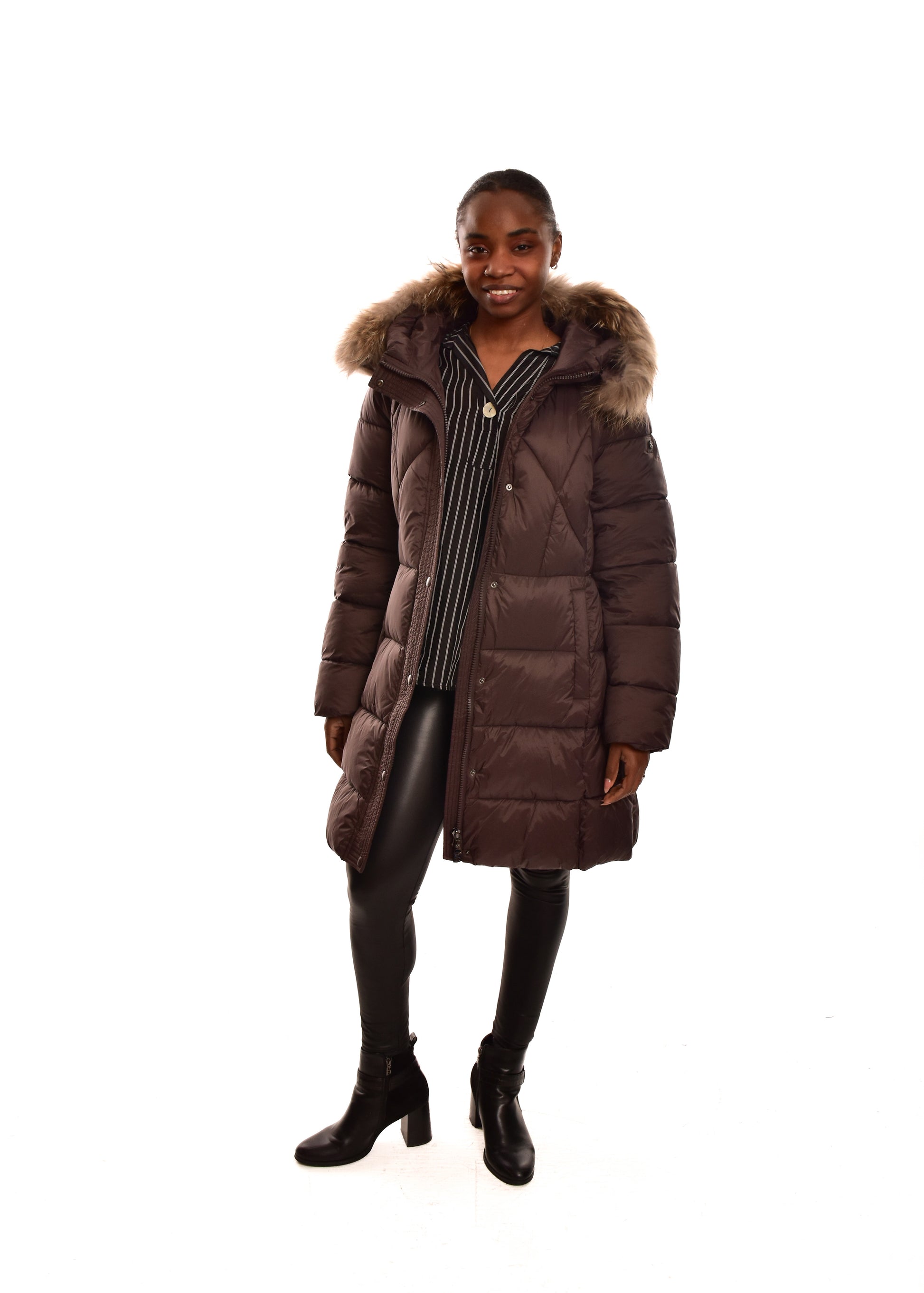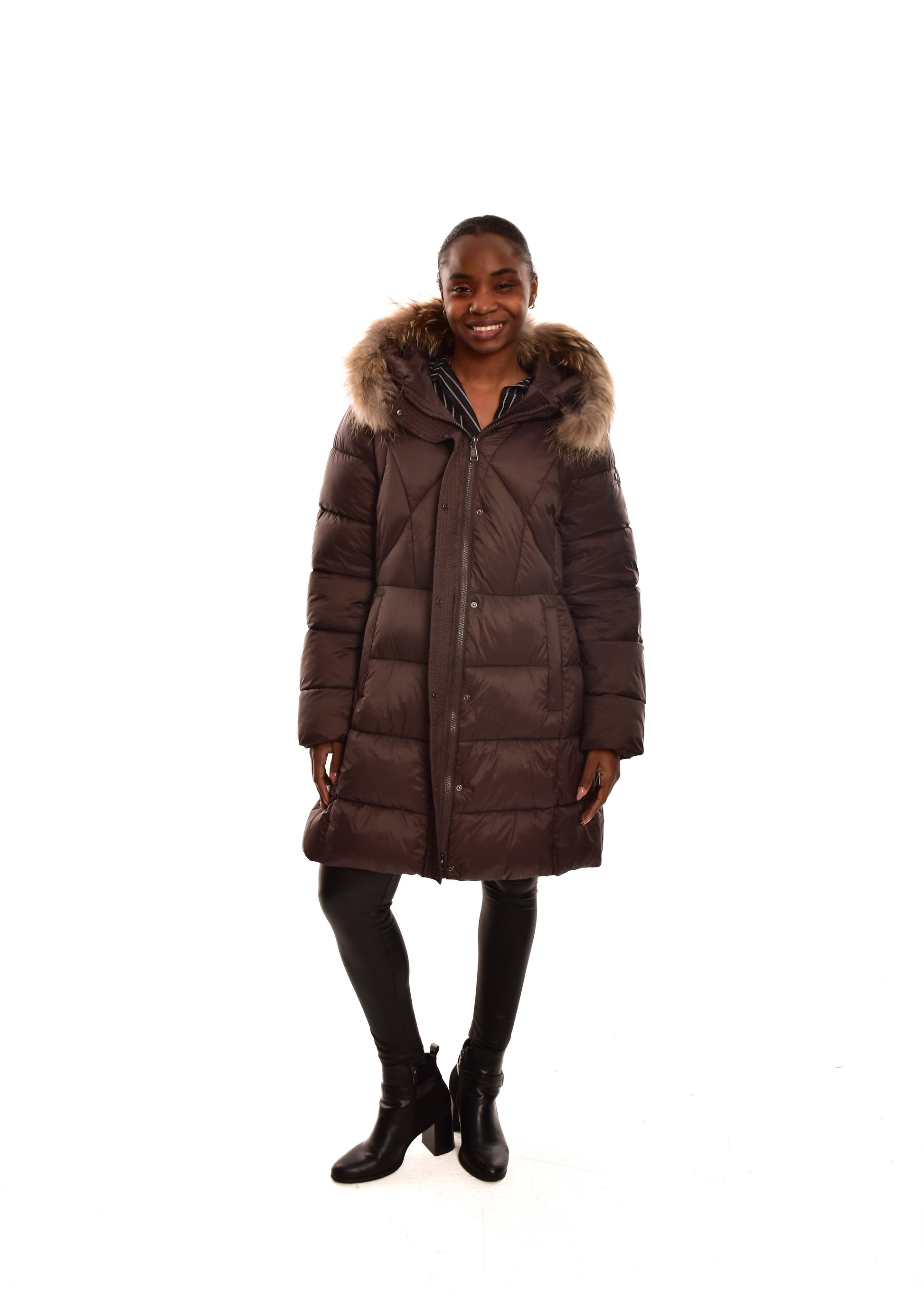 Cazadora Acolchada mate. El pelo de la capucha es desmontable (pelo natural). Cuenta con múltiples bolsillos. Este modelo está disponible de la talla 42 a la 48.