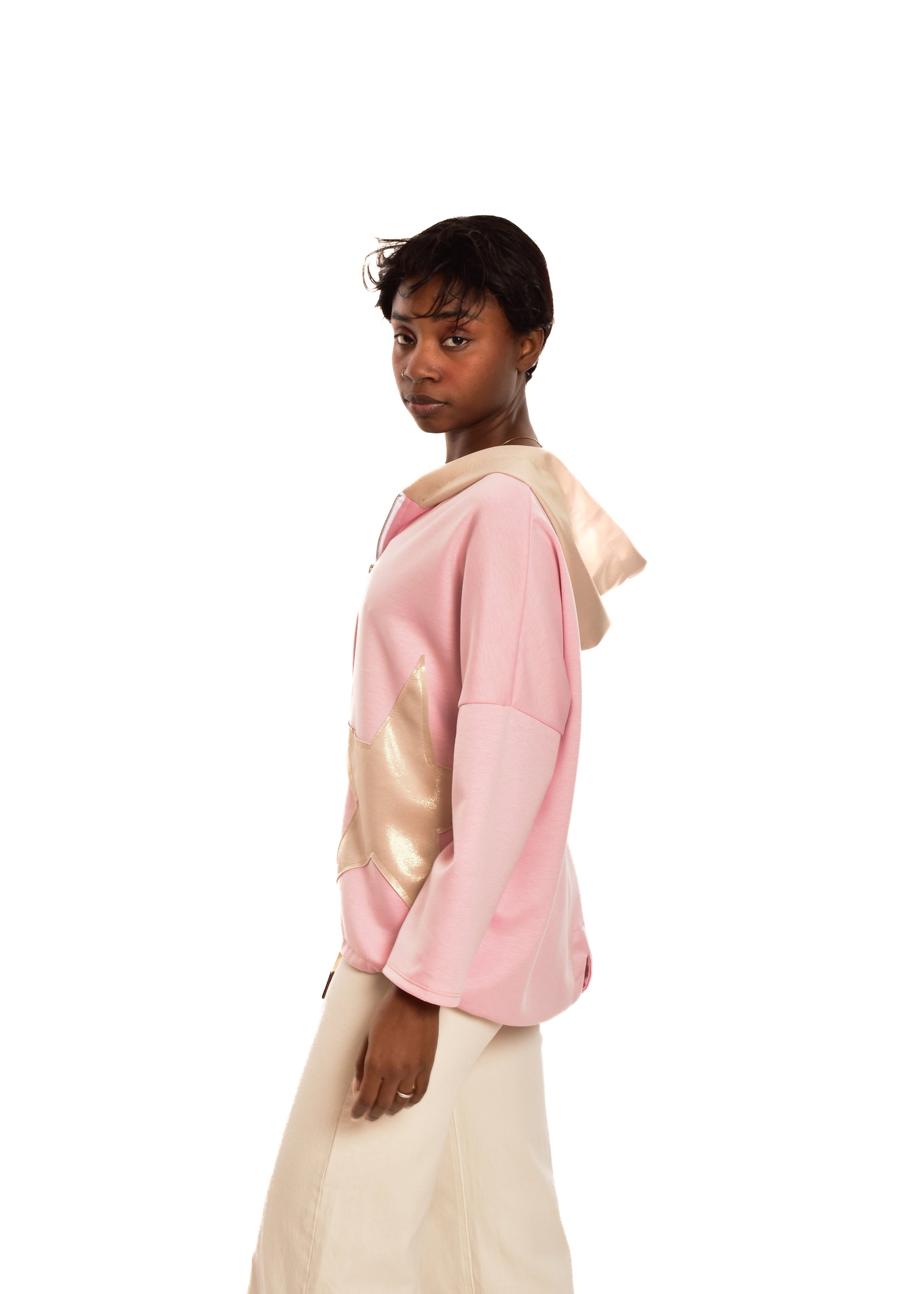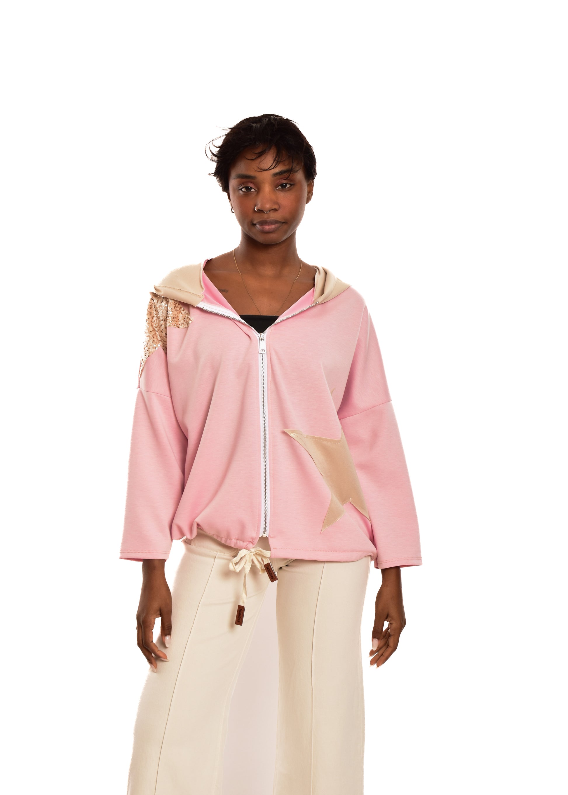 Chaqueta de algodón con cremallera. Parches en lentejuelas y brillo. Esta prenda está disponible en talla única, en este caso es apto hasta una talla 46.