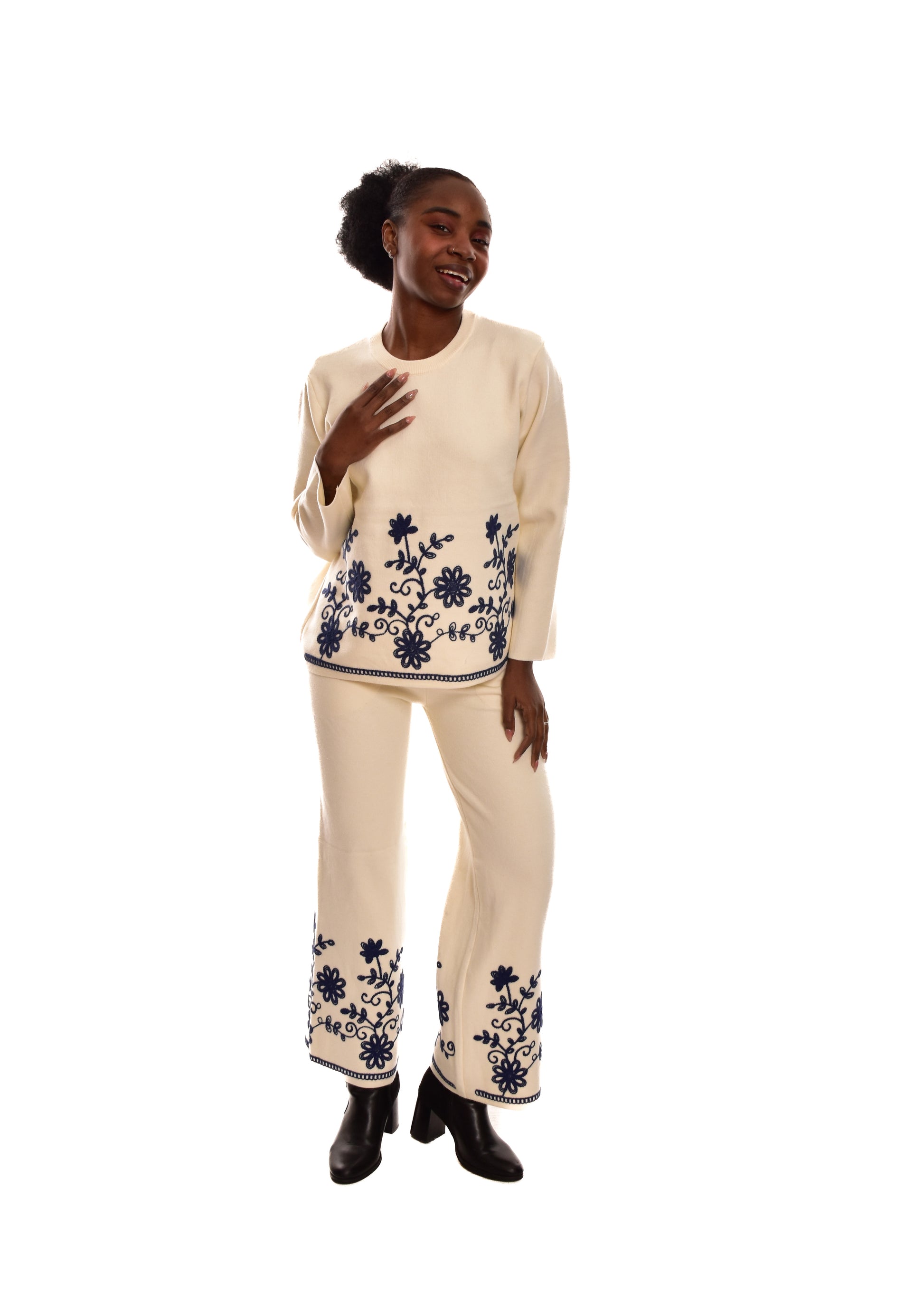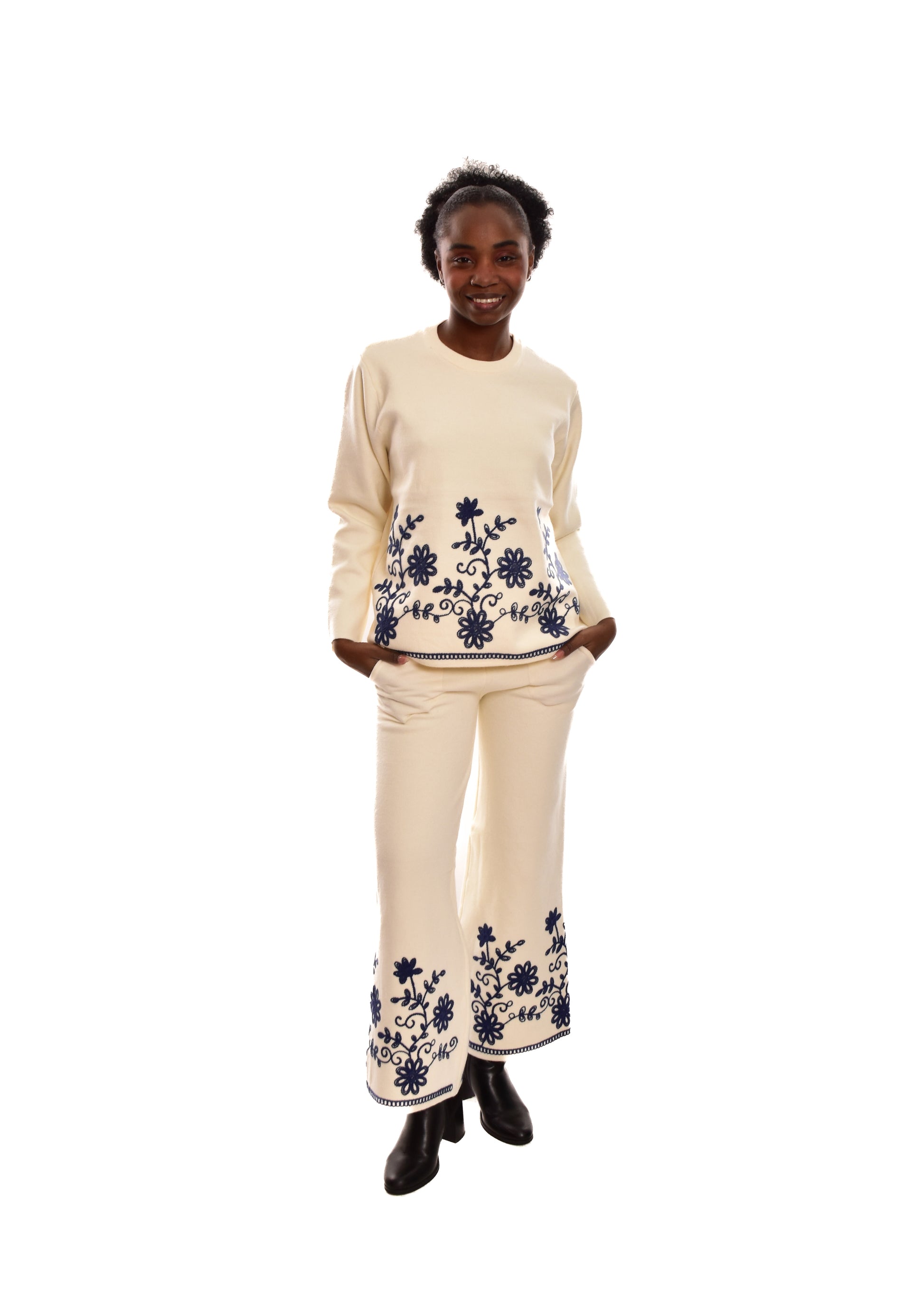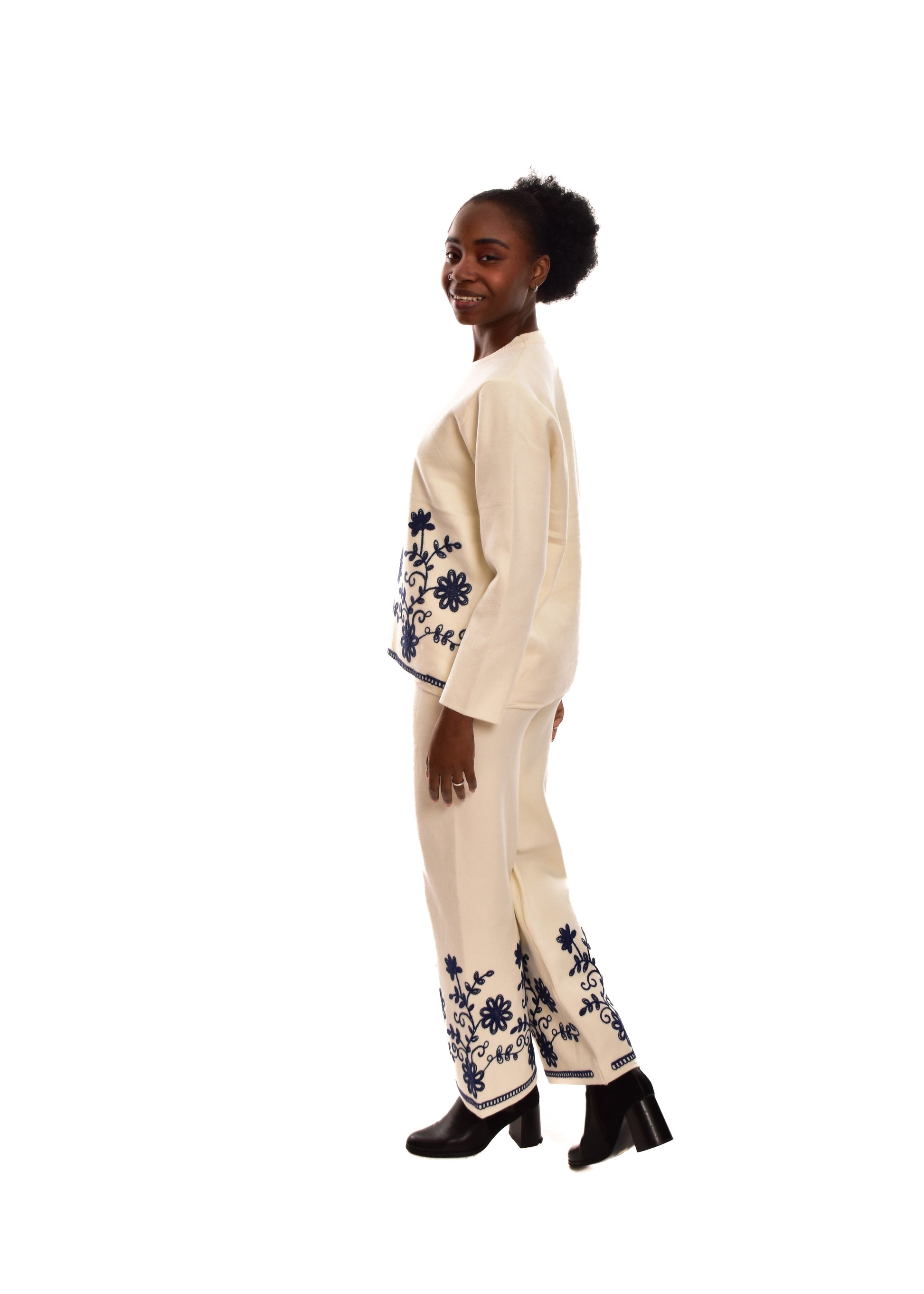 Conjunto compuesto por jersey de punto y pantalón. Detalles bordados. Este modelo está disponible en Talla única, en este caso es apto hasta una talla 42.