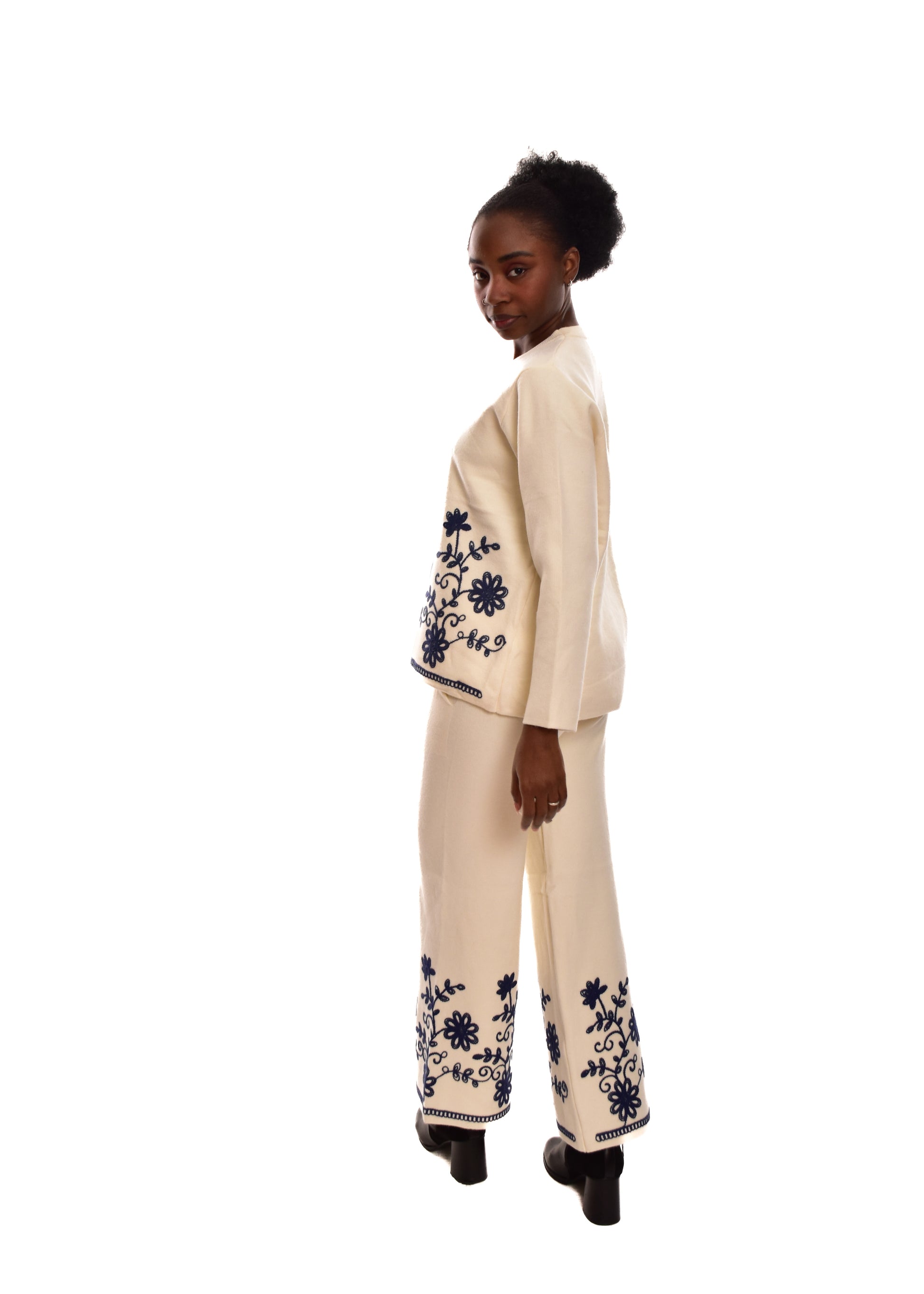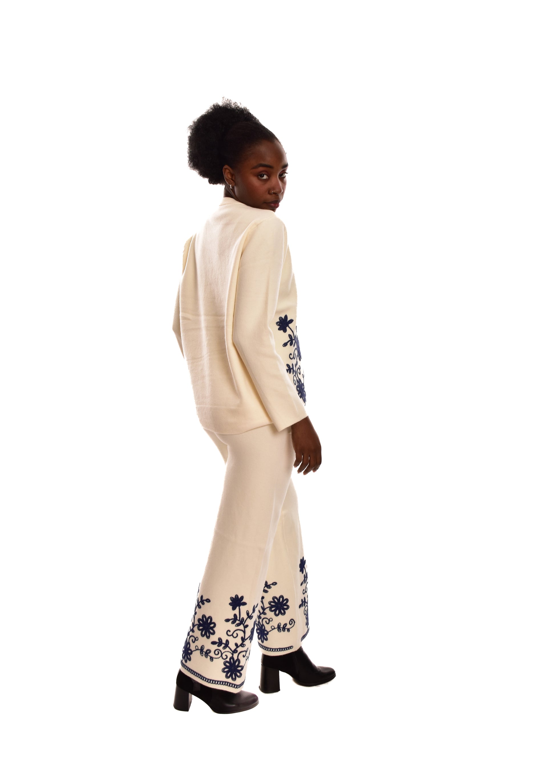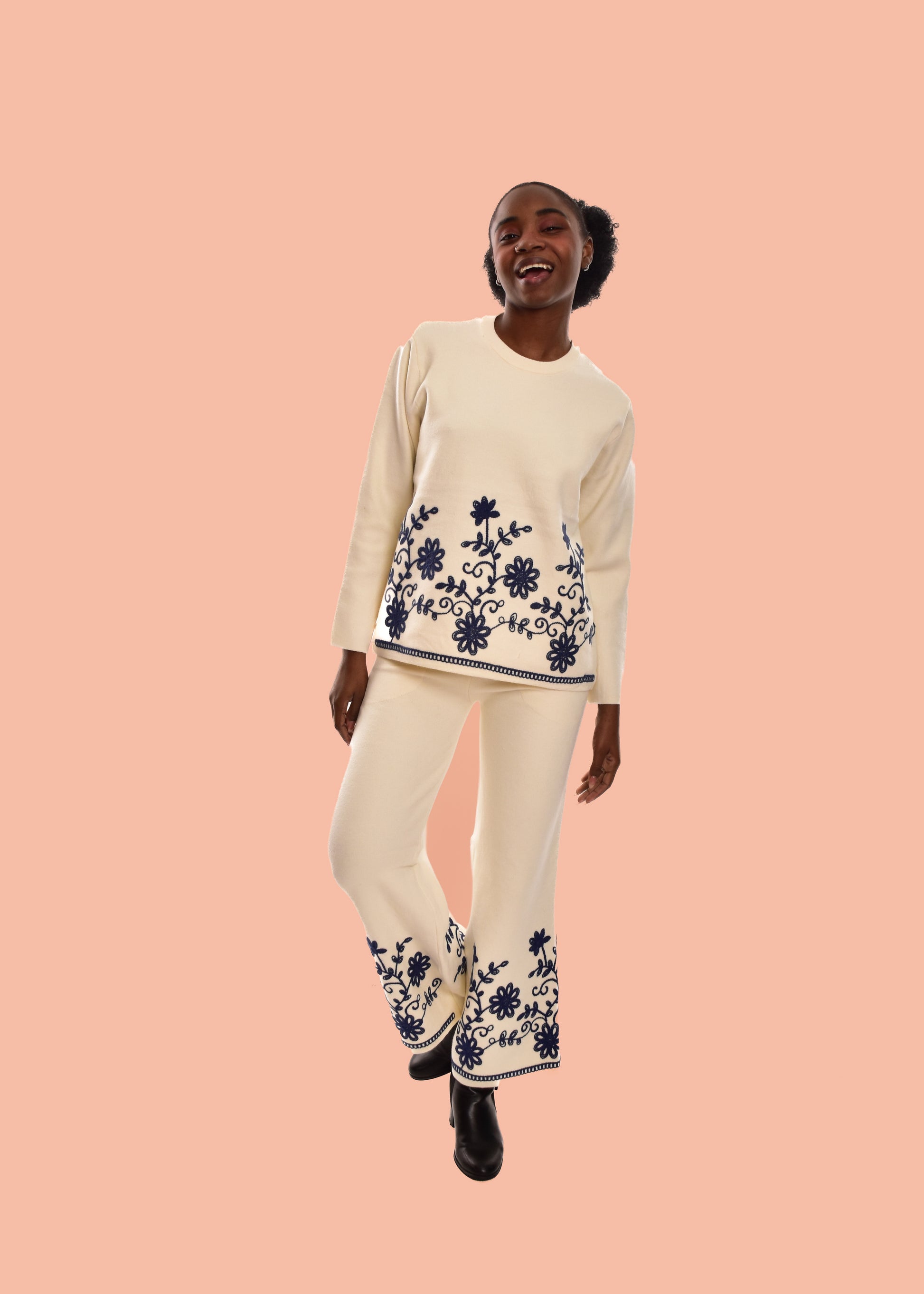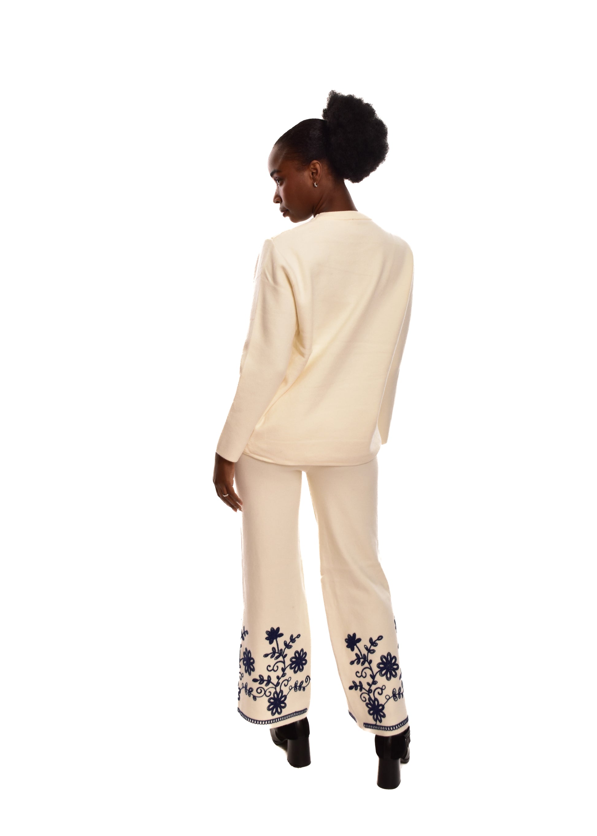 Conjunto compuesto por jersey de punto y pantalón. Detalles bordados. Este modelo está disponible en Talla única, en este caso es apto hasta una talla 42.