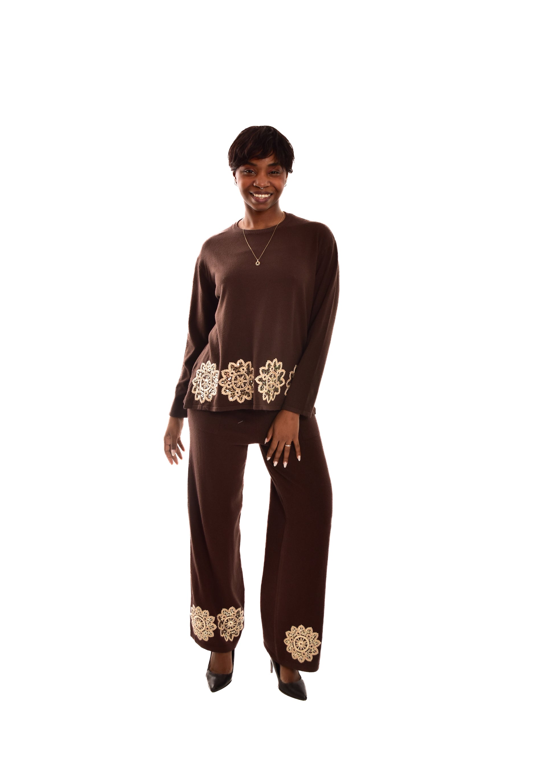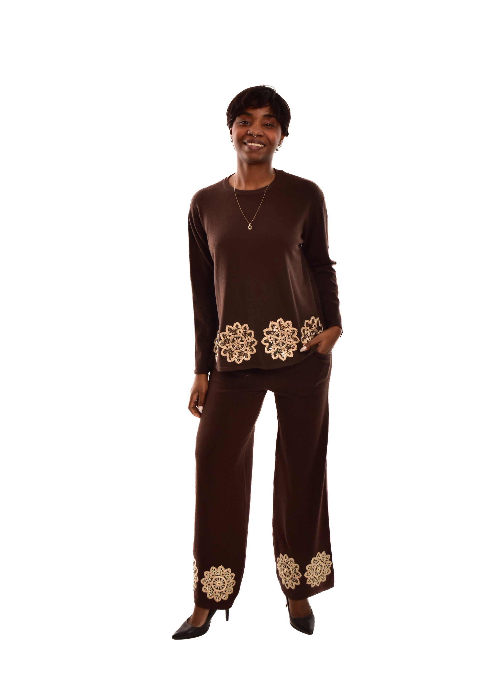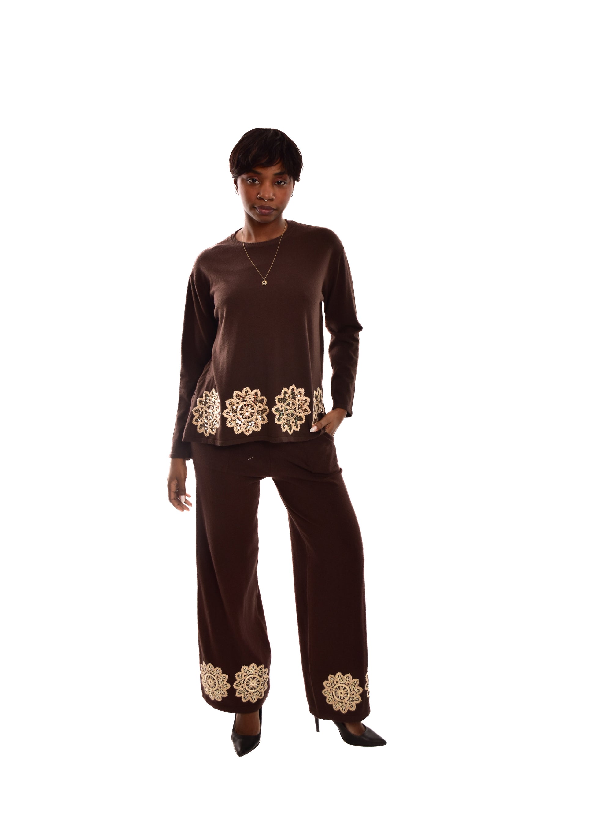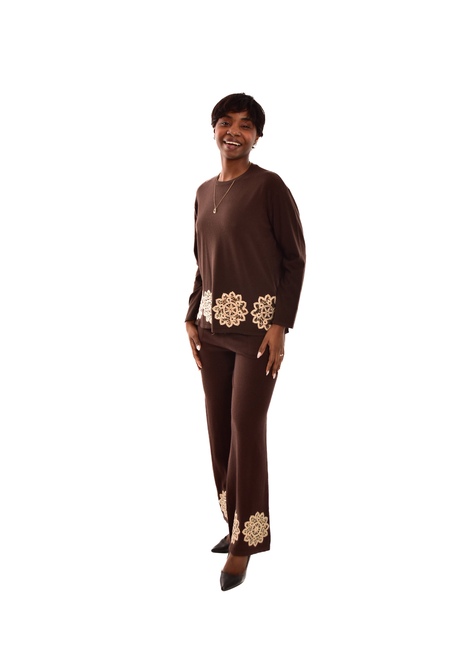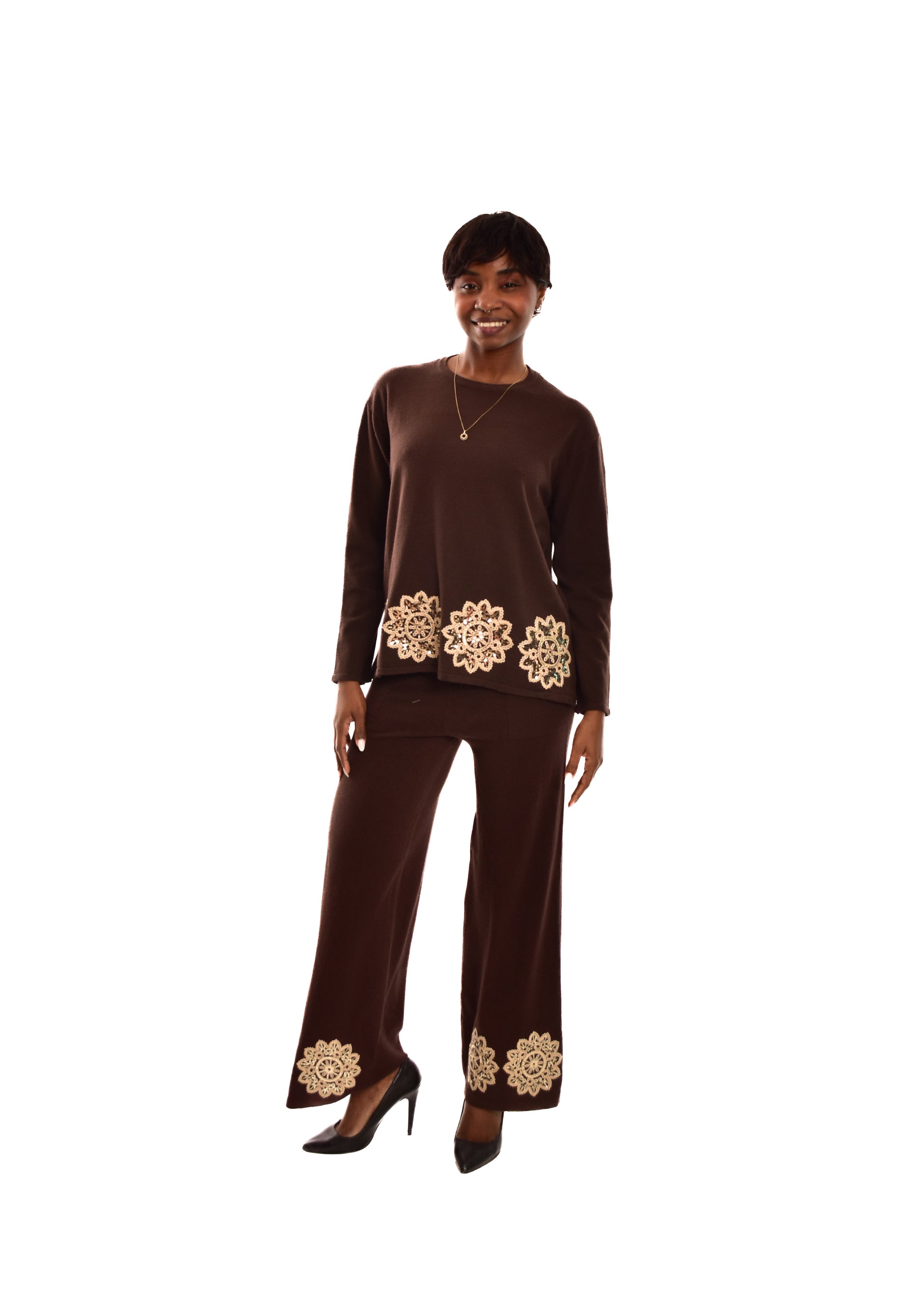 Conjunto compuesto por jersey de punto y pantalón. Detalles bordados. Este modelo está disponible en Talla única, en este caso es apto hasta una talla 42.