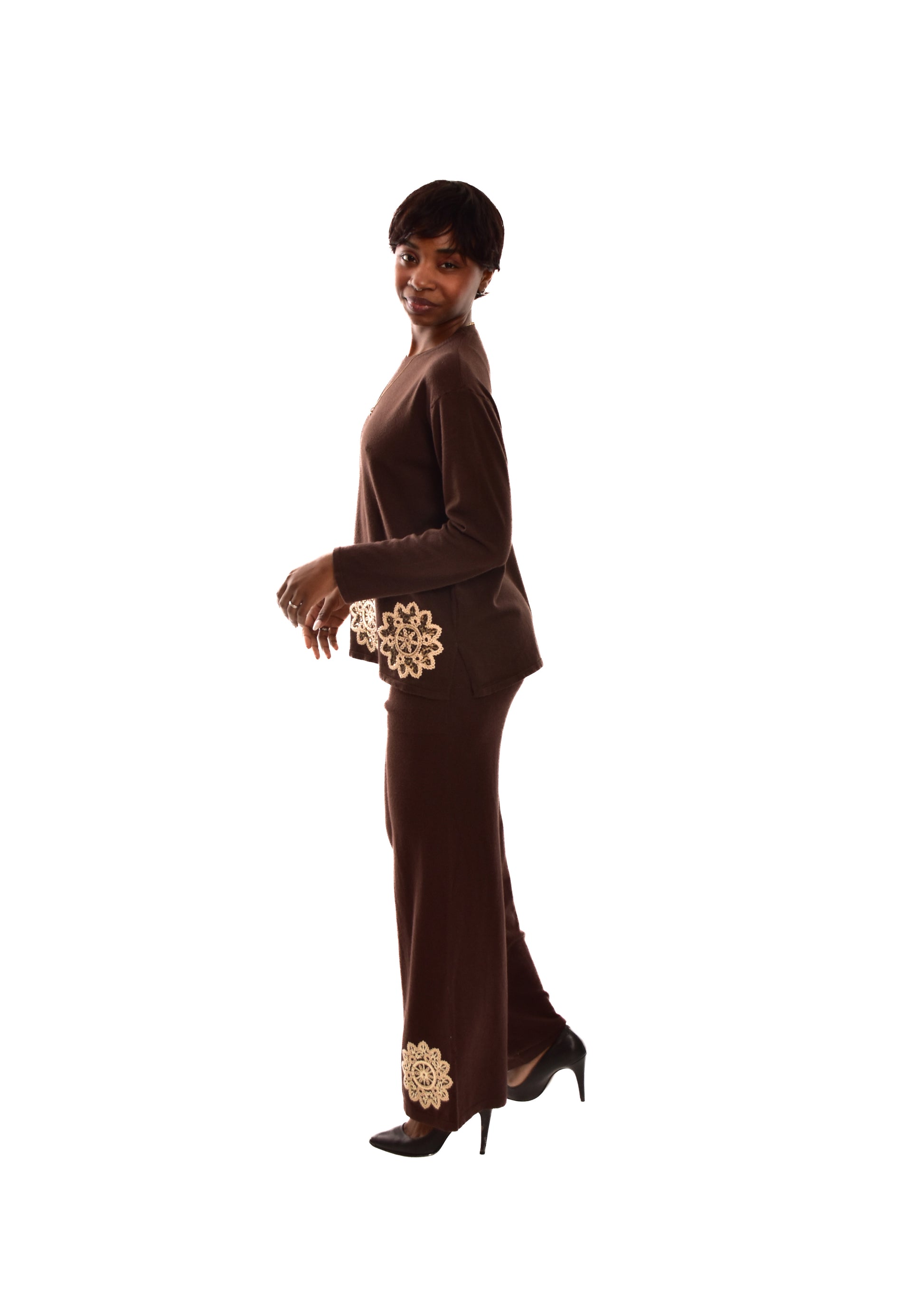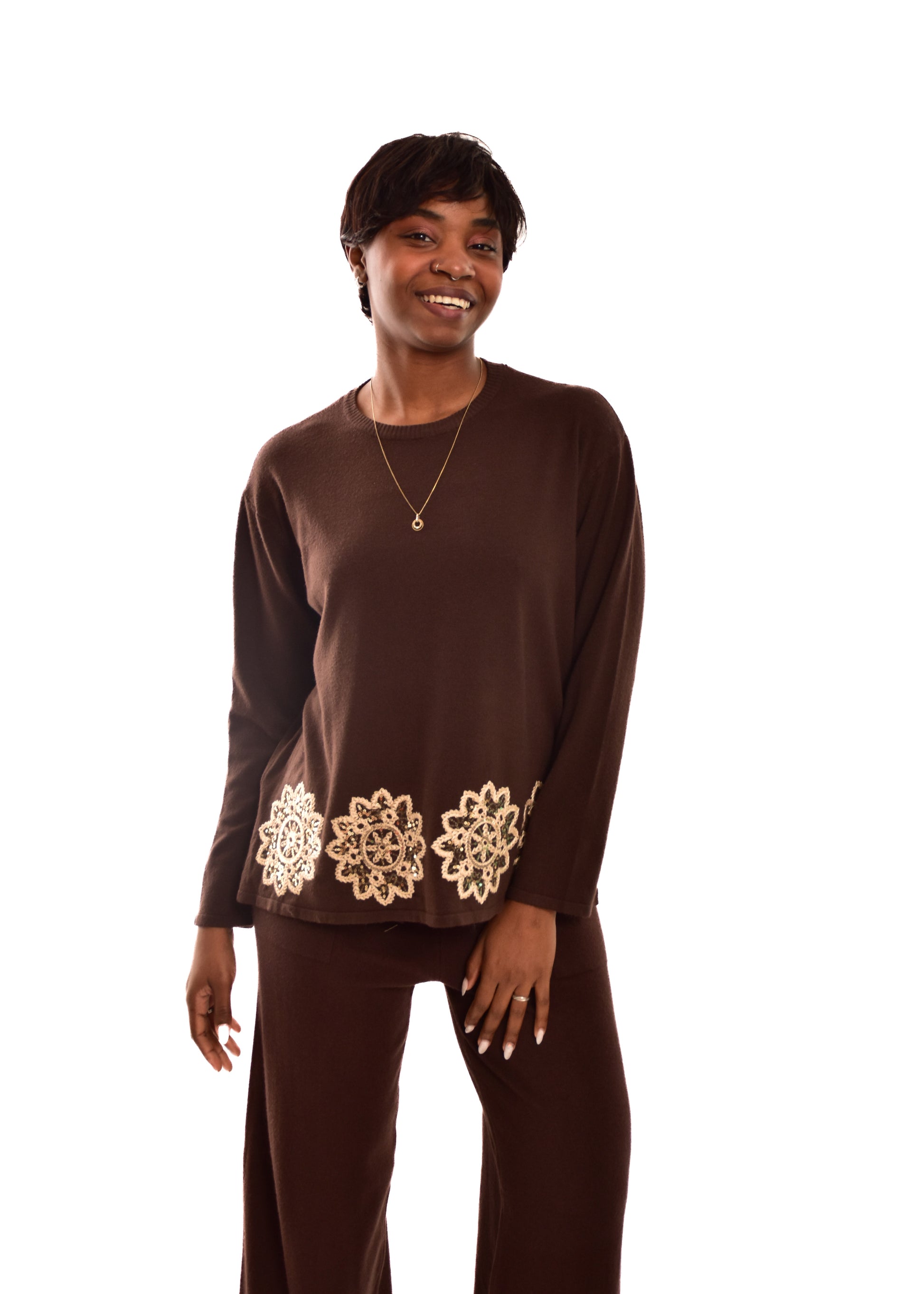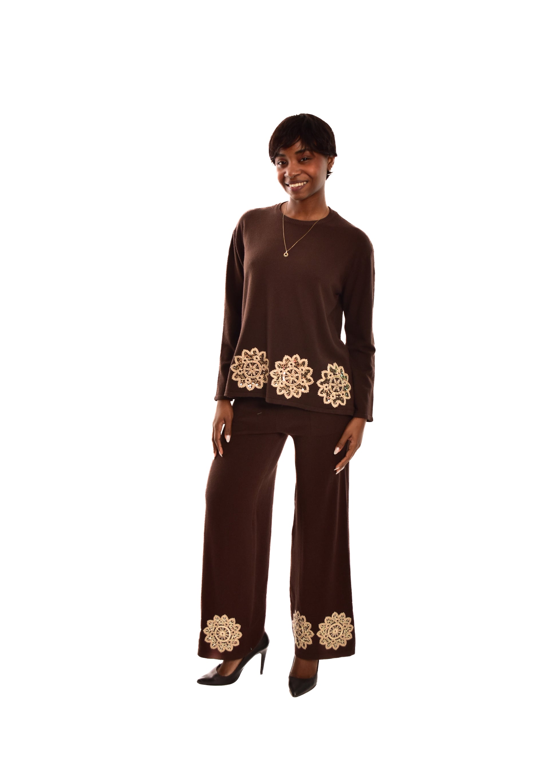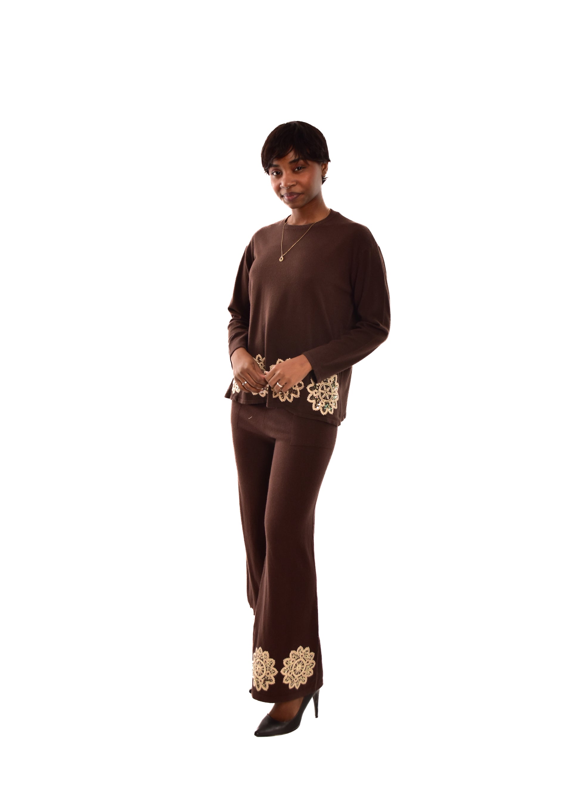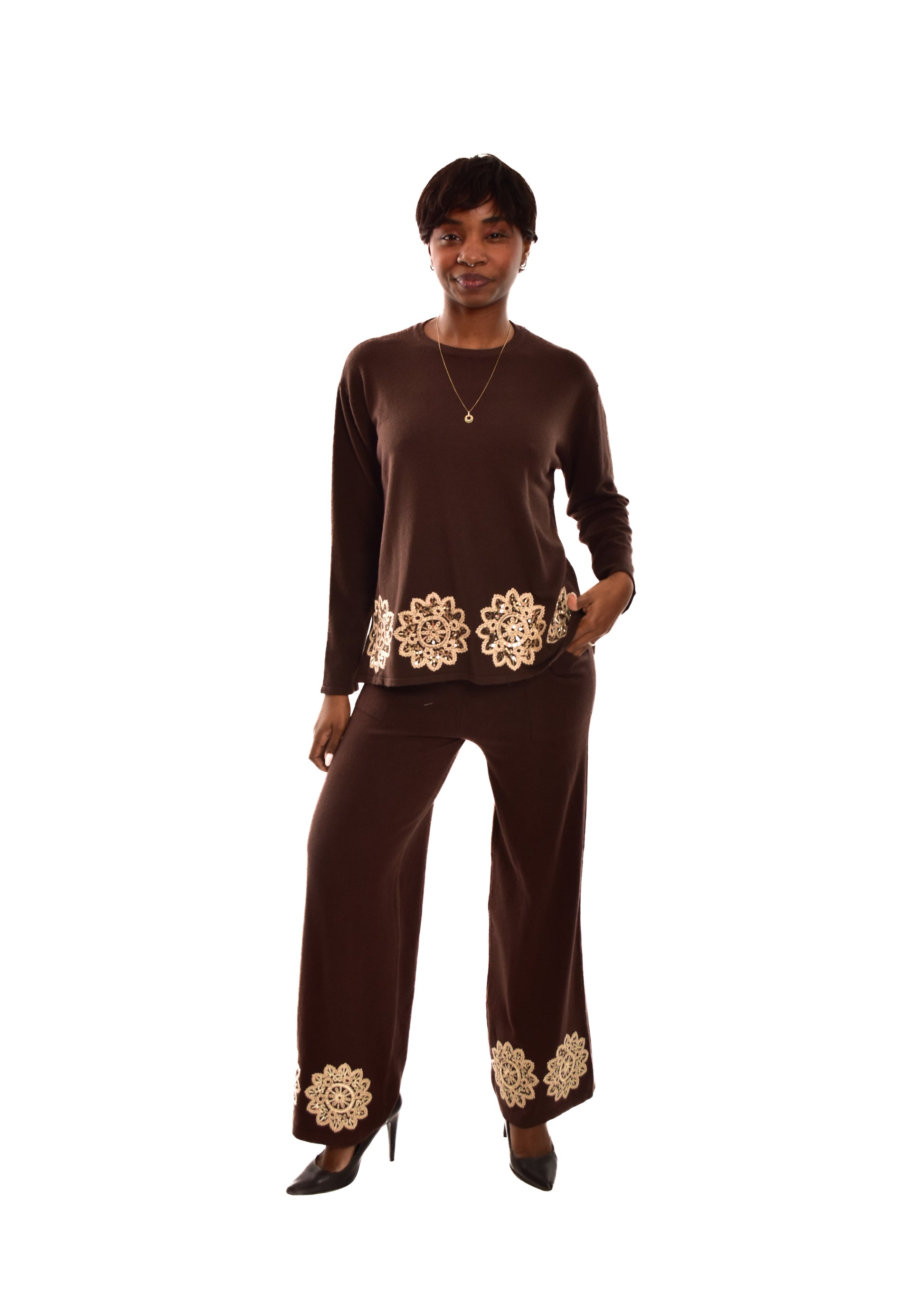 Conjunto compuesto por jersey de punto y pantalón. Detalles bordados. Este modelo está disponible en Talla única, en este caso es apto hasta una talla 42.