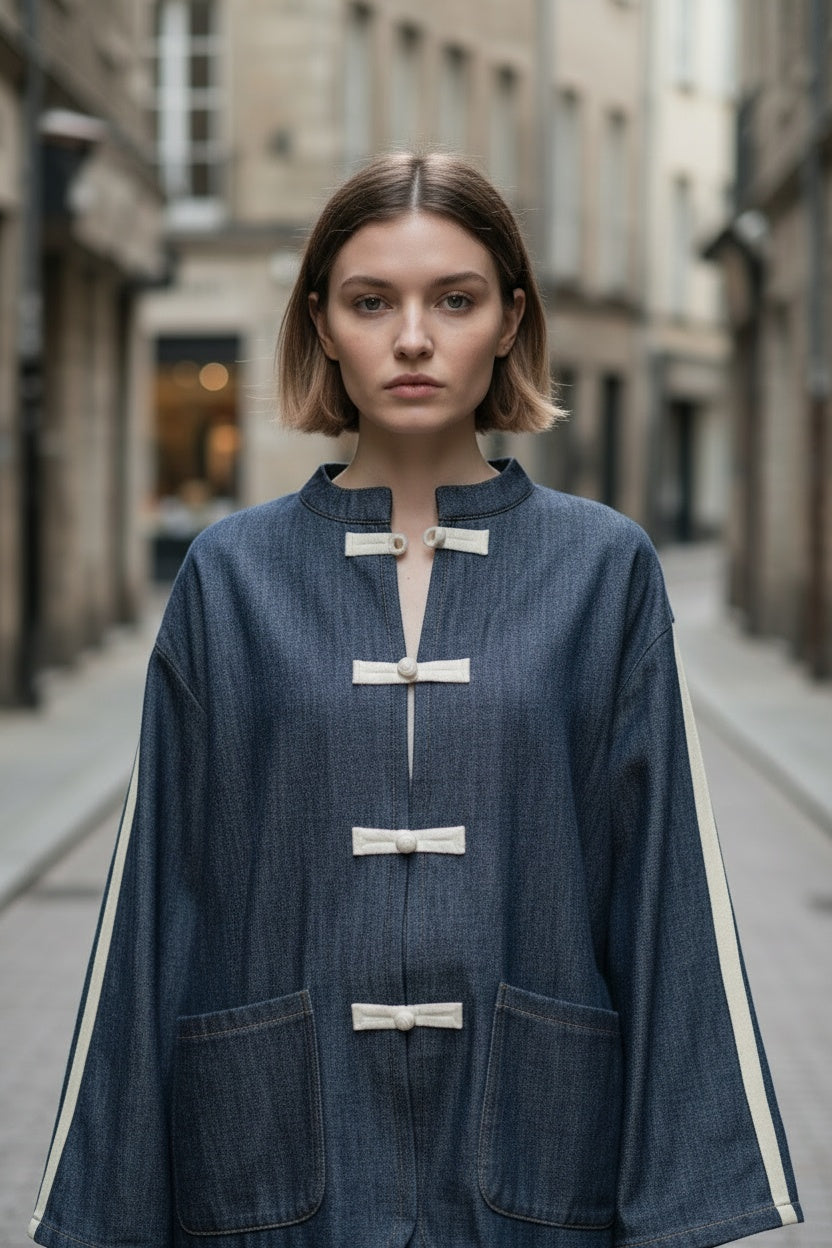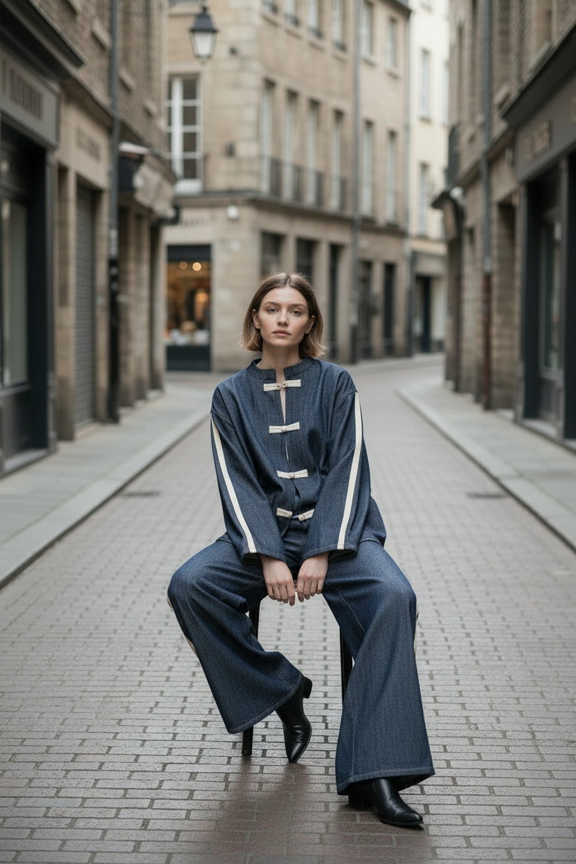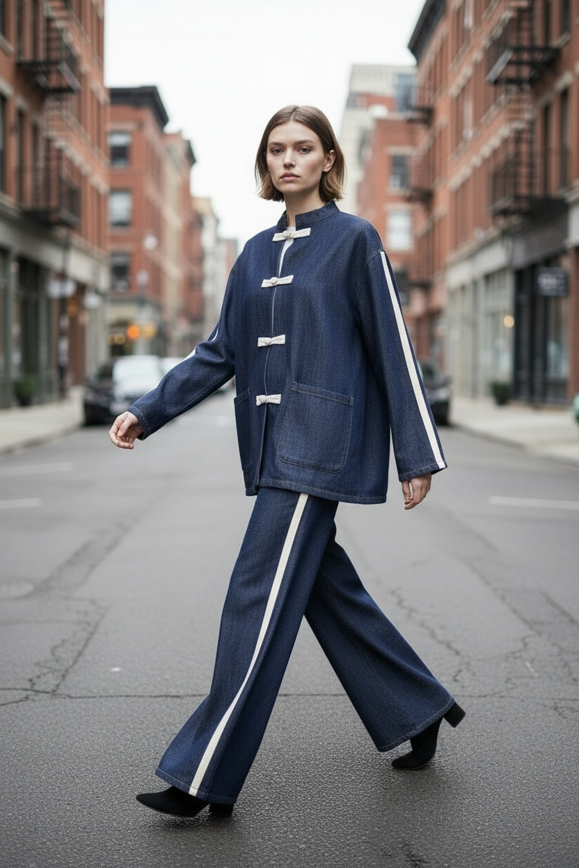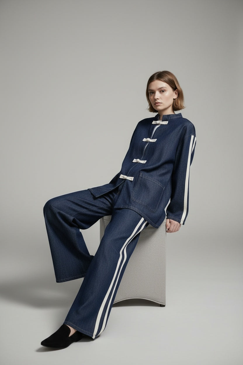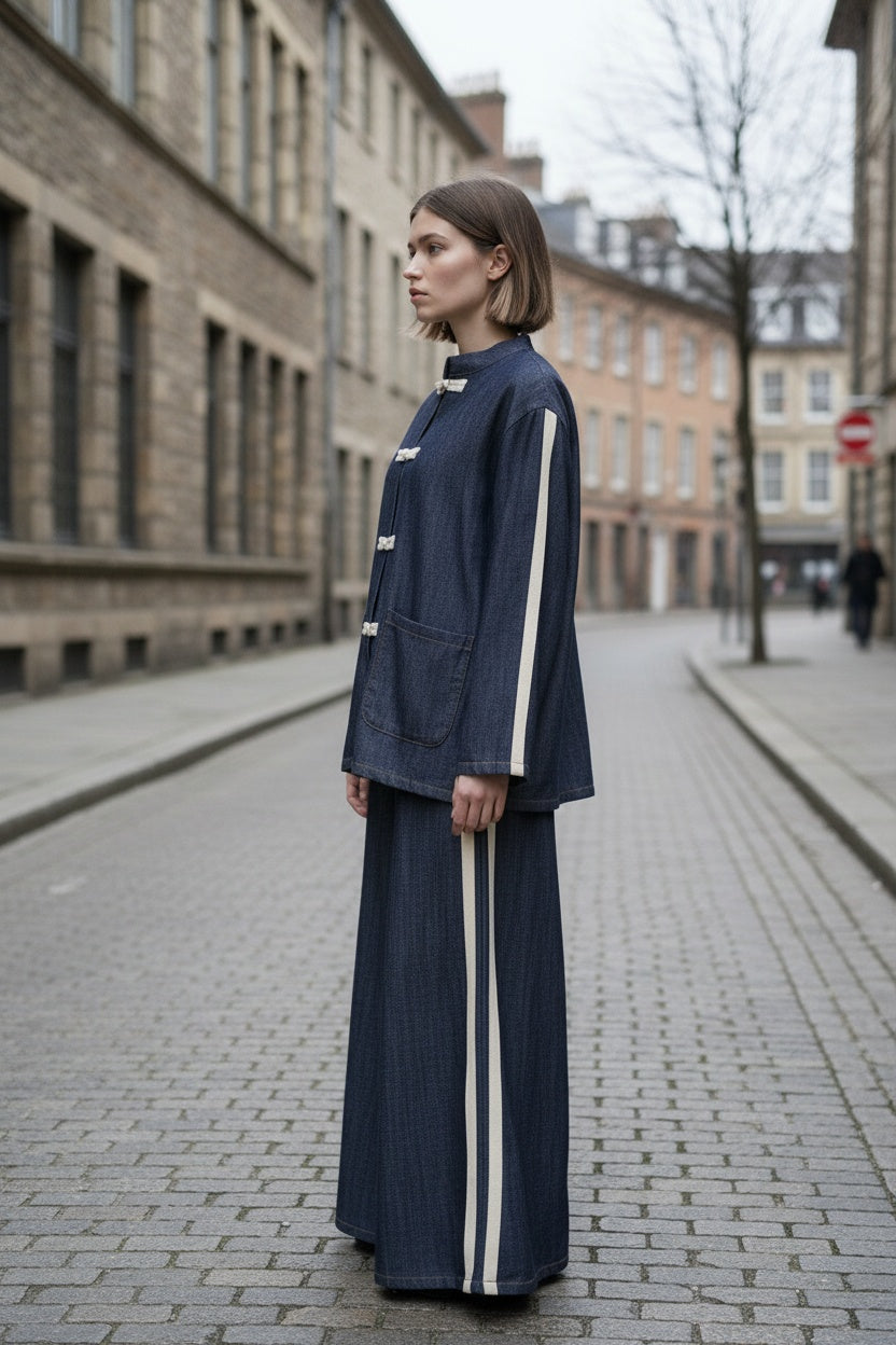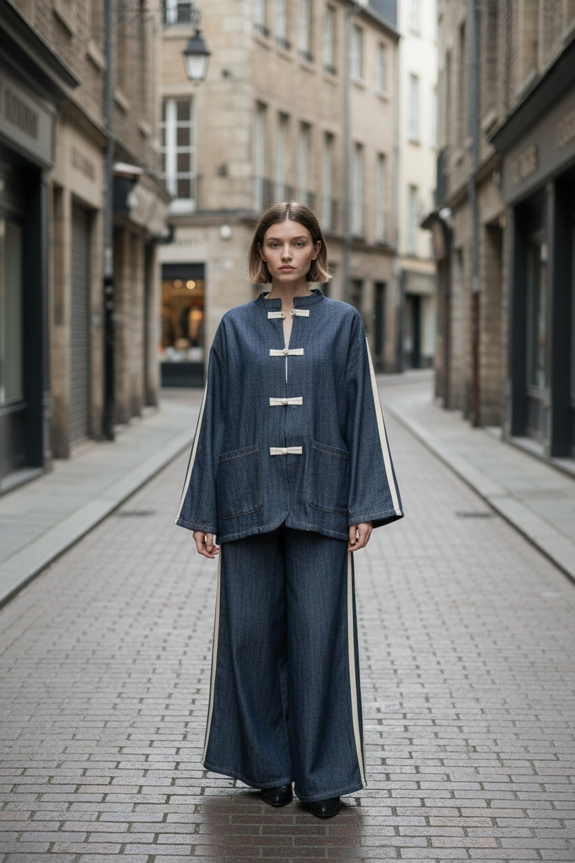 Conjunto compuesto por casaca y pantalón en tejido vaquero. Bandas laterales. Este modelo está disponible en Talla única, en este caso es apto hasta una talla 44 amplia.