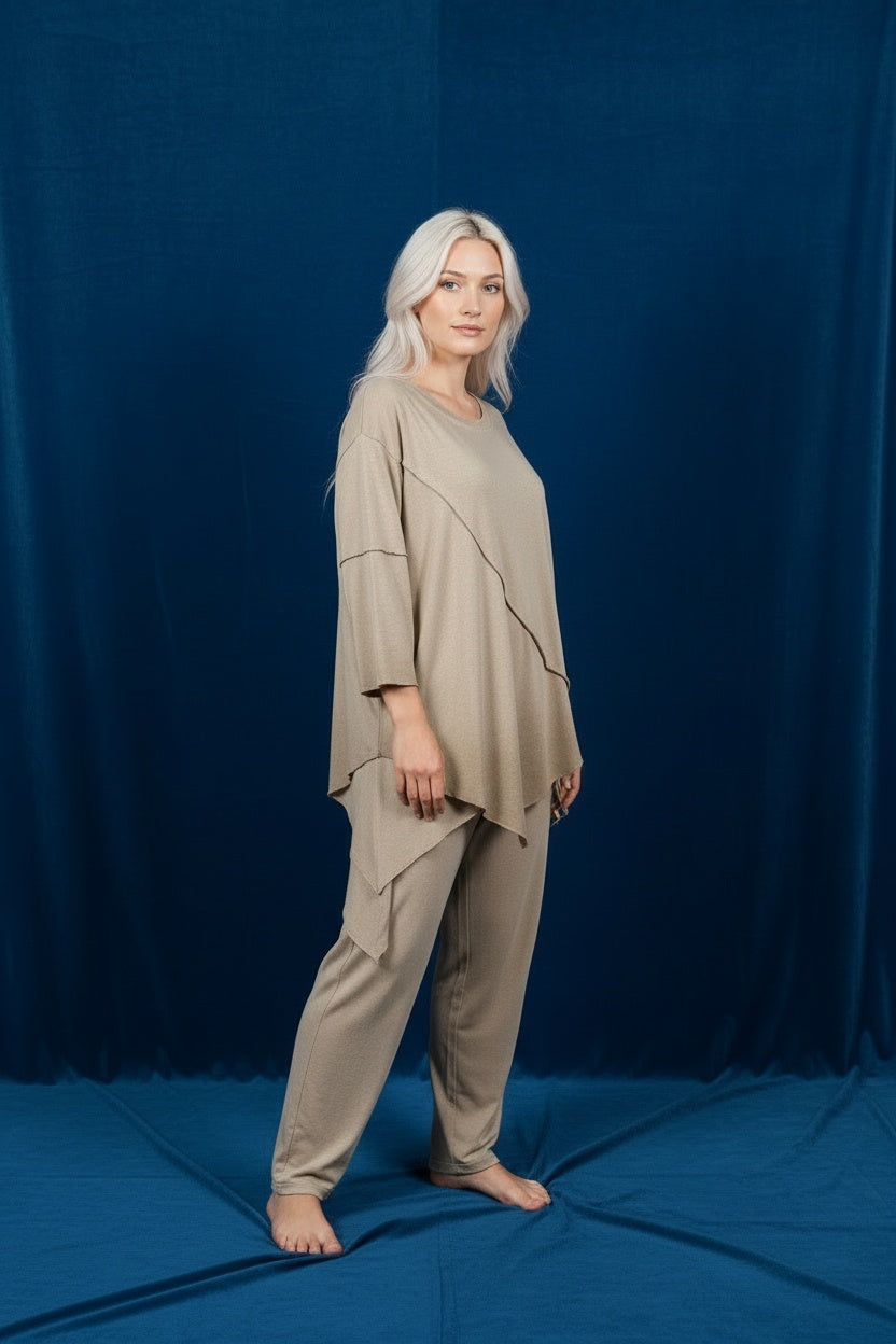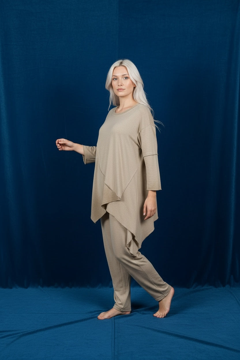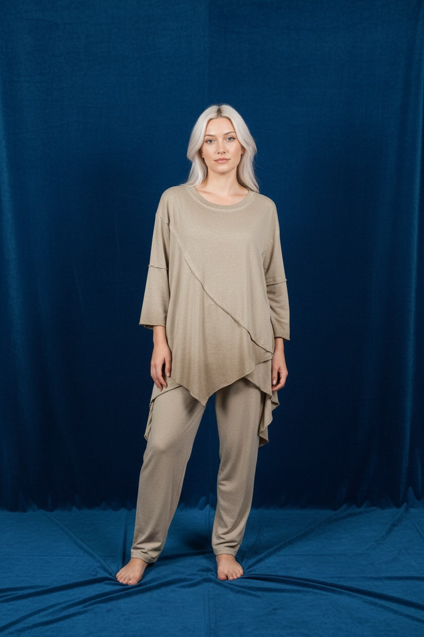 Conjunto compuesto por blusa y pantalón en tejido de algodón. Cortes asimétricos. Este modelo está disponible en Talla única, en este caso es apto hasta una talla 44.