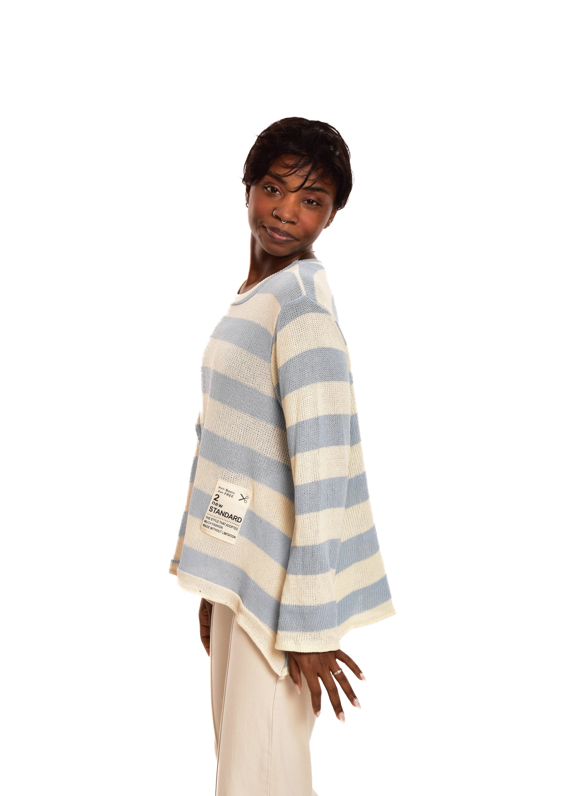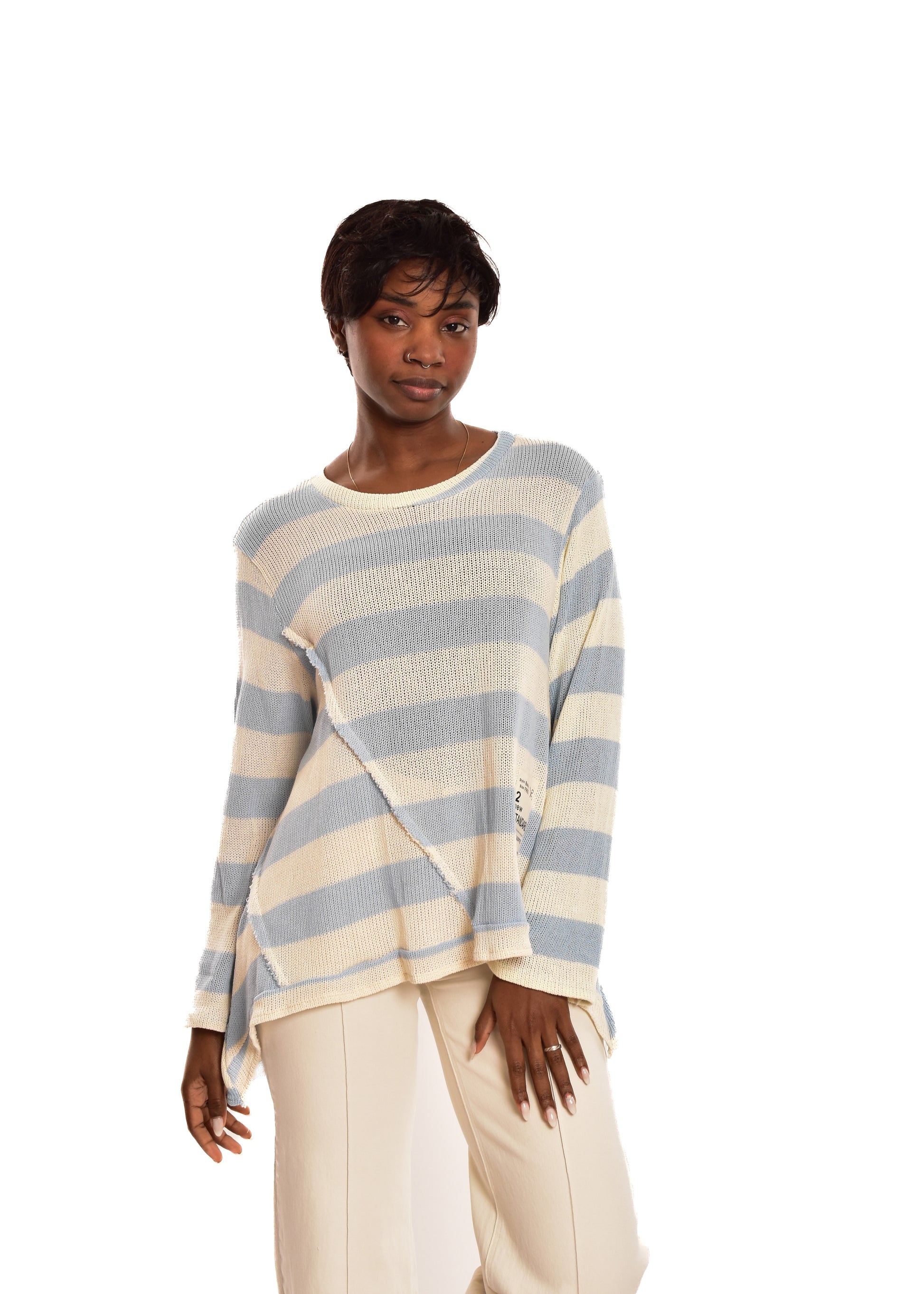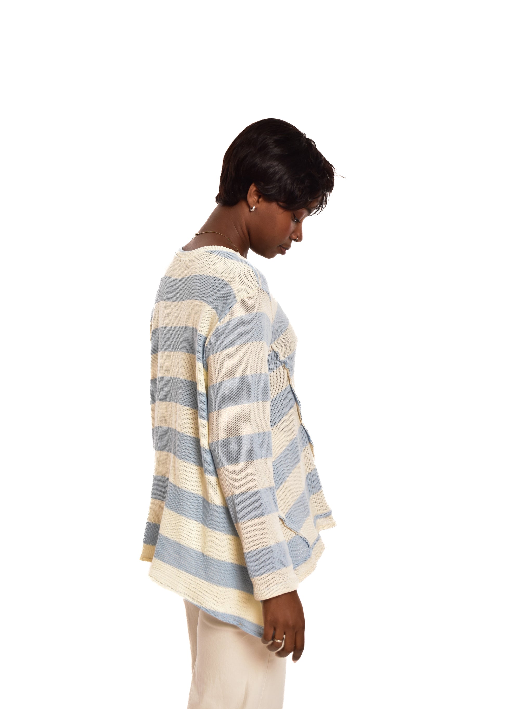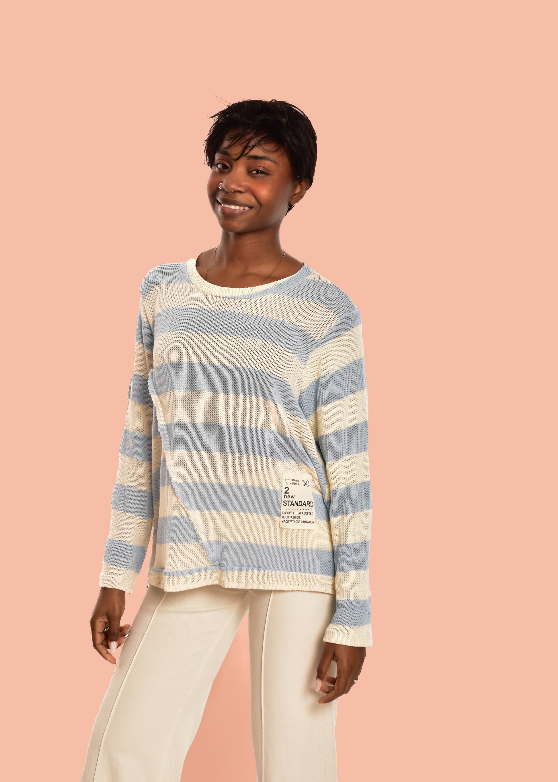 Jersey de punto de hilo calado con cortes asimétricos. Esta prenda está disponible en talla única, en este caso es apto hasta una talla 44.