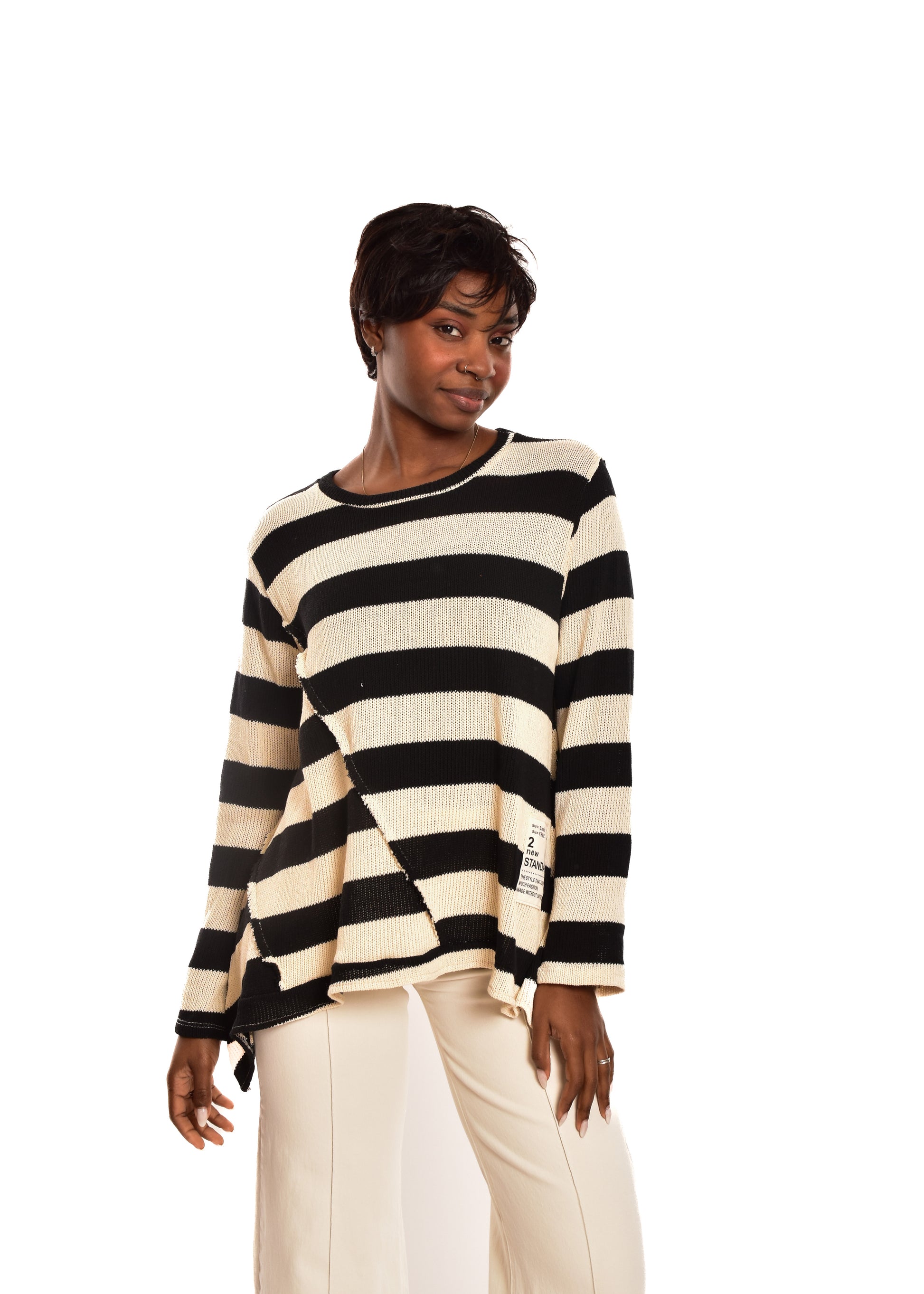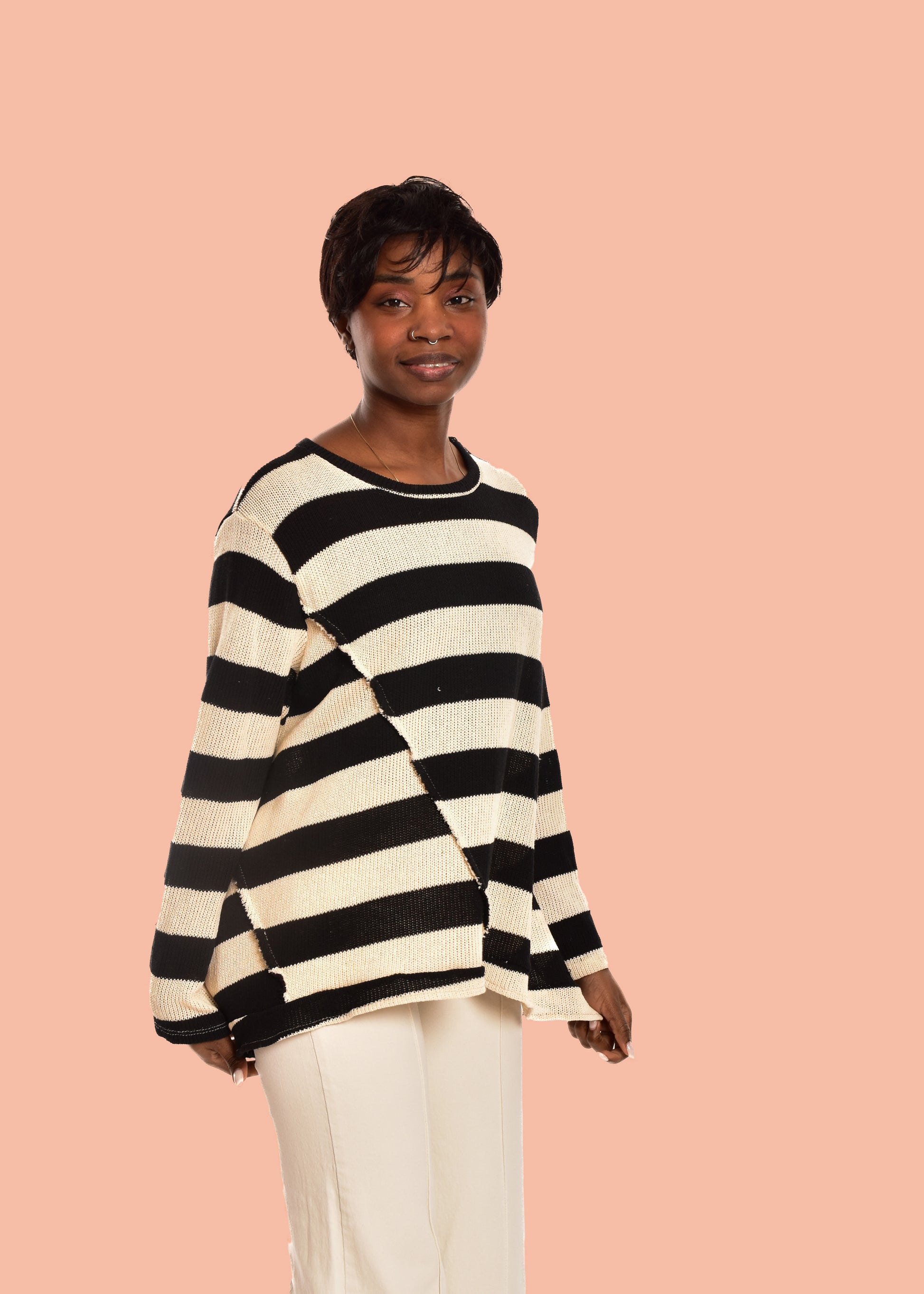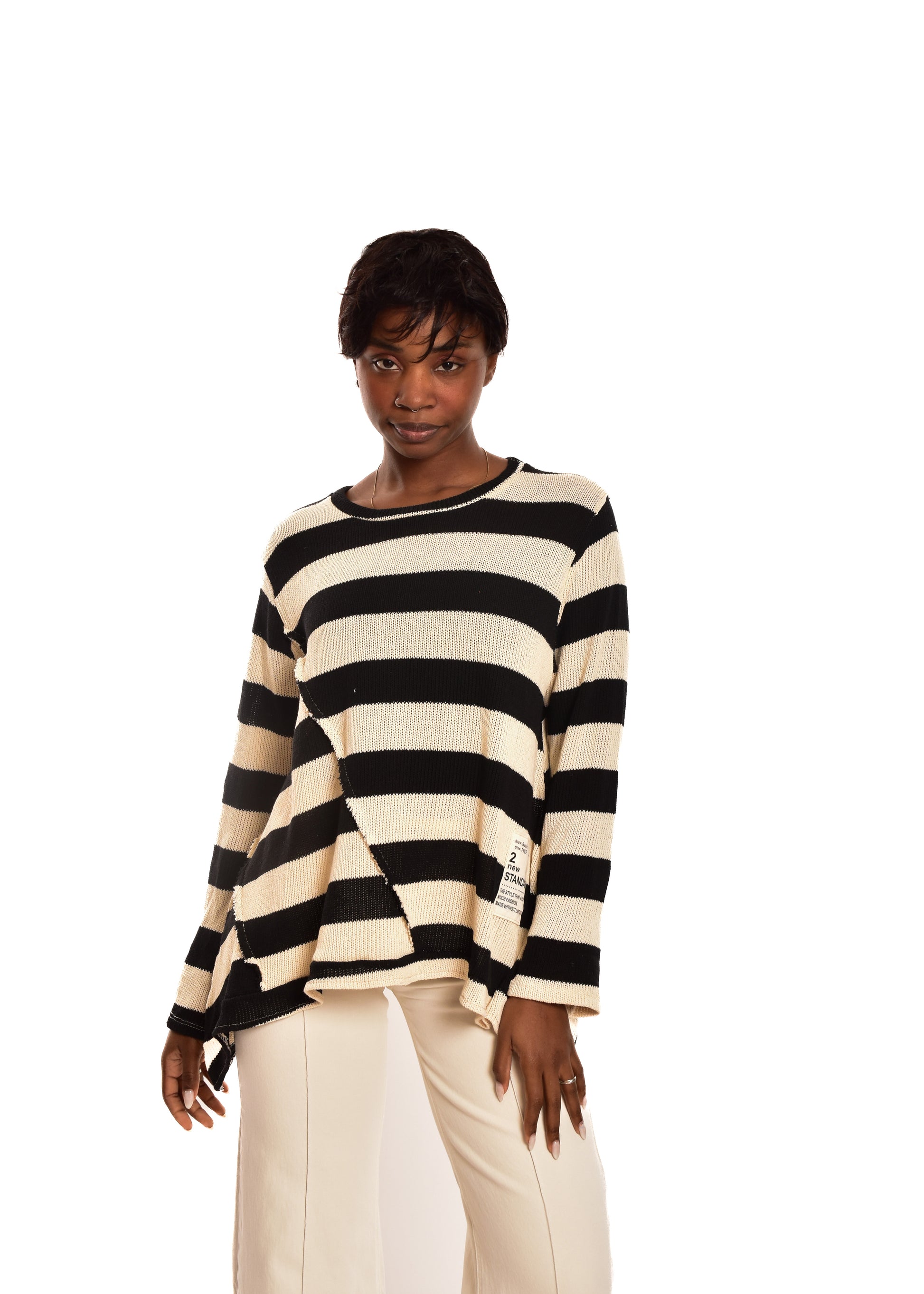 Jersey de punto de hilo calado con cortes asimétricos. Esta prenda está disponible en talla única, en este caso es apto hasta una talla 44.
