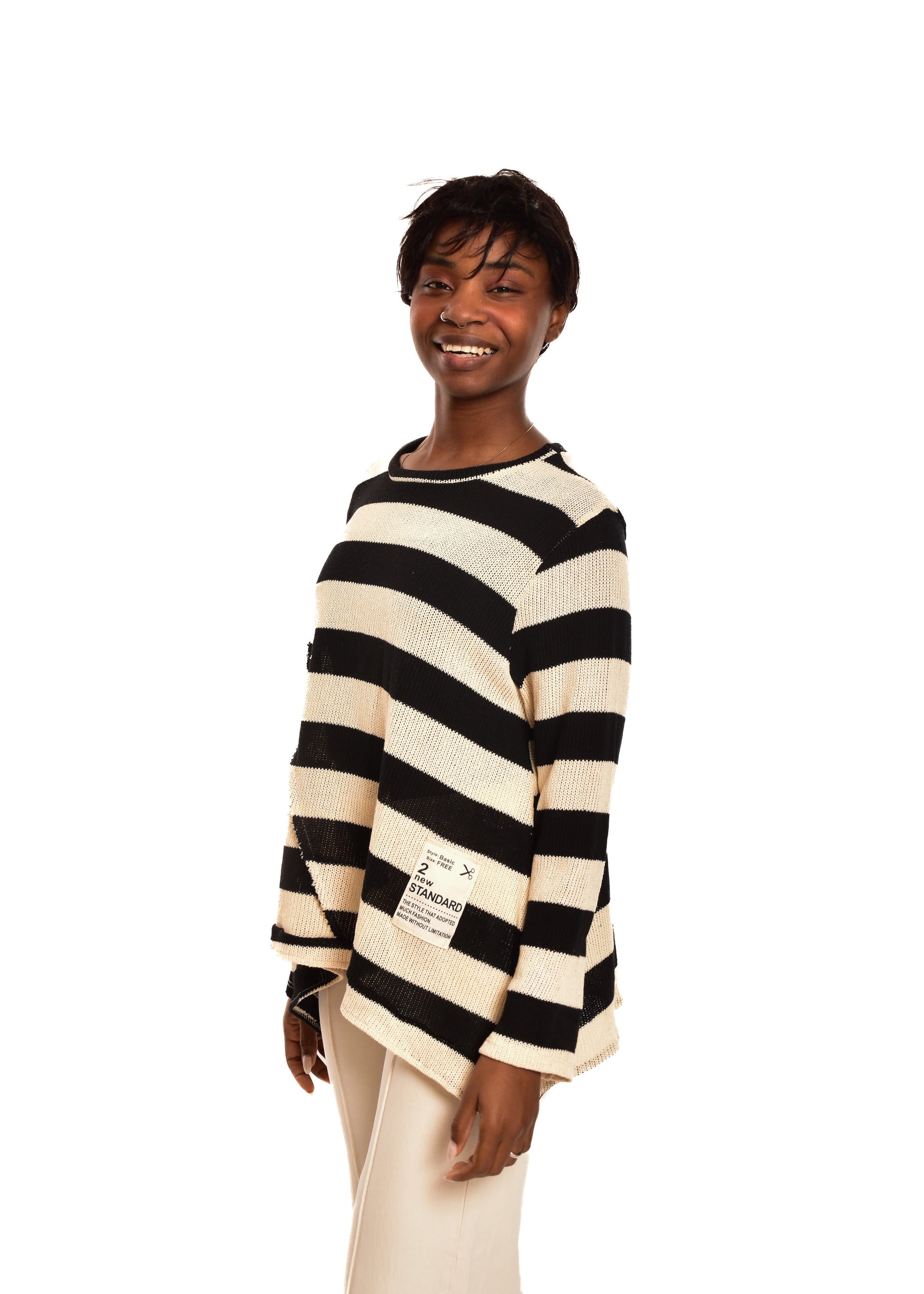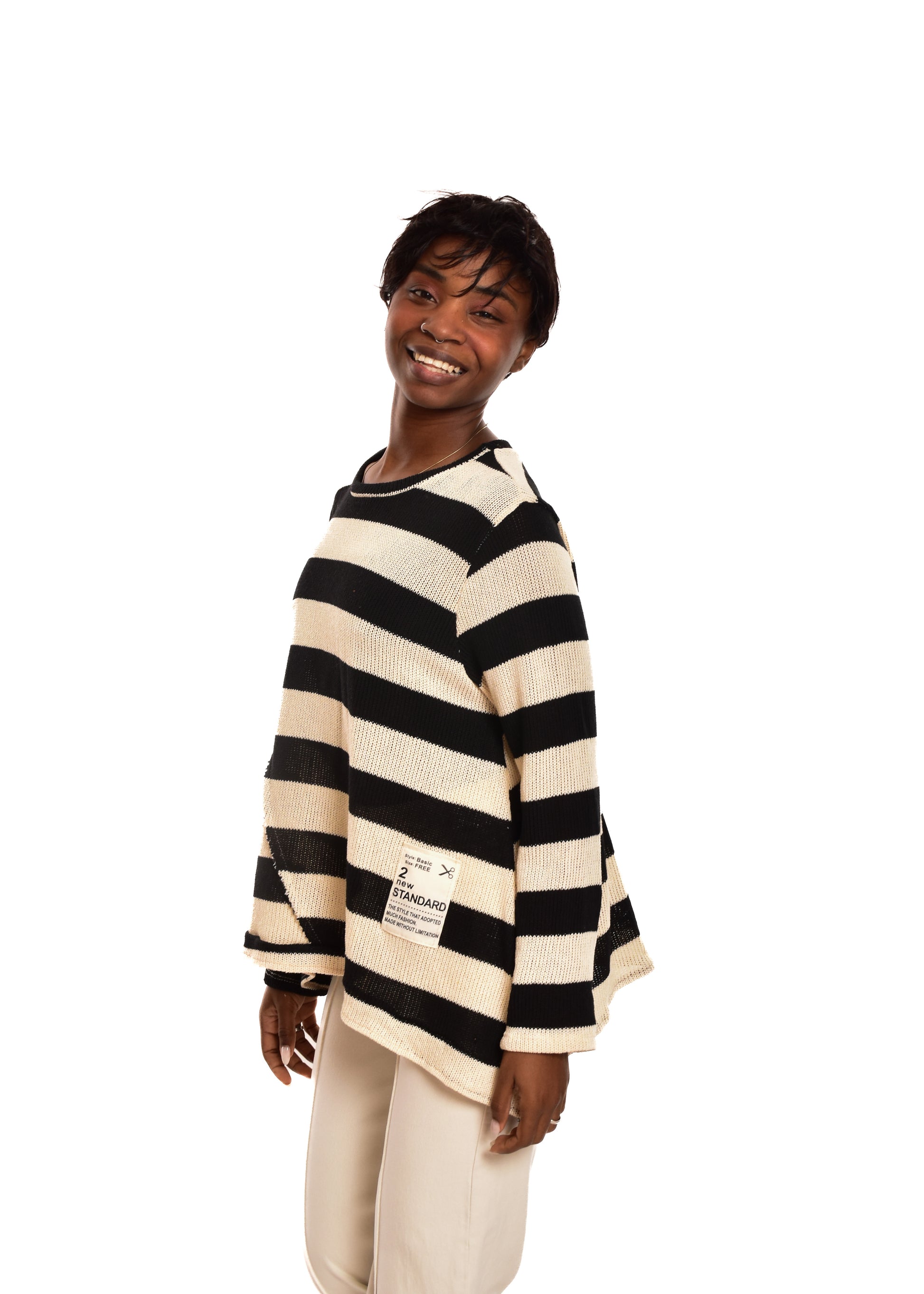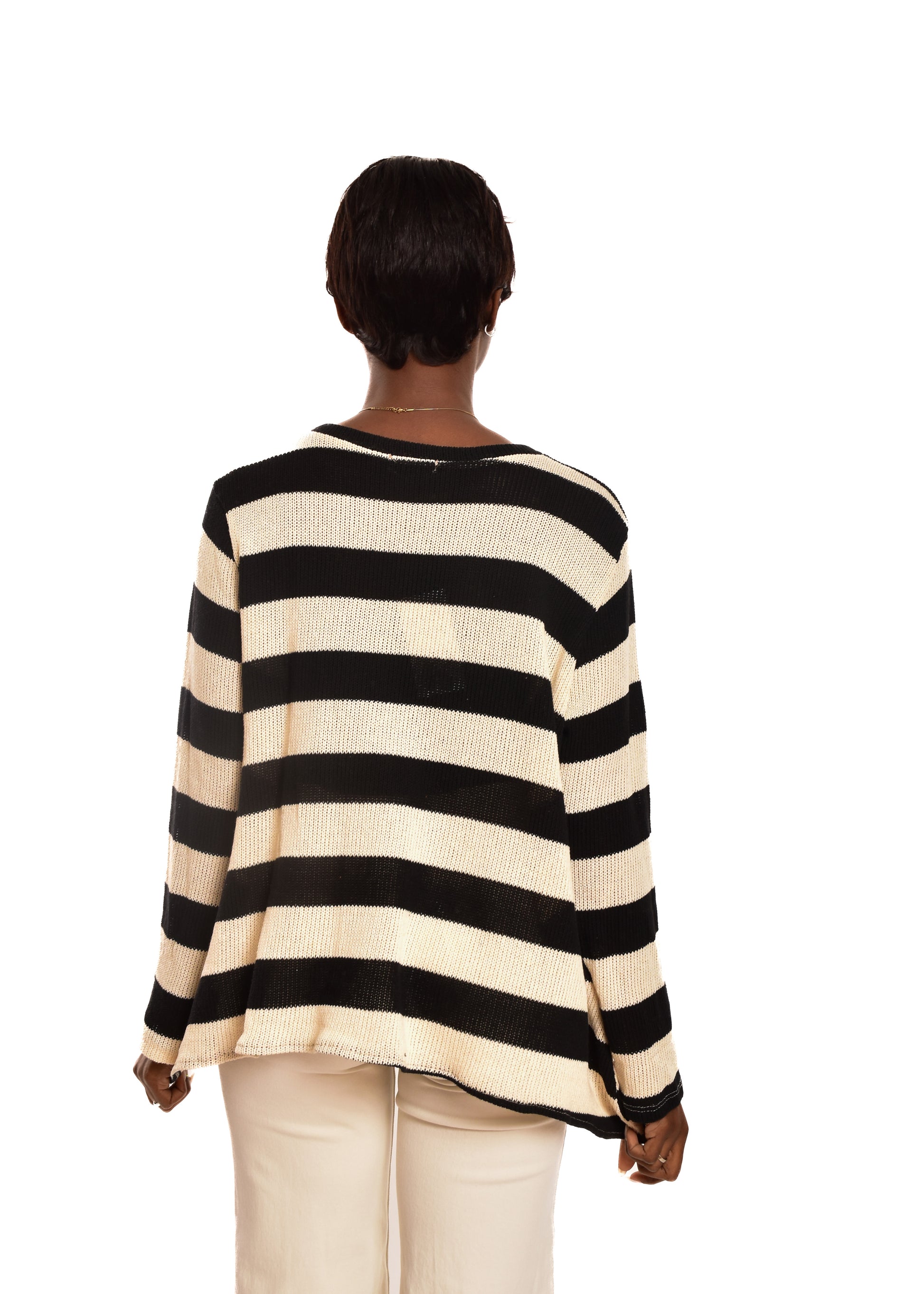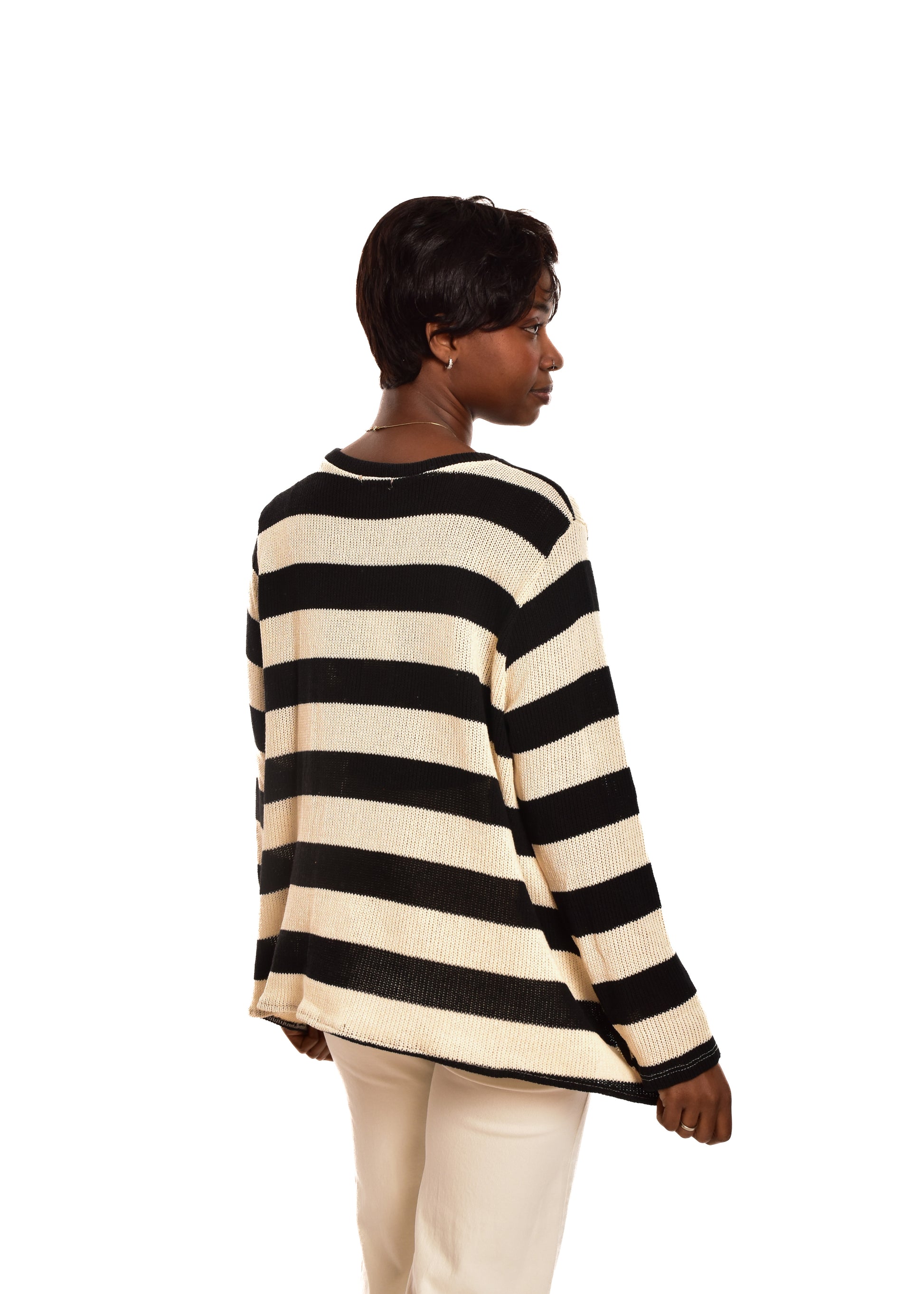 Jersey de punto de hilo calado con cortes asimétricos. Esta prenda está disponible en talla única, en este caso es apto hasta una talla 44.